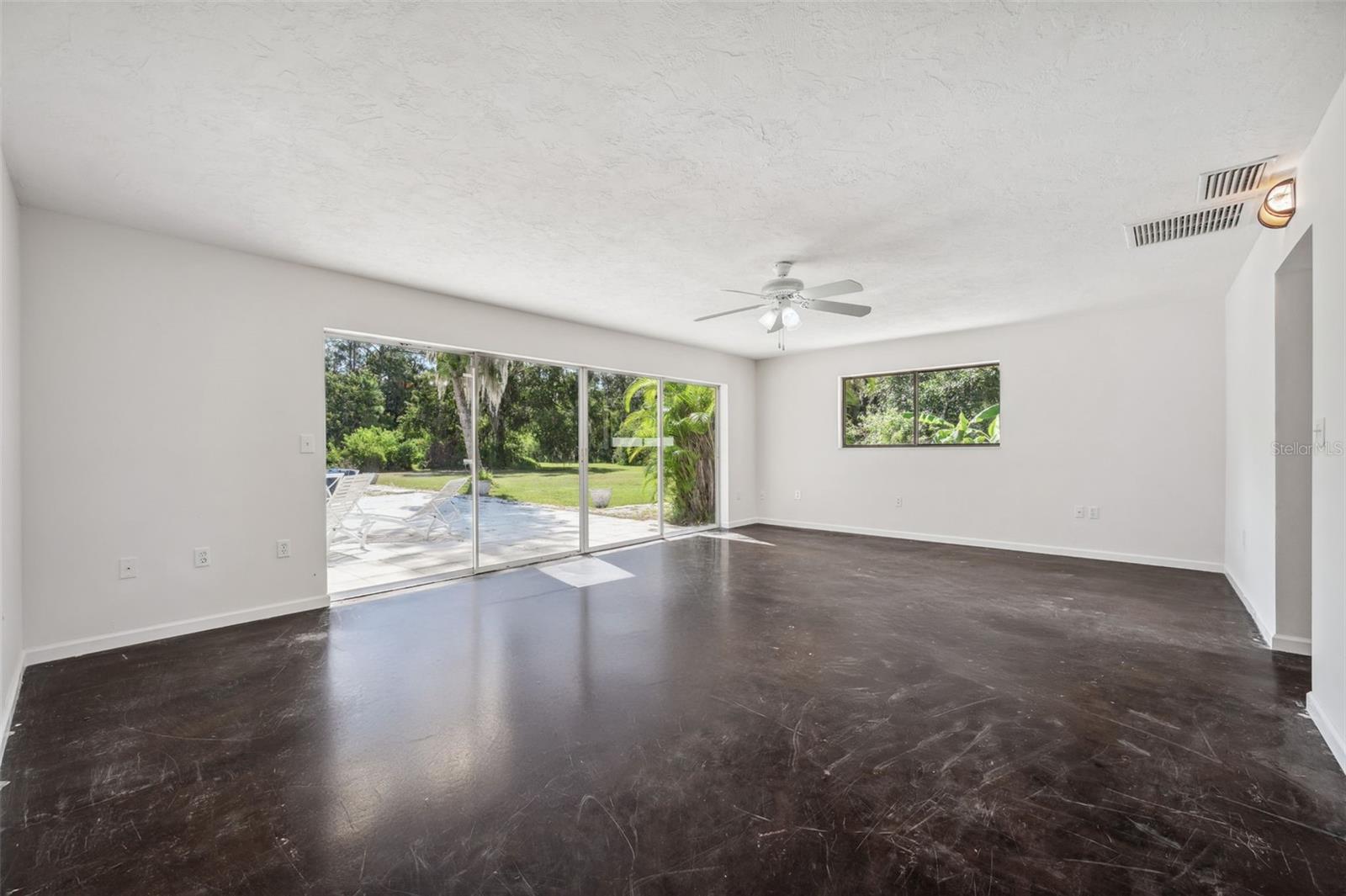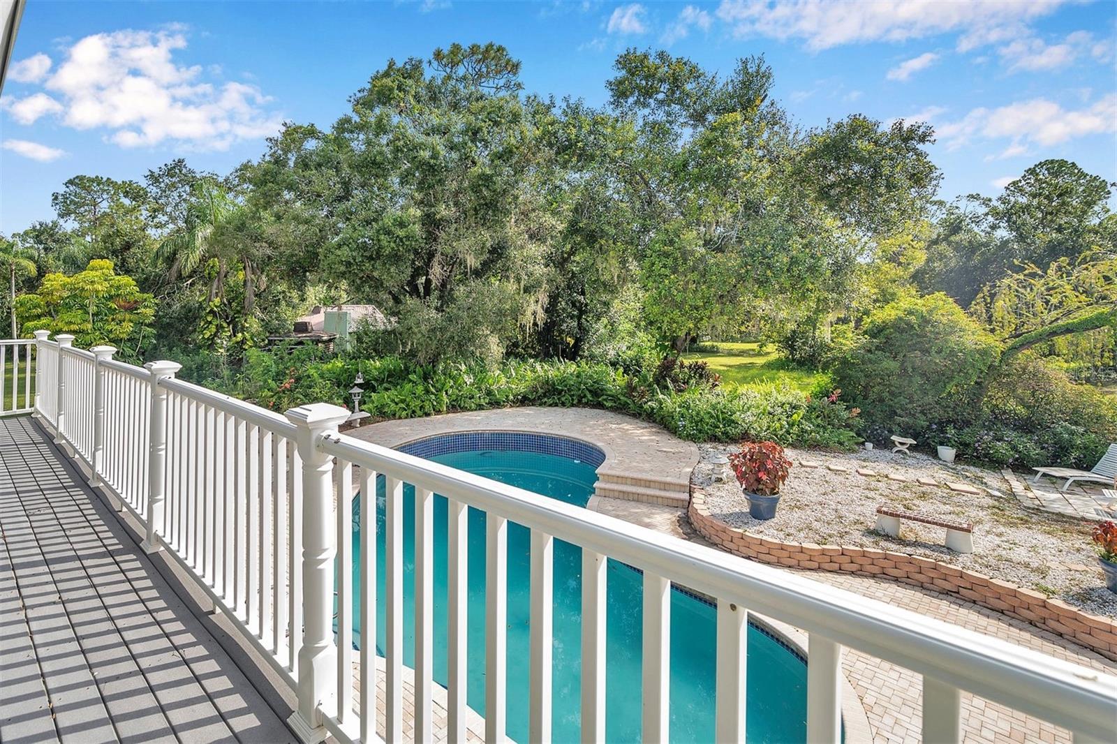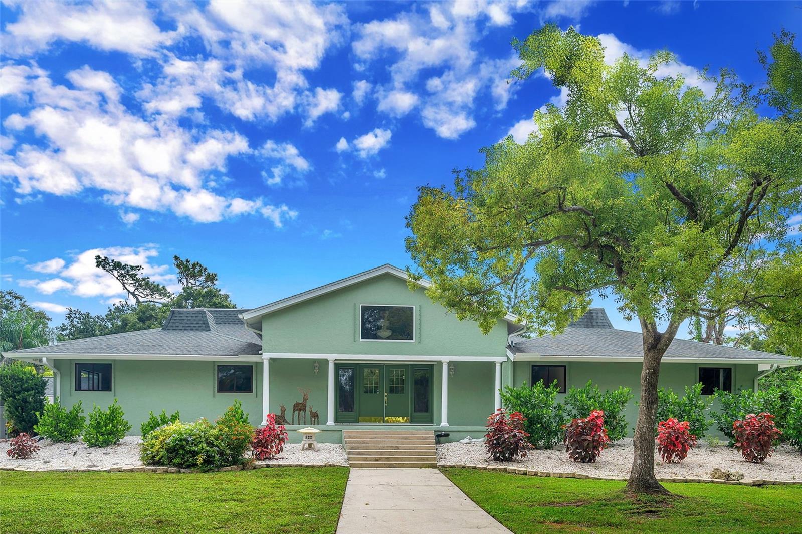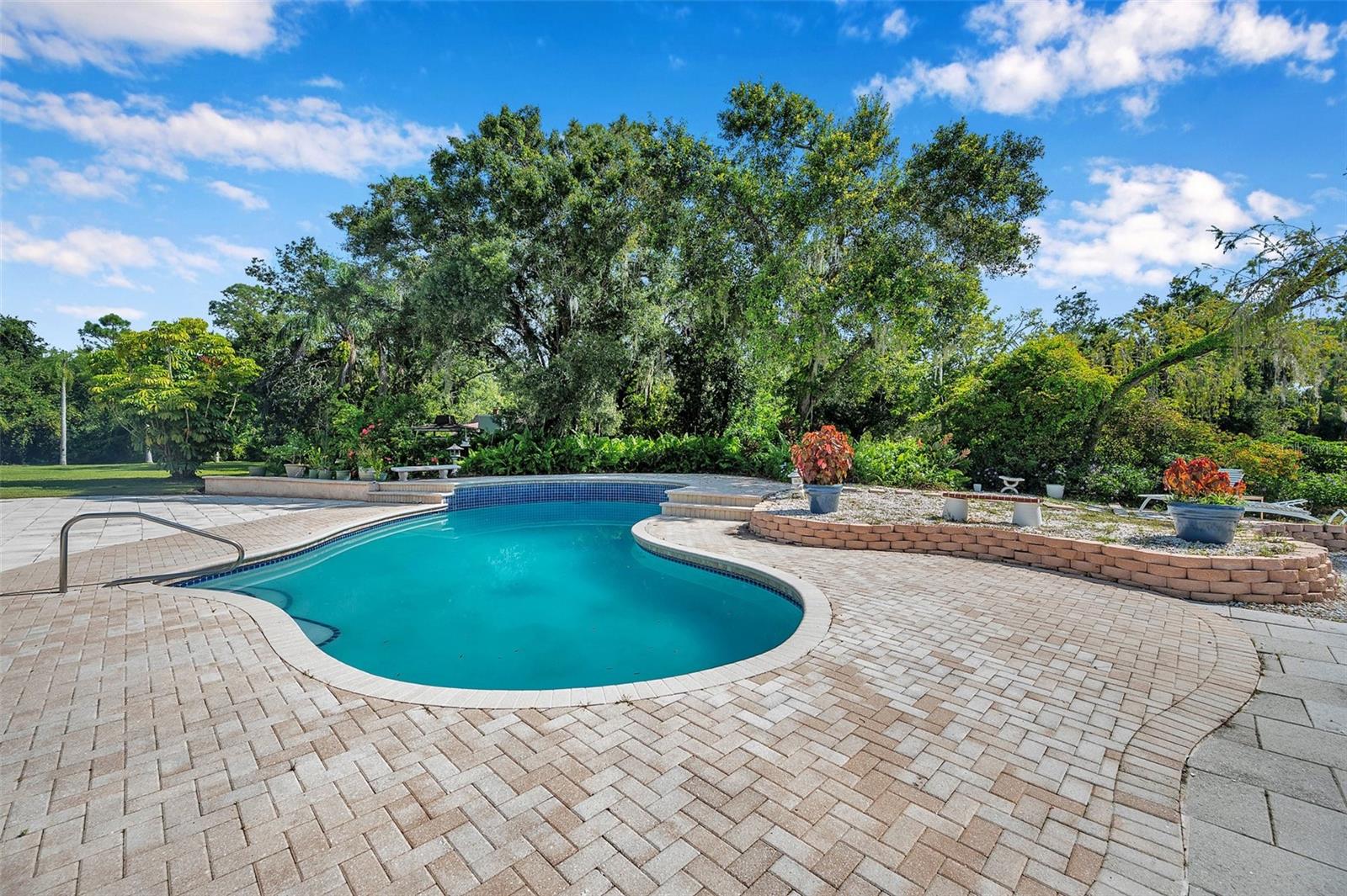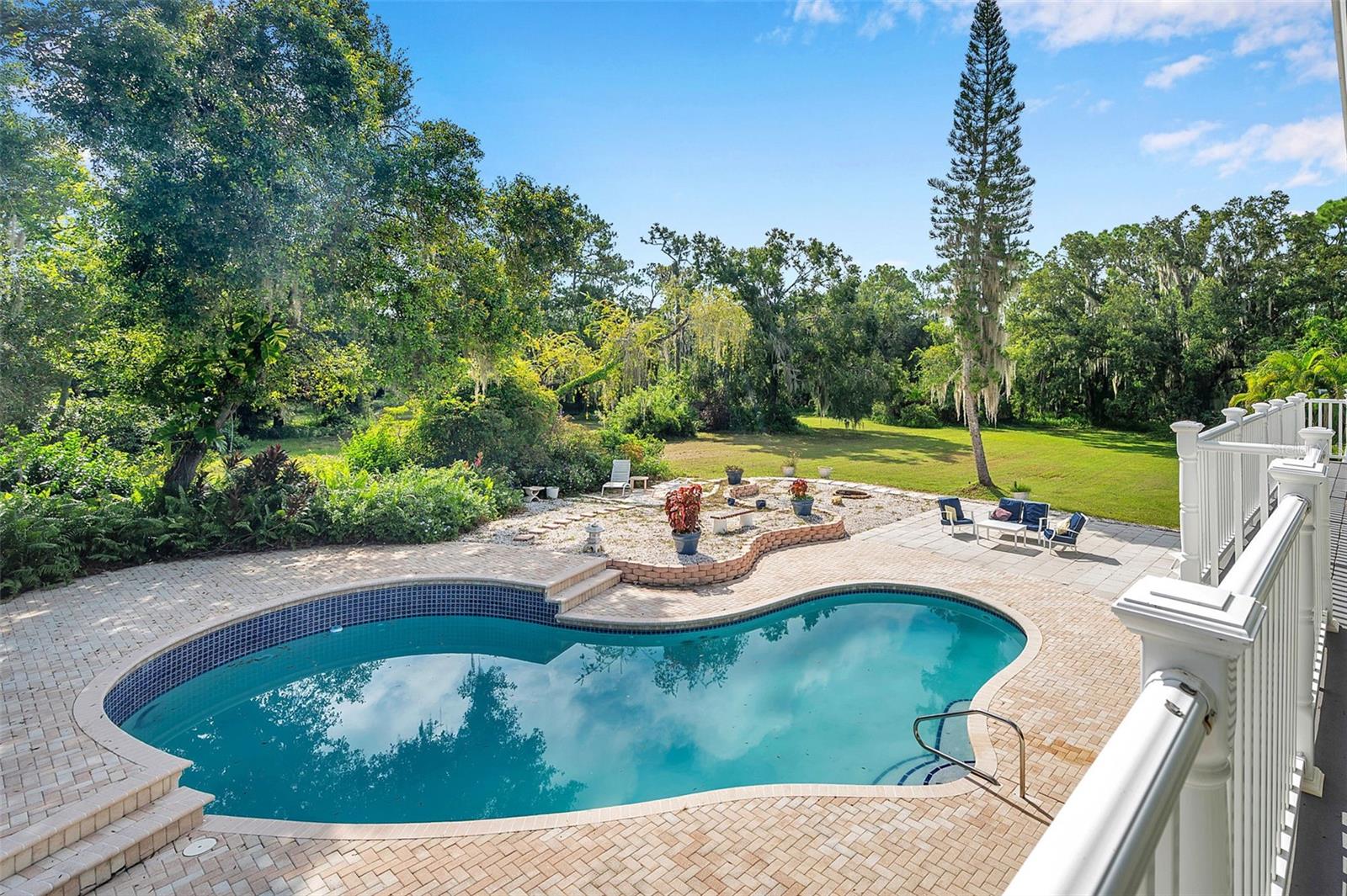 One or more photo(s) has been virtually staged. This rare estate size mid-century modern split level home on 5 wooded acres seamlessly blends minimalist elegance with natural surroundings offering a peaceful private retreat. The main house is approx. 7,000 sqft of expansive living space with 5 bedrooms/5 baths that includes 4 en suites, each over 500 sqft. The front doors open to the 2d level living room with a view through the center of the home to the pool and backyard blurring the lines between indoor and outdoor living, reminiscent of the Sarasota School of Modern Architect embracing natural elements with old Florida charm. The back of the house has over 50 feet of ceiling to floor glass doors and windows filling the house with light. The 1st and 3rd levels open directly onto the large pool deck. The 1st level kitchen/dining room is approx 840 sqft and opens to the 810 sqft family room with a large wet bar with space for another full refrigerator. Centering the room is a travertine fireplace that warms the heart of the home in the winter. The en suite bedroom on the 1st level can also be used as a home gym. The 3rd level has 2 en suite bedrooms, including the primary, both with access to the balcony that stretches the length of the house, a great spot to enjoy morning coffee while watching the sun rise or for the band, choir, or music ensemble to entertain at your outdoor parties. There is also a built in office on the 3rd level that can easily be converted to a master dressing room or nursery. The 2d level faces the front of the house and has 2 more bedrooms, one an en suite and the other has a bathroom just outside its door to be shared with guests. An additional storage room and large laundry room are also on the 2d level. All of the bedrooms are large enough for king beds, sitting/study areas, with lots of storage. Each of the levels has a living room and library. The large front circular driveway can easily park 20 cars; has a basketball area; and an attached 3 car garage with a covered breezeway to enter the main house kitchen. The property is wrapped in trees offering privacy in a park like setting teeming with Florida wildlife and has several fruit trees and a large pond. Behind the main house is a separate, detached, 1 bedroom/1 bath cottage, approx. 1,000 sqft, with a fireplace/pizza oven and 30ft of glass doors. Further back is a separate detached workshop/storage building that can be converted to a barn. Horses are welcomed! Located in coveted Timberland Ranchettes, a neighborhood of 13 homes just 3 miles east of 75 and only 10 miles to Siesta Key, across from Skye Ranch. This exceptional property is ready for you to add your personal touches and create your own retreat.