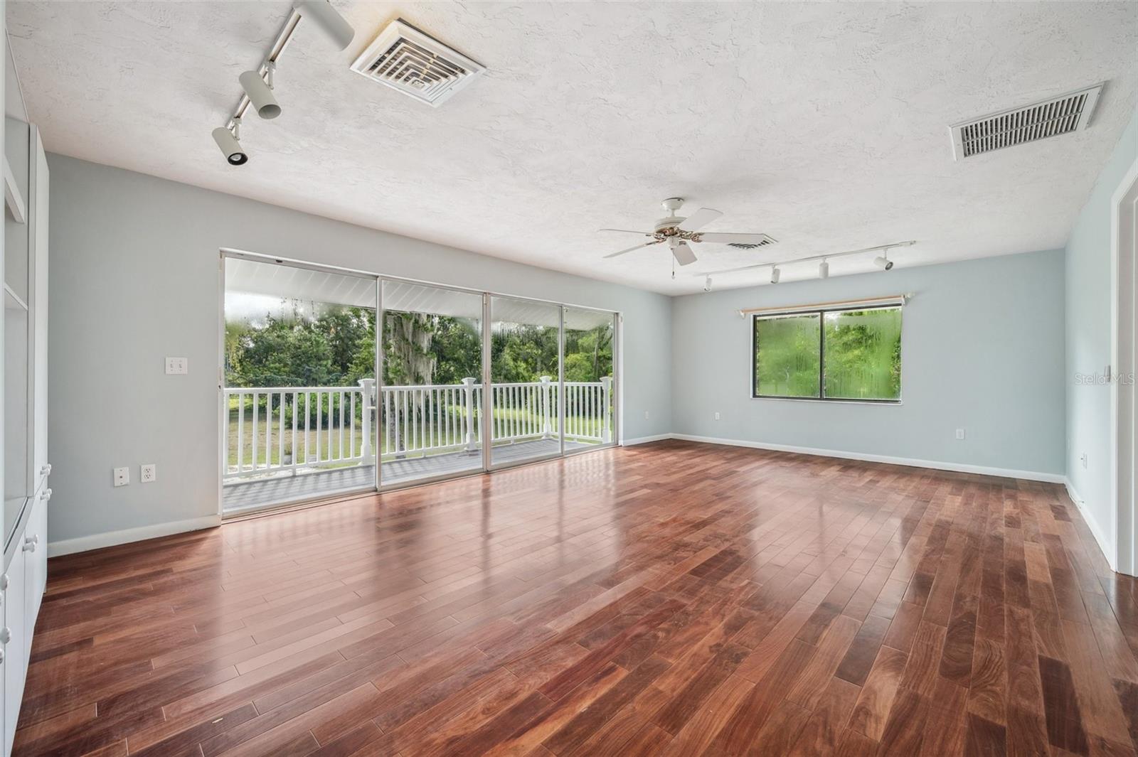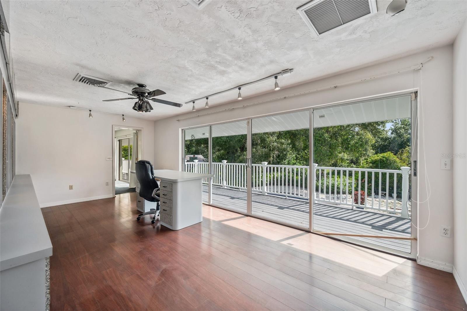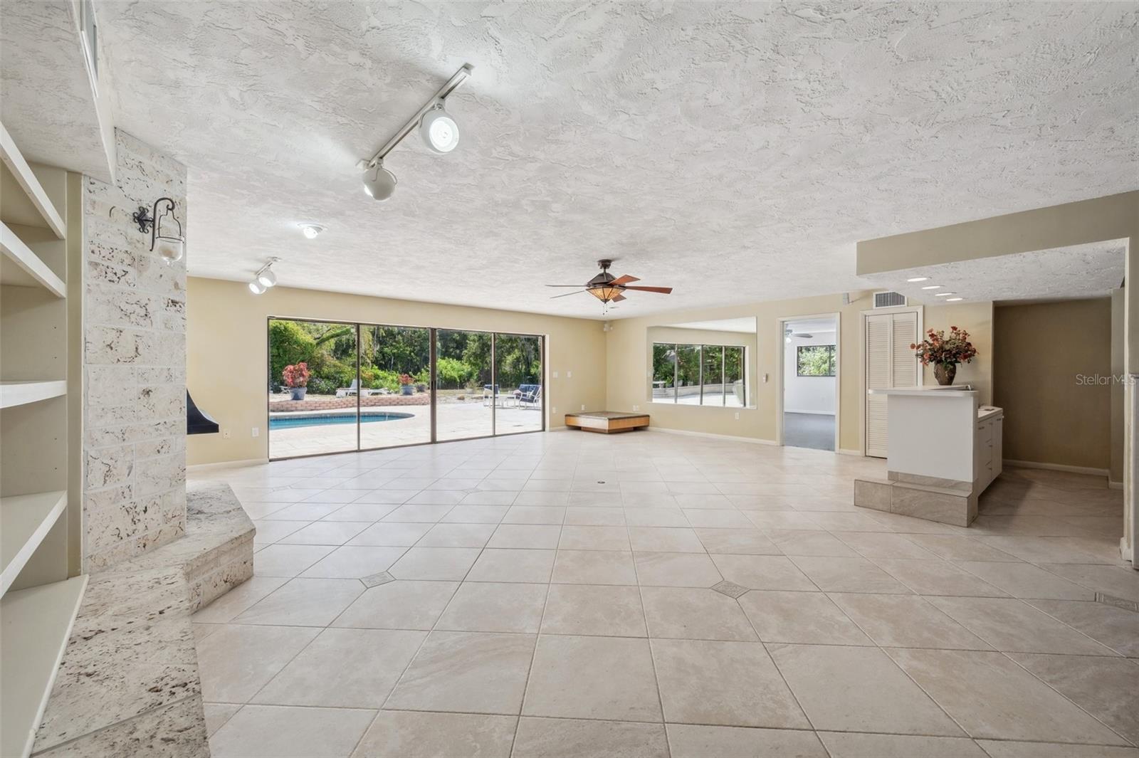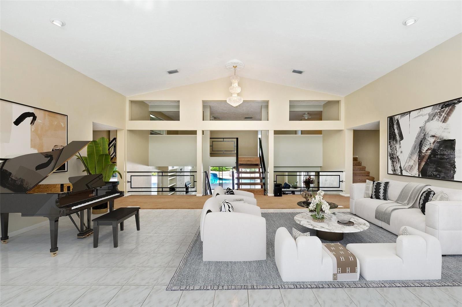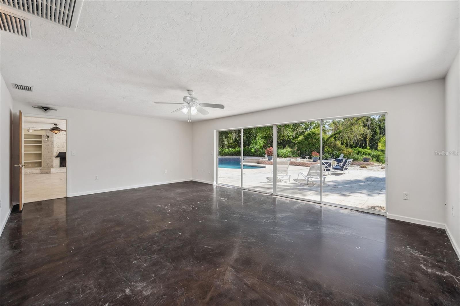 One or more photo(s) has been virtually staged. This rare estate size mid-century modern split level home on 5 wooded acres seamlessly blends minimalist elegance with natural surroundings offering a peaceful private retreat. The main house is approx. 7,000 sqft of expansive living space with 5 bedrooms/5 baths that includes 4 en suites, each over 500 sqft. The front doors open to the 2d level living room with a view through the center of the home to the pool and backyard blurring the lines between indoor and outdoor living, reminiscent of the Sarasota School of Modern Architect embracing natural elements with old Florida charm. The back of the house has over 50 feet of ceiling to floor glass doors and windows filling the house with light. The 1st and 3rd levels open directly onto the large pool deck. The 1st level kitchen/dining room is approx 840 sqft and opens to the 810 sqft family room with a large wet bar with space for another full refrigerator. Centering the room is a travertine fireplace that warms the heart of the home in the winter. The en suite bedroom on the 1st level can also be used as a home gym. The 3rd level has 2 en suite bedrooms, including the primary, both with access to the balcony that stretches the length of the house, a great spot to enjoy morning coffee while watching the sun rise or for the band, choir, or music ensemble to entertain at your outdoor parties. There is also a built in office on the 3rd level that can easily be converted to a master dressing room or nursery. The 2d level faces the front of the house and has 2 more bedrooms, one an en suite and the other has a bathroom just outside its door to be shared with guests. An additional storage room and large laundry room are also on the 2d level. All of the bedrooms are large enough for king beds, sitting/study areas, with lots of storage. Each of the levels has a living room and library. The large front circular driveway can easily park 20 cars; has a basketball area; and an attached 3 car garage with a covered breezeway to enter the main house kitchen. The property is wrapped in trees offering privacy in a park like setting teeming with Florida wildlife and has several fruit trees and a large pond. Behind the main house is a separate, detached, 1 bedroom/1 bath cottage, approx. 1,000 sqft, with a fireplace/pizza oven and 30ft of glass doors. Further back is a separate detached workshop/storage building that can be converted to a barn. Horses are welcomed! Located in coveted Timberland Ranchettes, a neighborhood of 13 homes just 3 miles east of 75 and only 10 miles to Siesta Key, across from Skye Ranch. This exceptional property is ready for you to add your personal touches and create your own retreat.
