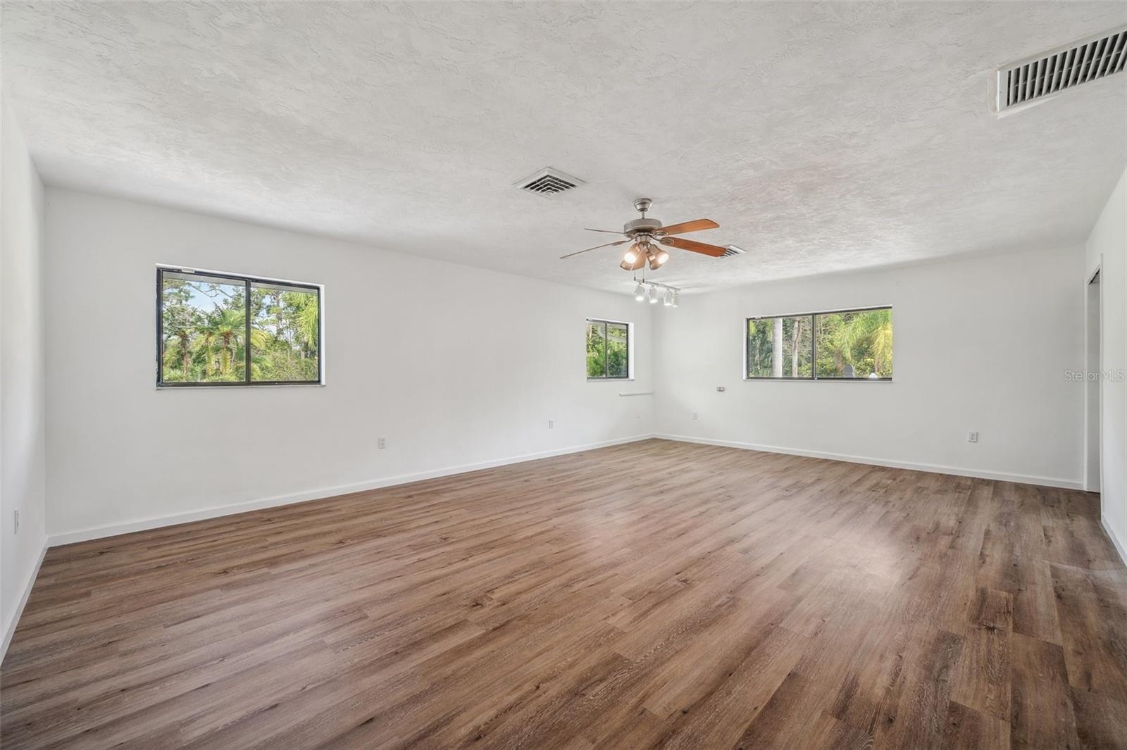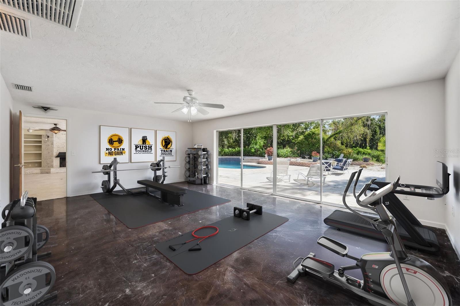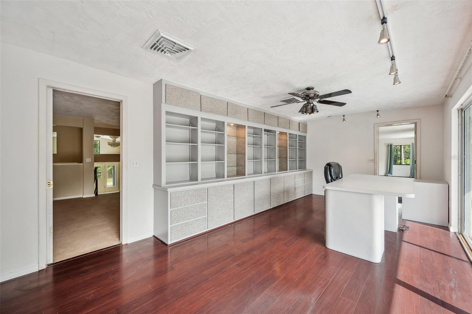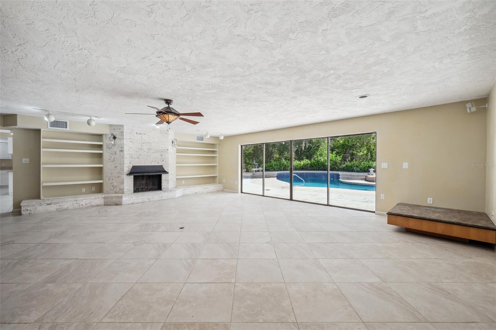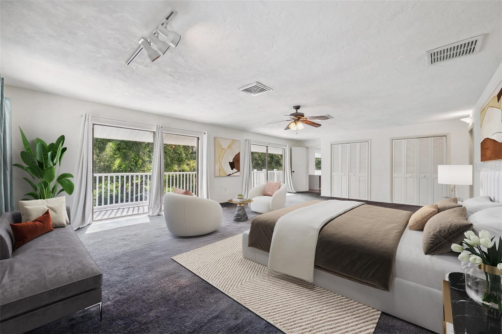 One or more photo(s) has been virtually staged. This rare estate size mid-century modern split level home on 5 wooded acres seamlessly blends minimalist elegance with natural surroundings offering a peaceful private retreat. The main house is approx. 7,000 sqft of expansive living space with 5 bedrooms/5 baths that includes 4 en suites, each over 500 sqft. The front doors open to the 2d level living room with a view through the center of the home to the pool and backyard blurring the lines between indoor and outdoor living, reminiscent of the Sarasota School of Modern Architect embracing natural elements with old Florida charm. The back of the house has over 50 feet of ceiling to floor glass doors and windows filling the house with light. The 1st and 3rd levels open directly onto the large pool deck. The 1st level kitchen/dining room is approx 840 sqft and opens to the 810 sqft family room with a large wet bar with space for another full refrigerator. Centering the room is a travertine fireplace that warms the heart of the home in the winter. The en suite bedroom on the 1st level can also be used as a home gym. The 3rd level has 2 en suite bedrooms, including the primary, both with access to the balcony that stretches the length of the house, a great spot to enjoy morning coffee while watching the sun rise or for the band, choir, or music ensemble to entertain at your outdoor parties. There is also a built in office on the 3rd level that can easily be converted to a master dressing room or nursery. The 2d level faces the front of the house and has 2 more bedrooms, one an en suite and the other has a bathroom just outside its door to be shared with guests. An additional storage room and large laundry room are also on the 2d level. All of the bedrooms are large enough for king beds, sitting/study areas, with lots of storage. Each of the levels has a living room and library. The large front circular driveway can easily park 20 cars; has a basketball area; and an attached 3 car garage with a covered breezeway to enter the main house kitchen. The property is wrapped in trees offering privacy in a park like setting teeming with Florida wildlife and has several fruit trees and a large pond. Behind the main house is a separate, detached, 1 bedroom/1 bath cottage, approx. 1,000 sqft, with a fireplace/pizza oven and 30ft of glass doors. Further back is a separate detached workshop/storage building that can be converted to a barn. Horses are welcomed! Located in coveted Timberland Ranchettes, a neighborhood of 13 homes just 3 miles east of 75 and only 10 miles to Siesta Key, across from Skye Ranch. This exceptional property is ready for you to add your personal touches and create your own retreat.