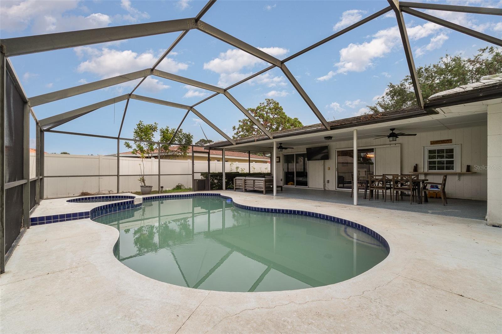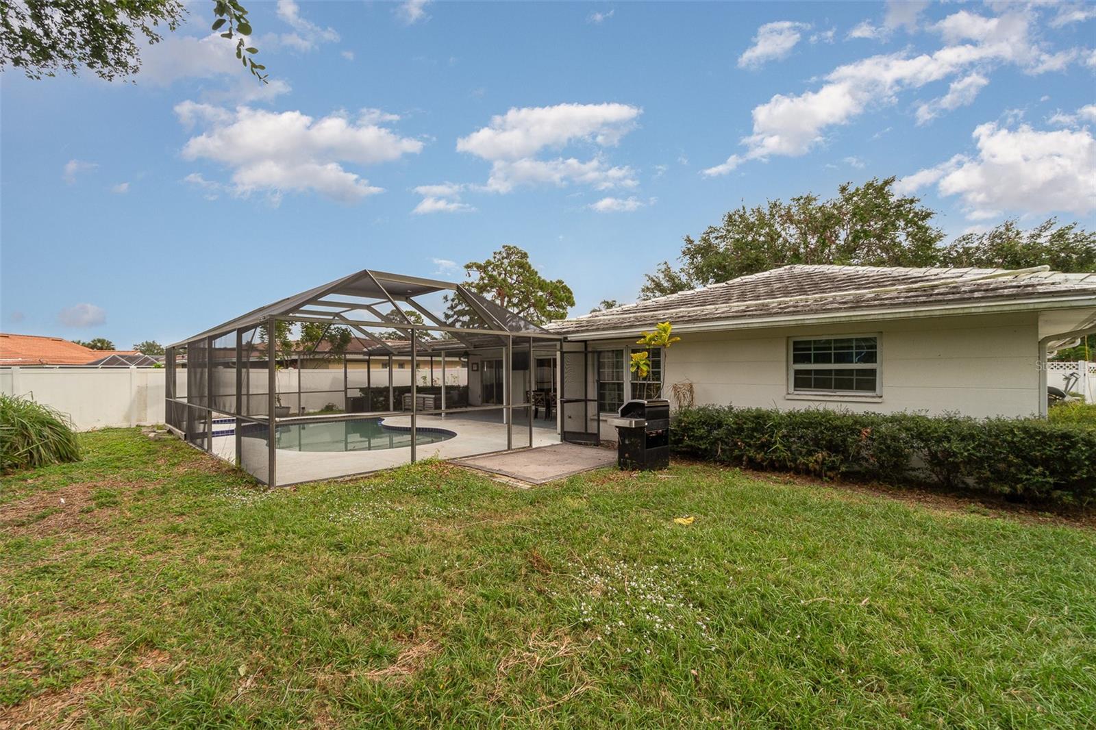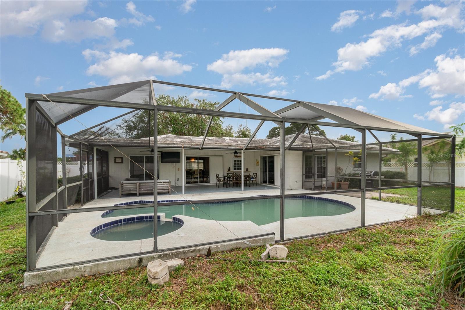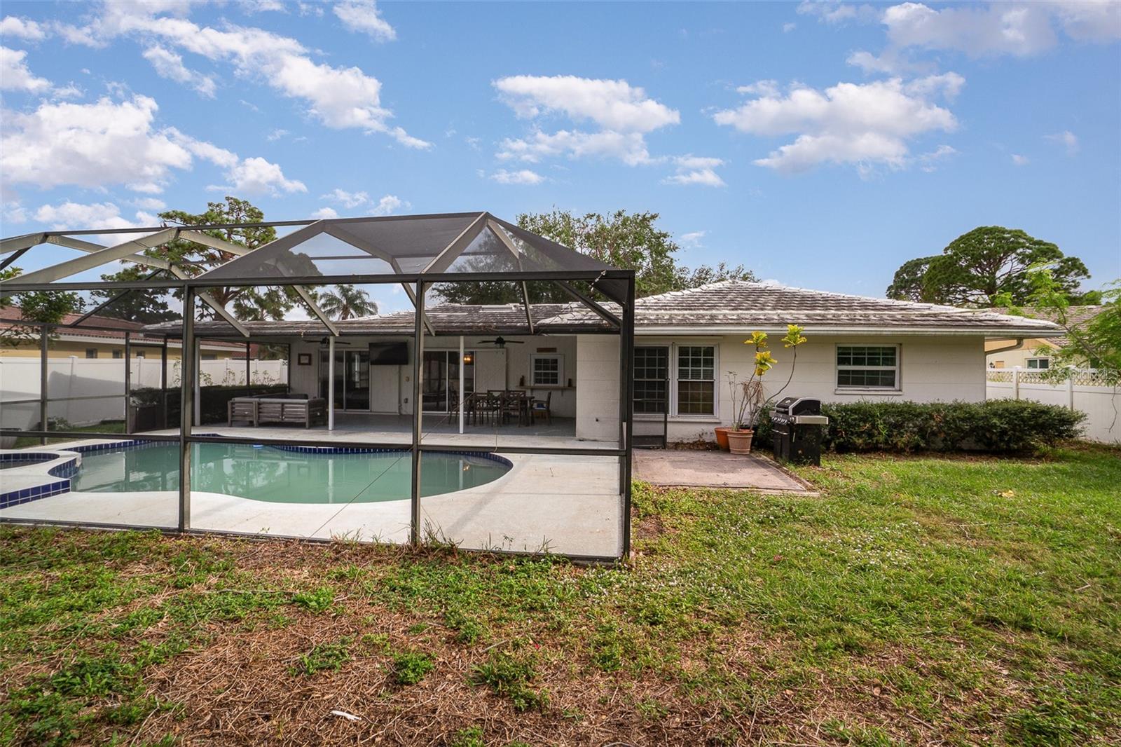 This charming home is perfect for year round or seasonal enjoyment, or as a smart investment opportunity. The property is being sold AS-IS and is cash only. Featuring 3 bedrooms and 2 bathrooms, the home boasts a newly refinished, heated inground pool and jacuzzi, a large lanai, and a spacious, fully fenced backyard on a .25-acre lot in Gulf Gate Woods, one of Sarasota's most sought-after neighborhoods. Just 3.8 miles to the world-famous Siesta Key Beach, conveniently located close to shopping and dining, 7 miles from downtown, 10 miles from Lido Key Beach, and 12 miles from the airport. The inviting floor plan is designed for open-air living. It features three fully opening sliding glass doors and a kitchen pass-through window to the spacious screened lanai, pool deck, and generously sized, fully fenced backyard. The home is filled with natural light and includes a formal living and dining area, as well as a versatile den. The split floor plan ensures privacy for the master suite and guests. This home is not in a flood zone and is built to last with solid concrete block construction. Gulf Gate Woods is home to a growing number of young families seeking a safe and desirable community within an excellent school district. It is also popular among retirees and has a growing rental market. The neighborhood features ranch-style homes and mature tree-lined streets, with this home situated on a quiet inner street that experiences little to no traffic, creating a peaceful retreat. Recent upgrades include a newly refinished pool with pebble tech (including a lifetime warranty), updated tile (2020), a new pool pump, filter, and hybrid solar/electric pool heater (2022), as well as all new electrical wiring and GFCI units (2020). This property is cash-only and is being sold AS-IS. Renovations and updates present an opportunity to customize this desirable home in paradise. Please note that the tile roof needs repair or a possible replacement.