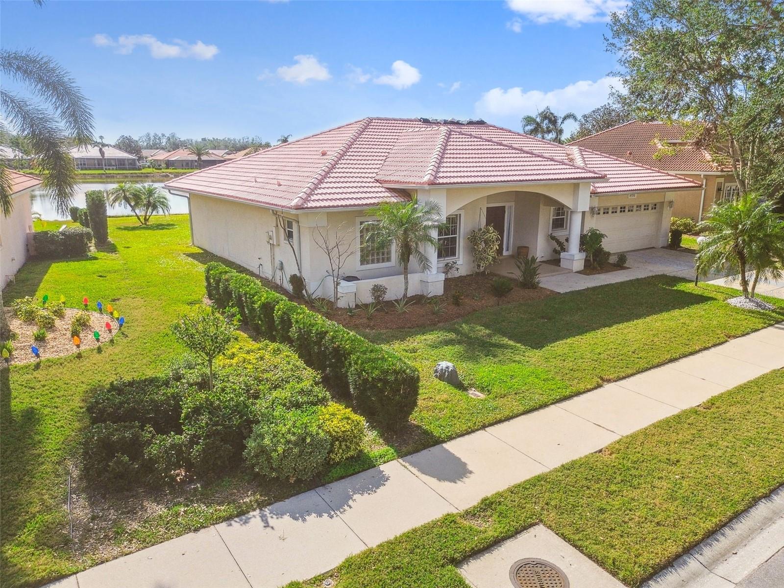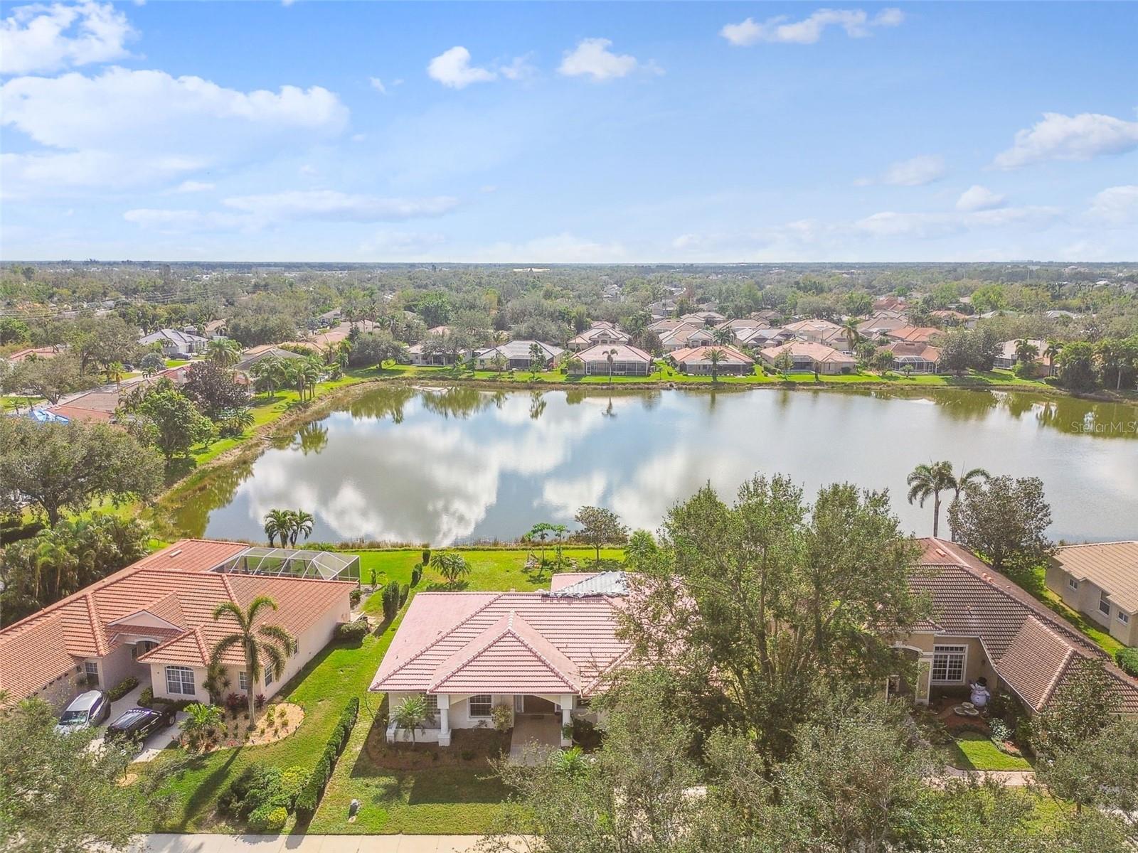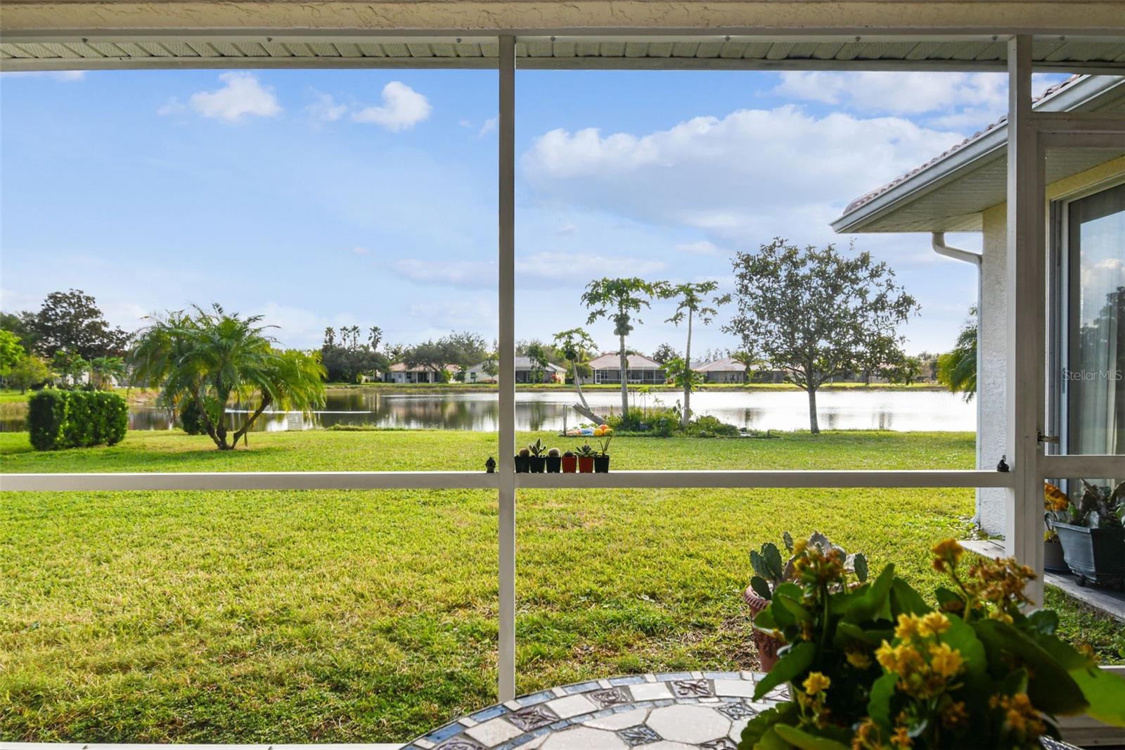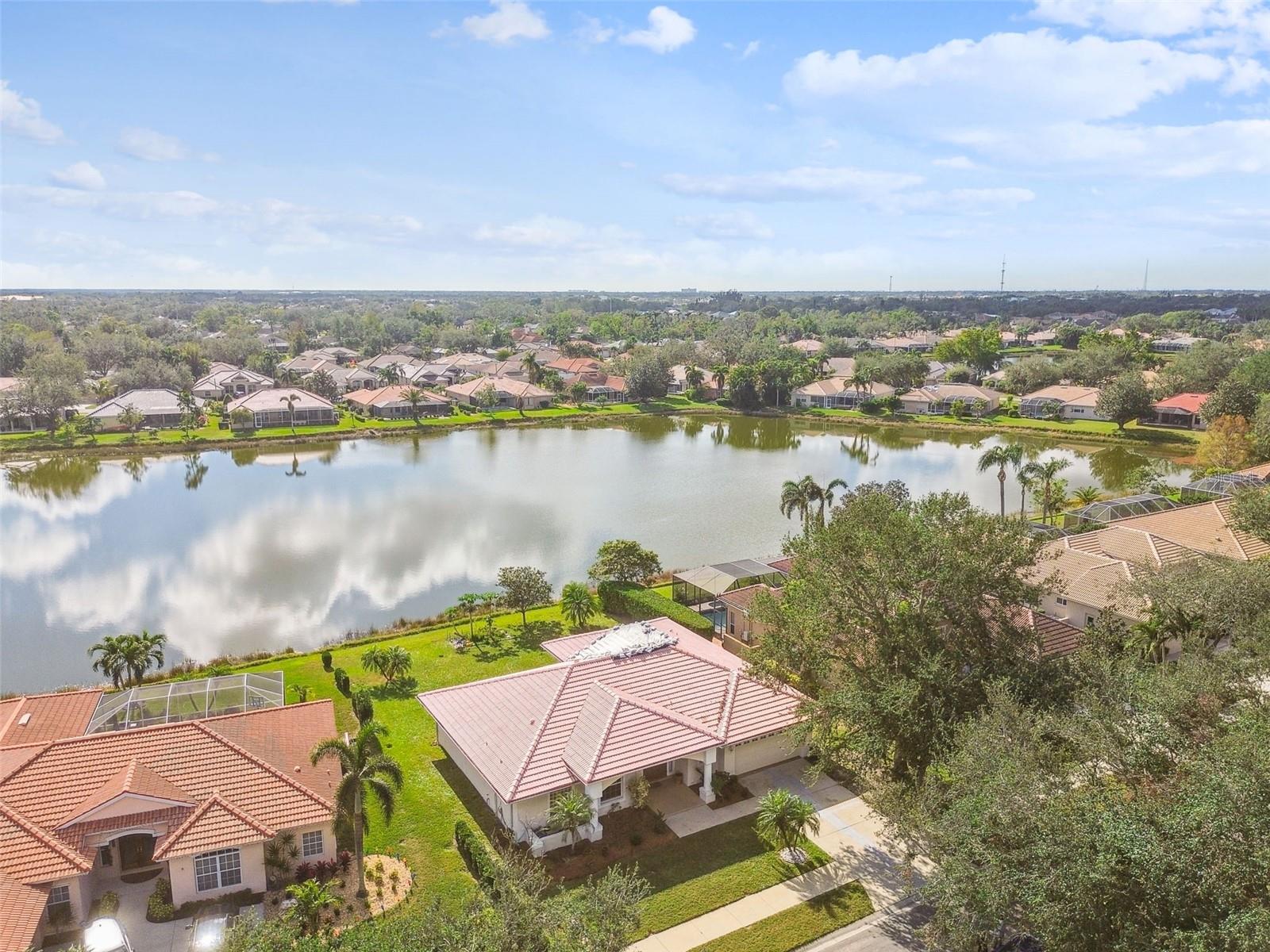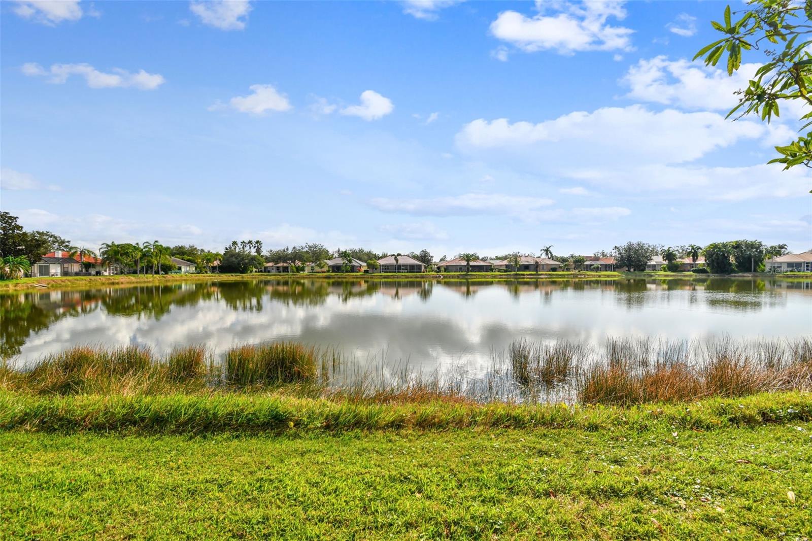 Enjoy stunning lake views from nearly every window of this light filled, south-facing, 3-bedroom, 2-bathroom home with a den. The interior features tile flooring in the kitchen and bathrooms, complemented by plush carpeting in the bedrooms. A thoughtful split-bedroom layout ensures privacy, while the primary suite boasts a luxurious ensuite with a bidet, dual sinks, a soaking tub, a separate shower, and a walk-in closet. Relax or entertain on the spacious screened and covered lanai, perfect for soaking in the picturesque lake scenery. Conveniently situated in the desirable Three Oaks area, this home, which has the benefit of low HOA fees, is close to shopping, dining, Siesta Key Beach, and I-75, with excellent schools nearby. There's even room to add a pool! Please note: this house is being sold 'as is'.
