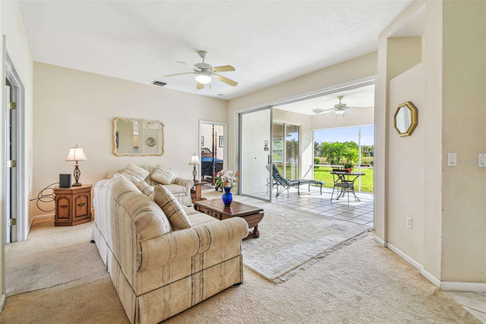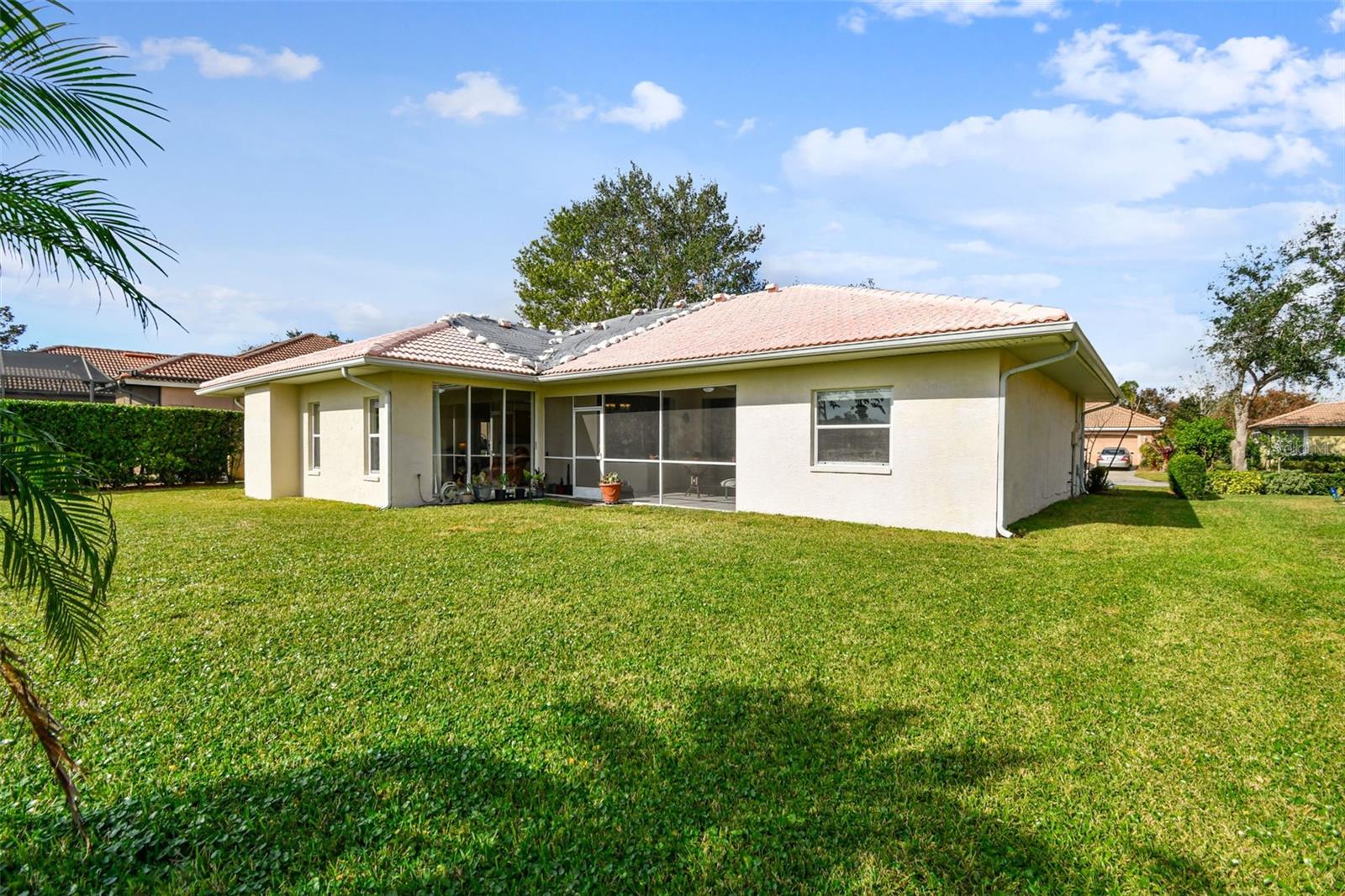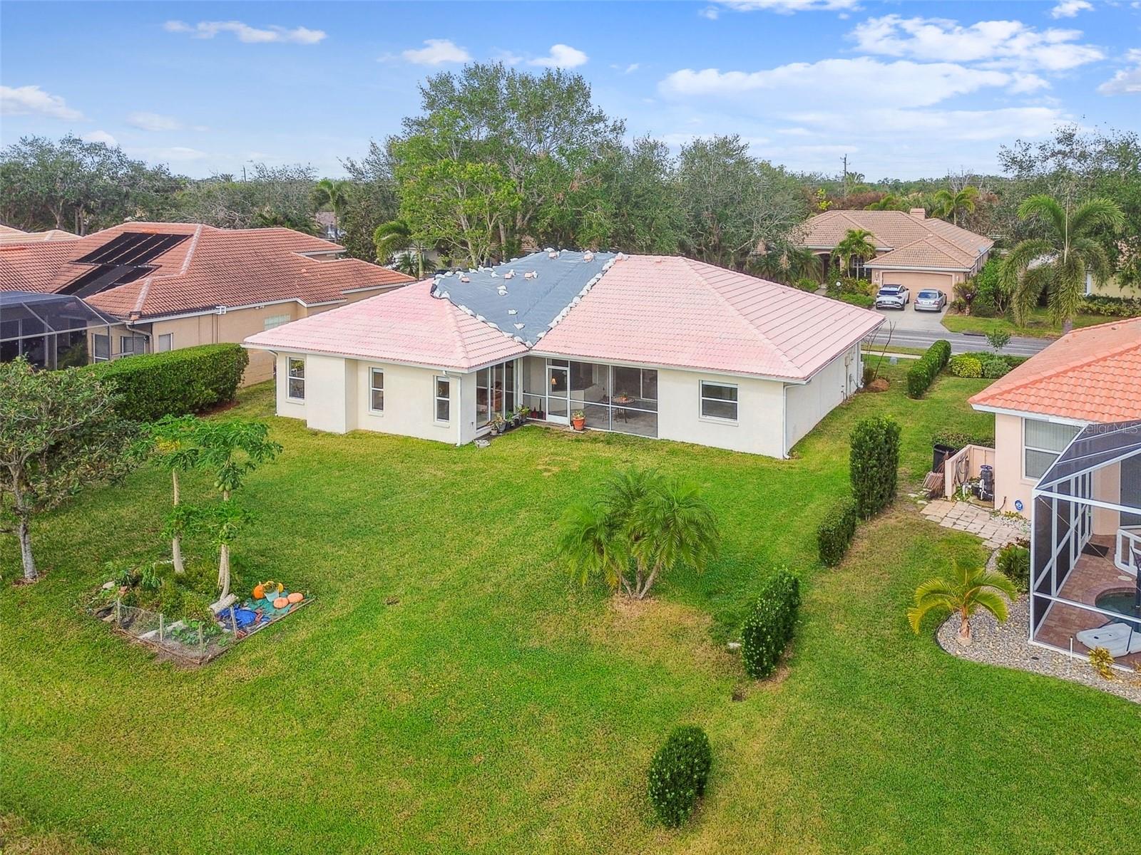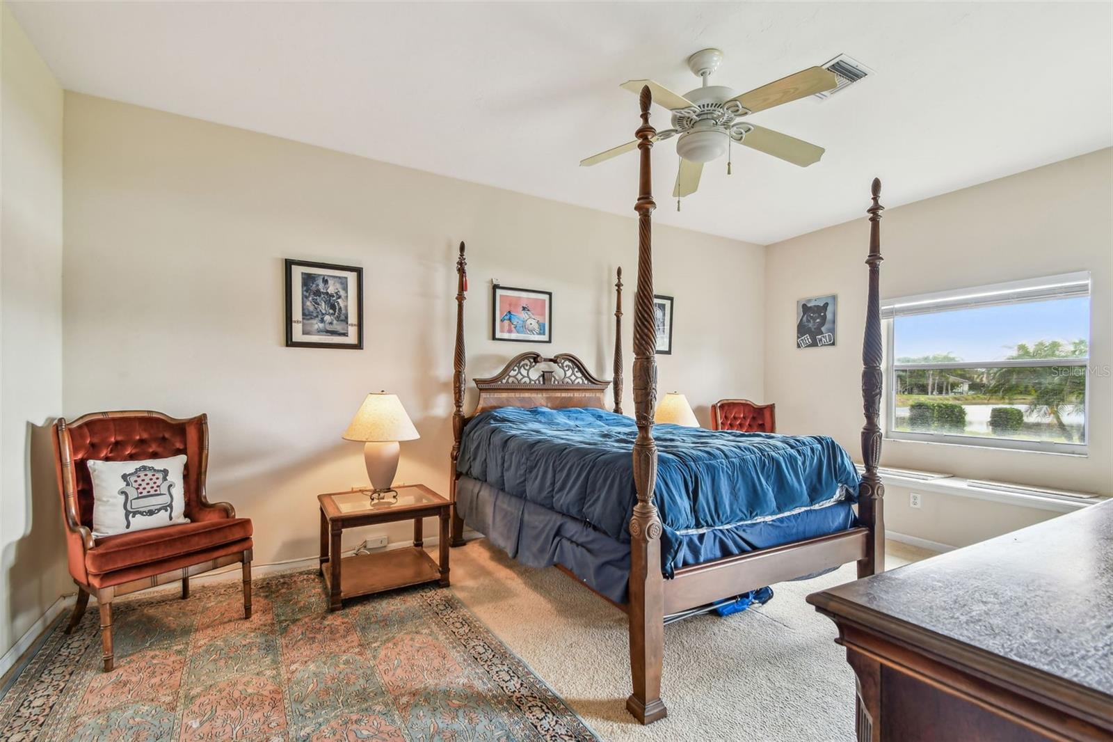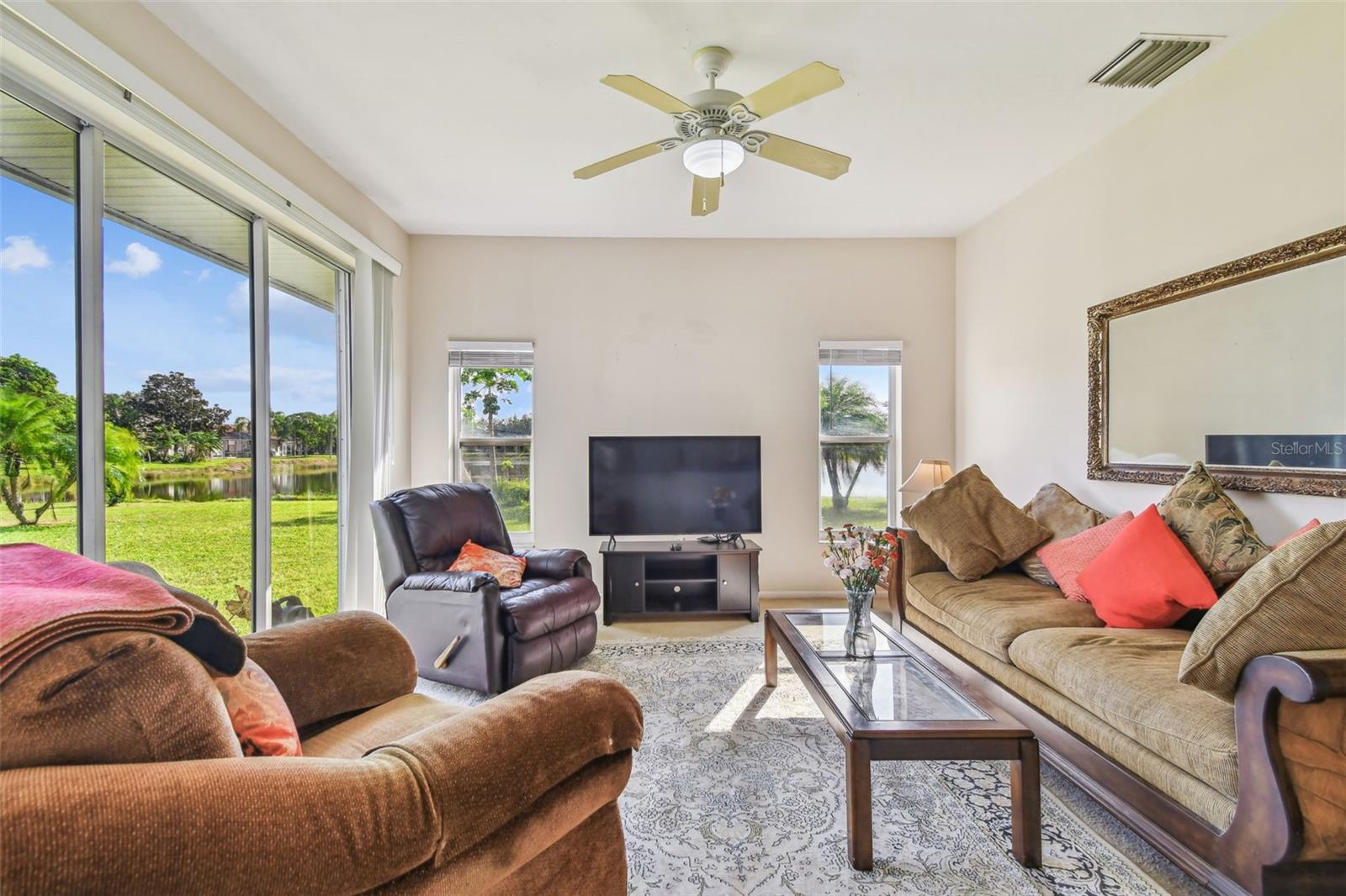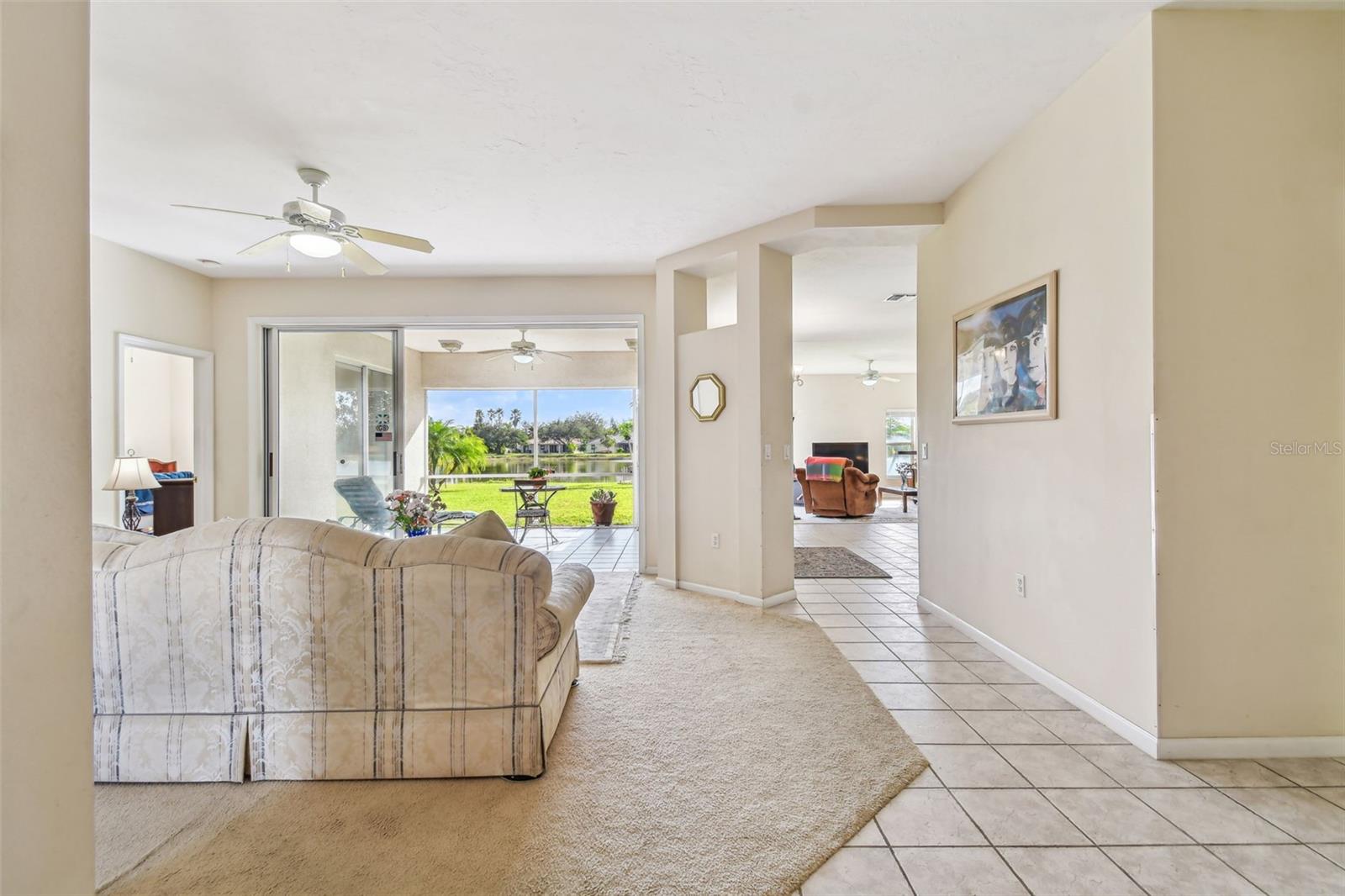 Enjoy stunning lake views from nearly every window of this light filled, south-facing, 3-bedroom, 2-bathroom home with a den. The interior features tile flooring in the kitchen and bathrooms, complemented by plush carpeting in the bedrooms. A thoughtful split-bedroom layout ensures privacy, while the primary suite boasts a luxurious ensuite with a bidet, dual sinks, a soaking tub, a separate shower, and a walk-in closet. Relax or entertain on the spacious screened and covered lanai, perfect for soaking in the picturesque lake scenery. Conveniently situated in the desirable Three Oaks area, this home, which has the benefit of low HOA fees, is close to shopping, dining, Siesta Key Beach, and I-75, with excellent schools nearby. There's even room to add a pool! Please note: this house is being sold 'as is'.