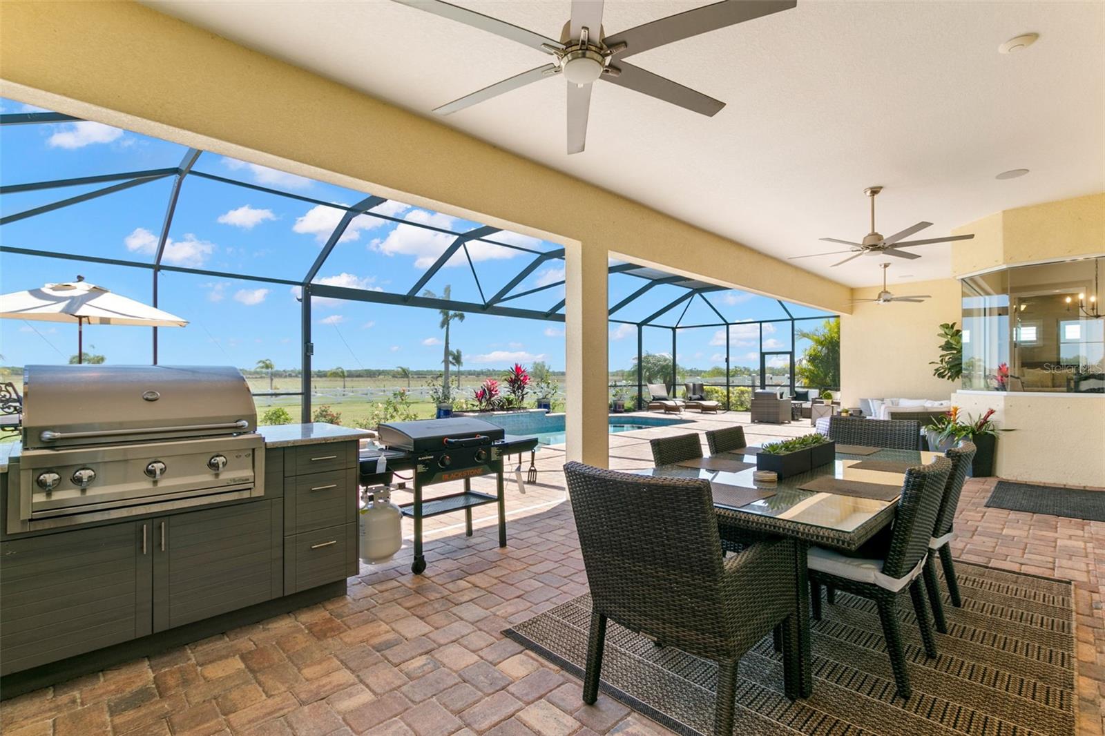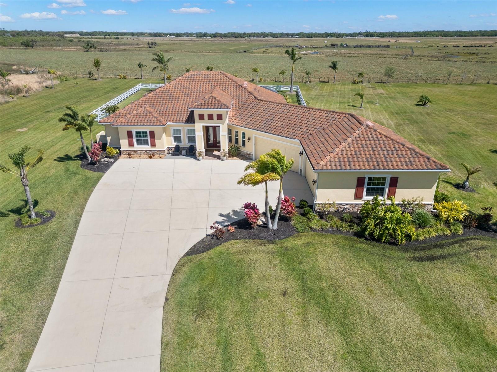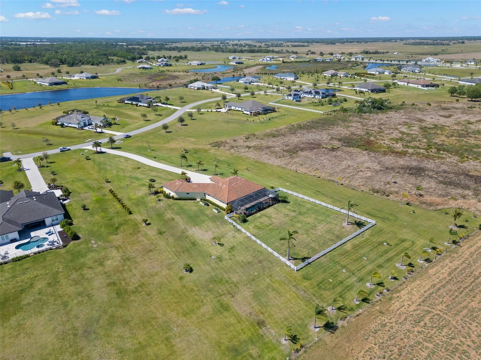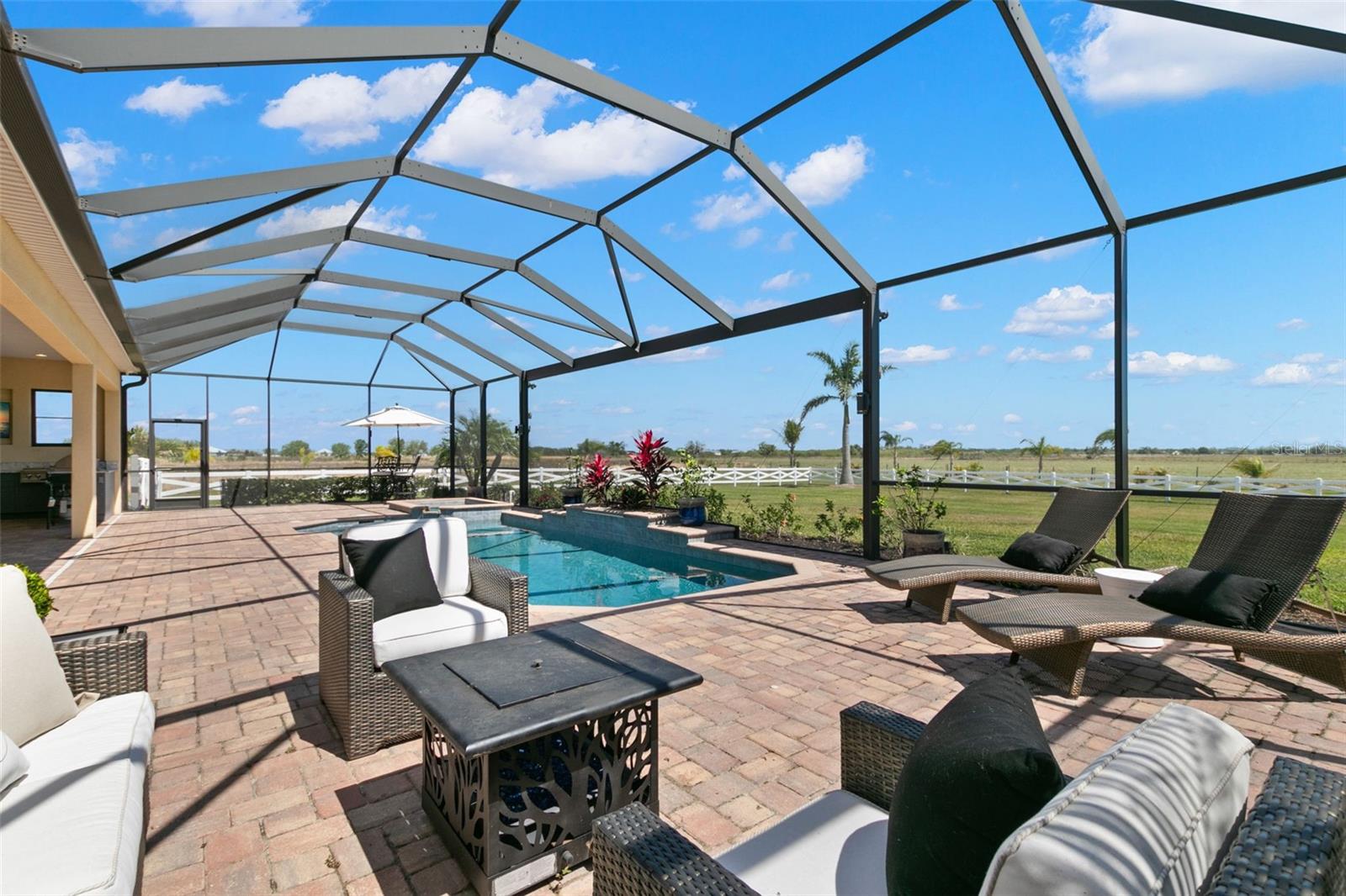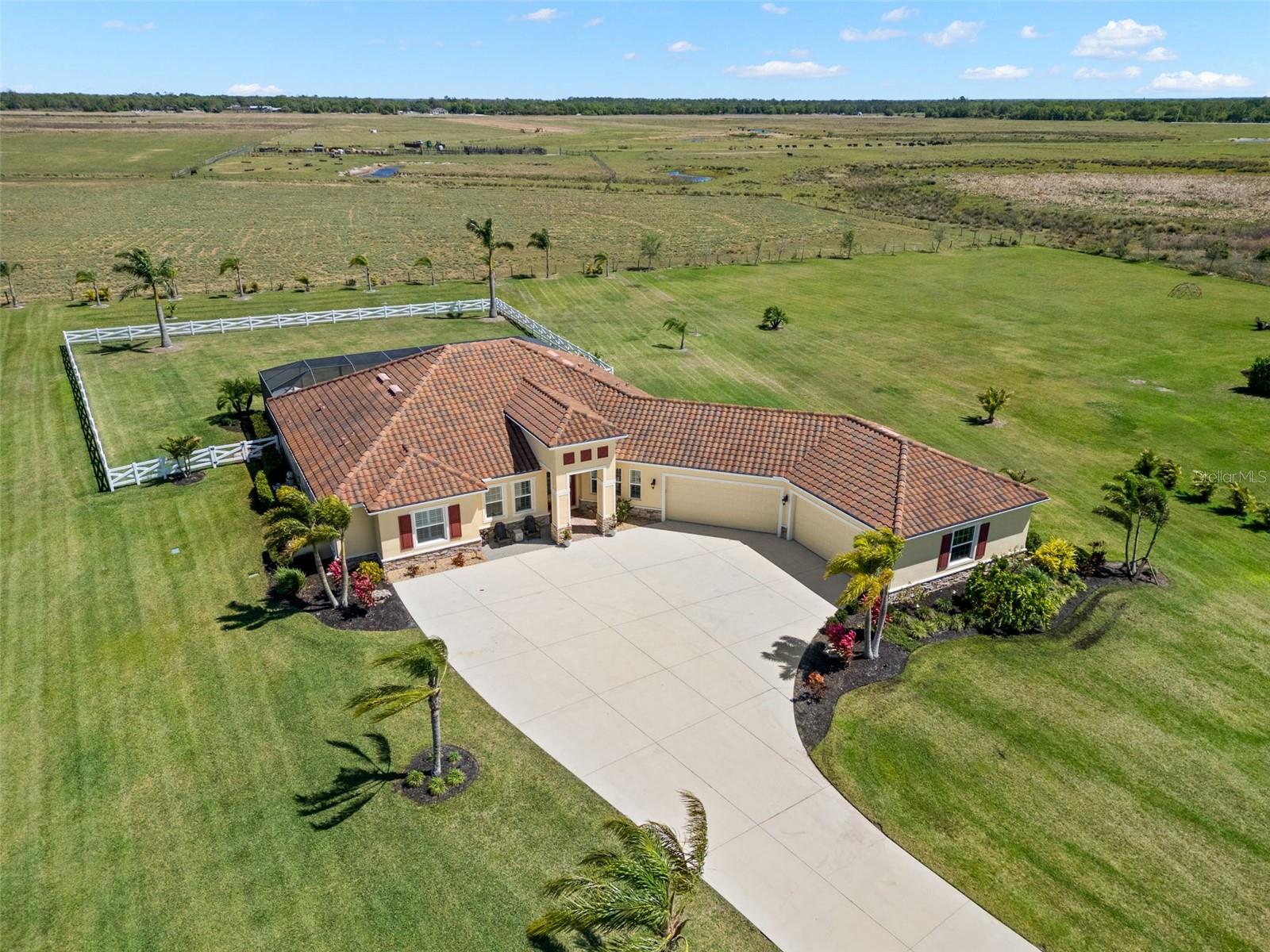 Set on an impressive 3.5-acre estate, this stunning home is the custom Caicos model nestled within the picturesque Hampton Lakes of Sarasota. As you step through the double glass doors, you’ll be greeted by a spacious open floor plan that includes a formal dining area and a versatile den. The den, adorned with double doors, a built-in Murphy bed, and sleek tile flooring, stands out as a unique and practical feature. The gourmet chef's kitchen is a dream come true, showcasing 42-inch wooden cabinets, a built-in wall oven, an induction cooktop, a stainless steel range hood, quartz countertops, a corner walk-in pantry, and a central island with bar-top seating. A cozy breakfast nook complements this culinary haven. The expansive great room offers a warm and inviting space perfect for hosting family and friends. Elegant details such as tray ceilings, plantation shutters, and crown molding elevate the home’s aesthetic charm. The property features two well-appointed bedroom suites, each with a private bath for added convenience. The oversized primary suite is a luxurious retreat, complete with walk-in closets and a spa-inspired master bathroom featuring double vanities and a generously sized walk-in shower. Step outside to the sprawling lanai, where you'll find a heated saltwater pool, a fire pit, and a state-of-the-art outdoor kitchen equipped with stone countertops, a refrigerator, a double burner, and a space for a large TV. Panoramic screens provide unobstructed views, creating a serene and tranquil outdoor oasis. Additional highlights of this remarkable property include an extended laundry room, an oversized four-car garage with air conditioning, a whole-house portable generator, outdoor lighting, and a buried 1,000-gallon propane tank. Conveniently located just 10 minutes from I-75, this exquisite residence combines the peace of open spaces with easy access to nearby shopping and dining, offering a lifestyle of unmatched comfort and elegance. Be sure to check out the Mattersport 3D tour.