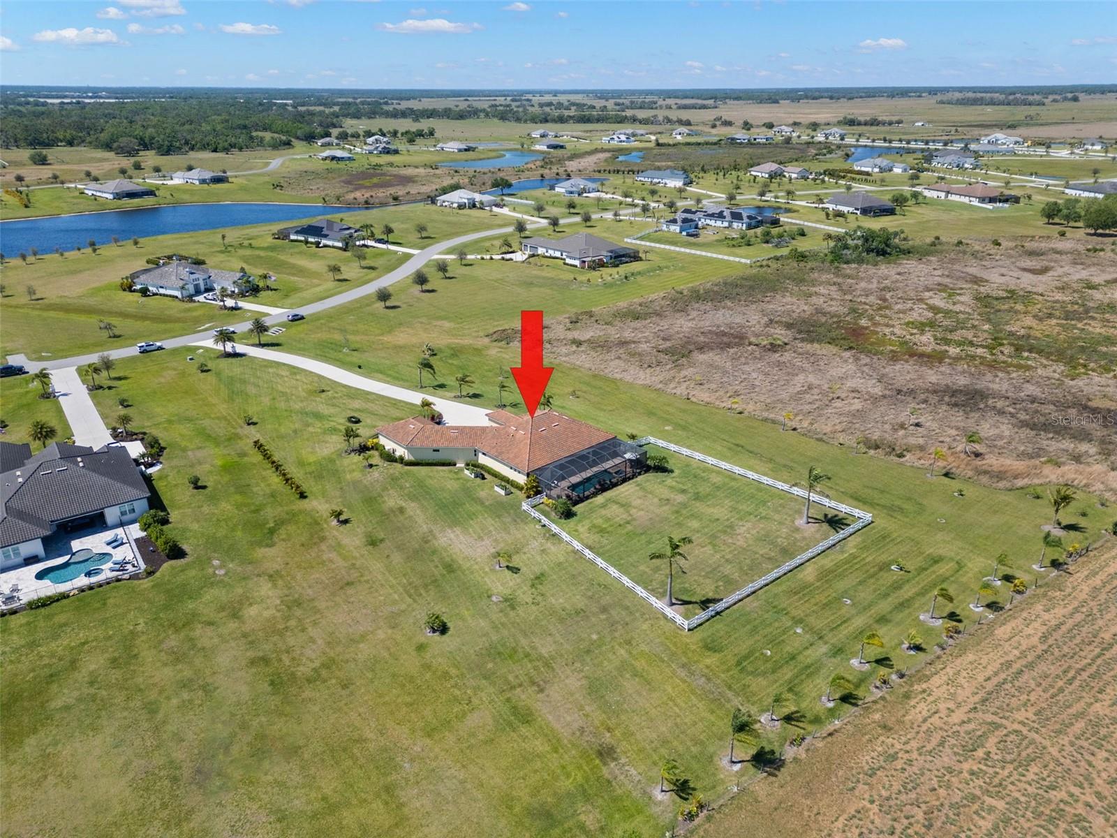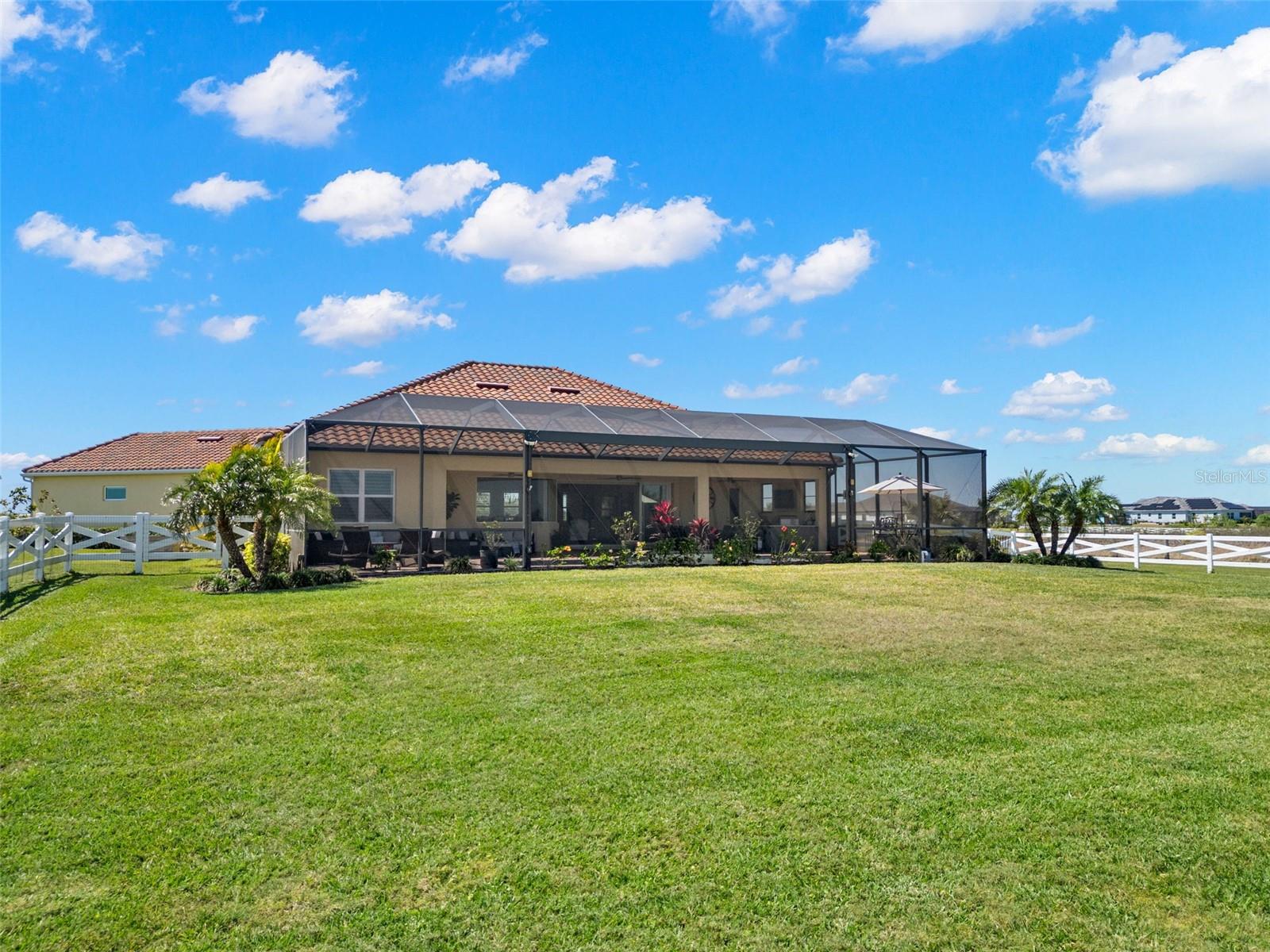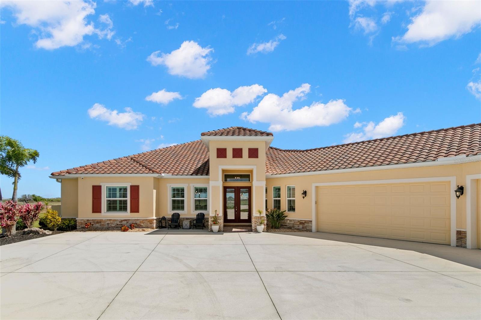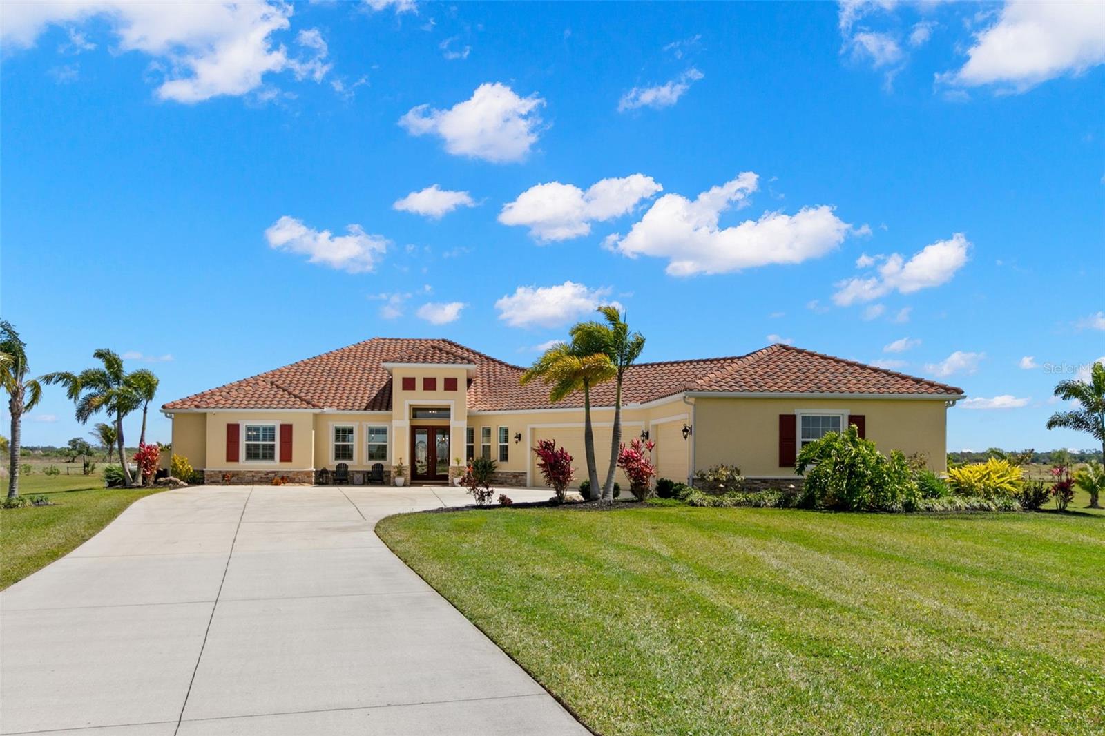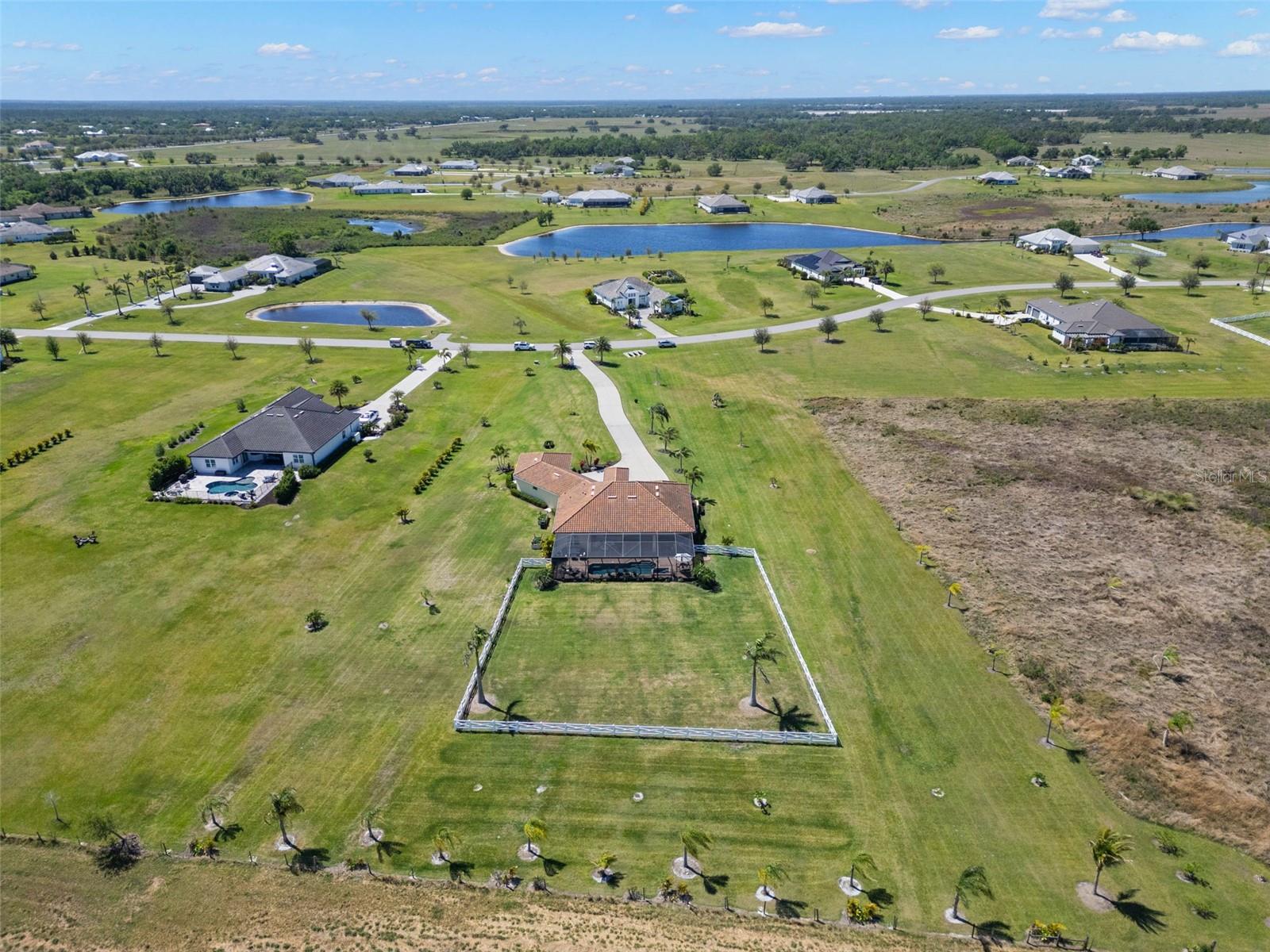 Set on an impressive 3.5-acre estate, this stunning home is the custom Caicos model nestled within the picturesque Hampton Lakes of Sarasota. As you step through the double glass doors, you’ll be greeted by a spacious open floor plan that includes a formal dining area and a versatile den. The den, adorned with double doors, a built-in Murphy bed, and sleek tile flooring, stands out as a unique and practical feature. The gourmet chef's kitchen is a dream come true, showcasing 42-inch wooden cabinets, a built-in wall oven, an induction cooktop, a stainless steel range hood, quartz countertops, a corner walk-in pantry, and a central island with bar-top seating. A cozy breakfast nook complements this culinary haven. The expansive great room offers a warm and inviting space perfect for hosting family and friends. Elegant details such as tray ceilings, plantation shutters, and crown molding elevate the home’s aesthetic charm. The property features two well-appointed bedroom suites, each with a private bath for added convenience. The oversized primary suite is a luxurious retreat, complete with walk-in closets and a spa-inspired master bathroom featuring double vanities and a generously sized walk-in shower. Step outside to the sprawling lanai, where you'll find a heated saltwater pool, a fire pit, and a state-of-the-art outdoor kitchen equipped with stone countertops, a refrigerator, a double burner, and a space for a large TV. Panoramic screens provide unobstructed views, creating a serene and tranquil outdoor oasis. Additional highlights of this remarkable property include an extended laundry room, an oversized four-car garage with air conditioning, a whole-house portable generator, outdoor lighting, and a buried 1,000-gallon propane tank. Conveniently located just 10 minutes from I-75, this exquisite residence combines the peace of open spaces with easy access to nearby shopping and dining, offering a lifestyle of unmatched comfort and elegance. Be sure to check out the Mattersport 3D tour.