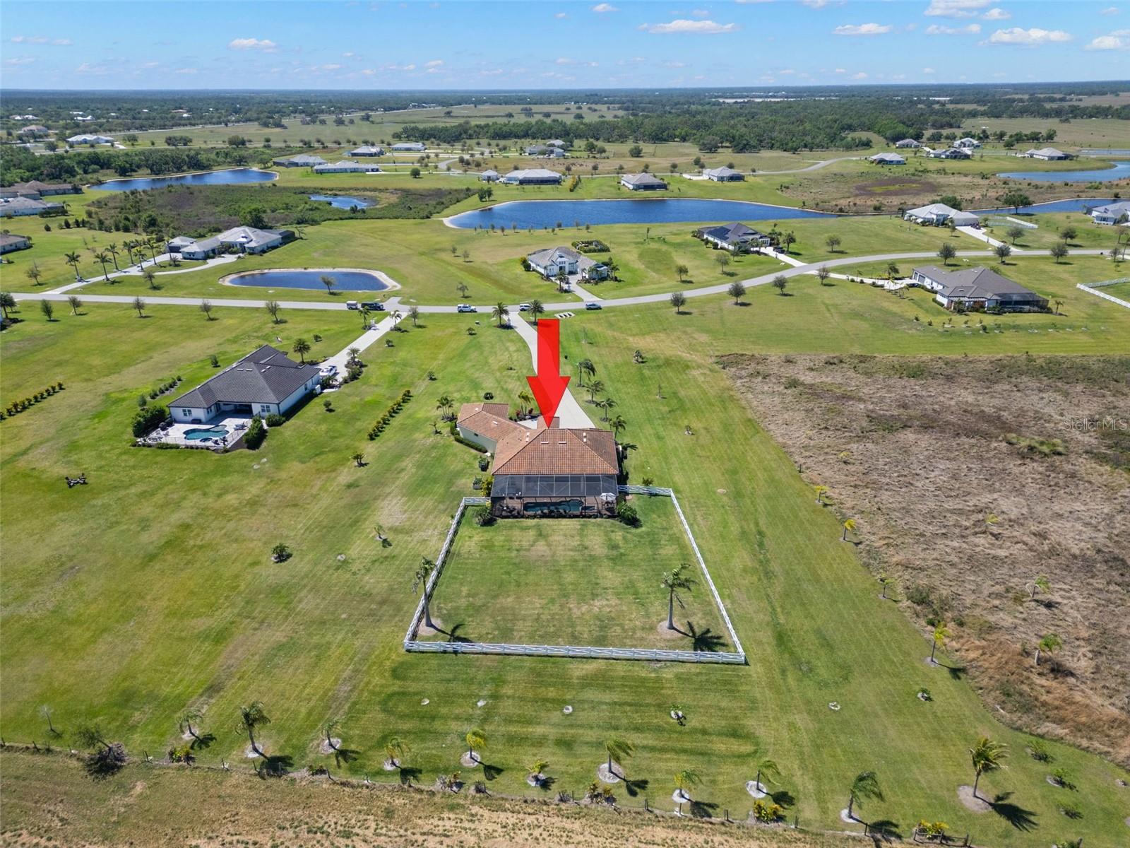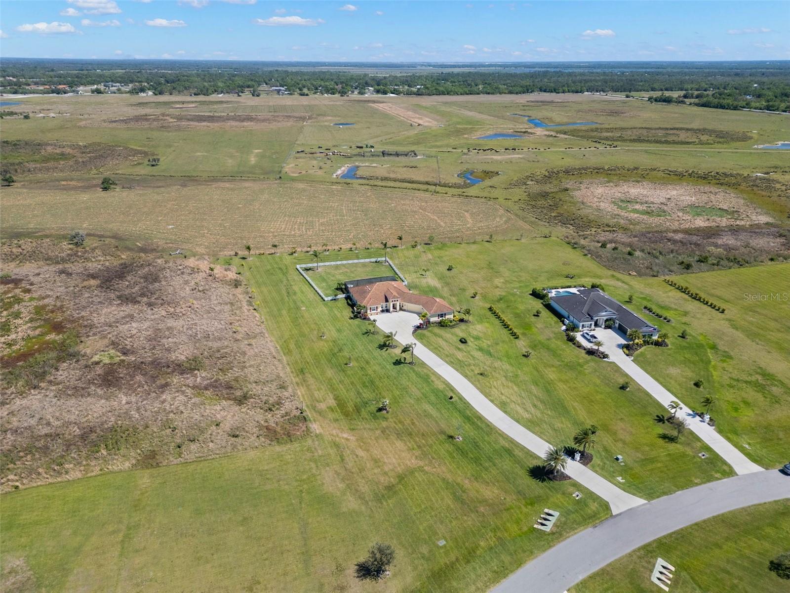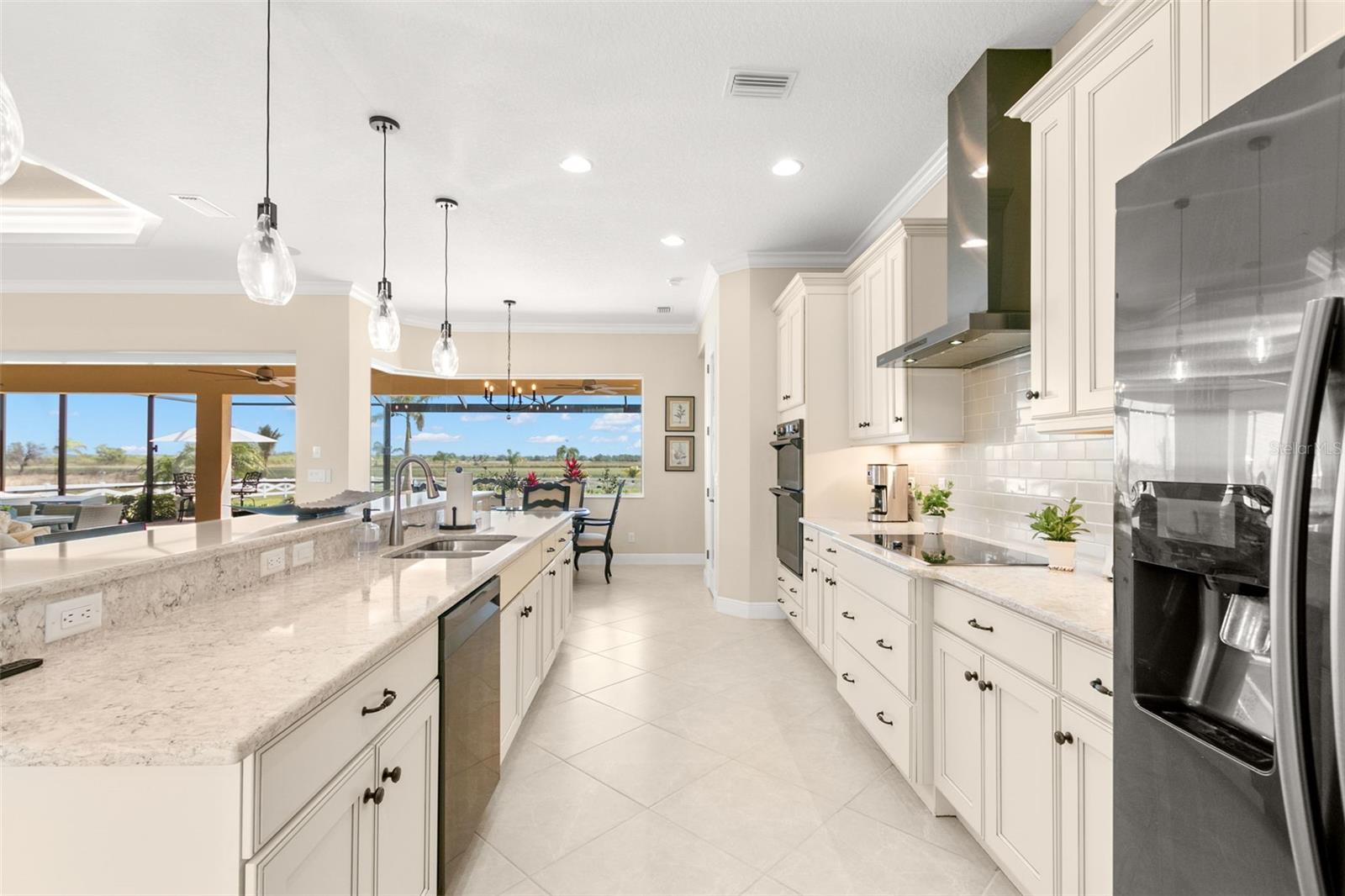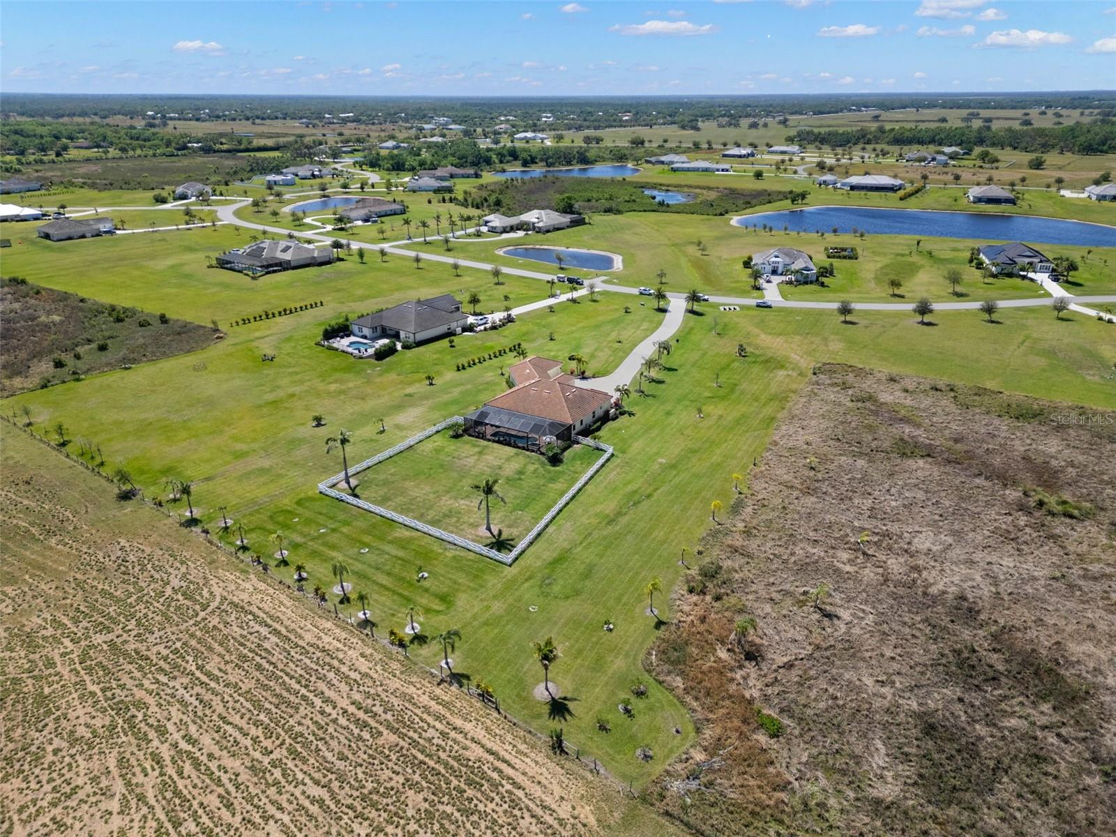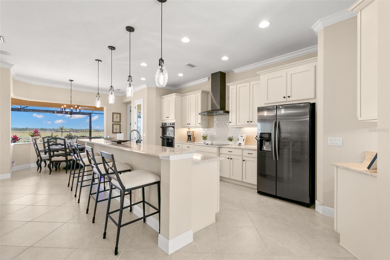 Set on an impressive 3.5-acre estate, this stunning home is the custom Caicos model nestled within the picturesque Hampton Lakes of Sarasota. As you step through the double glass doors, you’ll be greeted by a spacious open floor plan that includes a formal dining area and a versatile den. The den, adorned with double doors, a built-in Murphy bed, and sleek tile flooring, stands out as a unique and practical feature. The gourmet chef's kitchen is a dream come true, showcasing 42-inch wooden cabinets, a built-in wall oven, an induction cooktop, a stainless steel range hood, quartz countertops, a corner walk-in pantry, and a central island with bar-top seating. A cozy breakfast nook complements this culinary haven. The expansive great room offers a warm and inviting space perfect for hosting family and friends. Elegant details such as tray ceilings, plantation shutters, and crown molding elevate the home’s aesthetic charm. The property features two well-appointed bedroom suites, each with a private bath for added convenience. The oversized primary suite is a luxurious retreat, complete with walk-in closets and a spa-inspired master bathroom featuring double vanities and a generously sized walk-in shower. Step outside to the sprawling lanai, where you'll find a heated saltwater pool, a fire pit, and a state-of-the-art outdoor kitchen equipped with stone countertops, a refrigerator, a double burner, and a space for a large TV. Panoramic screens provide unobstructed views, creating a serene and tranquil outdoor oasis. Additional highlights of this remarkable property include an extended laundry room, an oversized four-car garage with air conditioning, a whole-house portable generator, outdoor lighting, and a buried 1,000-gallon propane tank. Conveniently located just 10 minutes from I-75, this exquisite residence combines the peace of open spaces with easy access to nearby shopping and dining, offering a lifestyle of unmatched comfort and elegance. Be sure to check out the Mattersport 3D tour.