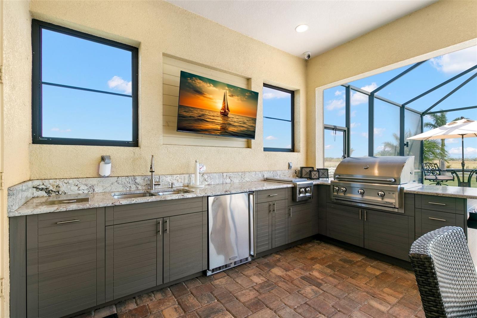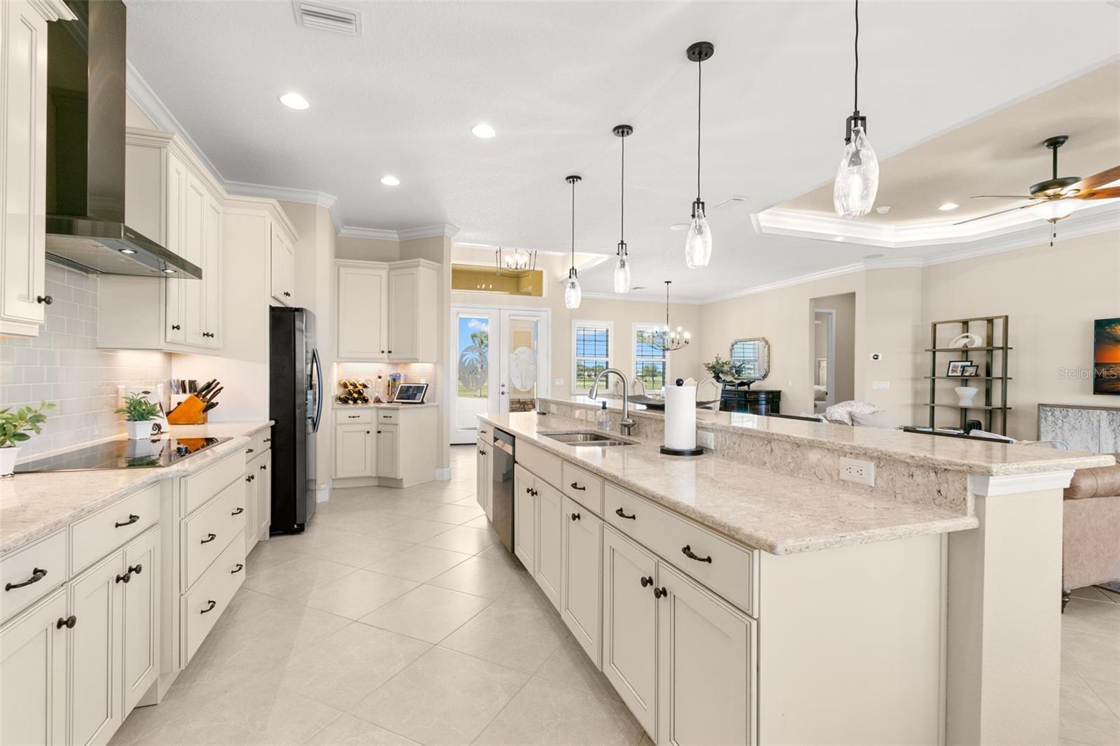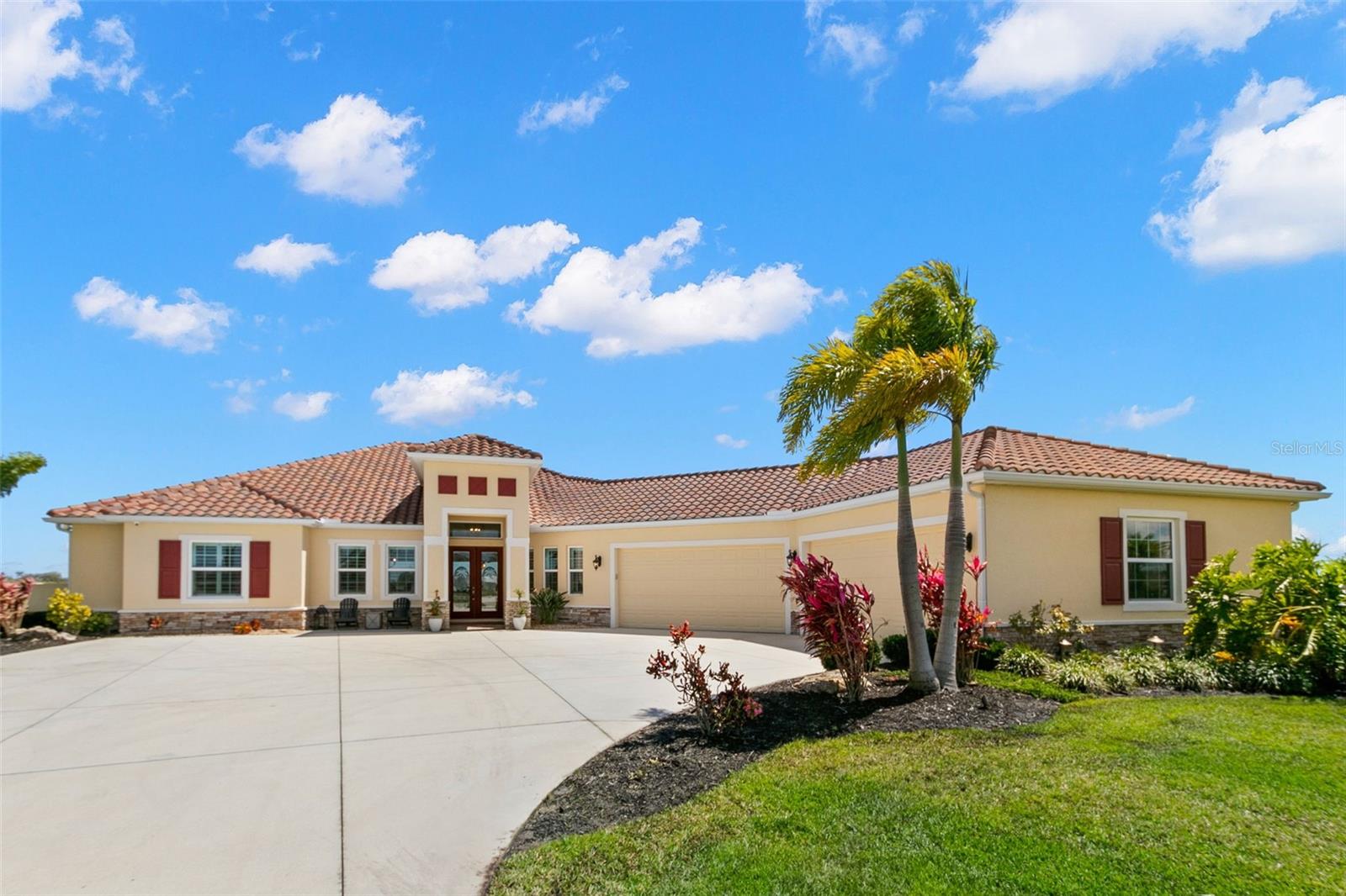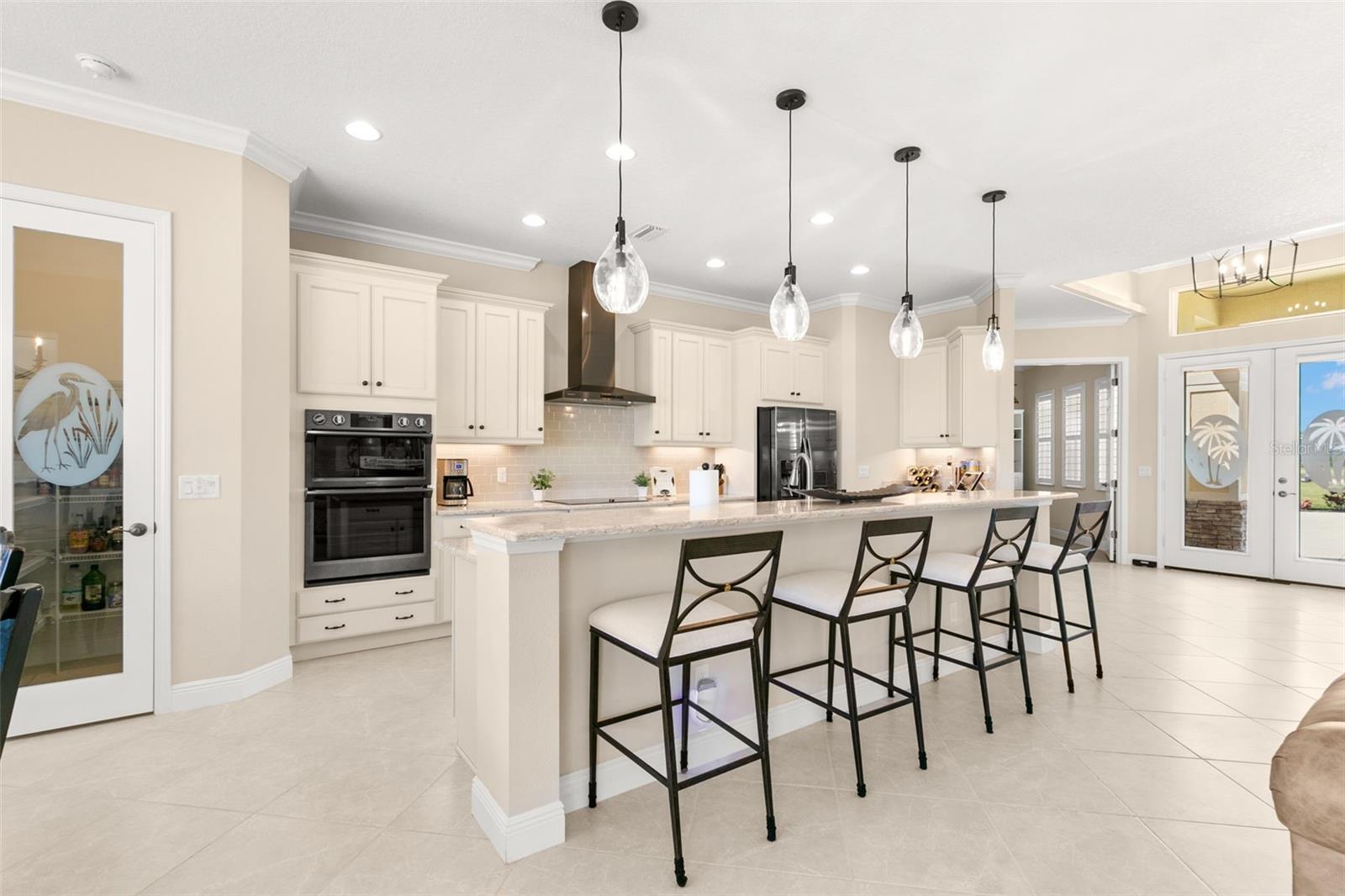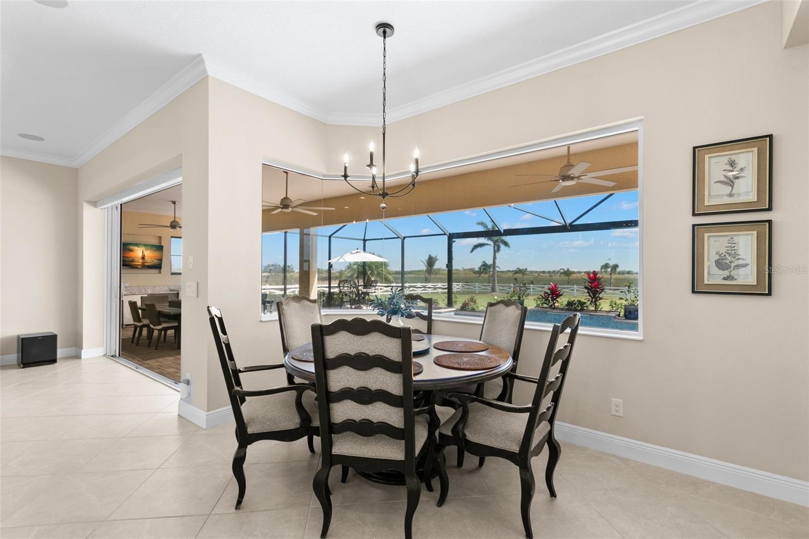 Set on an impressive 3.5-acre estate, this stunning home is the custom Caicos model nestled within the picturesque Hampton Lakes of Sarasota. As you step through the double glass doors, you’ll be greeted by a spacious open floor plan that includes a formal dining area and a versatile den. The den, adorned with double doors, a built-in Murphy bed, and sleek tile flooring, stands out as a unique and practical feature. The gourmet chef's kitchen is a dream come true, showcasing 42-inch wooden cabinets, a built-in wall oven, an induction cooktop, a stainless steel range hood, quartz countertops, a corner walk-in pantry, and a central island with bar-top seating. A cozy breakfast nook complements this culinary haven. The expansive great room offers a warm and inviting space perfect for hosting family and friends. Elegant details such as tray ceilings, plantation shutters, and crown molding elevate the home’s aesthetic charm. The property features two well-appointed bedroom suites, each with a private bath for added convenience. The oversized primary suite is a luxurious retreat, complete with walk-in closets and a spa-inspired master bathroom featuring double vanities and a generously sized walk-in shower. Step outside to the sprawling lanai, where you'll find a heated saltwater pool, a fire pit, and a state-of-the-art outdoor kitchen equipped with stone countertops, a refrigerator, a double burner, and a space for a large TV. Panoramic screens provide unobstructed views, creating a serene and tranquil outdoor oasis. Additional highlights of this remarkable property include an extended laundry room, an oversized four-car garage with air conditioning, a whole-house portable generator, outdoor lighting, and a buried 1,000-gallon propane tank. Conveniently located just 10 minutes from I-75, this exquisite residence combines the peace of open spaces with easy access to nearby shopping and dining, offering a lifestyle of unmatched comfort and elegance. Be sure to check out the Mattersport 3D tour.
