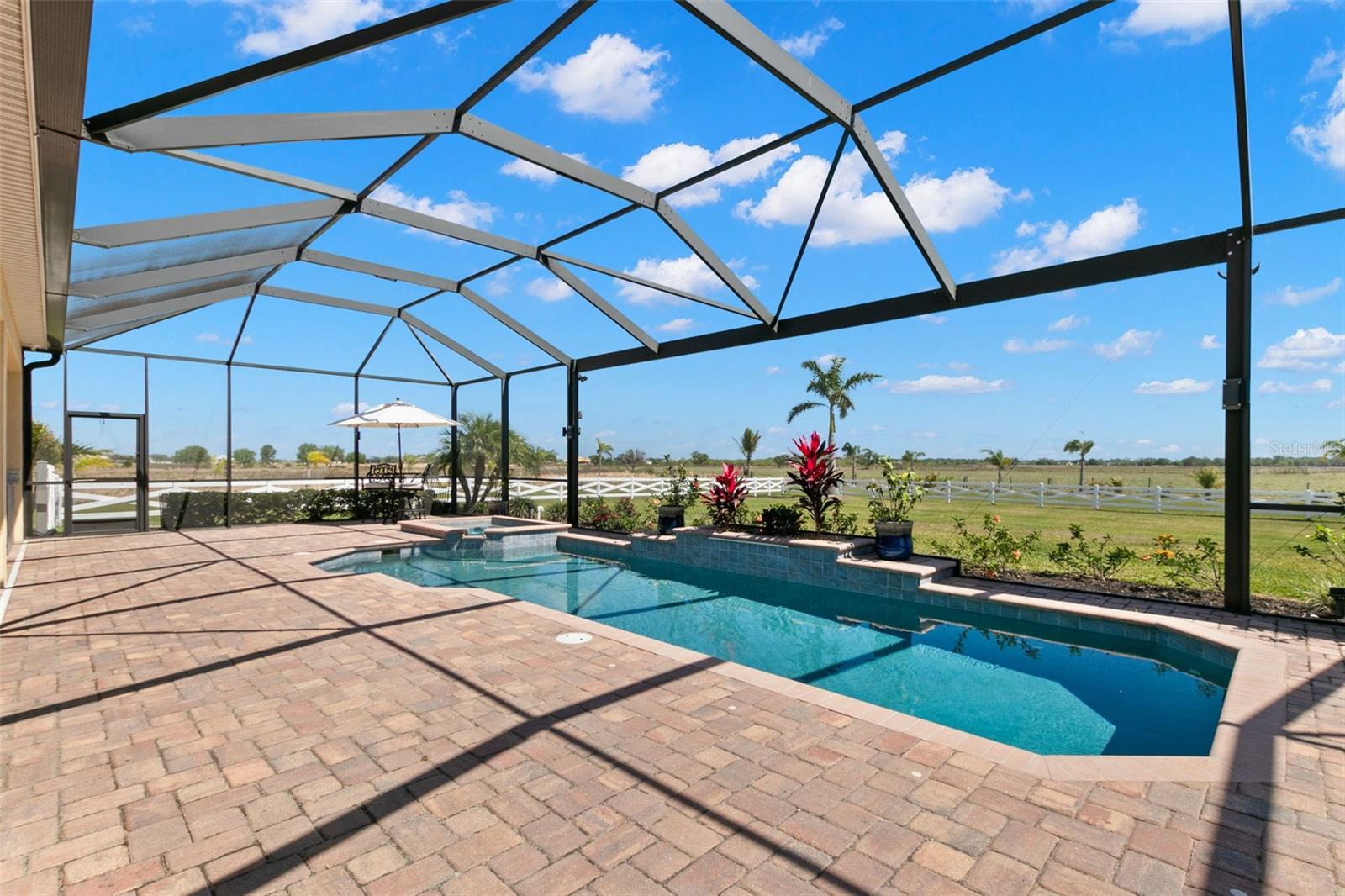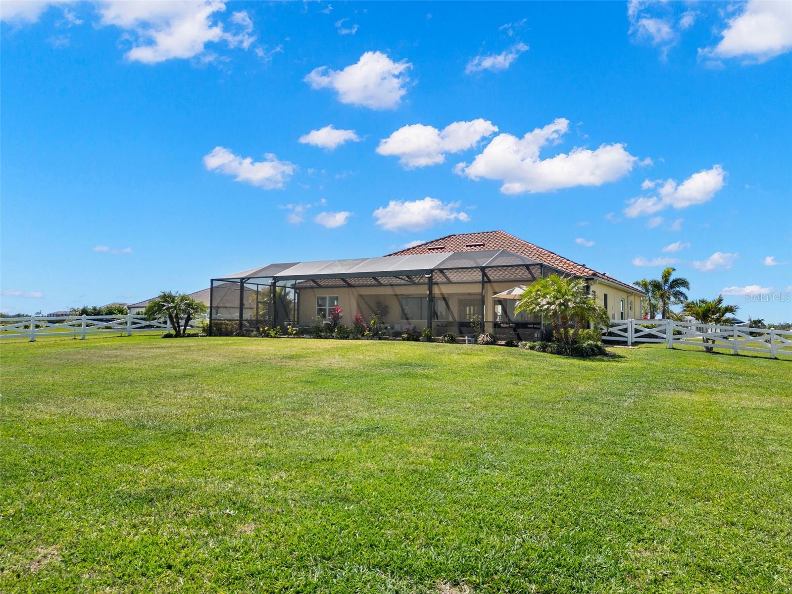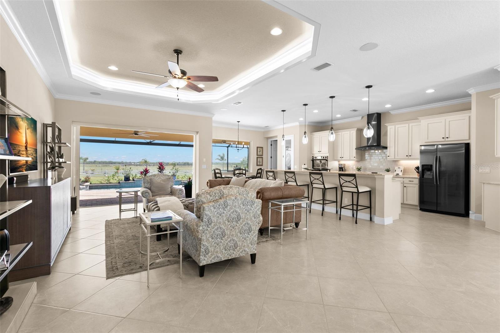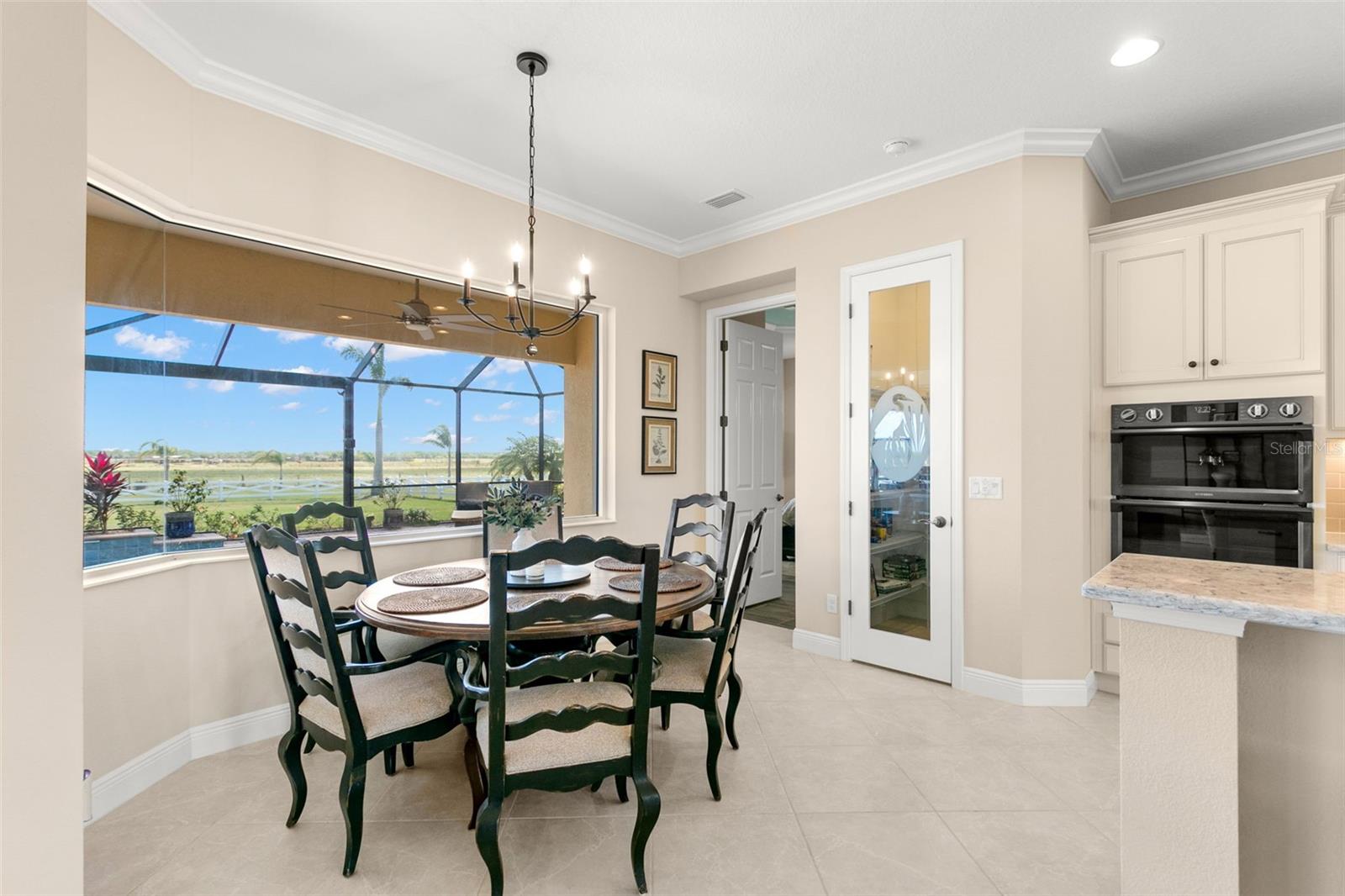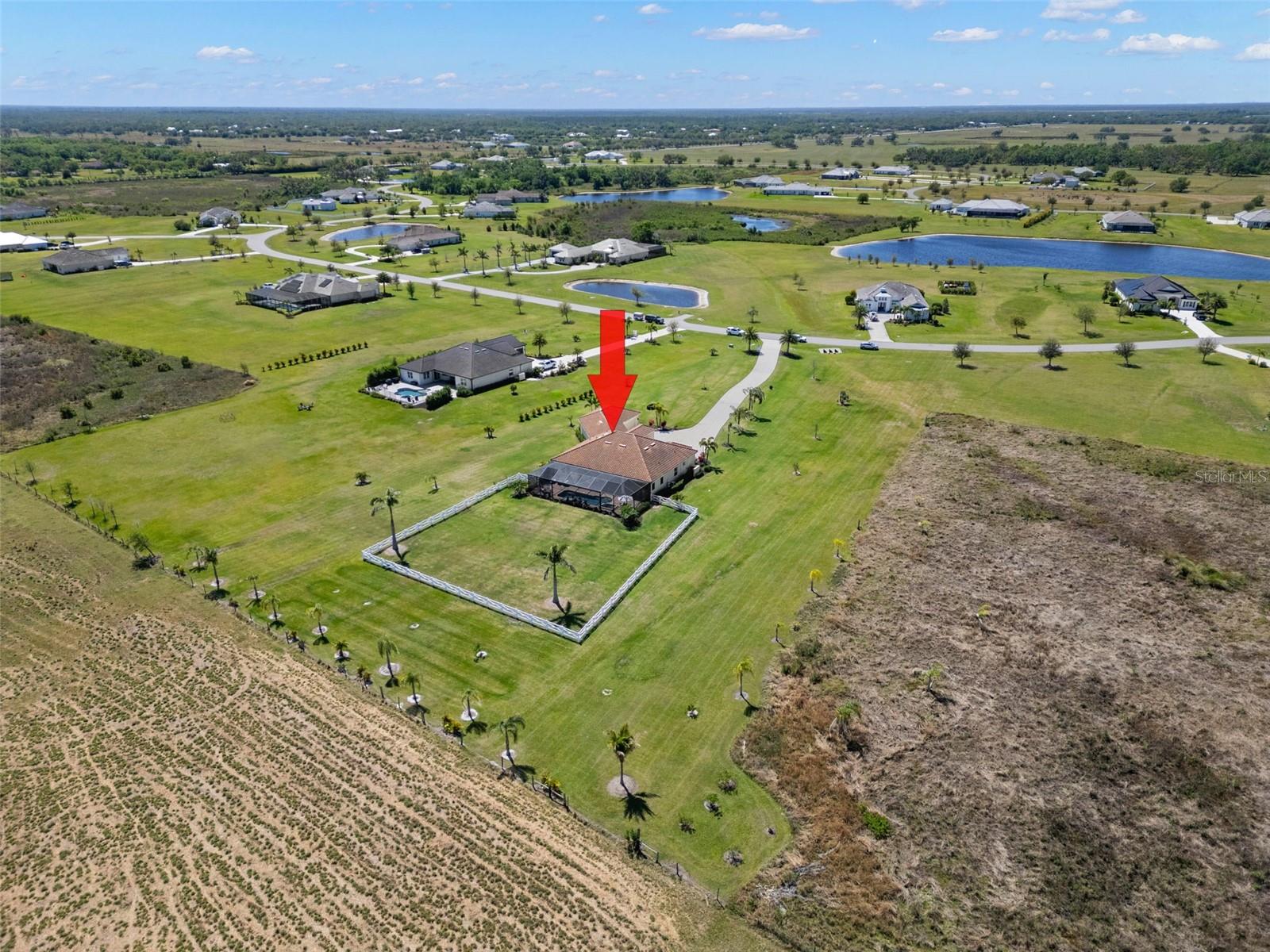 Set on an impressive 3.5-acre estate, this stunning home is the custom Caicos model nestled within the picturesque Hampton Lakes of Sarasota. As you step through the double glass doors, you’ll be greeted by a spacious open floor plan that includes a formal dining area and a versatile den. The den, adorned with double doors, a built-in Murphy bed, and sleek tile flooring, stands out as a unique and practical feature. The gourmet chef's kitchen is a dream come true, showcasing 42-inch wooden cabinets, a built-in wall oven, an induction cooktop, a stainless steel range hood, quartz countertops, a corner walk-in pantry, and a central island with bar-top seating. A cozy breakfast nook complements this culinary haven. The expansive great room offers a warm and inviting space perfect for hosting family and friends. Elegant details such as tray ceilings, plantation shutters, and crown molding elevate the home’s aesthetic charm. The property features two well-appointed bedroom suites, each with a private bath for added convenience. The oversized primary suite is a luxurious retreat, complete with walk-in closets and a spa-inspired master bathroom featuring double vanities and a generously sized walk-in shower. Step outside to the sprawling lanai, where you'll find a heated saltwater pool, a fire pit, and a state-of-the-art outdoor kitchen equipped with stone countertops, a refrigerator, a double burner, and a space for a large TV. Panoramic screens provide unobstructed views, creating a serene and tranquil outdoor oasis. Additional highlights of this remarkable property include an extended laundry room, an oversized four-car garage with air conditioning, a whole-house portable generator, outdoor lighting, and a buried 1,000-gallon propane tank. Conveniently located just 10 minutes from I-75, this exquisite residence combines the peace of open spaces with easy access to nearby shopping and dining, offering a lifestyle of unmatched comfort and elegance. Be sure to check out the Mattersport 3D tour.