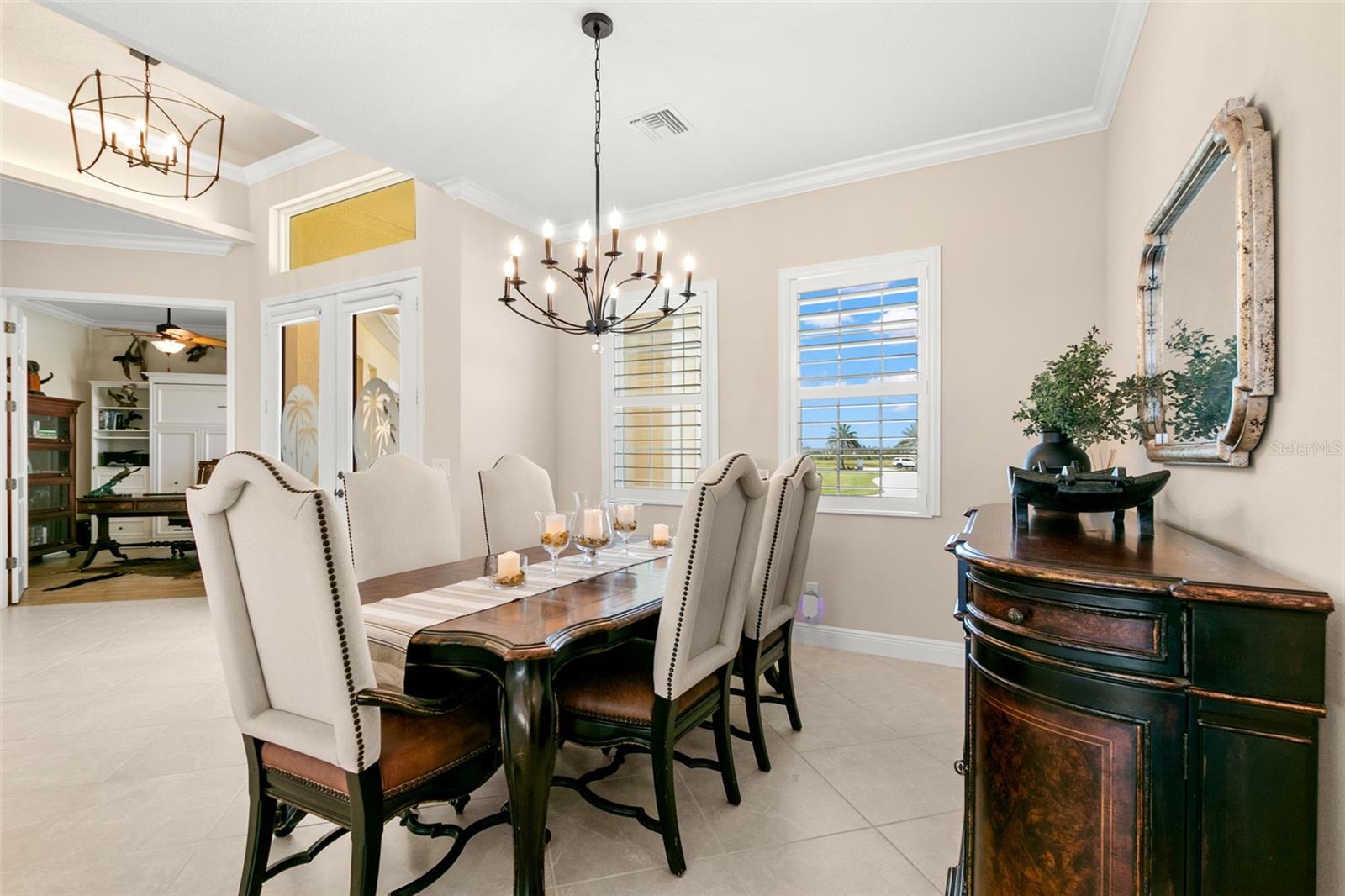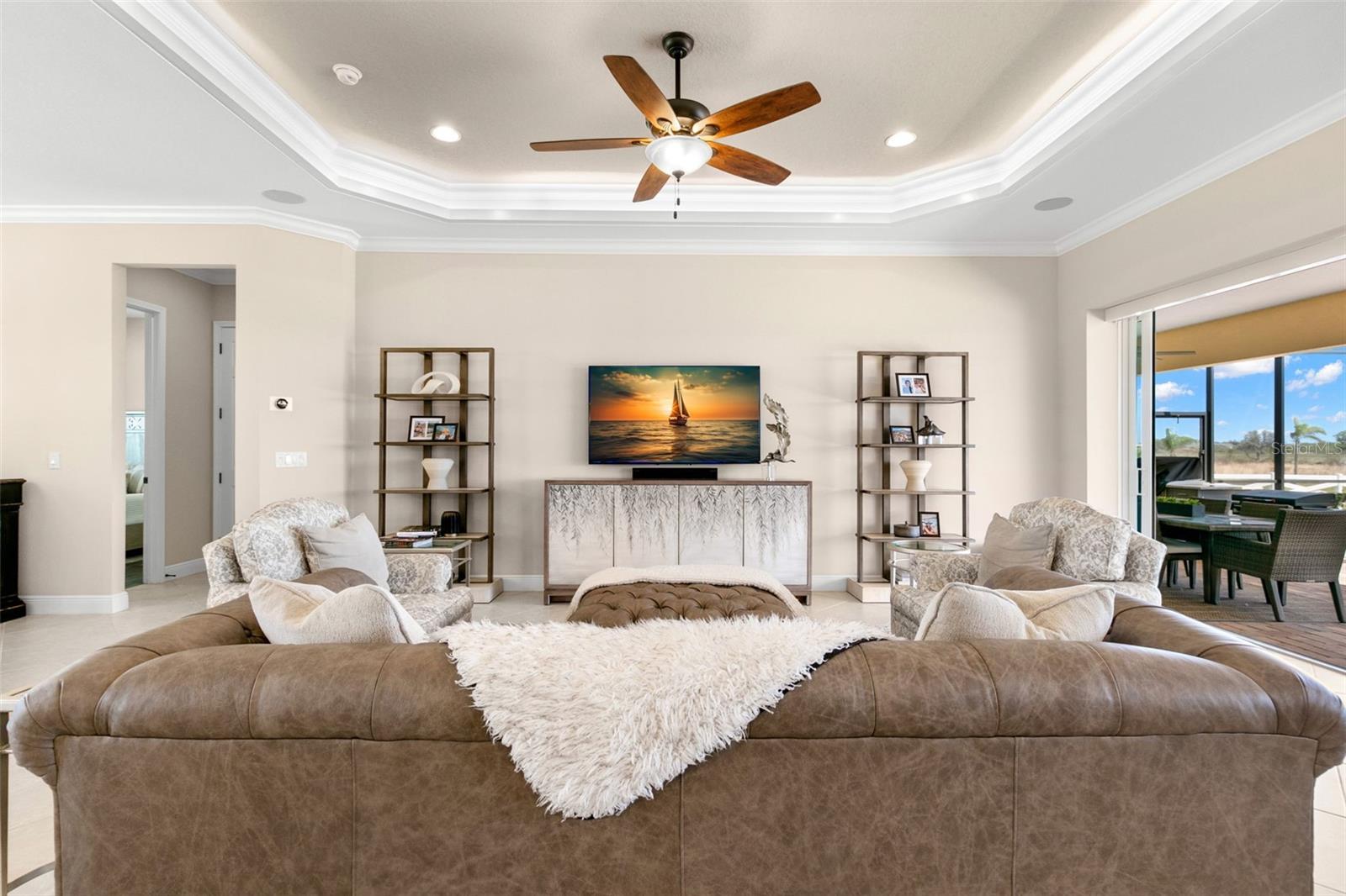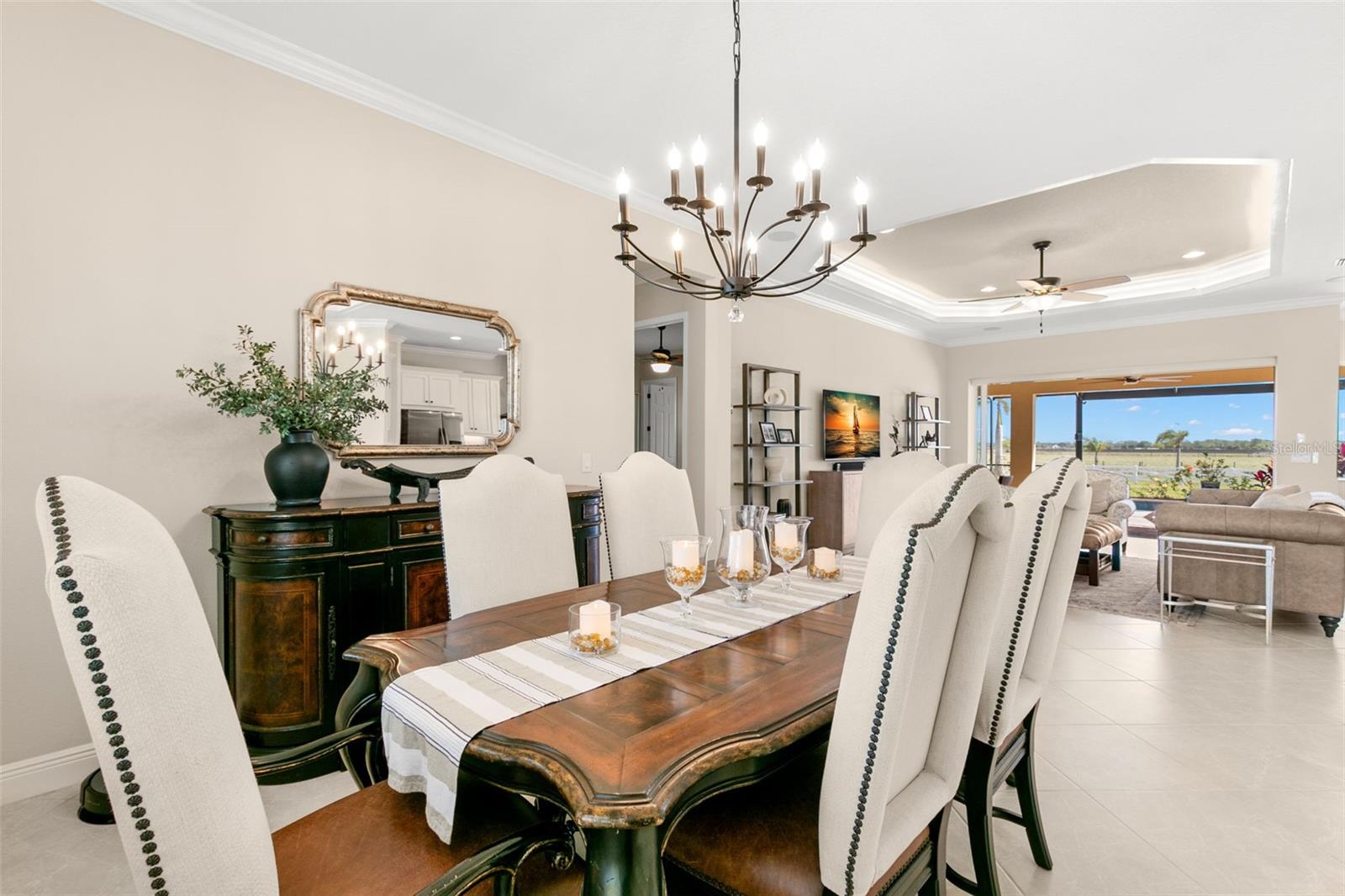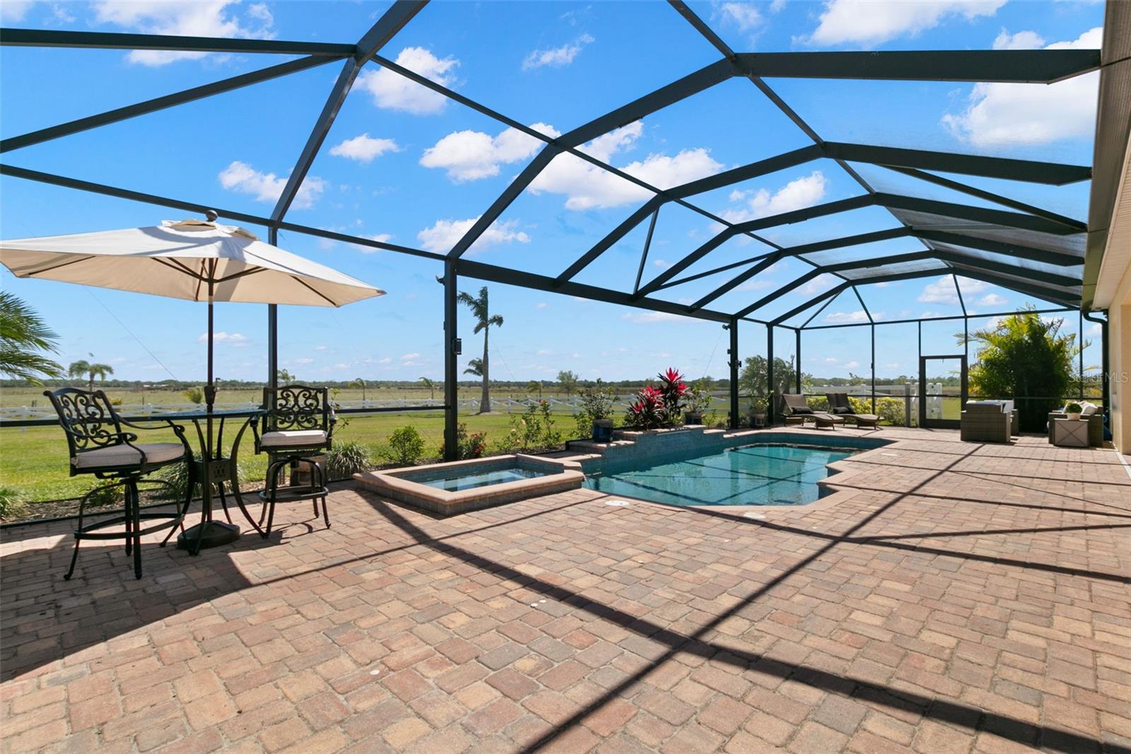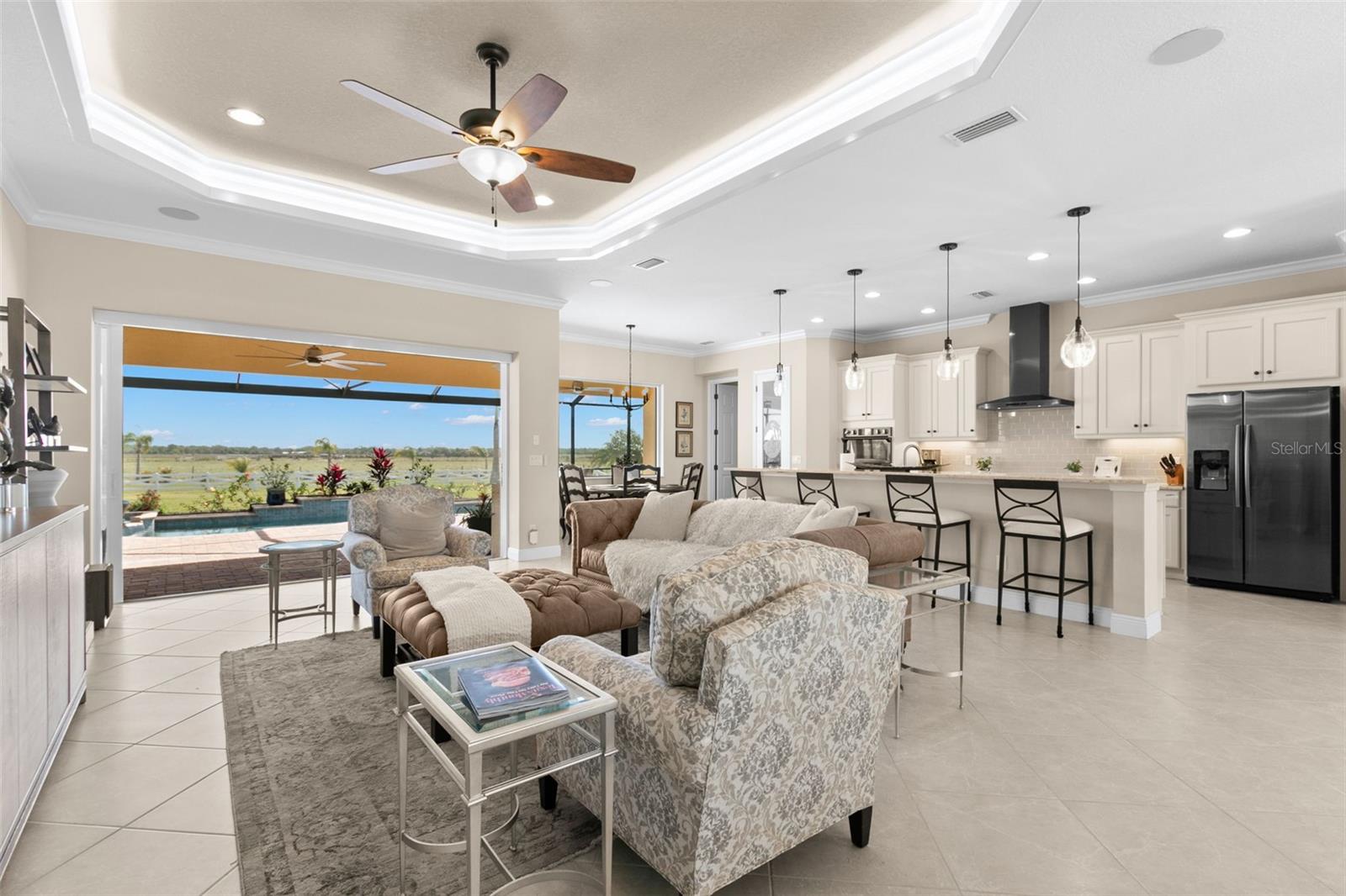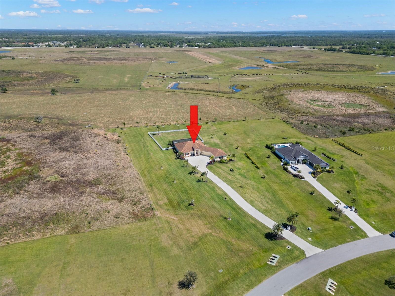 Set on an impressive 3.5-acre estate, this stunning home is the custom Caicos model nestled within the picturesque Hampton Lakes of Sarasota. As you step through the double glass doors, you’ll be greeted by a spacious open floor plan that includes a formal dining area and a versatile den. The den, adorned with double doors, a built-in Murphy bed, and sleek tile flooring, stands out as a unique and practical feature. The gourmet chef's kitchen is a dream come true, showcasing 42-inch wooden cabinets, a built-in wall oven, an induction cooktop, a stainless steel range hood, quartz countertops, a corner walk-in pantry, and a central island with bar-top seating. A cozy breakfast nook complements this culinary haven. The expansive great room offers a warm and inviting space perfect for hosting family and friends. Elegant details such as tray ceilings, plantation shutters, and crown molding elevate the home’s aesthetic charm. The property features two well-appointed bedroom suites, each with a private bath for added convenience. The oversized primary suite is a luxurious retreat, complete with walk-in closets and a spa-inspired master bathroom featuring double vanities and a generously sized walk-in shower. Step outside to the sprawling lanai, where you'll find a heated saltwater pool, a fire pit, and a state-of-the-art outdoor kitchen equipped with stone countertops, a refrigerator, a double burner, and a space for a large TV. Panoramic screens provide unobstructed views, creating a serene and tranquil outdoor oasis. Additional highlights of this remarkable property include an extended laundry room, an oversized four-car garage with air conditioning, a whole-house portable generator, outdoor lighting, and a buried 1,000-gallon propane tank. Conveniently located just 10 minutes from I-75, this exquisite residence combines the peace of open spaces with easy access to nearby shopping and dining, offering a lifestyle of unmatched comfort and elegance. Be sure to check out the Mattersport 3D tour.