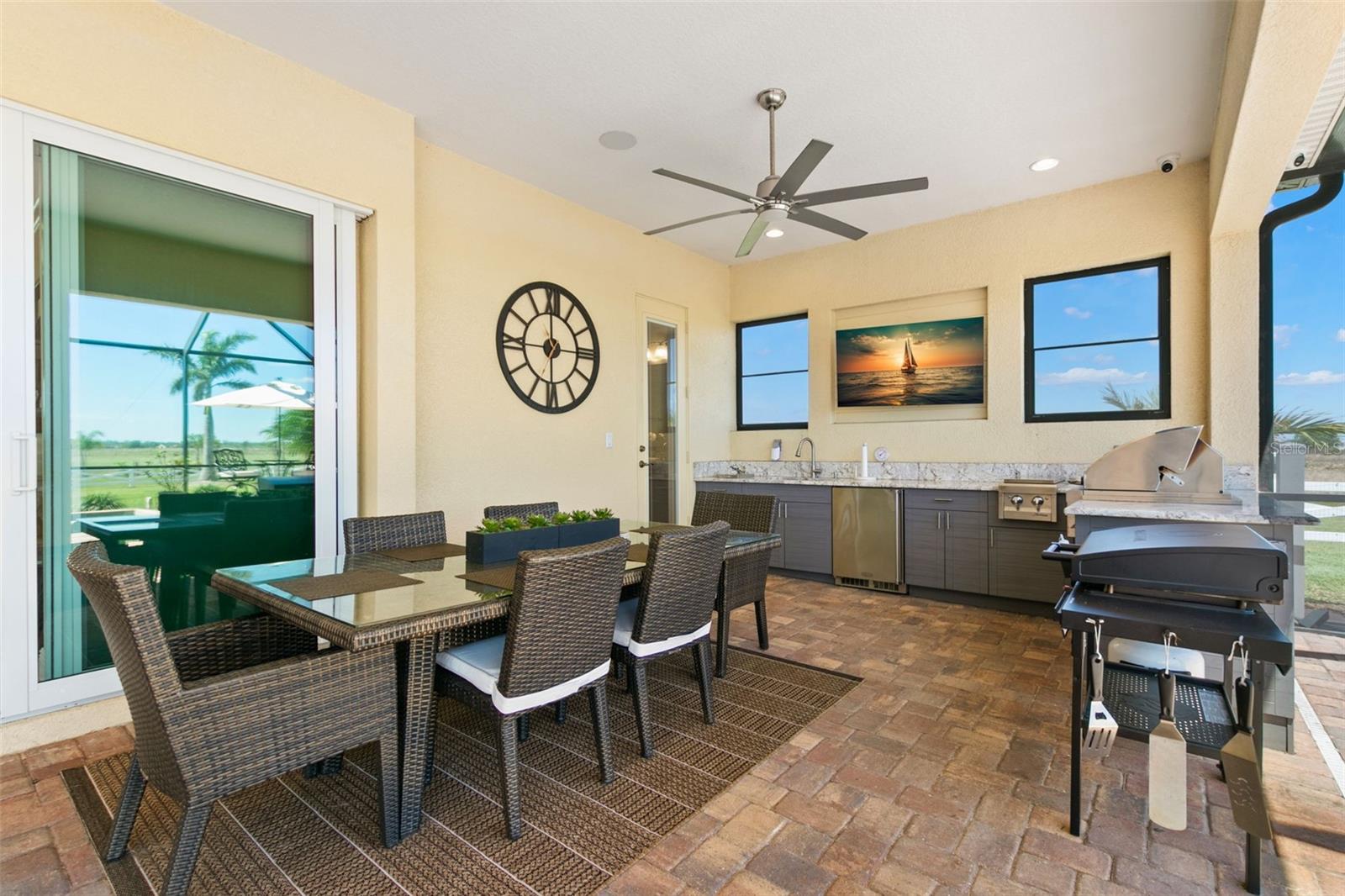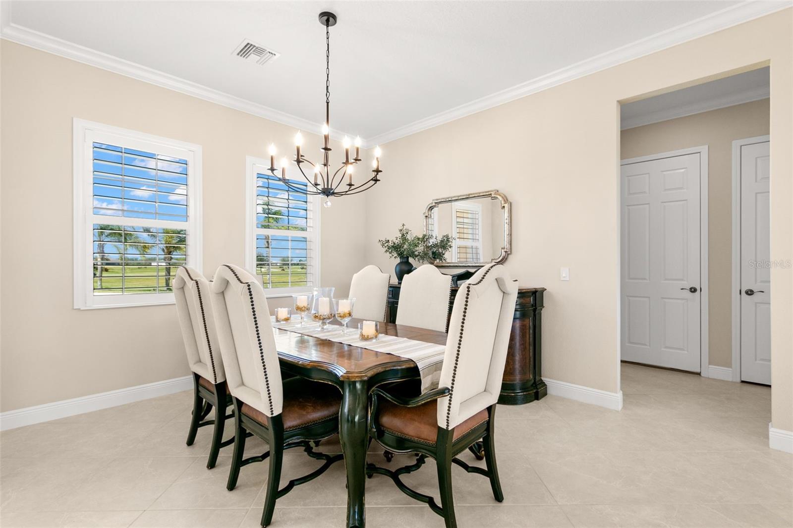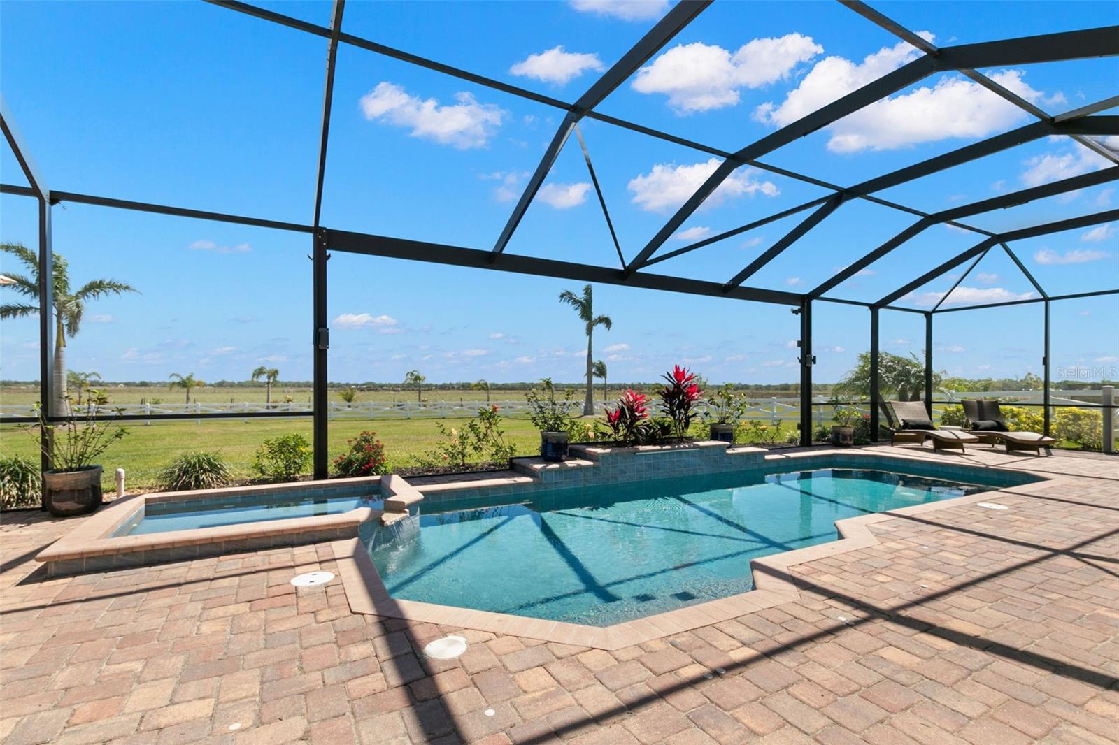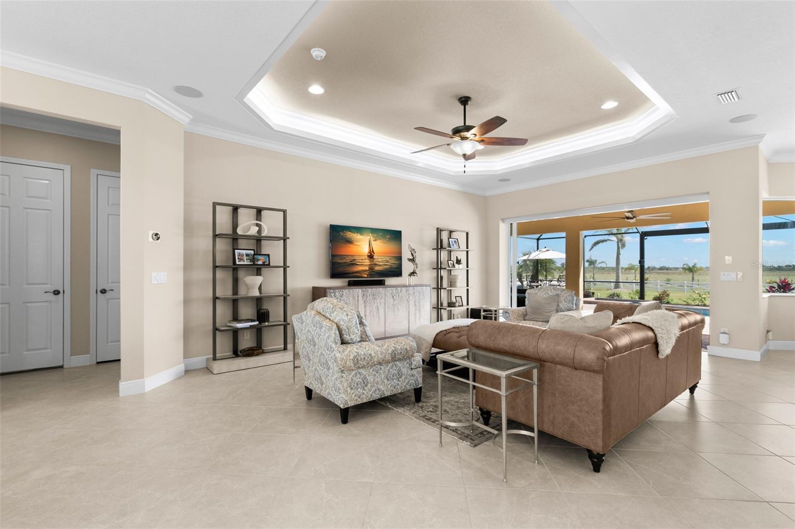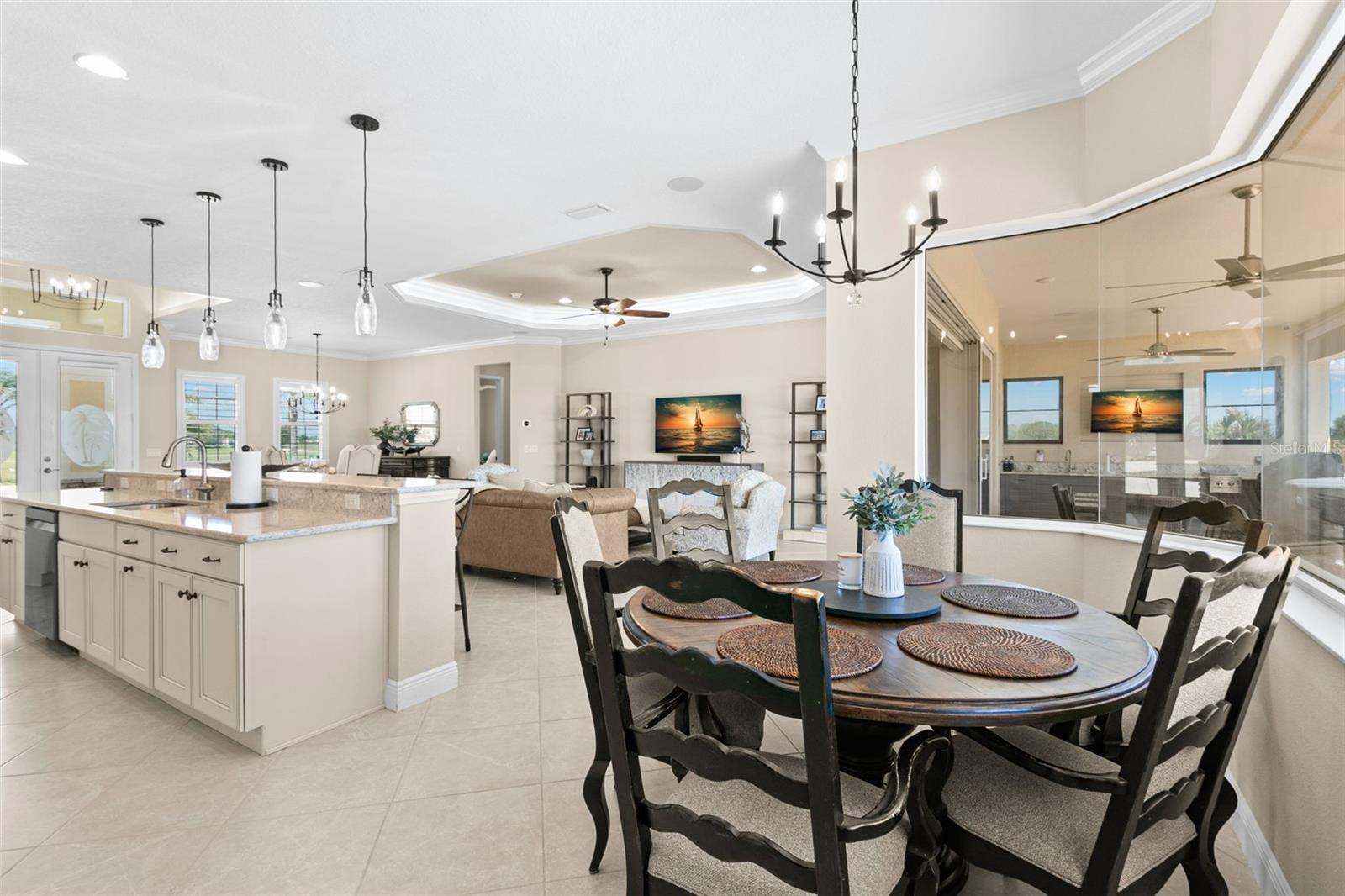 Set on an impressive 3.5-acre estate, this stunning home is the custom Caicos model nestled within the picturesque Hampton Lakes of Sarasota. As you step through the double glass doors, you’ll be greeted by a spacious open floor plan that includes a formal dining area and a versatile den. The den, adorned with double doors, a built-in Murphy bed, and sleek tile flooring, stands out as a unique and practical feature. The gourmet chef's kitchen is a dream come true, showcasing 42-inch wooden cabinets, a built-in wall oven, an induction cooktop, a stainless steel range hood, quartz countertops, a corner walk-in pantry, and a central island with bar-top seating. A cozy breakfast nook complements this culinary haven. The expansive great room offers a warm and inviting space perfect for hosting family and friends. Elegant details such as tray ceilings, plantation shutters, and crown molding elevate the home’s aesthetic charm. The property features two well-appointed bedroom suites, each with a private bath for added convenience. The oversized primary suite is a luxurious retreat, complete with walk-in closets and a spa-inspired master bathroom featuring double vanities and a generously sized walk-in shower. Step outside to the sprawling lanai, where you'll find a heated saltwater pool, a fire pit, and a state-of-the-art outdoor kitchen equipped with stone countertops, a refrigerator, a double burner, and a space for a large TV. Panoramic screens provide unobstructed views, creating a serene and tranquil outdoor oasis. Additional highlights of this remarkable property include an extended laundry room, an oversized four-car garage with air conditioning, a whole-house portable generator, outdoor lighting, and a buried 1,000-gallon propane tank. Conveniently located just 10 minutes from I-75, this exquisite residence combines the peace of open spaces with easy access to nearby shopping and dining, offering a lifestyle of unmatched comfort and elegance. Be sure to check out the Mattersport 3D tour.