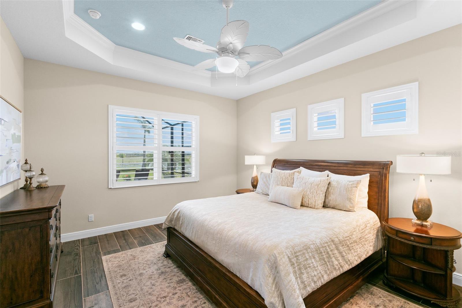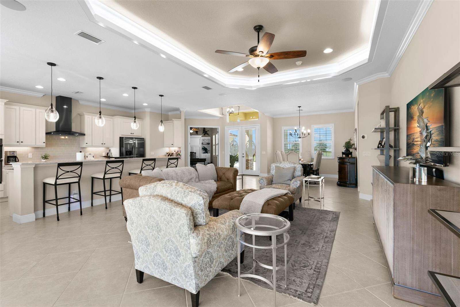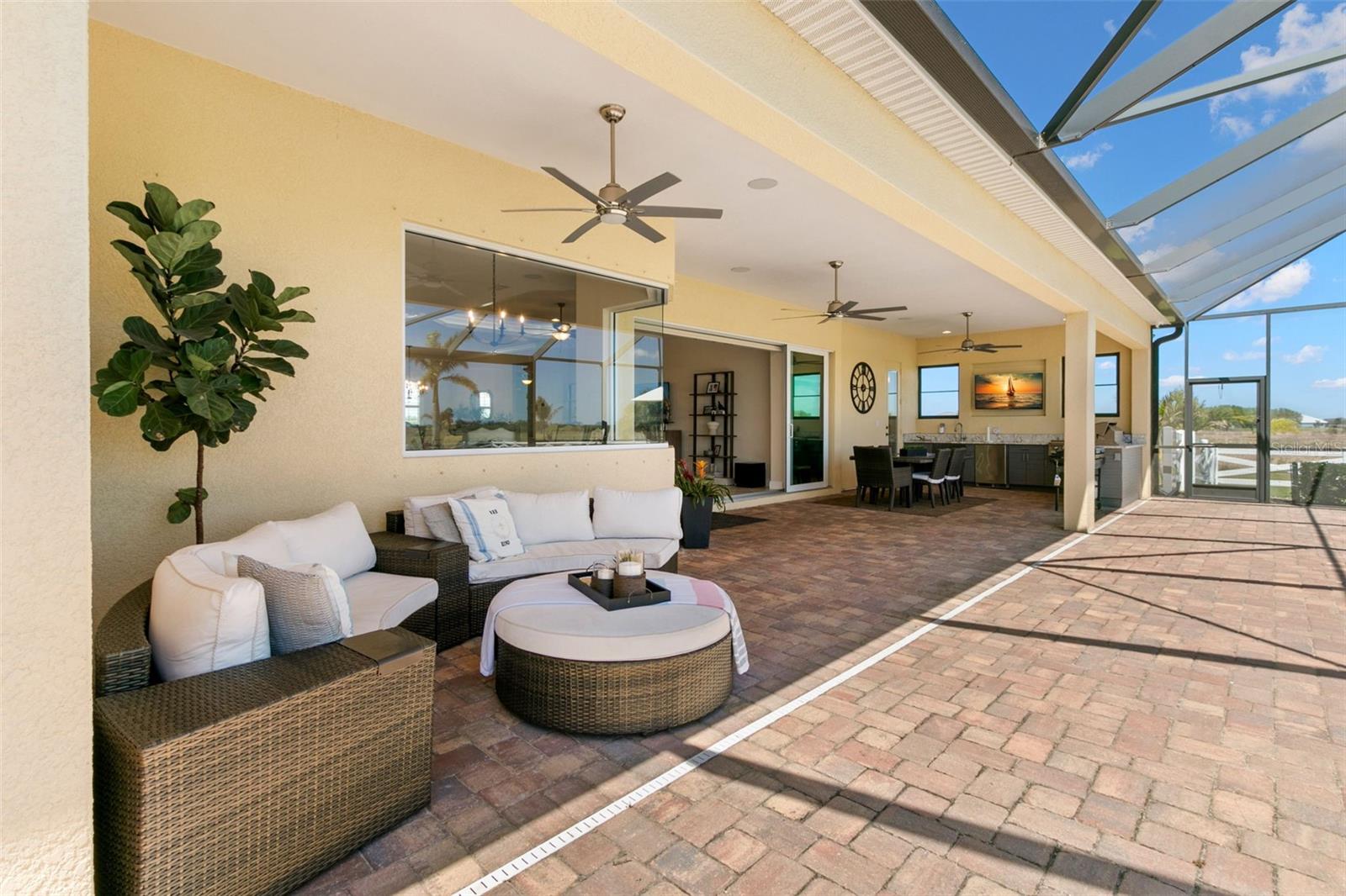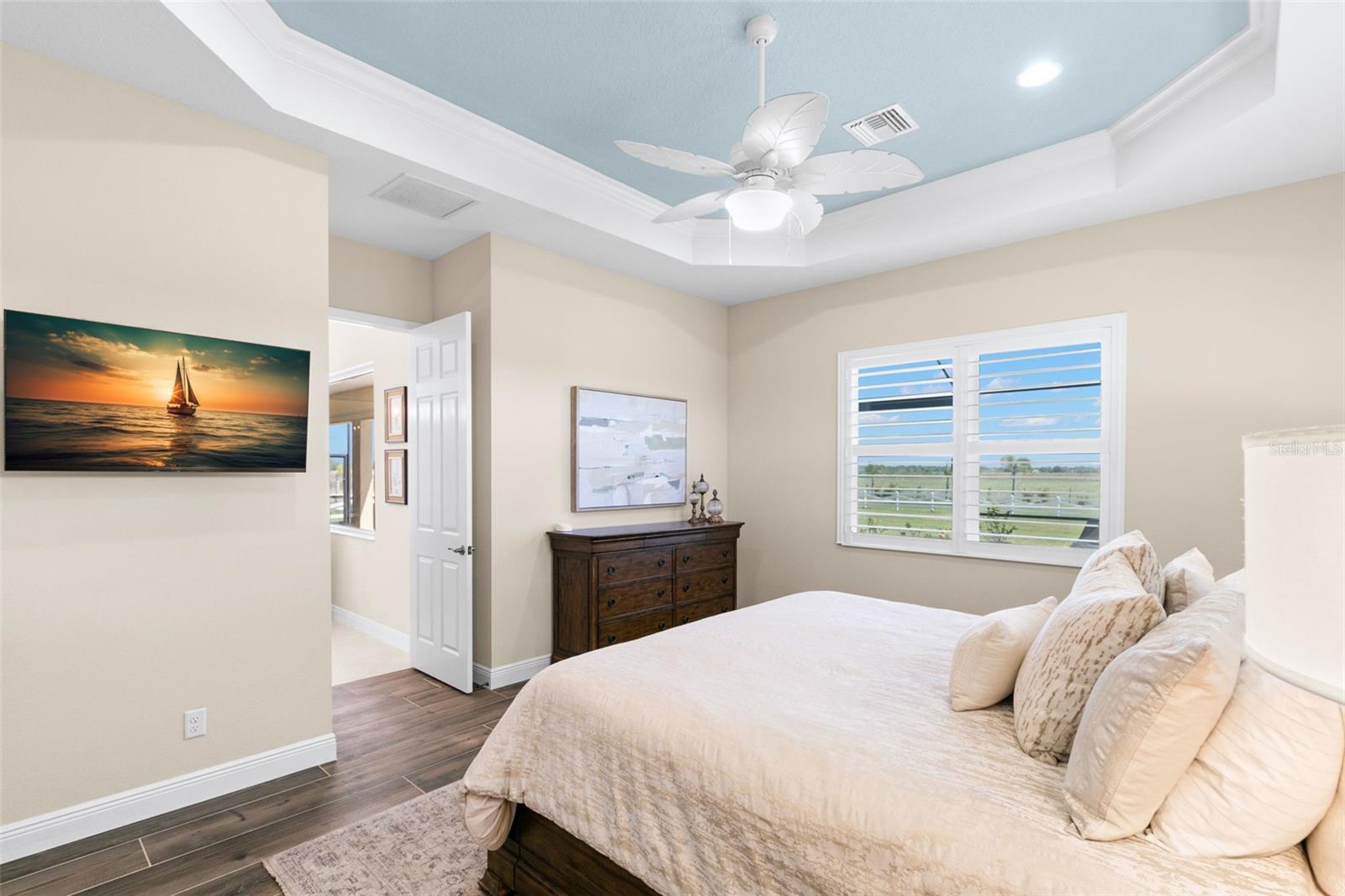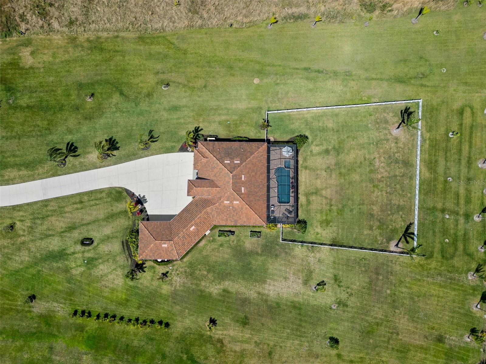 Set on an impressive 3.5-acre estate, this stunning home is the custom Caicos model nestled within the picturesque Hampton Lakes of Sarasota. As you step through the double glass doors, you’ll be greeted by a spacious open floor plan that includes a formal dining area and a versatile den. The den, adorned with double doors, a built-in Murphy bed, and sleek tile flooring, stands out as a unique and practical feature. The gourmet chef's kitchen is a dream come true, showcasing 42-inch wooden cabinets, a built-in wall oven, an induction cooktop, a stainless steel range hood, quartz countertops, a corner walk-in pantry, and a central island with bar-top seating. A cozy breakfast nook complements this culinary haven. The expansive great room offers a warm and inviting space perfect for hosting family and friends. Elegant details such as tray ceilings, plantation shutters, and crown molding elevate the home’s aesthetic charm. The property features two well-appointed bedroom suites, each with a private bath for added convenience. The oversized primary suite is a luxurious retreat, complete with walk-in closets and a spa-inspired master bathroom featuring double vanities and a generously sized walk-in shower. Step outside to the sprawling lanai, where you'll find a heated saltwater pool, a fire pit, and a state-of-the-art outdoor kitchen equipped with stone countertops, a refrigerator, a double burner, and a space for a large TV. Panoramic screens provide unobstructed views, creating a serene and tranquil outdoor oasis. Additional highlights of this remarkable property include an extended laundry room, an oversized four-car garage with air conditioning, a whole-house portable generator, outdoor lighting, and a buried 1,000-gallon propane tank. Conveniently located just 10 minutes from I-75, this exquisite residence combines the peace of open spaces with easy access to nearby shopping and dining, offering a lifestyle of unmatched comfort and elegance. Be sure to check out the Mattersport 3D tour.