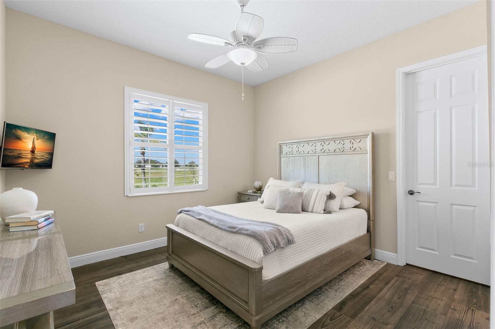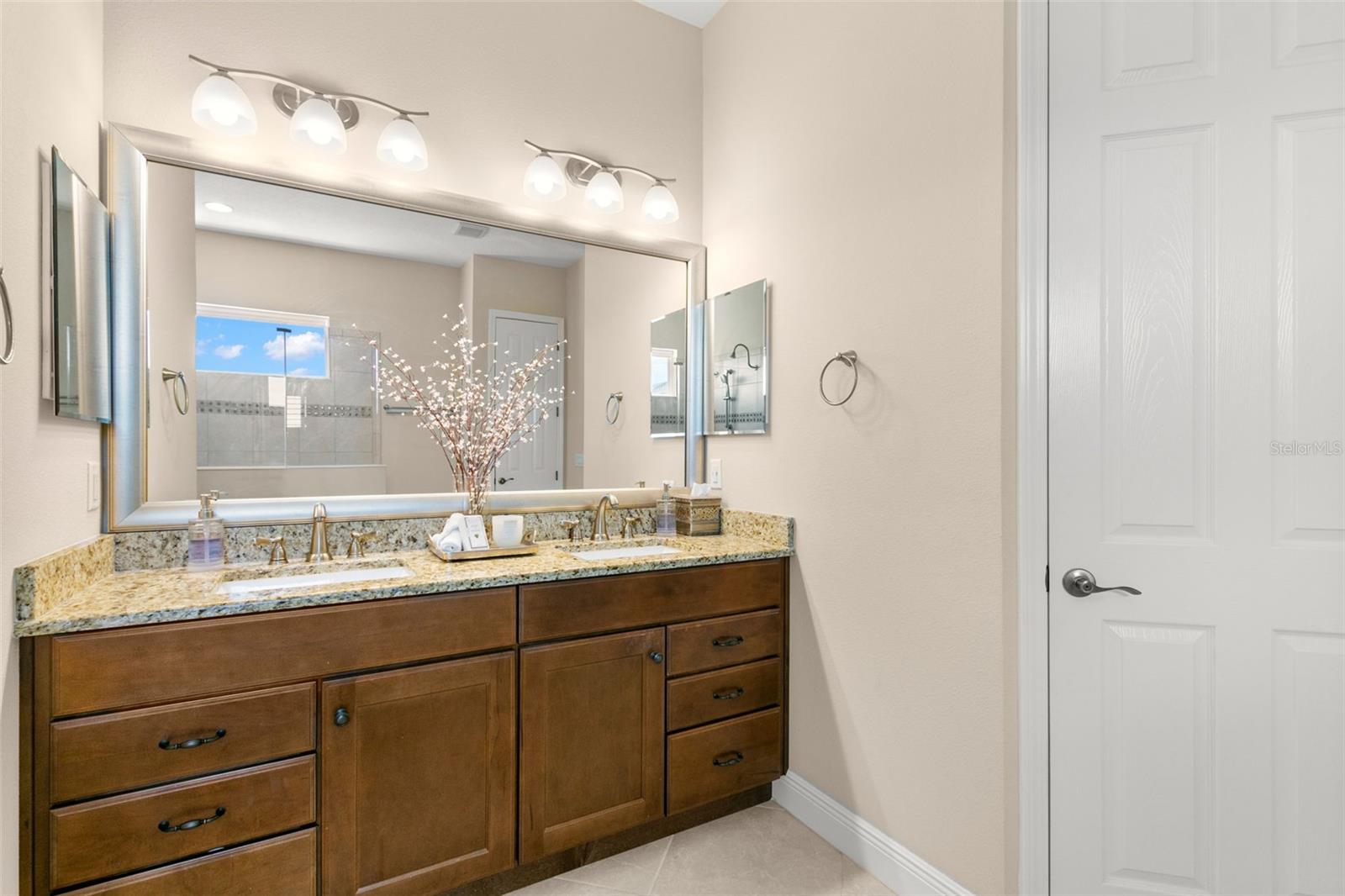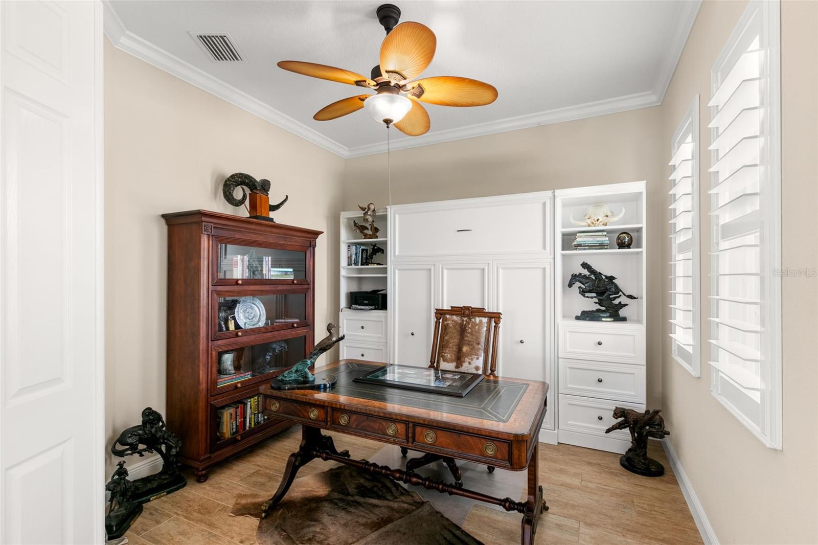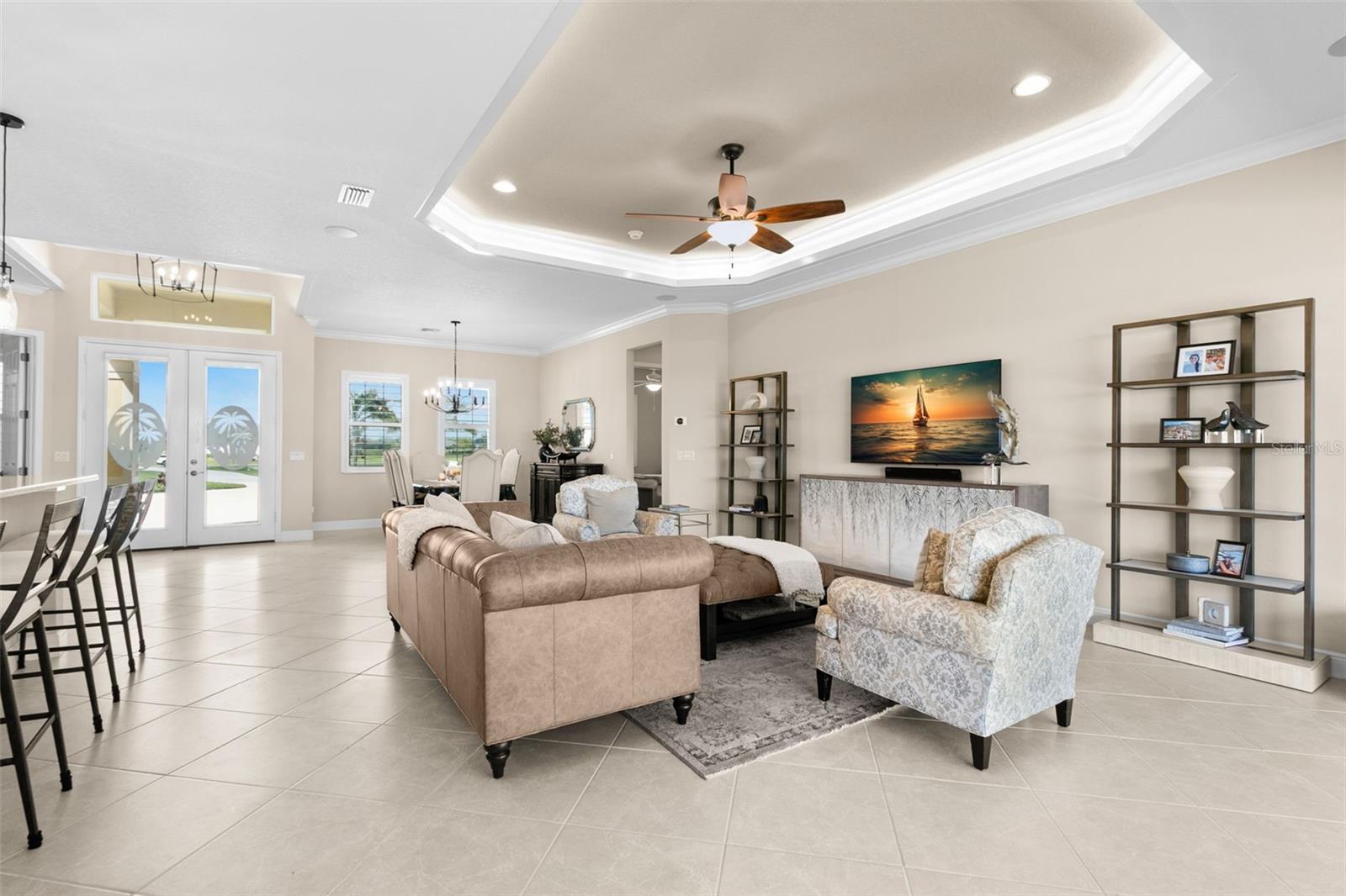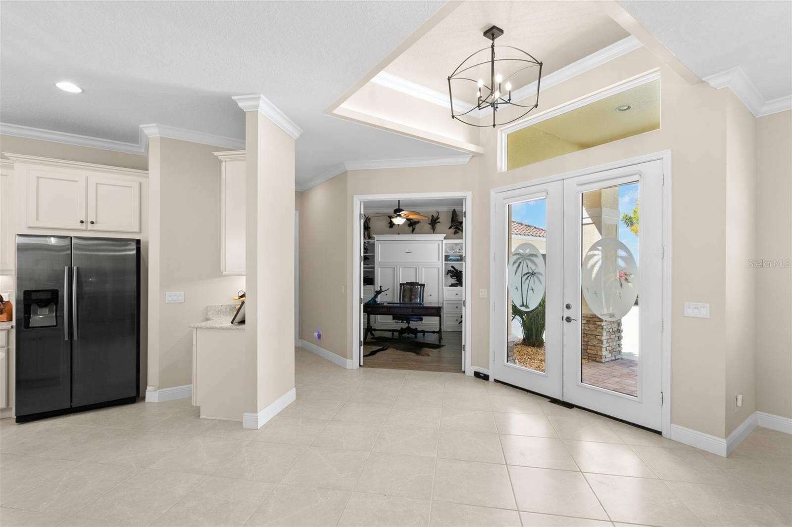 Set on an impressive 3.5-acre estate, this stunning home is the custom Caicos model nestled within the picturesque Hampton Lakes of Sarasota. As you step through the double glass doors, you’ll be greeted by a spacious open floor plan that includes a formal dining area and a versatile den. The den, adorned with double doors, a built-in Murphy bed, and sleek tile flooring, stands out as a unique and practical feature. The gourmet chef's kitchen is a dream come true, showcasing 42-inch wooden cabinets, a built-in wall oven, an induction cooktop, a stainless steel range hood, quartz countertops, a corner walk-in pantry, and a central island with bar-top seating. A cozy breakfast nook complements this culinary haven. The expansive great room offers a warm and inviting space perfect for hosting family and friends. Elegant details such as tray ceilings, plantation shutters, and crown molding elevate the home’s aesthetic charm. The property features two well-appointed bedroom suites, each with a private bath for added convenience. The oversized primary suite is a luxurious retreat, complete with walk-in closets and a spa-inspired master bathroom featuring double vanities and a generously sized walk-in shower. Step outside to the sprawling lanai, where you'll find a heated saltwater pool, a fire pit, and a state-of-the-art outdoor kitchen equipped with stone countertops, a refrigerator, a double burner, and a space for a large TV. Panoramic screens provide unobstructed views, creating a serene and tranquil outdoor oasis. Additional highlights of this remarkable property include an extended laundry room, an oversized four-car garage with air conditioning, a whole-house portable generator, outdoor lighting, and a buried 1,000-gallon propane tank. Conveniently located just 10 minutes from I-75, this exquisite residence combines the peace of open spaces with easy access to nearby shopping and dining, offering a lifestyle of unmatched comfort and elegance. Be sure to check out the Mattersport 3D tour.