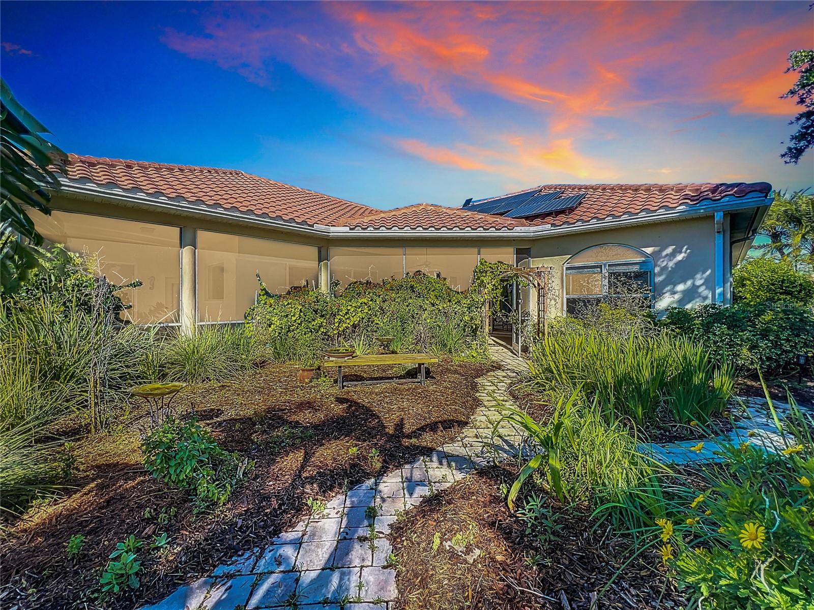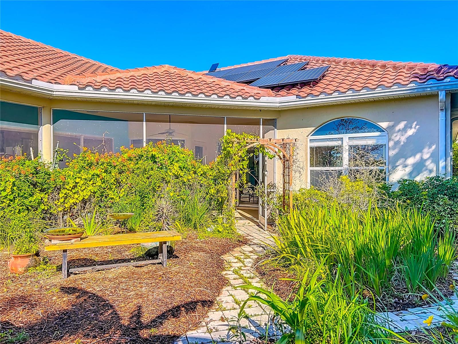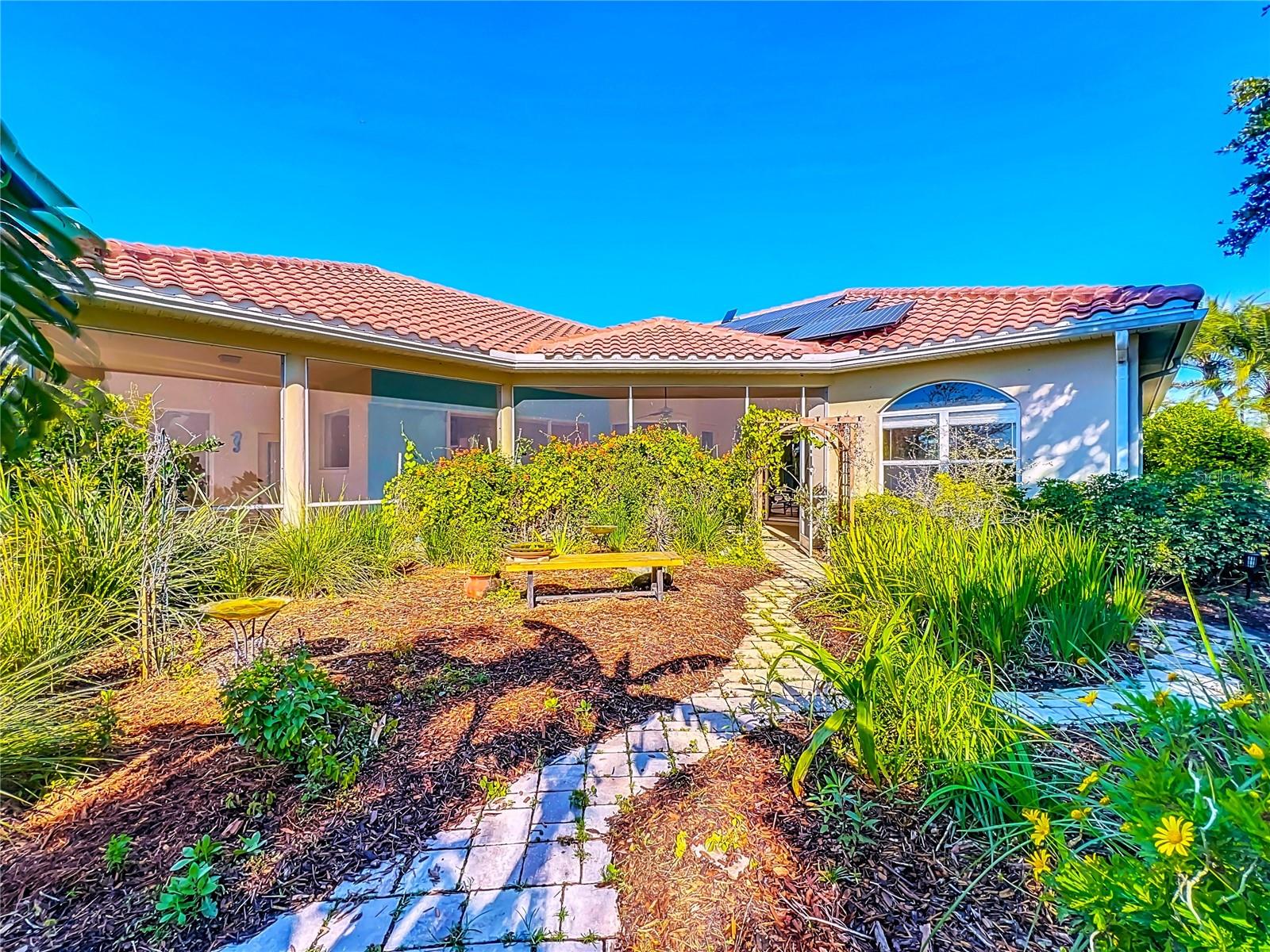 PRICE REDUCTION! LOW $500 YEARLY ELECTRIC BILL w SOLAR. Private Paradise in Heritage Oaks – Sustainable Living Meets Elegant Comfort. This spacious 4-bedroom, 3-bath home is a private paradise nestled in the heart of Heritage Oaks Golf & Country Club. With 30 FULLY PAID OFF SOLAR PANELS (2022) valued at $40,000, your ANNUAL electric bill in hot, humid Florida is UNDER $500. While a few minor updates remain, the home boasts some of the best structural integrity in the community. Recent upgrades include a BRAND NEW ROOF (2025), NEW WATER HEATER with a recirculating system (2025), NEWER High Efficiency A/C & HEAT (2023), a whole-home multi-stage WATER FILTRATION & PURIFICATION SYSTEM (2023), and a solar roof vent fan with reverse osmosis at the kitchen sink. The organically landscaped yard is filled with meticulously selected plants and fruit-bearing trees, attracting Monarchs, Swallowtails, Zebras, and other butterflies—making your garden a peaceful natural retreat. Inside, the double split floor plan is designed for privacy. The spacious Primary Suite opens to a covered lanai and includes a walk-in closet with California-style organizers. The primary bath features a soaking tub with heat lamp, separate tropical rain shower, and private water closet. Formal living and dining rooms offer space for entertaining, while the kitchen with wood cabinets and breakfast bar opens into an oversized family room with triple pocket sliders. A cozy breakfast nook with an aquarium glass window overlooks the lush lanai, perfect for enjoying your morning coffee. Heritage Oaks is a 24-hour guard-gated, resident-owned community where all homeowners are full members with access to an 18-hole golf course, 4 clay tennis courts, 5 heated pools, a fully equipped fitness center with classes, and a newly renovated clubhouse with dining and social amenities. Located near Siesta Key Beach, downtown Sarasota, St. Armands Circle, and more, this home offers sustainable living and resort-style amenities all in one. Call today to experience the Heritage Oaks lifestyle!