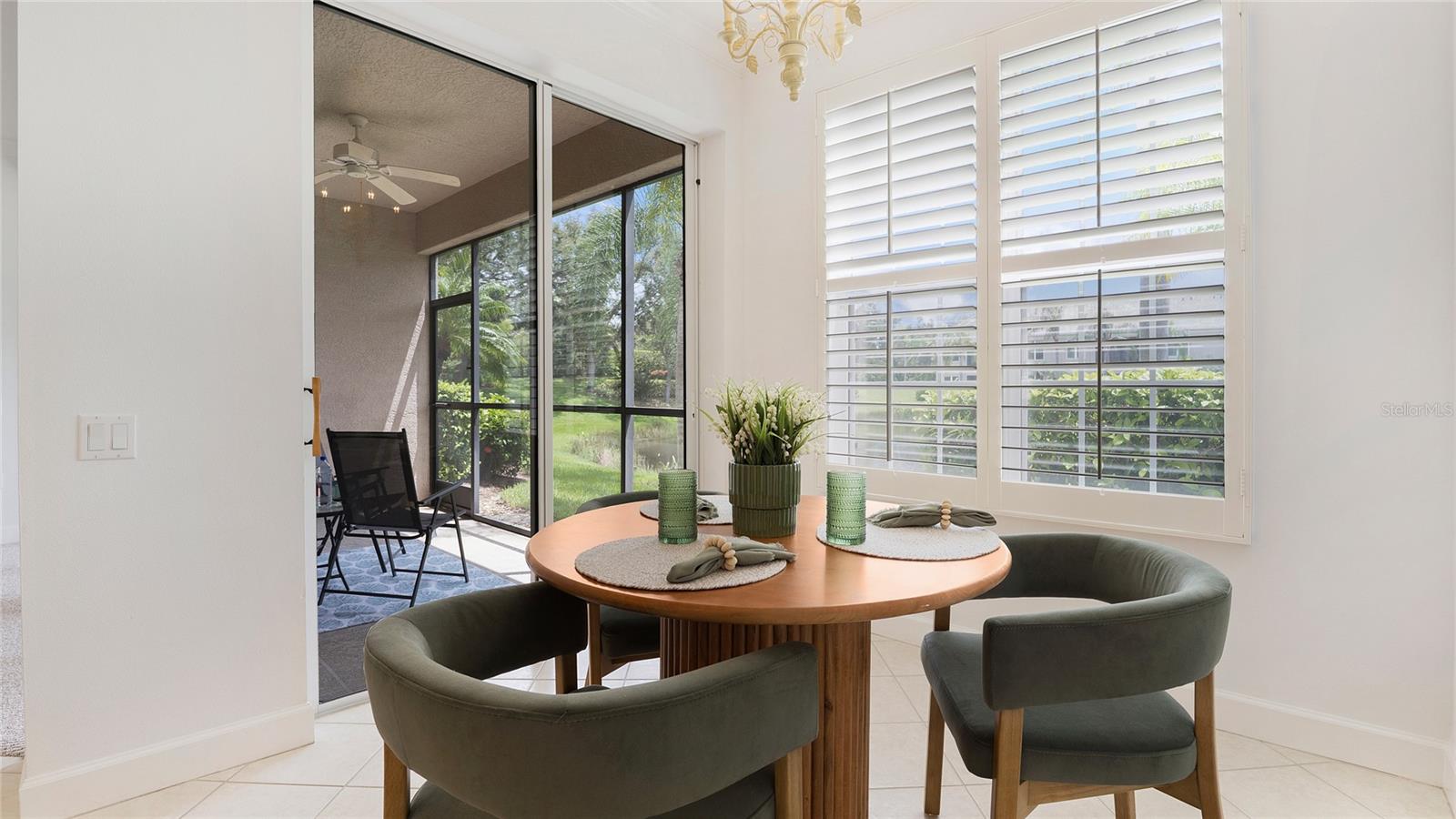 Welcome to Botanica at Palmer Ranch! Paradise awaits in this first-floor 2 bedroom + den (Formal Dining Room), 2 bath residence with attached 1-car garage, located in the secure gated community of Botanica in the heart of Palmer Ranch. Offering over 1,620 sq. ft. of living space, this home combines a spacious layout, serene lake and garden views, and a low-maintenance lifestyle — an exceptional value in one of Sarasota’s most desirable locations. Inside, you’ll find a light and neutral color palette, fresh interior paint, and newly carpeted bedrooms, making this home comfortable and move-in ready. The large eat-in kitchen features solid wood cabinetry, a pantry, and ample counter space, designed for everyday living and entertaining. The spacious primary suite overlooks the lake and includes plantation shutters, dual walk-in closets, and a well-appointed bath with double vanities, with a separate walk-in shower. A second bedroom, a dining room/optional den, a full guest bath, and an interior laundry room provide added flexibility. The attached one-car garage with private driveway offers convenience, and the roof was replaced in 2023, ensuring peace of mind. Step outside to your private screened lanai with tranquil pond and fountain views — the perfect spot for morning coffee or evening relaxation. Community Highlights: Gated boutique neighborhood with only 168 residences. Two resort-style heated pools, BBQ area, lush tropical landscaping, and sparkling lakes. Remodeled clubhouse with fitness center, catering room, and library. Maintenance-free living — exterior upkeep, roof, water, sewer, and cable TV included in fees. Prime Location: Situated in the heart of Palmer Ranch, just minutes from shopping, dining, Legacy Bike Trail, world-famous Siesta Key Beach, and top-rated medical facilities. This move-in ready home is a rare opportunity to enjoy the best of the Sarasota lifestyle. Schedule your private showing today! PROPERTY HAS BEEN STAGED WITH ACCESSORIES AND SOME FURNITURE