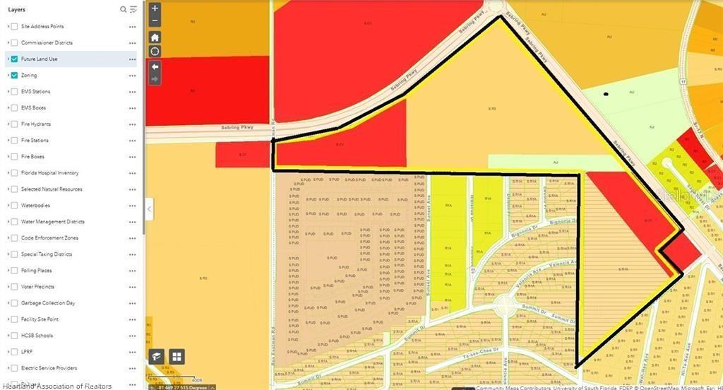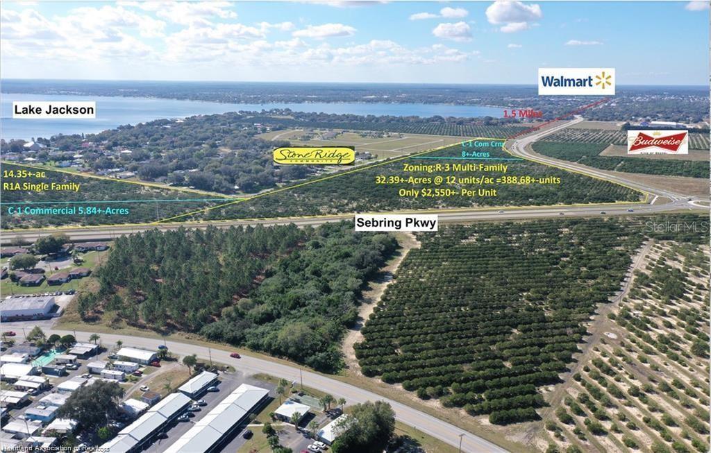 Under contract-accepting backup offers. 63+/- acre Premium R-3 Multi-Family Site Accented Nicely with C-1 Corner/Prime Parkway Frontage not to mention a smaller R1A Single Family portion nestled a little closer to the beautiful Lake Jackson! All this coveted property is framed with 4,290+Feet on Sebrings Newest & busiest thorough fare only 1.5 miles from the Highest Traffic Count in Highlands County at Walmart US 27/Sebring Parkway Intersection. Easy to Develop as site is Annexed to the City of Sebring to receive Water & Sewer that runs along the Parkway. 14.35 acres R-1A (3.48 DU/AC), 13.84 Acres C-1, 32.39 Acres R-3 (12 DU/AC), and 3.47 Acres AU(not annexed). EXTREME PRIME EXPOSURE on SEBRING PARKWAY!!! Don't wait.., this parcel is “HOT” and sure to receive multiple offers like the last adjacent site we listed & sold within days on market!