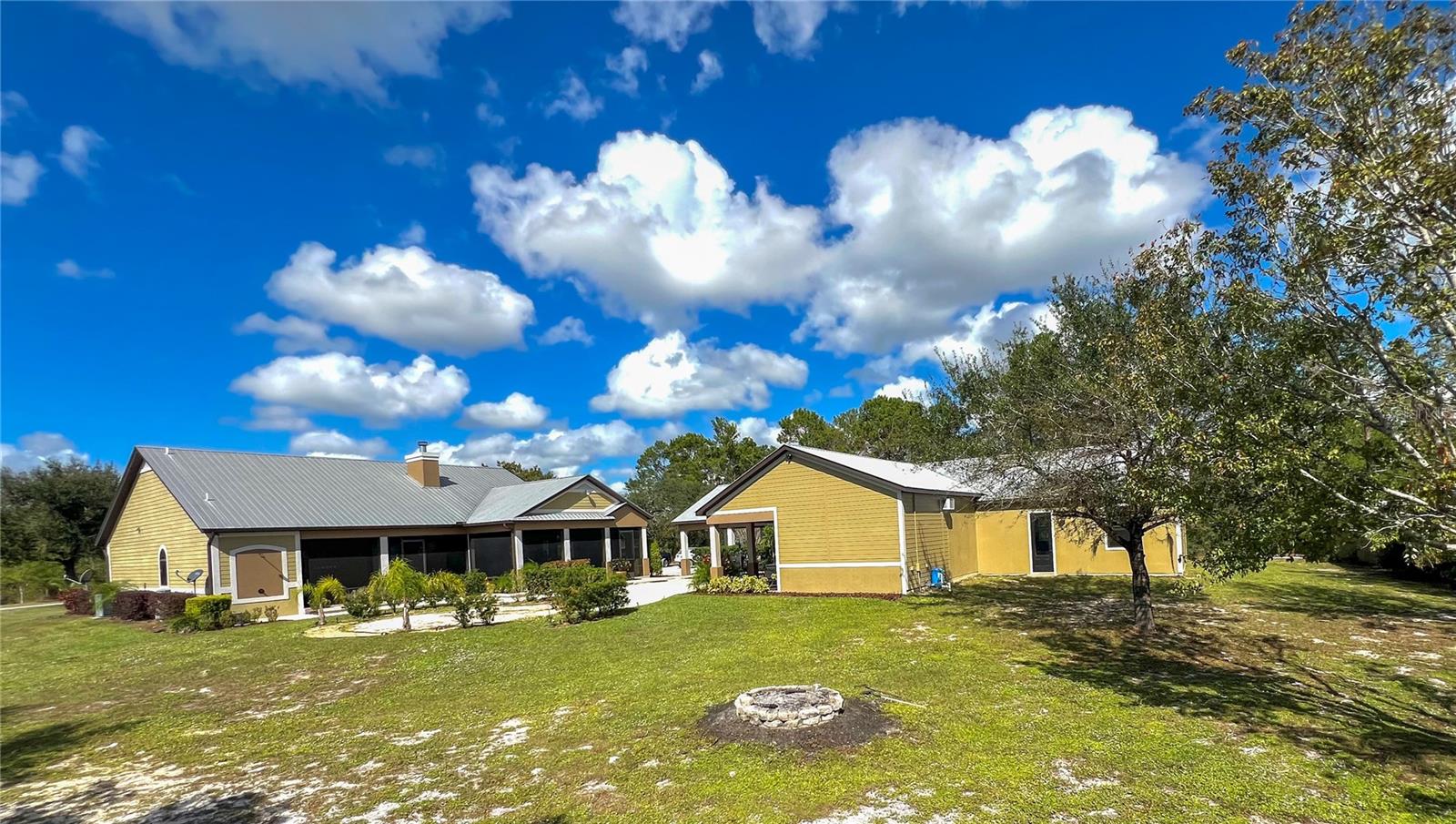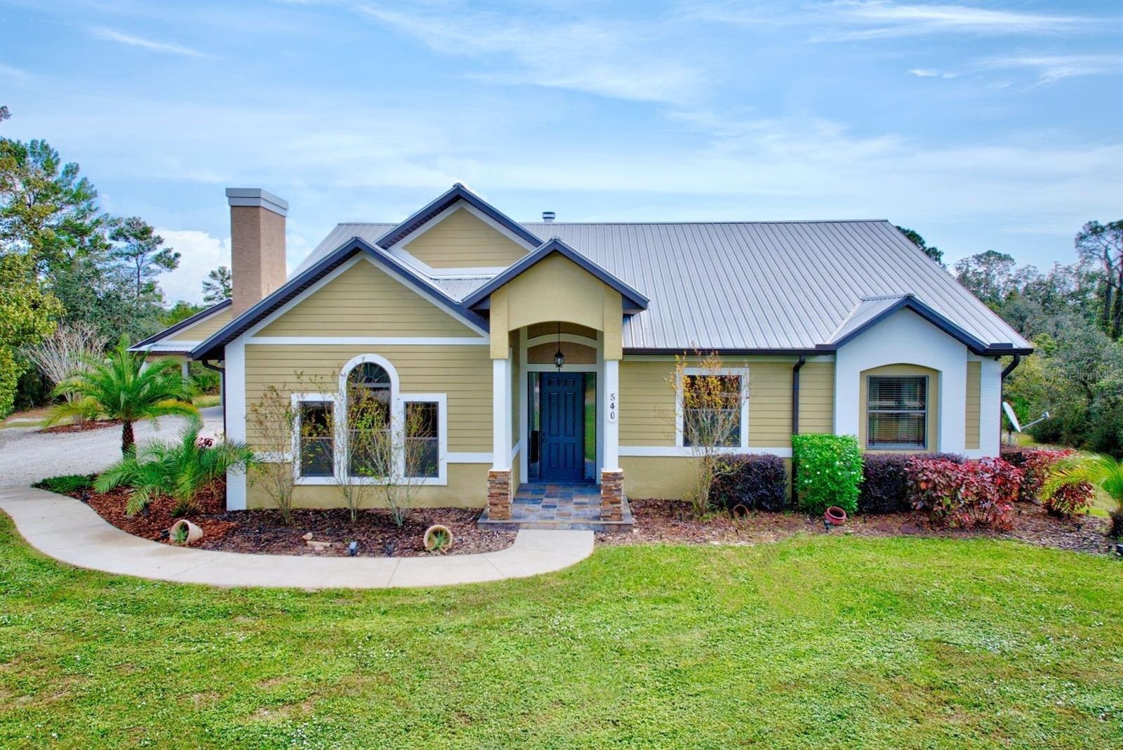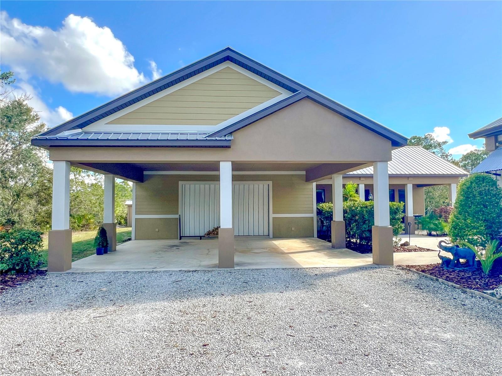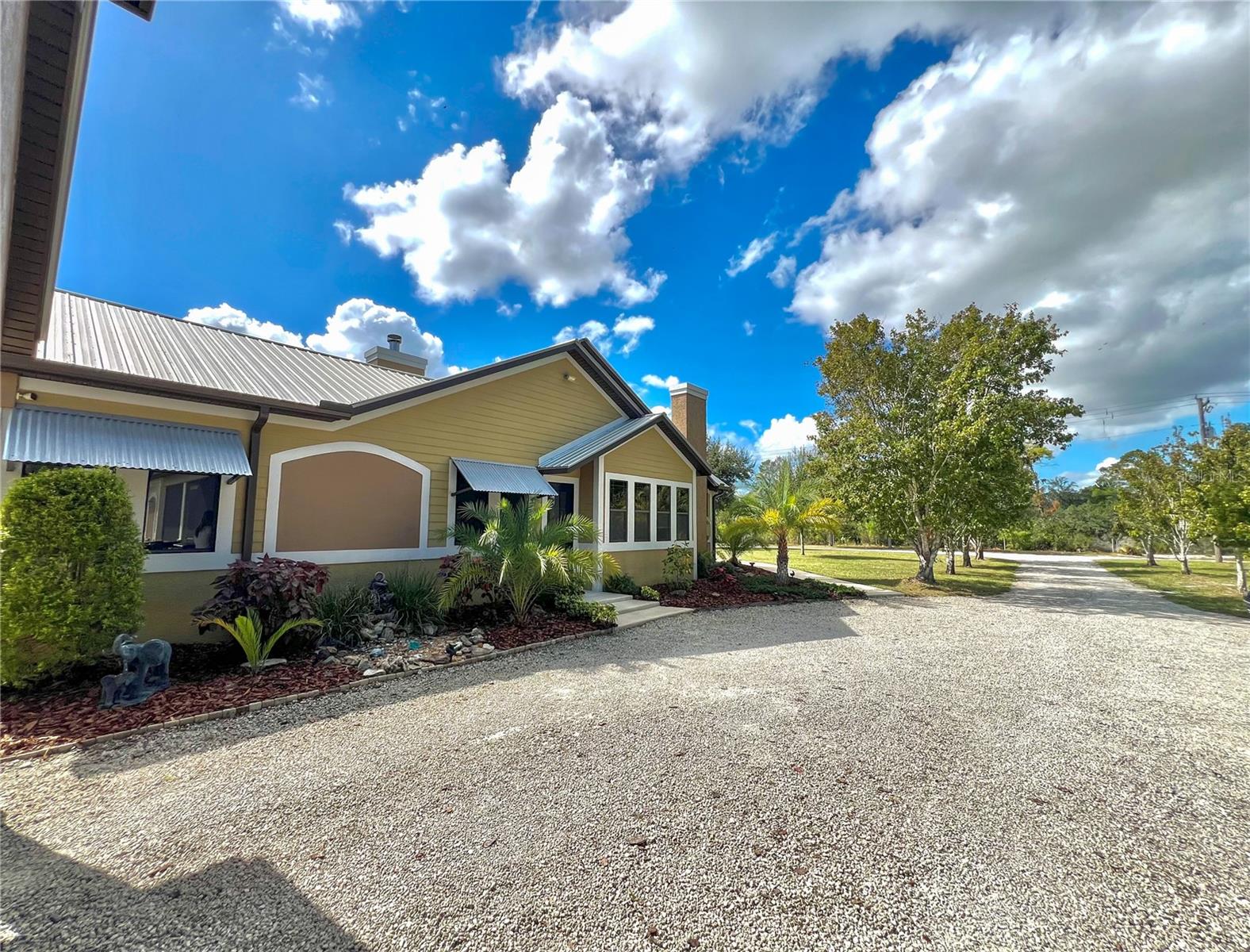 Private Oasis... Custom Home... Outdoor Living Space... Abundant Garage Space... this is an unique homestead that has so much to love! Tucked away in the native Florida scrubland, the property provides an escape to a peaceful and secluded environment. The options are endless with almost 6,000 total square footage in the home and detached building on almost an acre of land. The property has great curb appeal with mature landscaping and tasteful architecture using the combination of stucco, Hardie board, and stone. It has a metal roof on both buildings. One of the main focal points is the beautiful, screened-in back porch that features a large wood burning fireplace, an outdoor kitchen with a gas stove and a wet bar. The half bath with outside shower, tongue and groove wood ceiling, stoned fireplace and hearth, large bar area, multiple fans, televisions, and several sitting areas make this an enjoyable place to hang out and host company! The home has been built with some many thoughtful interior details such as custom window and door casings, 10 foot ceilings throughout the home with some vaulted areas featuring more tongue and groove wood, curved windows, and custom built cabinetry. The master suite is a dream!! All the doors in the master are double doors including the glass doors that lead to the back porch. The master bathroom has a soaking tub, a double vanity with a tower, water closet, and walk-in closets. One of the best perks is the beautiful walk-in shower with double shower heads. The living room has an attactive focal fireplace wall with detailed wood work. It has a guest bedroom and an additional room that can be used as a den, office, or extra bedroom. The kitchen has custom built cabinets, a gas stove, wall mounted convection oven, microwave and warming drawer, and custom countertops. The dining room is surrounded with windows for great natural lighting. PLUS... there is a large detached building in the back with endless options. There is a finished, air conditioned bonus room that could be used many different ways such as a bedroom/living room, a game room, an office, or art studio! This bonus room has a large porch overlooking the yard and includes a splash pad. There is a 2 car carport that leads into a very large garage space with an additional storage room in the back. It could be a wonderful setup for a wide range of hobbies! The options are so endless that you need to see it for yourself! It was built as a forever home, so no details were overlooked. Come unwind, kick back, and enjoy your stay!!
