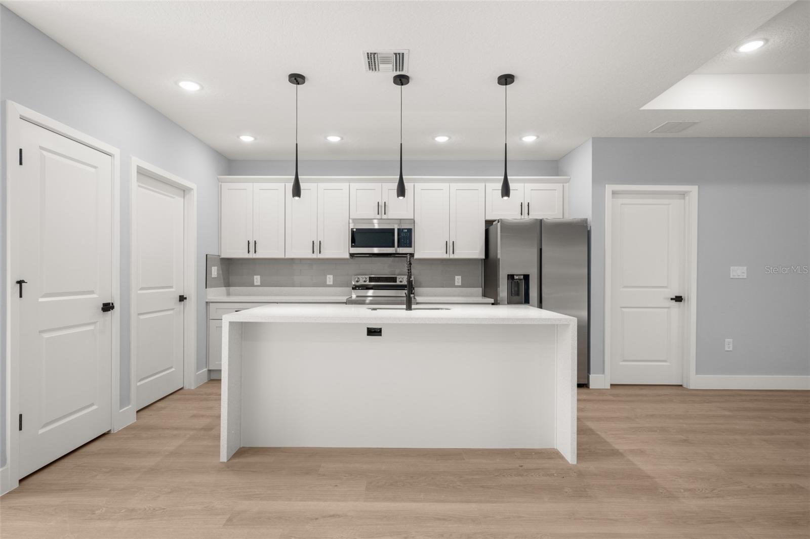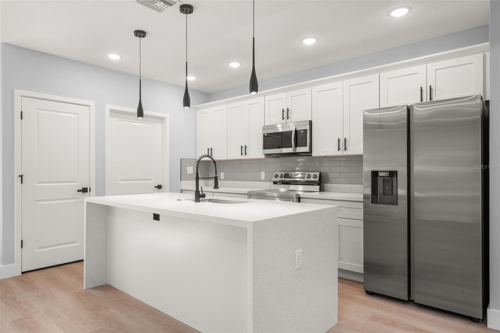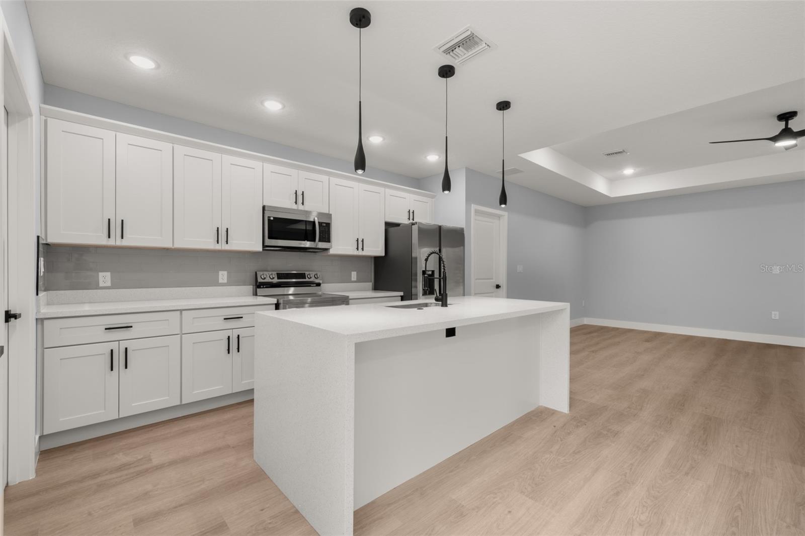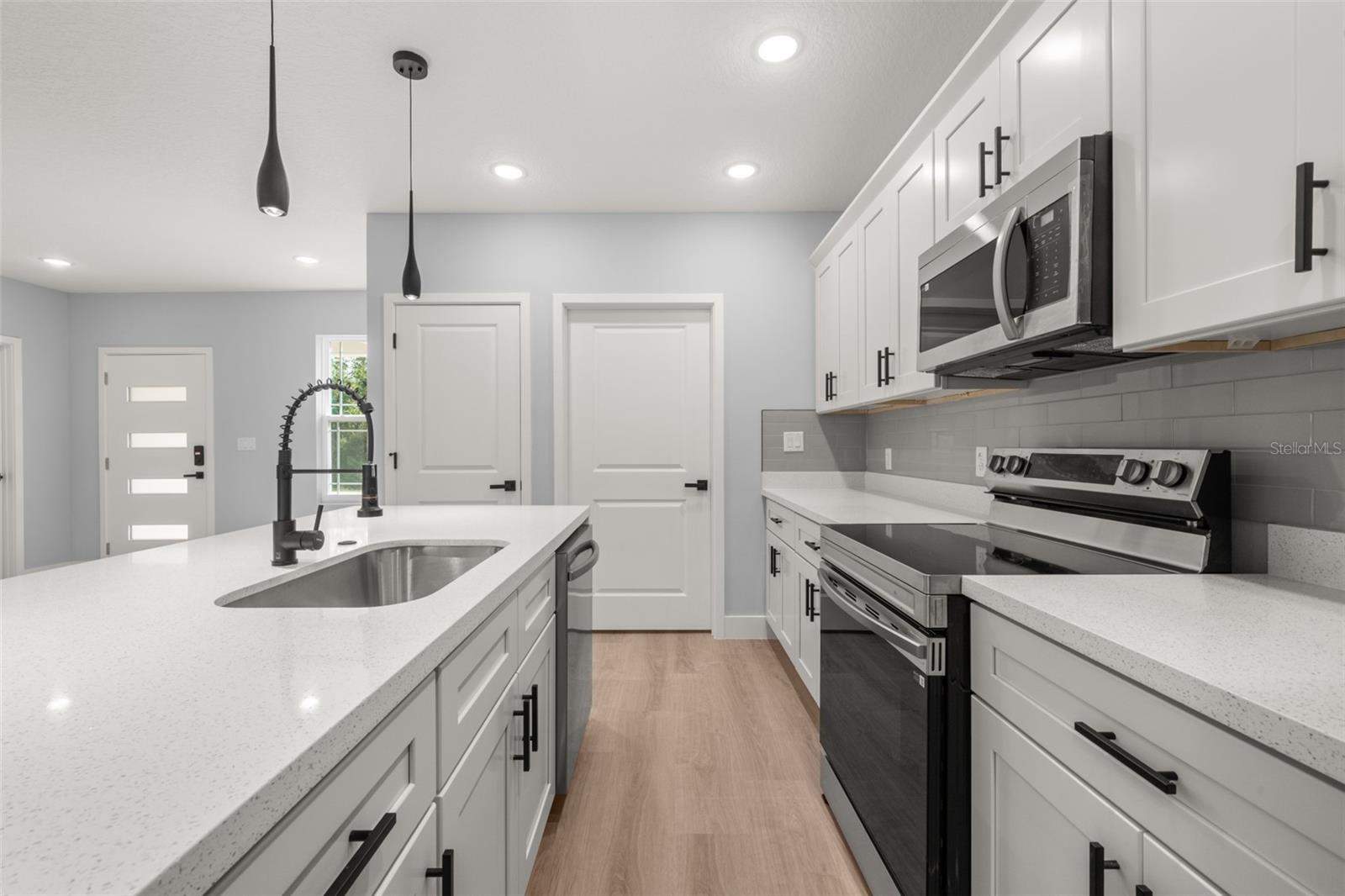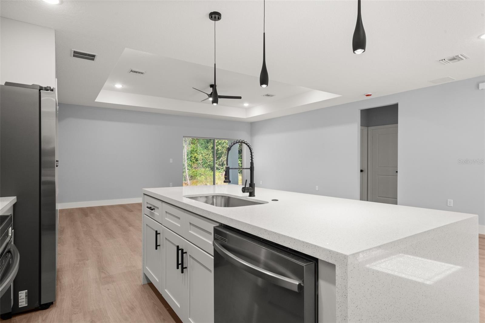 One or more photo(s) has been virtually staged. NEW home is move in ready! Located in beautiful Sun N Lake of Sebring. Home offers premier upgrades and quality build with 4 bedrooms and 2 bathrooms. Open floor plan with high ceilings, tray ceiling in Living room and luxury vinyl floors throughout. Kitchen features Quartz counters, full tile backsplash, island with waterfall counter and bar seating, stainless appliances and pantry. Fabulous primary suite with 2 walk in closets and a separate linen closet. Stunning enormous walk in tiled shower with 2 shower heads. Dual vanity with quartz counters along with upgraded lighting and fixtures. This split floor plan offers an additional 3 bedrooms and full bathroom on the other side of the home. Laundry room inside the home with large linen closet. Covered back patio, backyard is landscaped with irrigation. Property has private well and septic. Sun N Lake offers 36 holes of championship golf, pickleball/tennis, pool, park, dog park, miles of sidewalks and a wildlife preserve. Located close to medical facilities, shopping and restaurants
