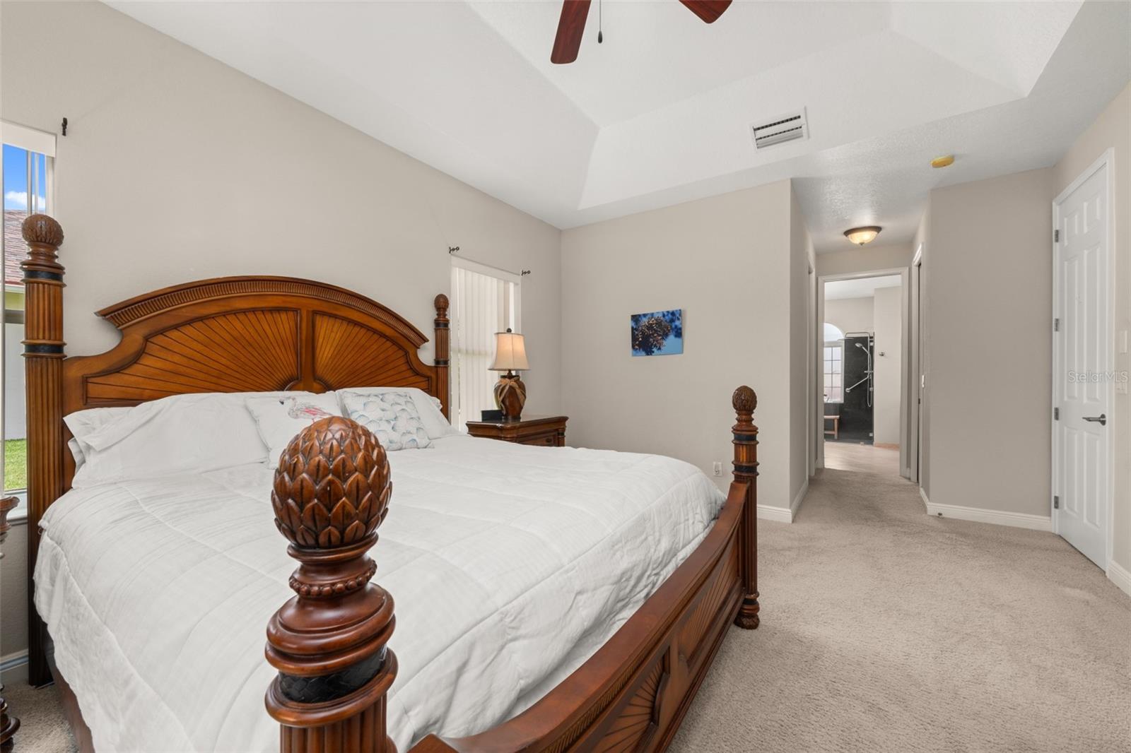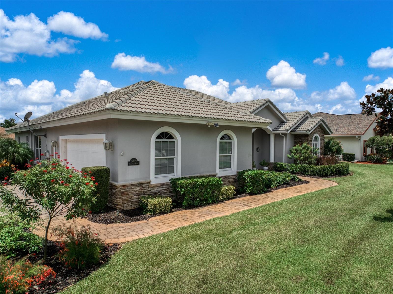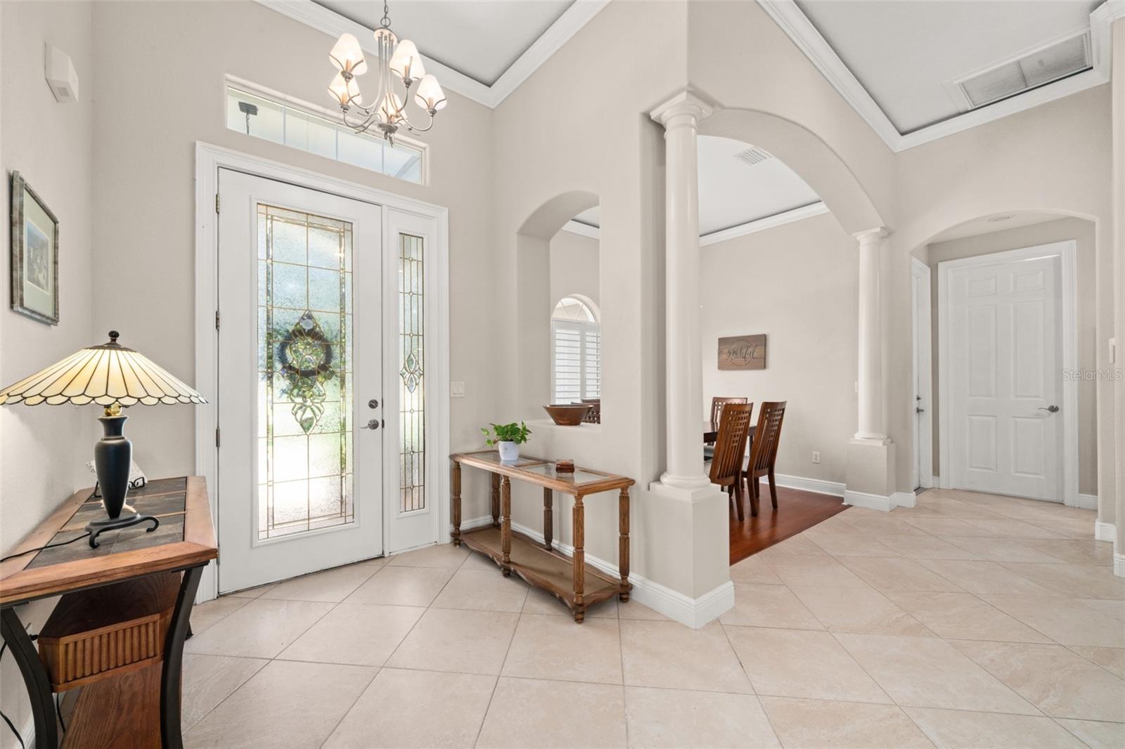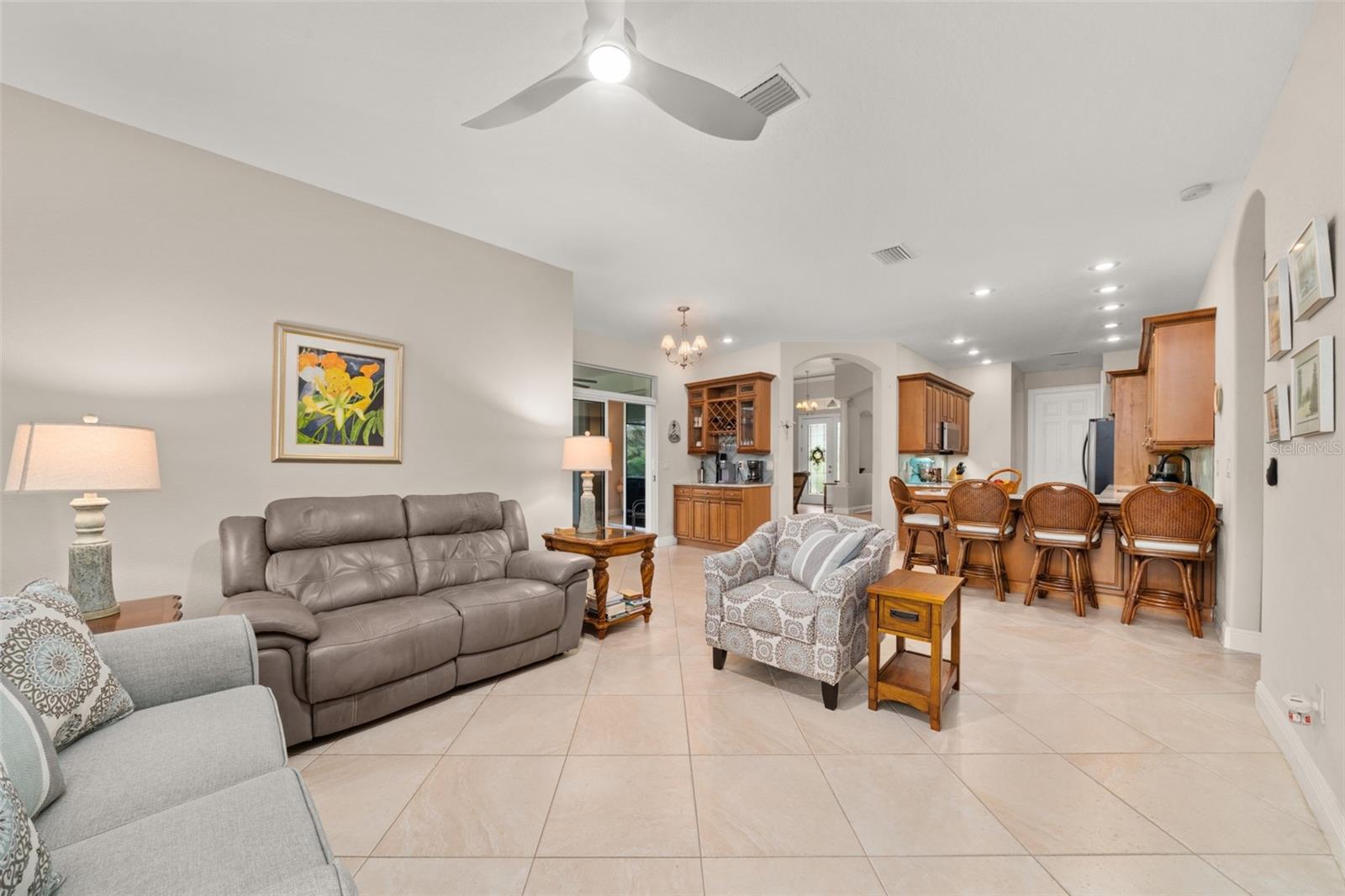 In the sought-after Magnolia Place community of Sun N’ Lakes, this home blends timeless style with everyday comfort— and it starts from the top with a 2023 concrete barrel tile roof, a major upgrade built for beauty and durability. Inside, the open split-bedroom floor plan is filled with light and features 12-foot vaulted ceilings, 8-foot doors, and a host of custom details—tray ceilings, angled ceramic tile floors, crown molding with accent lighting, 5-inch baseboards, rounded corners, and upgraded remote-control ceiling fans. The kitchen offers solid wood cabinets, granite counters, under-cabinet lighting, recessed lights, and stainless-steel appliances less than four years old. A built-in dry bar in the dining area serves as a coffee nook or cocktail station. The primary suite is a peaceful retreat with two walk-in closets and a spa-inspired bath boasting dual sinks, a walk-in shower, private water closet, and linen closet. Two guest bedrooms, including one with a built-in desk, share a full bath with a glass-enclosed tub/shower combo. Step outside through hurricane-rated sliding doors to a screened porch with paver flooring—perfect for enjoying Florida’s year-round weather. The property runs on city water and sewer, features well irrigation, and has a professionally maintained lawn with regular fertilization and pest control. Living here means access to a community pool, clubhouse with restaurant, two premier golf courses (Deer Run & Turtle Run), plus on-site police and fire services. All of this just minutes from Advent Hospital, shopping, dining, and more.