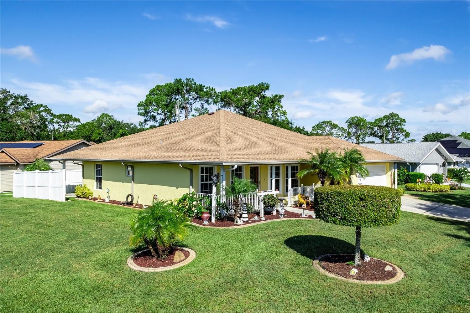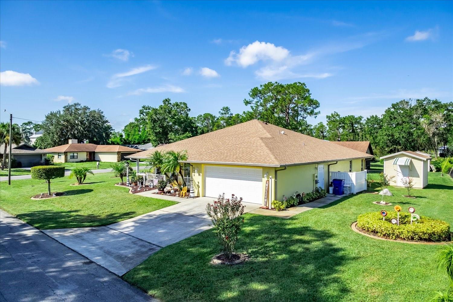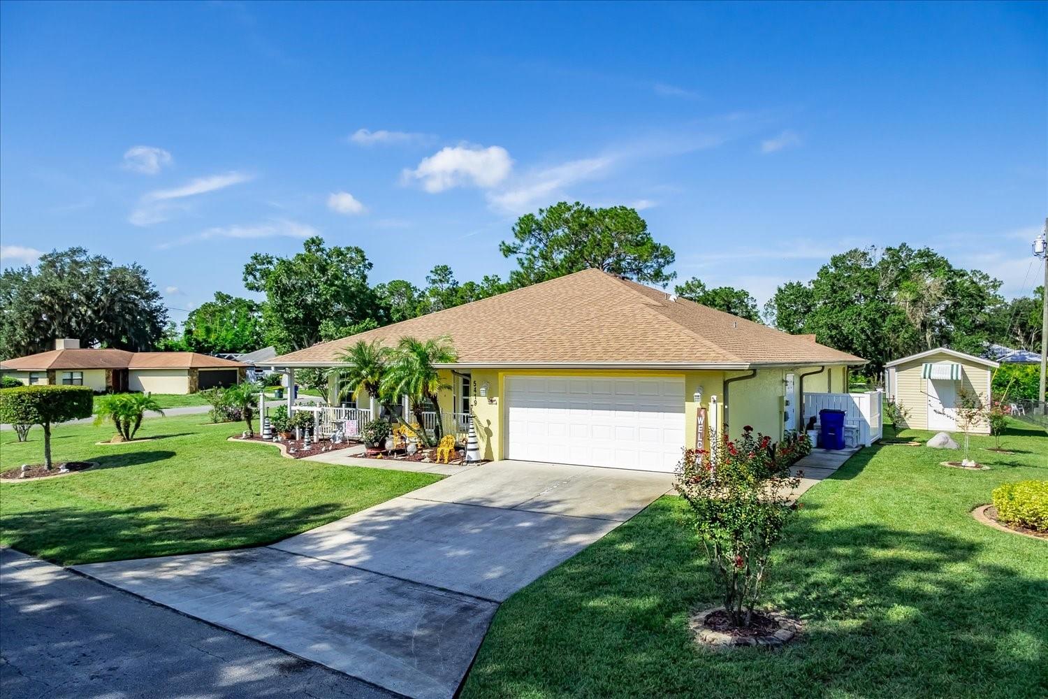 Step into the charm of this classic, storybook home, where comfort meets timeless style. With over 1,600 sq. ft. of living space, this 3-bedroom, 2-bath beauty welcomes you with warm engineered hardwood floors, plush carpet in just two bedrooms, and a layout designed for easy, relaxed living. Imagine afternoons on the inviting front porch in this quiet neighborhood, just a few blocks from the serene waters of Lake Huckleberry. The kitchen is the true heart of the home, rich wood cabinets, quartz countertops, and beautiful wraparound counters create both function and style, while offering the perfect setting for gatherings and entertaining. Step out back to a paved and covered porch, ideal for morning coffee, while enjoying the peaceful privacy of a fully fenced backyard. The corner lot (.23 acres) also offers a charming shed and plenty of green space. Lovingly maintained and brimming with a cozy, cottage-like feel, yet still within city limits, this home offers the perfect balance of tranquility and convenience. This isn't just a house, it's a place where life feels just right.