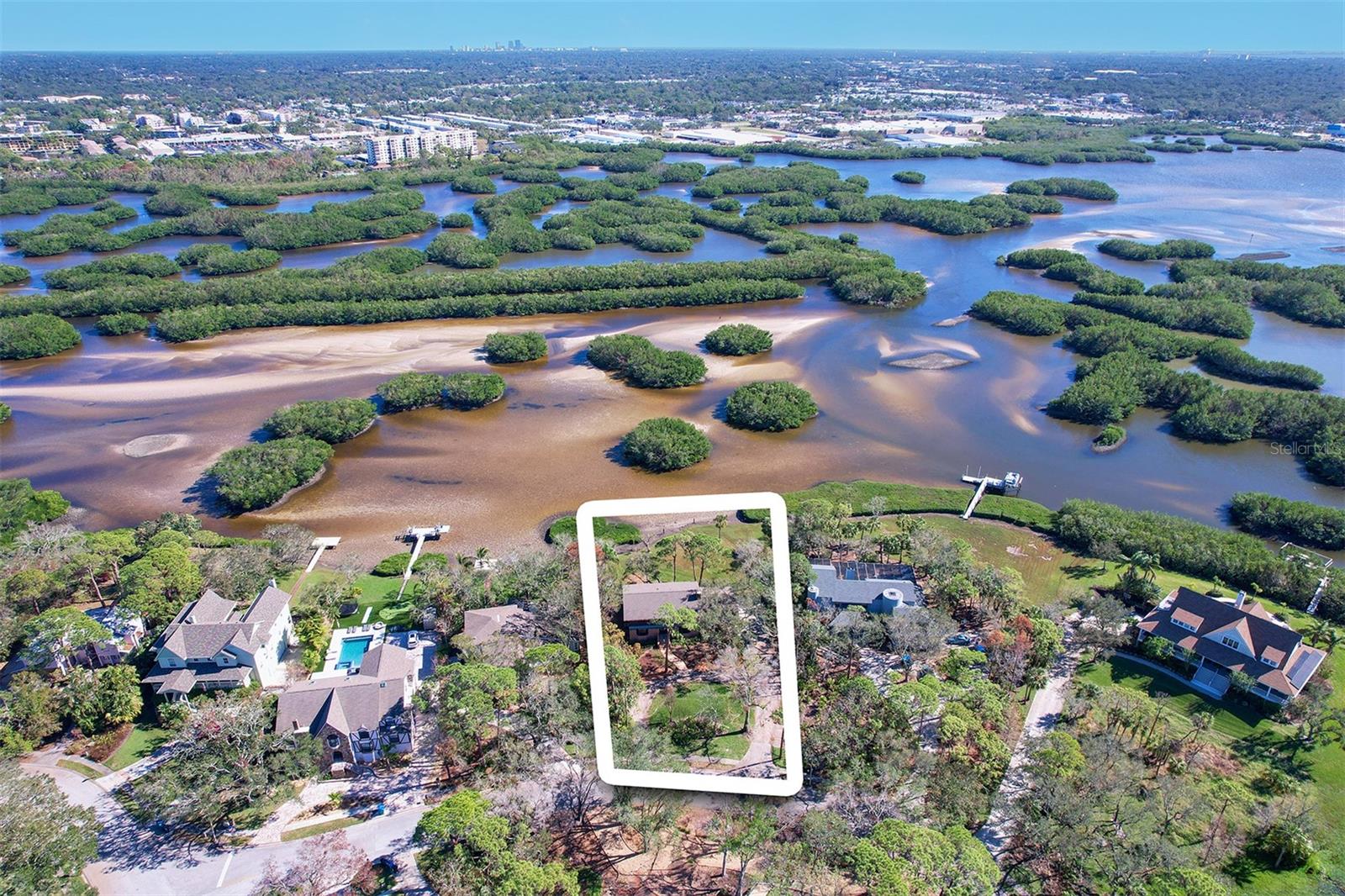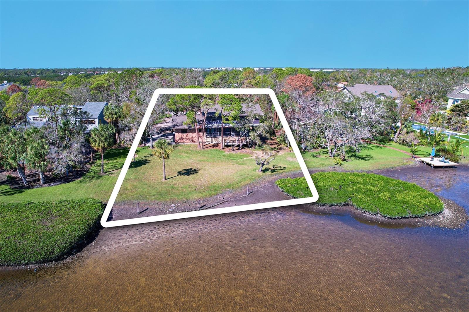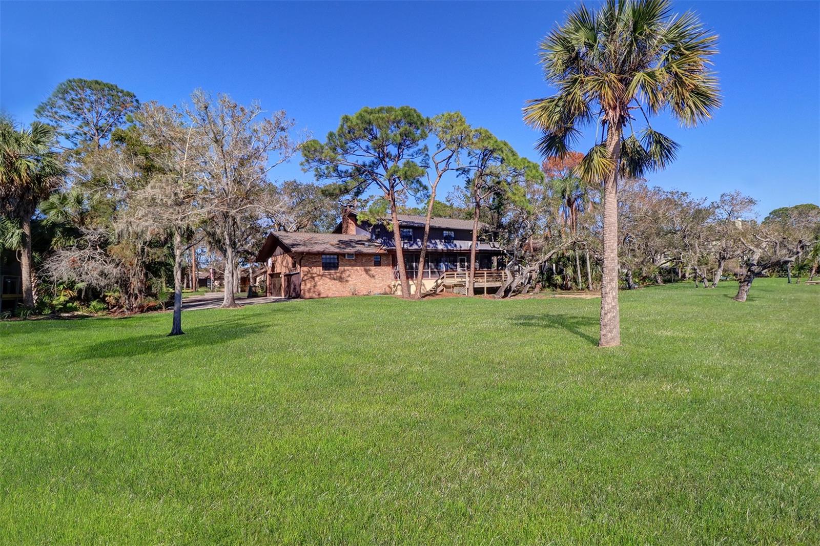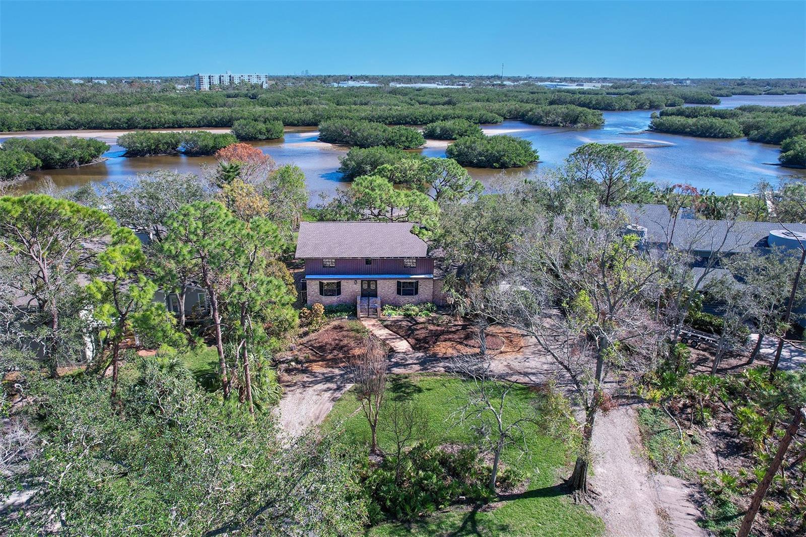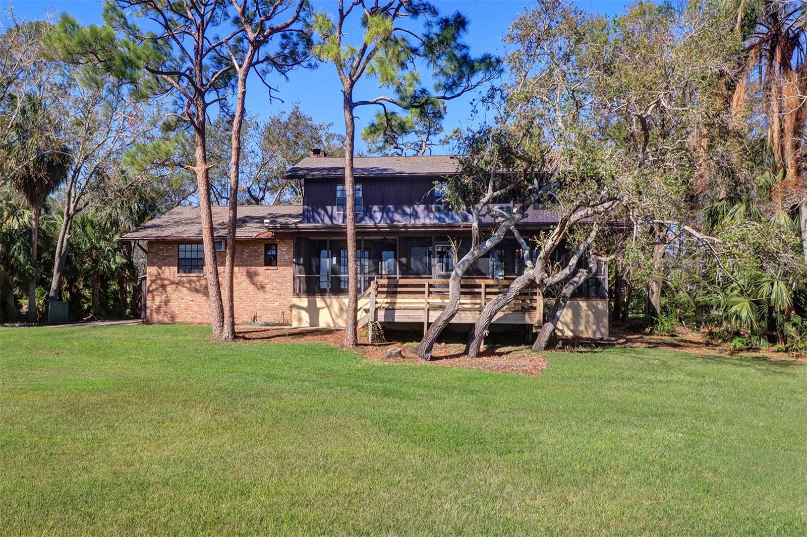 Build your dream home or renovate the existing home on this serene waterfront property offering over three-quarters of an acre on Cross and Long Bayou in the highly desired neighborhood of Seminole Lake Country Club Estates. This well-established, friendly and quiet golf course community is filled with beautiful and well-maintained homes and properties. This property is at the bottom tip of the peninsula and is one of the larger lots in the community with dimensions of 270 feet deep and 150 linear feet on the water with breathtaking views! The existing home is an elevated two-story house with five bedrooms, three full baths, 3,100 heated square feet, two-car garage with a screened-in covered patio overlooking the sprawling backyard and Cross Bayou estuary. The Country Club offers special membership pricing to association residents to enjoy golf, tennis and pickleball, pool, workout facilities, clubhouse and more!