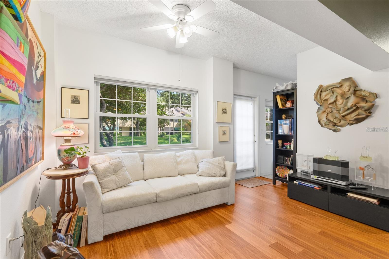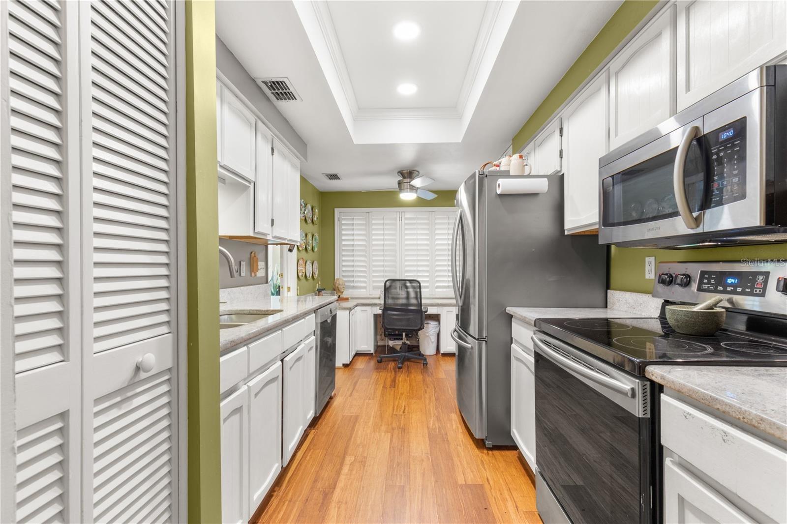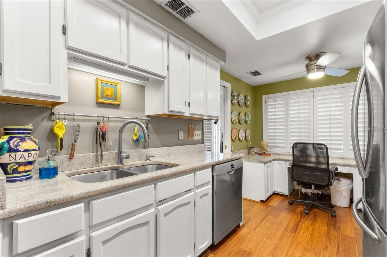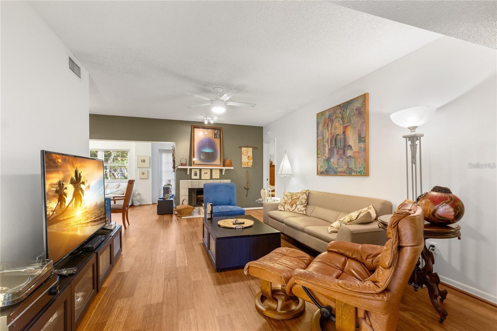 Enter into this move-in-ready, ground-floor gem nestled in the heart of the pet friendly, 42 unit, all-ages Bardmoor golf community. The location is incredibly conveinent, with shopping, restaurants and services only half a mile away. This home boasts generously sized bedrooms, including a primary suite with an ensuite bathroom dual closets and a full guest bath with dual sinks, ensuring comfort and privacy for all. Imagine cozy evenings by the stunning wood-burning fireplace in the spacious living room, perfect for creating lasting memories. The kitchen is a chef's delight, featuring stainless steel appliances (new in 2019) and elegant granite countertops. Plus, the built-in desk with a granite top offers a stylish and functional workspace with ample storage. The dining room has been thoughtfully extended by enclosing a former sunroom, providing an expansive area for entertaining or indulging in your favorite hobbies. Don't miss the extra closet behind the fireplace—ideal for additional storage! Enjoy the views of the well maintained green spaces with plantation blinds at the front and wood blinds at the back, complemented by all-bamboo floors throughout the main living spaces and bedrooms. Convenience is key with in-unit laundry and excellent views of the community green space. Just seconds away, you'll find a beautiful pool and hot tub, perfect for relaxation and recreation. The roof was replaced in 2020 (all assessments fully paid off), there's truly nothing left to do but move in and enjoy your new home!