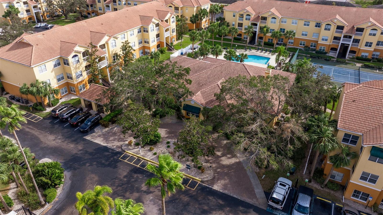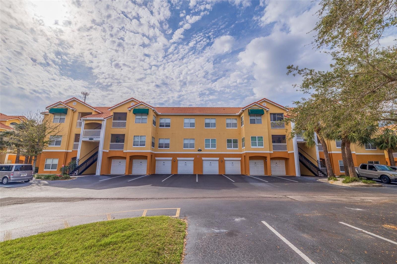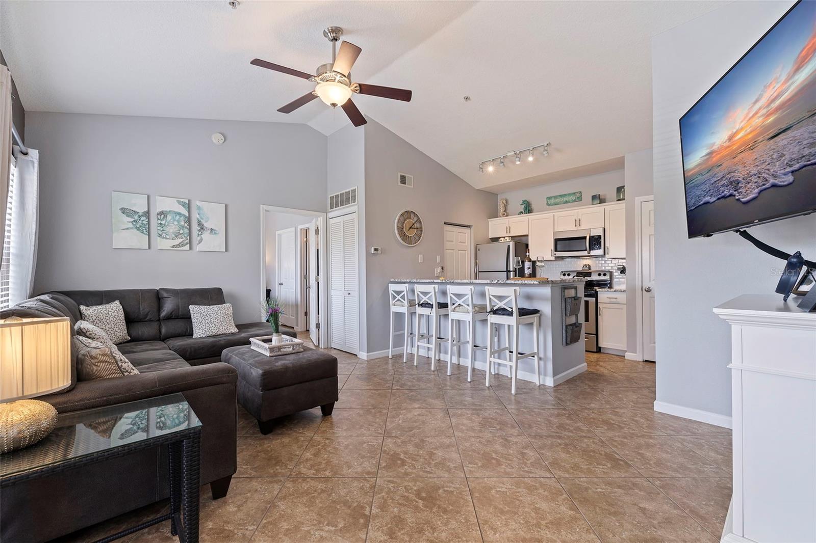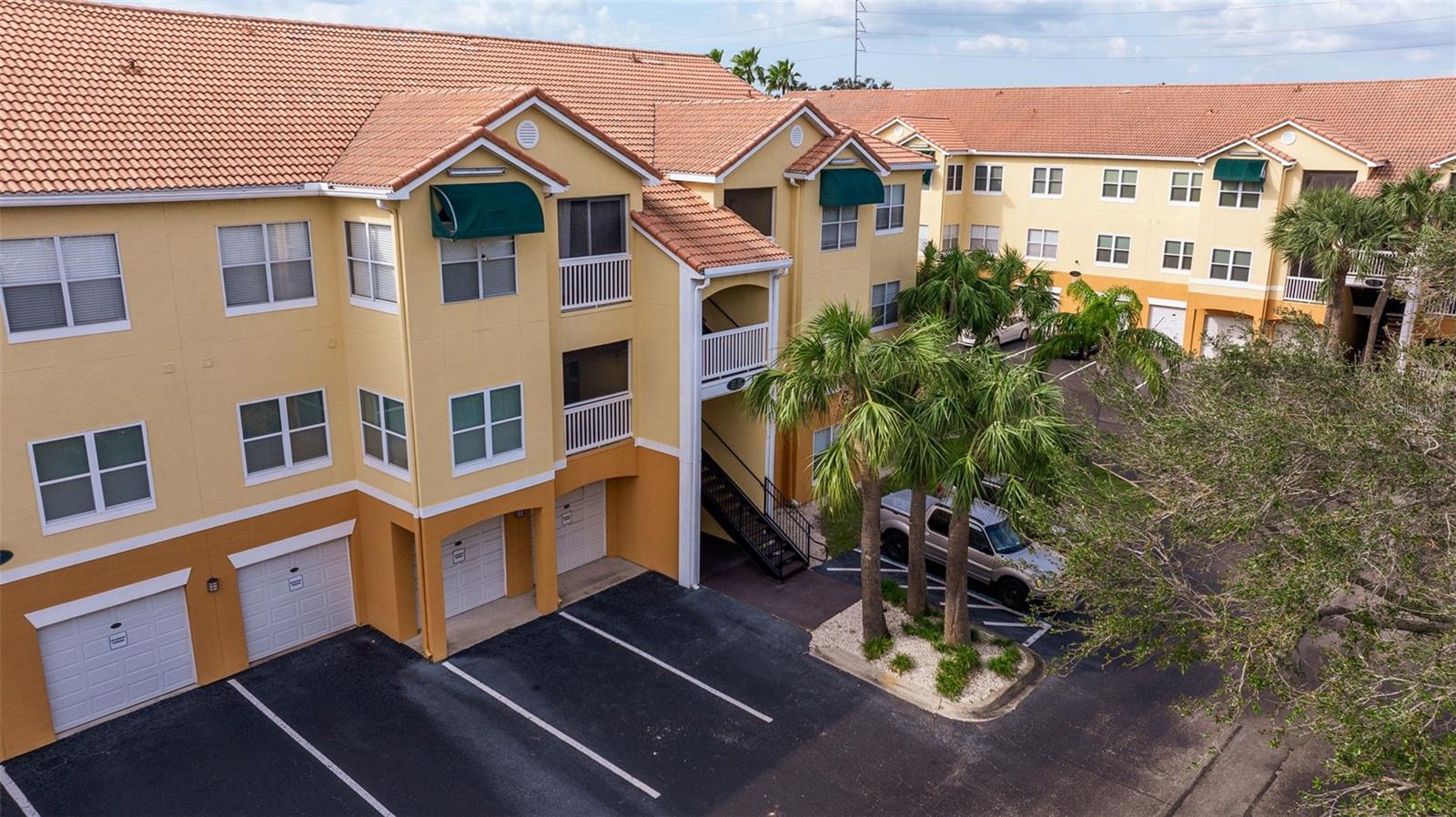 Largest sized unit located on a scenic and quiet top 3rd floor with beautiful and spacious cathedral ceilings. Gated community with cameras to provide extra security. Two external storage closets: Main closet, which comes with each condo is conveniently next to your unit for quick access items (tools, decorations, etc.). Extra closet #500 (purchased) is located on the first floor for your outdoor items (bikes, golf clubs, pool rafts, beach chairs, etc.) and only costs and extra $40/year which includes electric. Lanai (patio) includes glass sliders for fresh air and Florida sunshine. Extras included in unit are: Furniture and TVs (5), Home warranty for peace of mind (covers HVAC, appliances, plumbing, electric, etc. - see home warranty for details). LOW HOA at $535/month which includes: Management company with on-site manager and maintenance for your daily needs, high speed internet, 3 cable boxes, heated pool, indoor gym, pickleball/tennis court, shuffle board, exterior maintenance, EV charging stations, discounted guest rental unit for extra guests. Stress Free living where you are only responsible for maintaining the interior of your unit! Enjoy being close to world-famous beaches where you can indulge in sun, sand, and sea. Plus, a variety of shopping destinations are nearby including Seminole City Center which offers endless options for dining, entertainment, and retail therapy. Come see why this could be your next home sweet home.