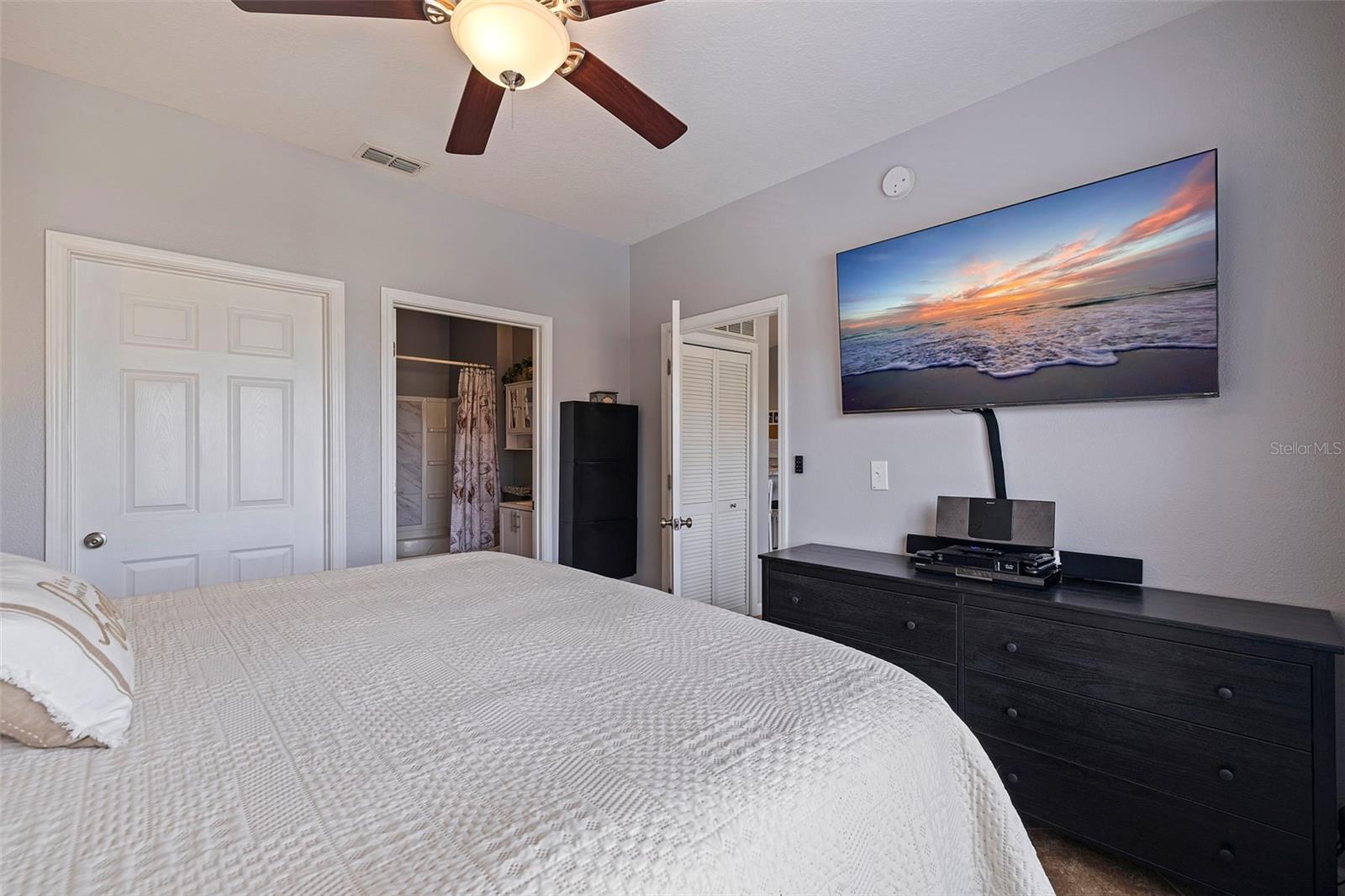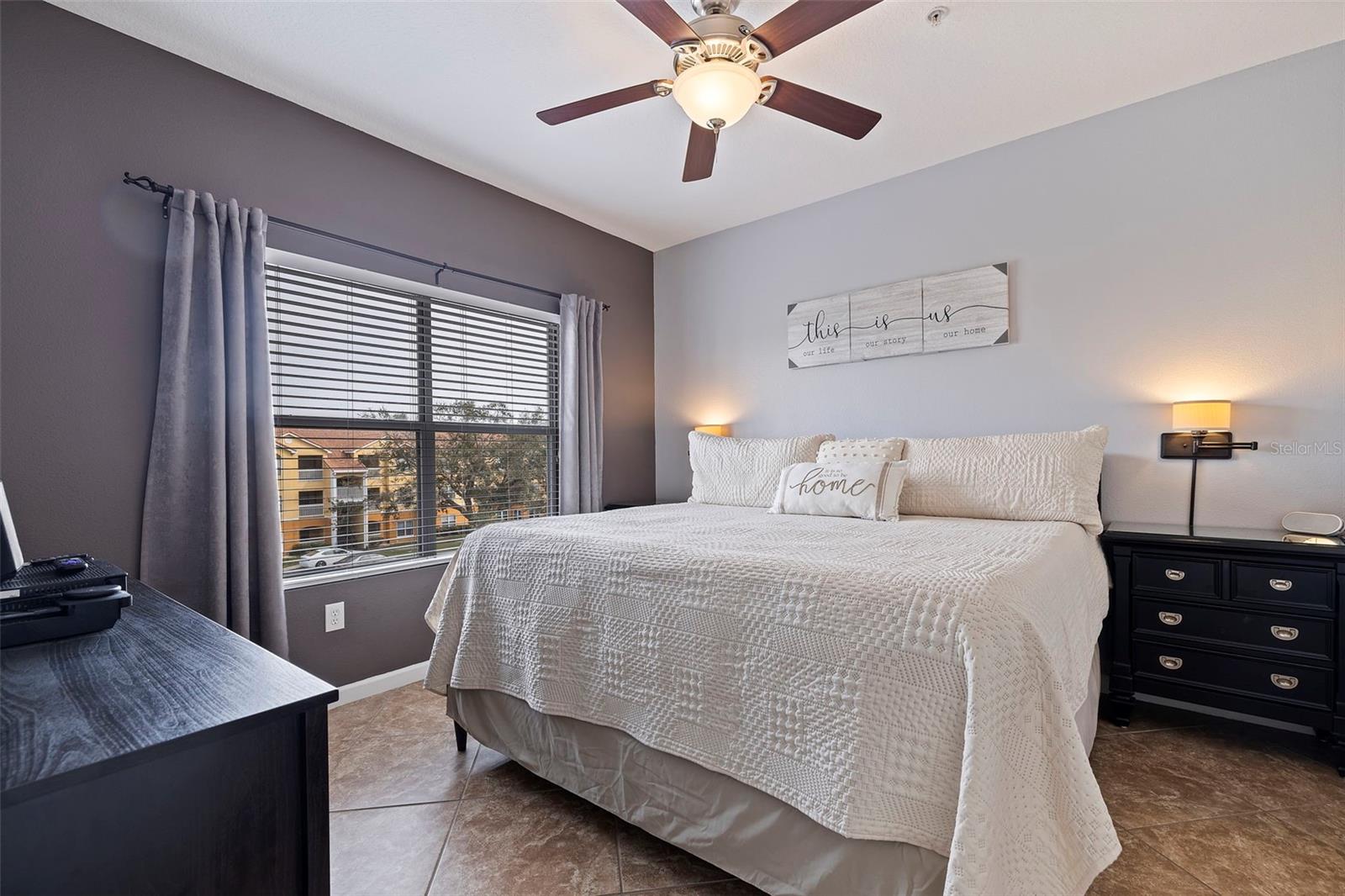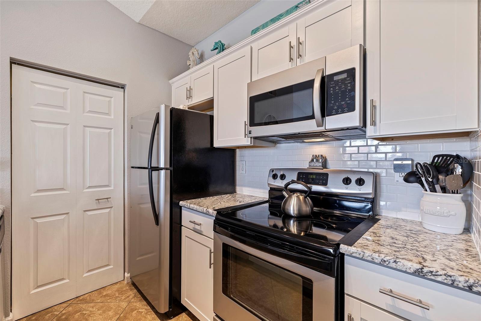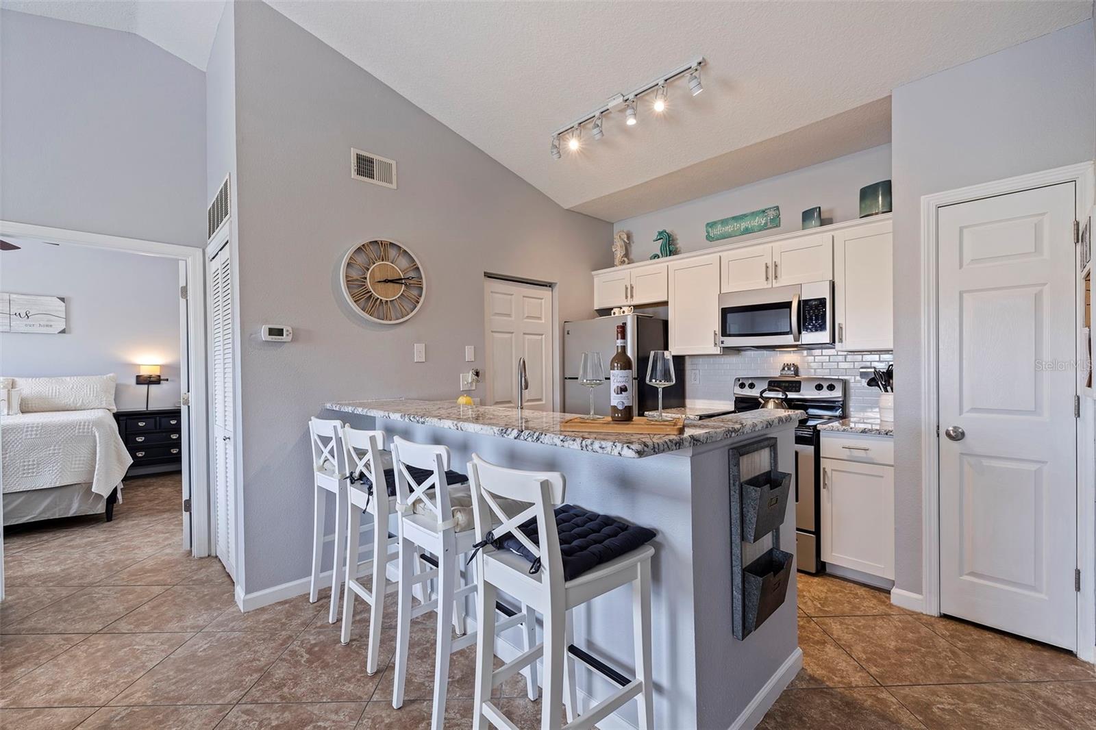 Largest sized unit located on a scenic and quiet top 3rd floor with beautiful and spacious cathedral ceilings. Gated community with cameras to provide extra security. Two external storage closets: Main closet, which comes with each condo is conveniently next to your unit for quick access items (tools, decorations, etc.). Extra closet #500 (purchased) is located on the first floor for your outdoor items (bikes, golf clubs, pool rafts, beach chairs, etc.) and only costs and extra $40/year which includes electric. Lanai (patio) includes glass sliders for fresh air and Florida sunshine. Extras included in unit are: Furniture and TVs (5), Home warranty for peace of mind (covers HVAC, appliances, plumbing, electric, etc. - see home warranty for details). LOW HOA at $535/month which includes: Management company with on-site manager and maintenance for your daily needs, high speed internet, 3 cable boxes, heated pool, indoor gym, pickleball/tennis court, shuffle board, exterior maintenance, EV charging stations, discounted guest rental unit for extra guests. Stress Free living where you are only responsible for maintaining the interior of your unit! Enjoy being close to world-famous beaches where you can indulge in sun, sand, and sea. Plus, a variety of shopping destinations are nearby including Seminole City Center which offers endless options for dining, entertainment, and retail therapy. Come see why this could be your next home sweet home.