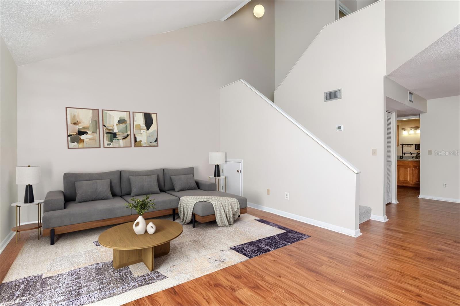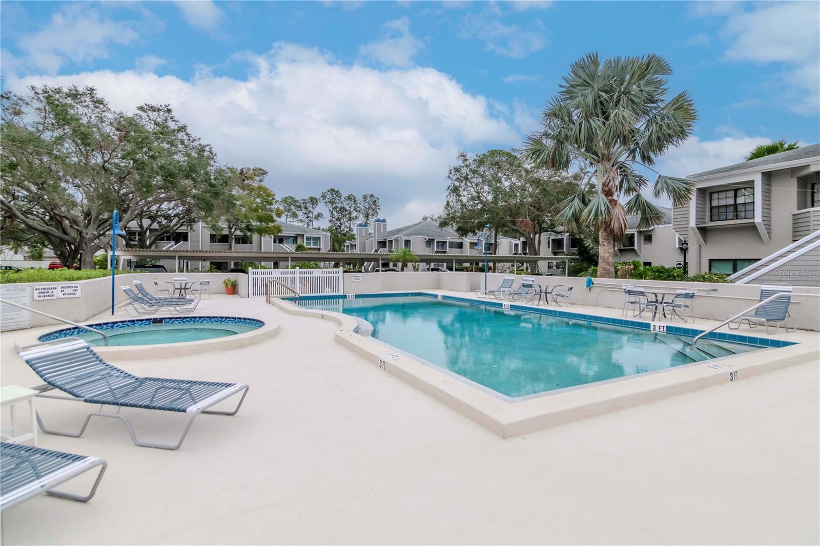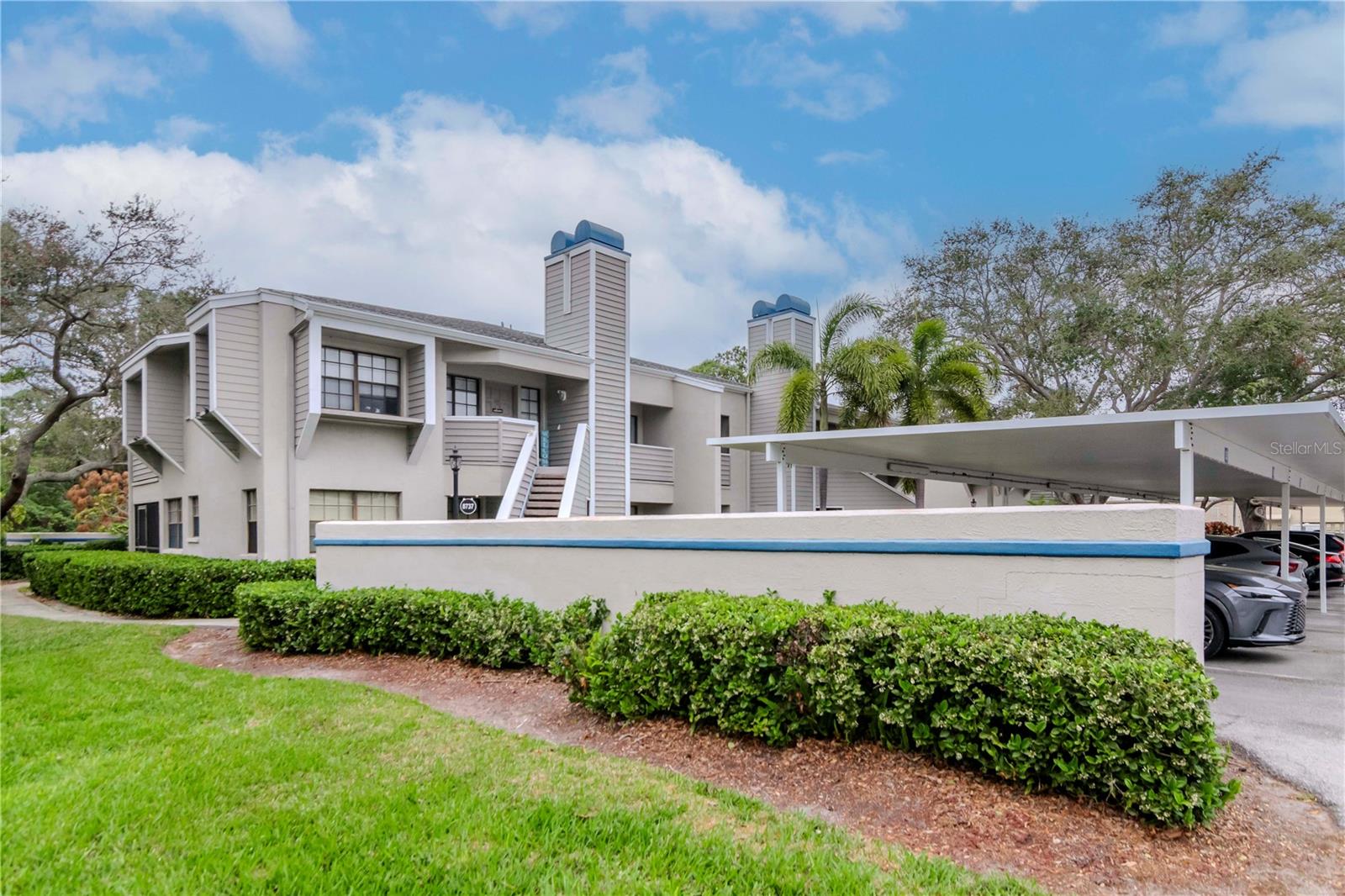 This two-bedroom, two-bathroom home offers approximately 1,090 square feet of living space. The property is a corner unit with vaulted ceilings, providing an open and airy atmosphere. The living area features a cozy fireplace, abundant natural light, and plenty of storage space. The home's exterior boasts a covered entry, allowing for a protected and welcoming entryway. On the first floor, residents can enjoy a private outdoor seating area, perfect for relaxing or entertaining. Upstairs, a private balcony on the second floor provides additional outdoor living space. Covered parking is available, offering protection from the elements. Residents will also appreciate the convenience of being close to the community pool, as well as the nearby Bardmoor Promenade and Seminole City Center, providing easy access to shopping, dining, and other local amenities. One or more photos have been virtually staged.