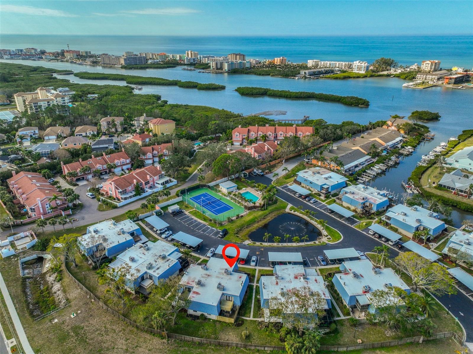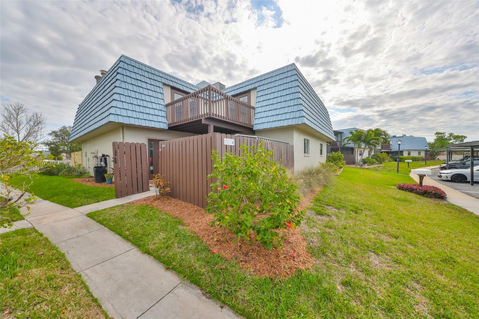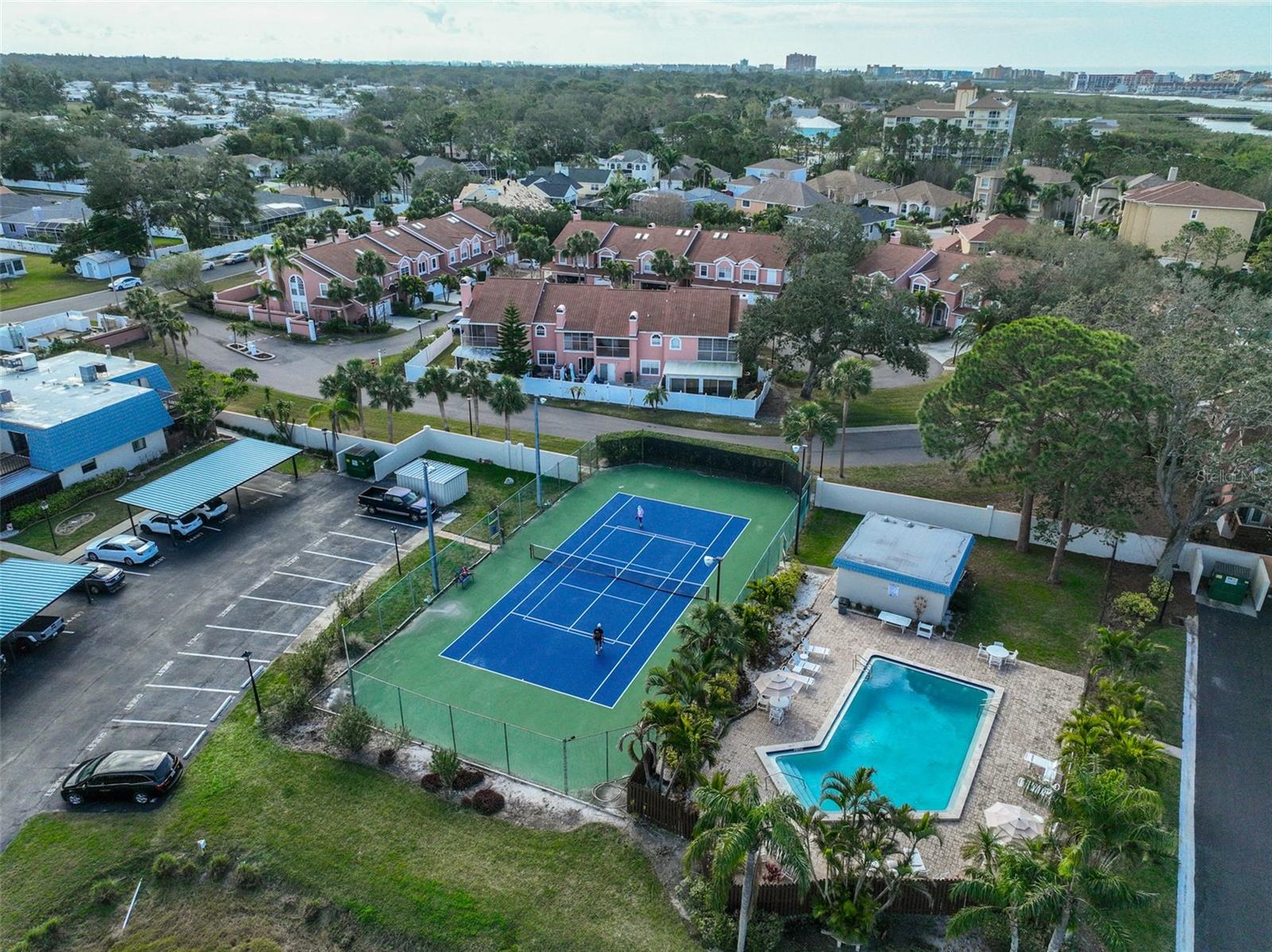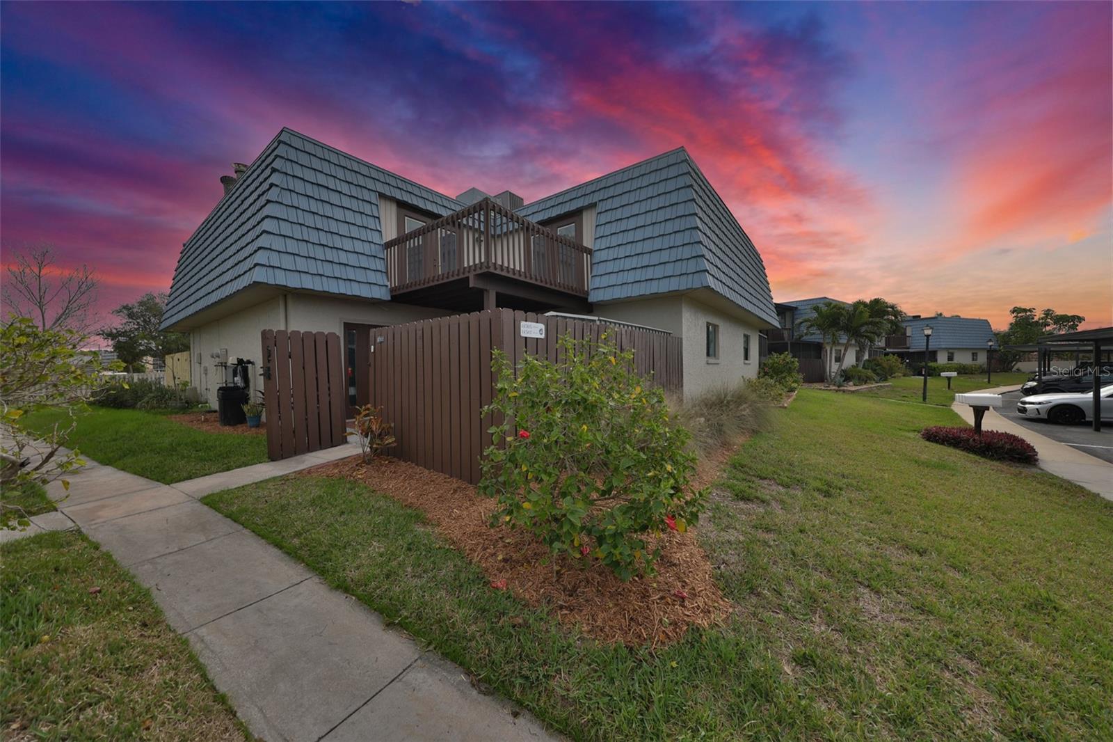 Welcome to this beautiful 2 bedroom/2 bathroom townhome in the peaceful & desirable Catalina Cove Community. Enter the private brick courtyard to the main entrance and two sets of French doors, fully fenced in for privacy. Step inside to the coastal-colored living room with a cozy wood-burning fireplace. Luxe vinyl flooring throughout. The dining room can host a large family or gathering of guests, if desired. The kitchen has all stainless steel appliances and a breakfast bar, perfect for a cup of joe or a quick meal! The bathroom on the first floor has a separate closet with a full-sized washer & dryer plus extra shelving. There is a first-floor closet located by the stairs, home to the water heater, electrical panel and ample/bonus storage. As you are led upstairs, you’ll find the split bedroom floor plan: A SPACIOUS primary ensuite and an equally impressive second bedroom, both with charming French doors that lead out to a private balcony. This lovely home has perfectly-skimmed ceilings, all new coastal-inspired interior paint, all new exterior paint and siding, ac (2017), new roof (2022), ample closets & a courtyard shed with flooring to secure storage, an entire home water softener system, assigned covered parking with generous additional guest parking, and the LOWEST HOA FEES AROUND: $320 per month! This community has a sparkling saltwater pool & newly resurfaced tennis/pickleball court. The grounds are impeccably kept. Pets are welcome (some restrictions)! Just mere minutes away from our gorgeous Gulf beaches, shopping and dining, major airports (St. Pete/Clearwater & Tampa International) 20 & 40 minutes away, close to the interstate to travel South or North to any destination you desire. Truly not to miss this stunning townhome. Come Live in the Dream!