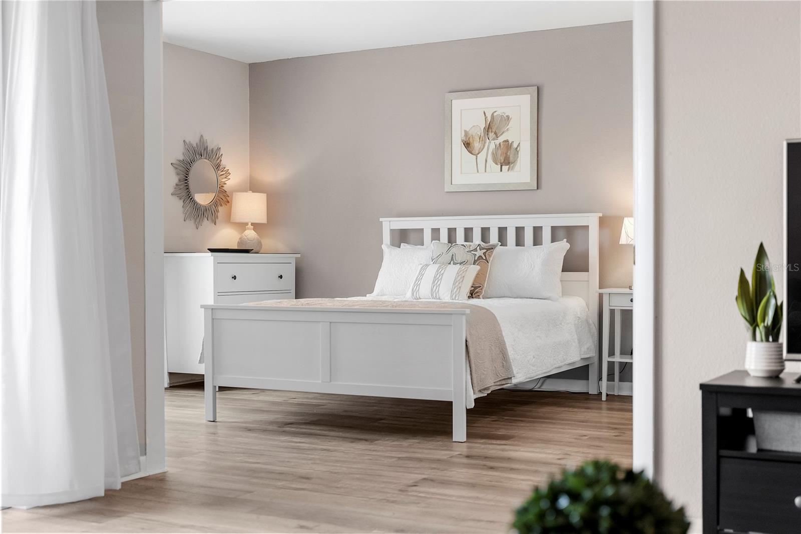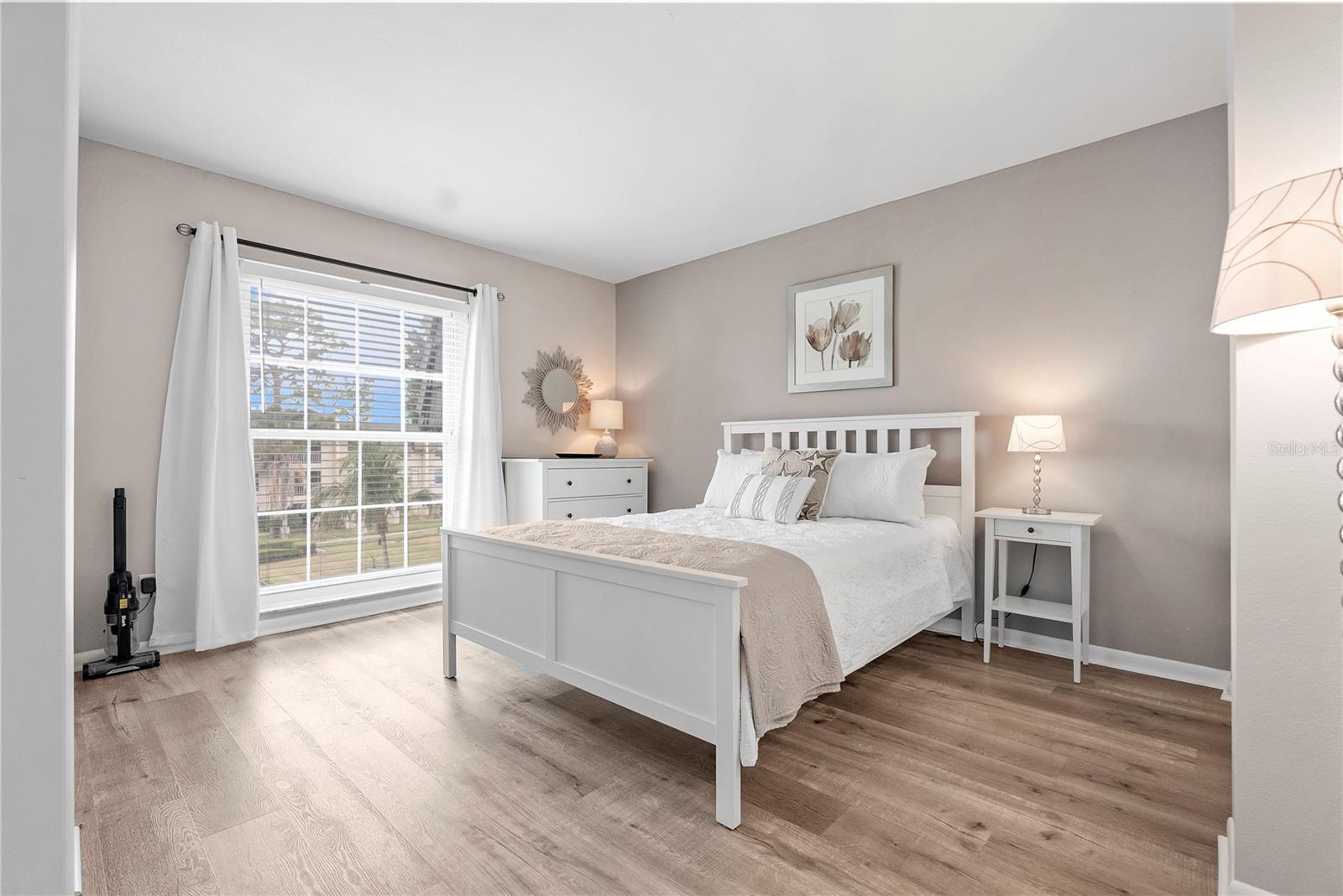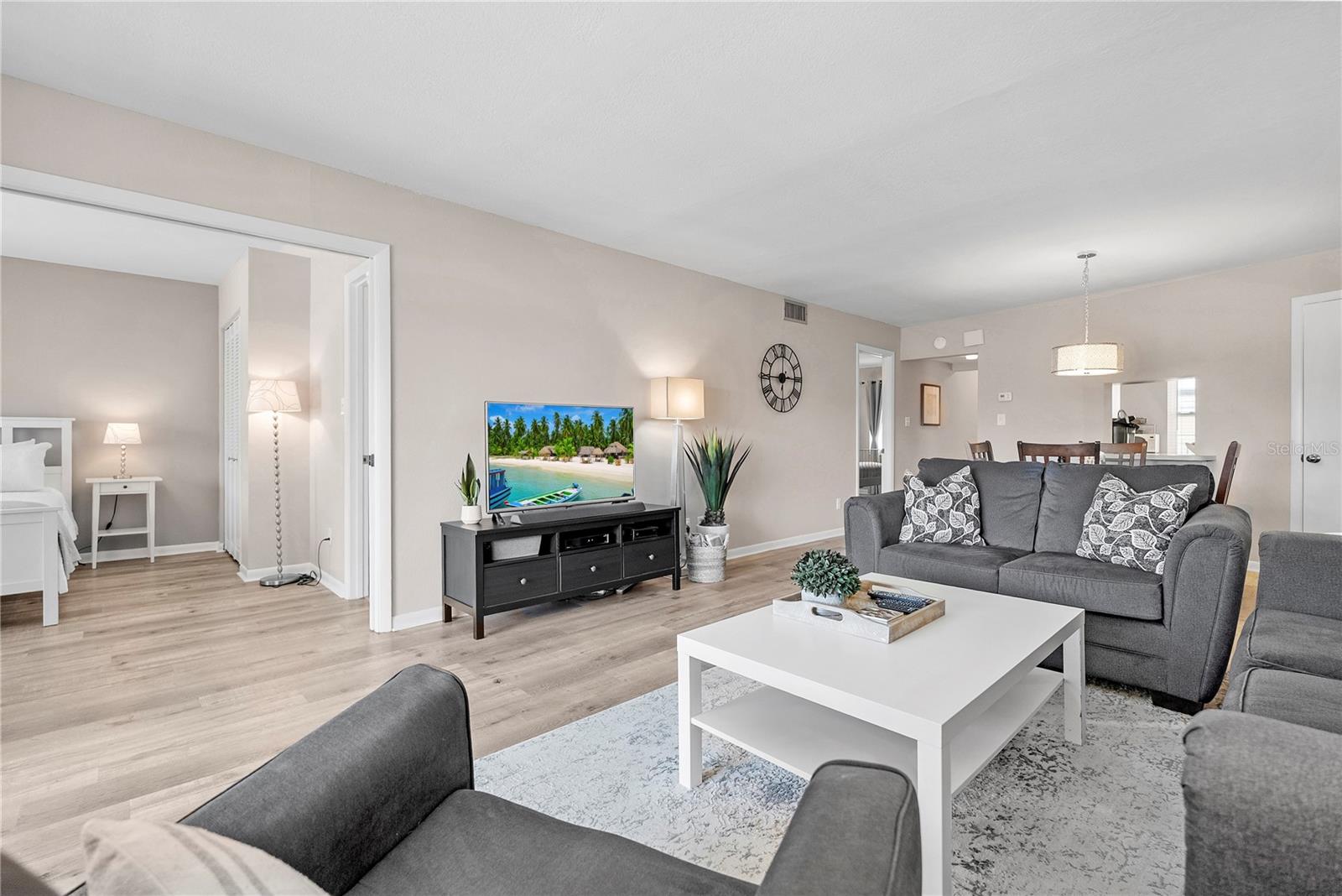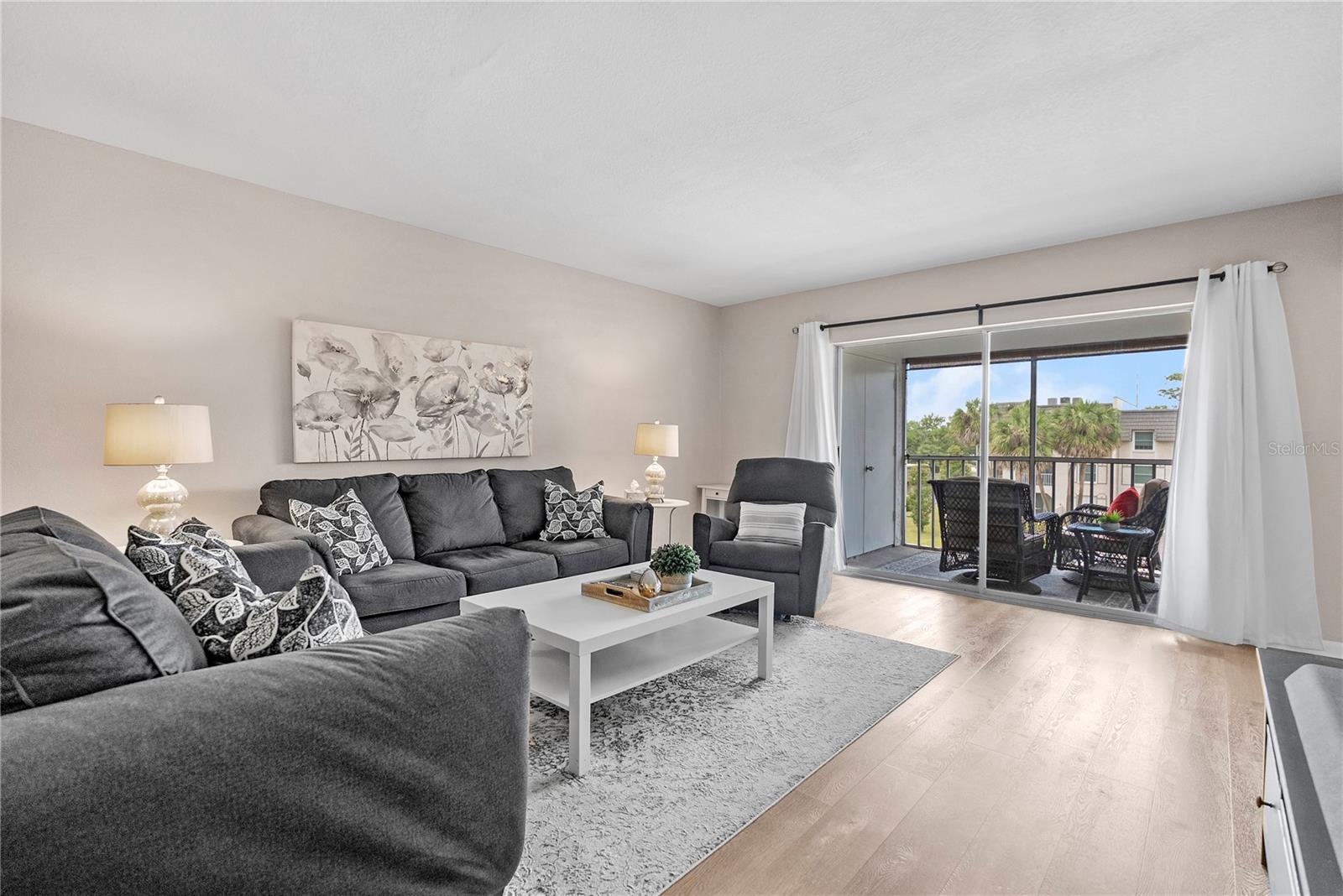 Welcome to Cordova Greens V – Building 8703 of Bardmoor’s Premier Condo Community Situated in the newest buildings of Cordova Greens, this meticulously maintained top-floor condo offers an inviting, move-in-ready space with tasteful updates and stylish furnishings—sold fully furnished with some décor. Step inside to a welcoming foyer entrance that opens into a spacious floor plan featuring light wood-tone vinyl flooring (installed 2019) with a rubber-backed sound barrier. The kitchen has freshly lacquered gray cabinetry, a large pass-through window, and a cozy breakfast bar—perfect for both meal prep and conversation. Matching hardware on doors and updated modern lighting carry throughout the home. In 2019, the condo was enhanced with three Simonton impact windows (with a one-time new owner transferrable warranty), custom blinds, and updated bathroom vanities, comfort-height toilets, and textured ceilings (no popcorn!). The open living and dining area flows to a screened lanai—a peaceful spot to enjoy western sunsets and views of the beautifully maintained greenbelt and pool. A roll-down shade offers extra privacy and rain protection, and the guest bedroom shares the view, making it a perfect den or second suite. The split-bedroom layout offers excellent privacy. The primary suite features a spacious layout, walk-in closet, linen closet, and a generous bathroom with a large vanity, tub/shower combo with dual safety bars, and private water closet. The guest bedroom is bright and roomy with two built-in closets and almost floor-to-ceiling window—separated with a pocket door to create a private guest wing. Other Notable Features: • Laundry closet on lanai with Samsung top-load washer (2 yrs) & Kenmore dryer (9 yrs) – vents to exterior • Anthony’s A/C (2012) – serviced annually with new Freon added • 2024 AO Smith 38-gallon water heater • QO electric panel in code-compliant location – insurance friendly • New concealed Spectrum cable wiring • Interior pest control every two months • Attic access & utility closet. Enjoy the recently refurbished pool and hot tub. Your assigned covered carport is close to the building elevator, with ample guest parking nearby. Bardmoor residents enjoy access to two nearby country clubs with golf, tennis, pickleball, dining, and social events, and Bardmoor Blvd has a large shoulder for biking and walking. Within a couple miles of a grocery store, dining, shopping, medial centers, Lake Seminole and Kayak Park, and only 15 minutes to Gulf beaches. HOA fee of $1,147.99/month covers everything except electric—including Spectrum high-speed internet and cable. No flood insurance required. No land lease. No pets (service/ESA exceptions with certified letter). 2-year ownership required before leasing and must rent for a minimum of 3 months. Whether you're seeking a full-time residence or a seasonal escape, this updated, top-floor condo offers comfort, convenience, and a true sense of Florida lifestyle. With tasteful furnishings, thoughtful upgrades, and a community rich in amenities, 8703 Bardmoor Blvd #305 is ready to welcome you home.