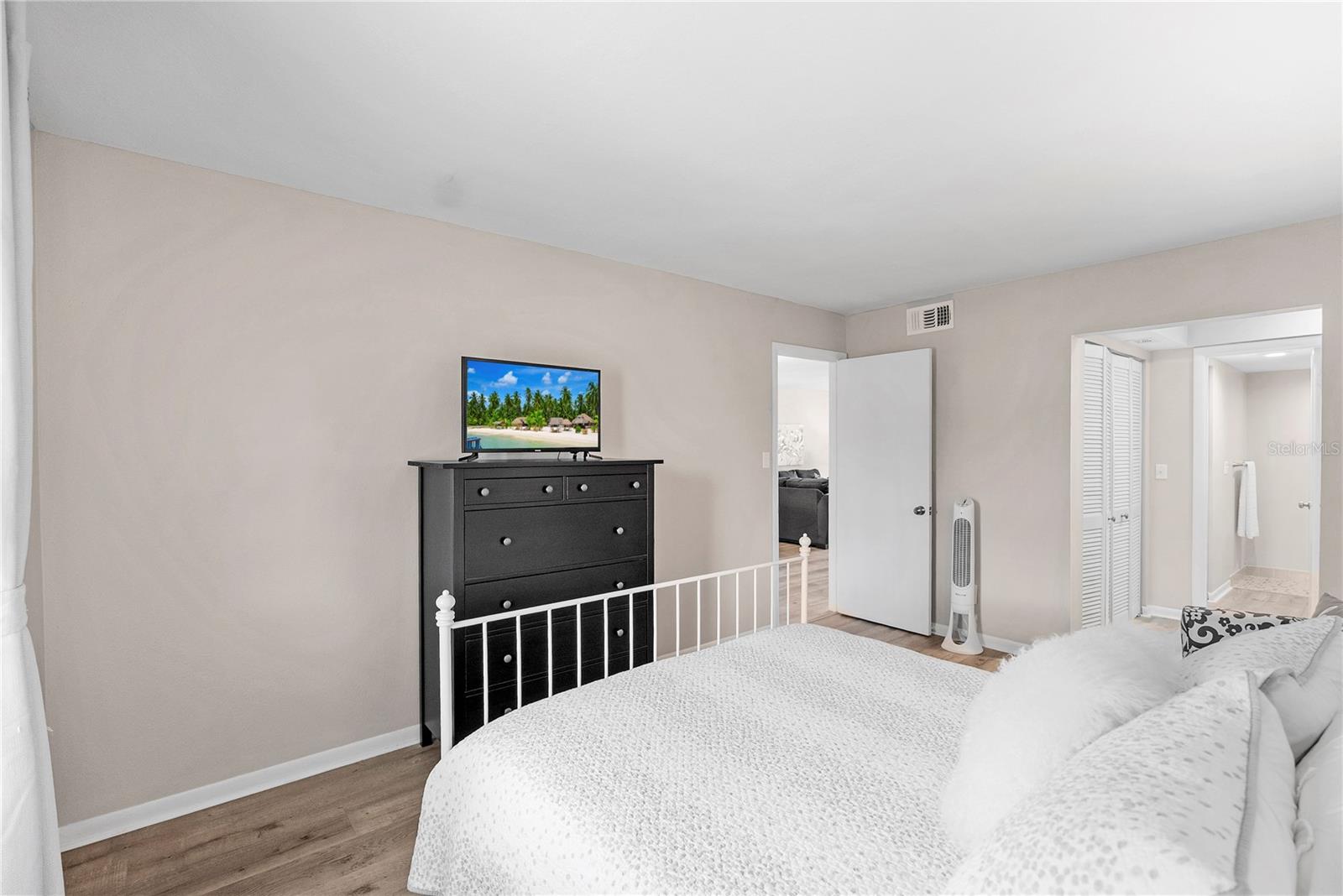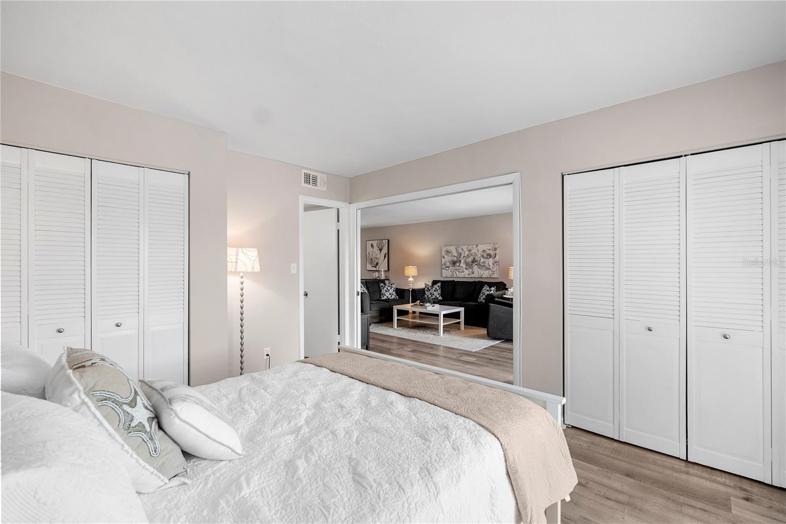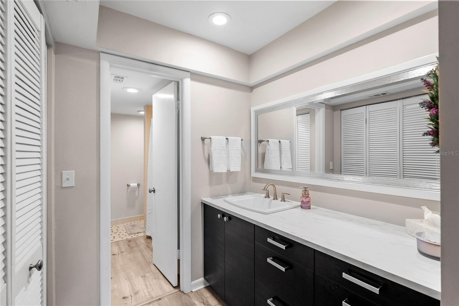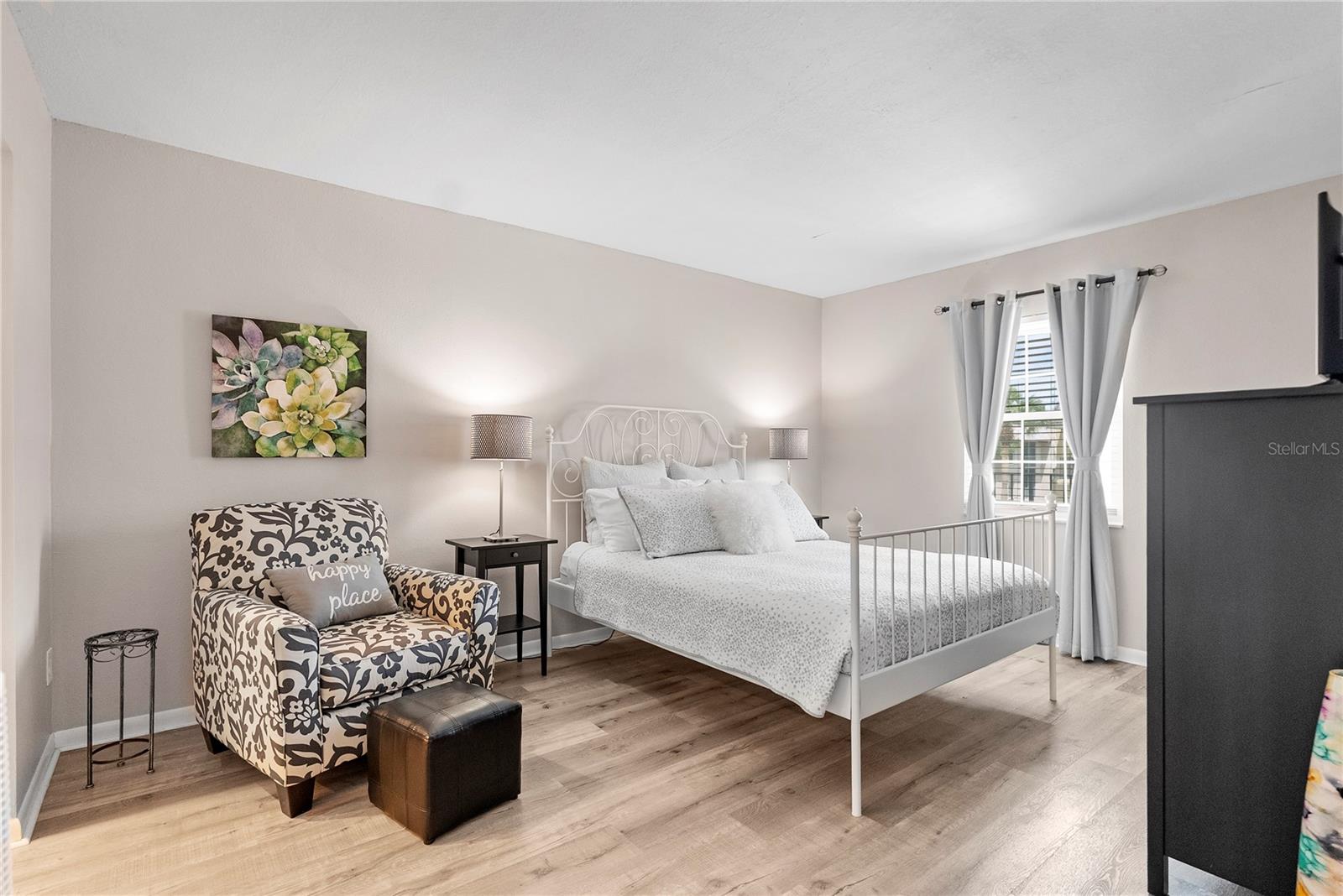 Welcome to Cordova Greens V – Building 8703 of Bardmoor’s Premier Condo Community Situated in the newest buildings of Cordova Greens, this meticulously maintained top-floor condo offers an inviting, move-in-ready space with tasteful updates and stylish furnishings—sold fully furnished with some décor. Step inside to a welcoming foyer entrance that opens into a spacious floor plan featuring light wood-tone vinyl flooring (installed 2019) with a rubber-backed sound barrier. The kitchen has freshly lacquered gray cabinetry, a large pass-through window, and a cozy breakfast bar—perfect for both meal prep and conversation. Matching hardware on doors and updated modern lighting carry throughout the home. In 2019, the condo was enhanced with three Simonton impact windows (with a one-time new owner transferrable warranty), custom blinds, and updated bathroom vanities, comfort-height toilets, and textured ceilings (no popcorn!). The open living and dining area flows to a screened lanai—a peaceful spot to enjoy western sunsets and views of the beautifully maintained greenbelt and pool. A roll-down shade offers extra privacy and rain protection, and the guest bedroom shares the view, making it a perfect den or second suite. The split-bedroom layout offers excellent privacy. The primary suite features a spacious layout, walk-in closet, linen closet, and a generous bathroom with a large vanity, tub/shower combo with dual safety bars, and private water closet. The guest bedroom is bright and roomy with two built-in closets and almost floor-to-ceiling window—separated with a pocket door to create a private guest wing. Other Notable Features: • Laundry closet on lanai with Samsung top-load washer (2 yrs) & Kenmore dryer (9 yrs) – vents to exterior • Anthony’s A/C (2012) – serviced annually with new Freon added • 2024 AO Smith 38-gallon water heater • QO electric panel in code-compliant location – insurance friendly • New concealed Spectrum cable wiring • Interior pest control every two months • Attic access & utility closet. Enjoy the recently refurbished pool and hot tub. Your assigned covered carport is close to the building elevator, with ample guest parking nearby. Bardmoor residents enjoy access to two nearby country clubs with golf, tennis, pickleball, dining, and social events, and Bardmoor Blvd has a large shoulder for biking and walking. Within a couple miles of a grocery store, dining, shopping, medial centers, Lake Seminole and Kayak Park, and only 15 minutes to Gulf beaches. HOA fee of $1,147.99/month covers everything except electric—including Spectrum high-speed internet and cable. No flood insurance required. No land lease. No pets (service/ESA exceptions with certified letter). 2-year ownership required before leasing and must rent for a minimum of 3 months. Whether you're seeking a full-time residence or a seasonal escape, this updated, top-floor condo offers comfort, convenience, and a true sense of Florida lifestyle. With tasteful furnishings, thoughtful upgrades, and a community rich in amenities, 8703 Bardmoor Blvd #305 is ready to welcome you home.