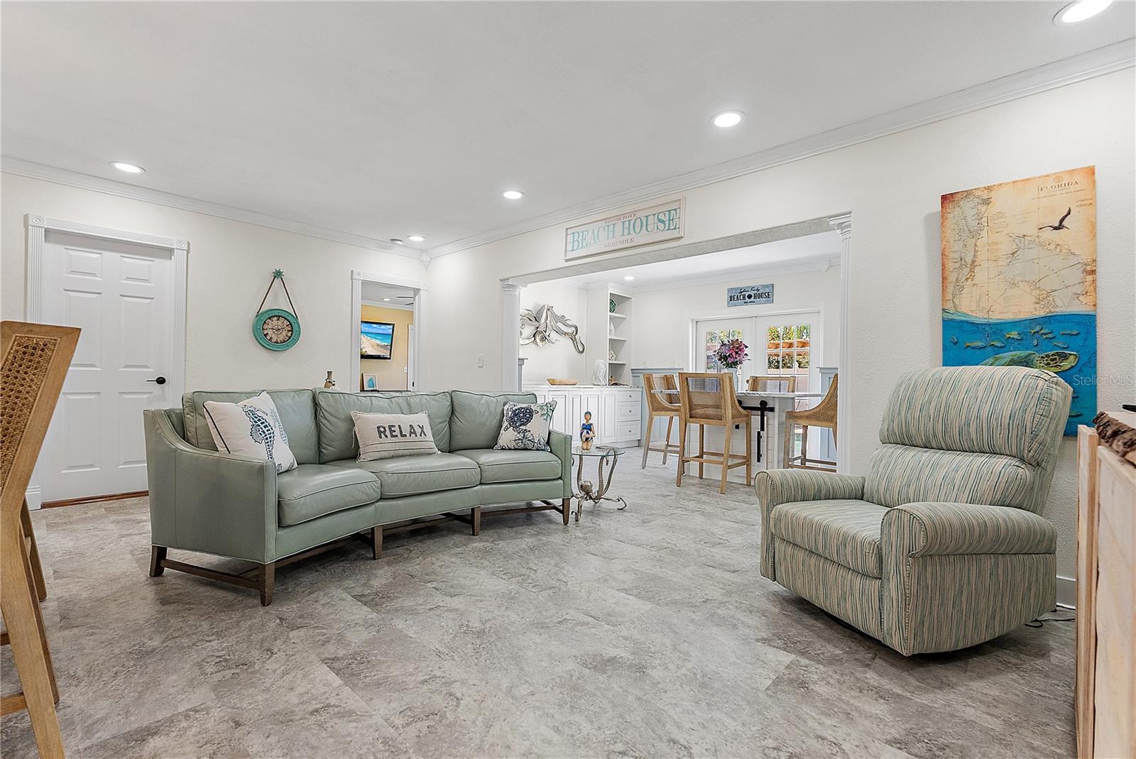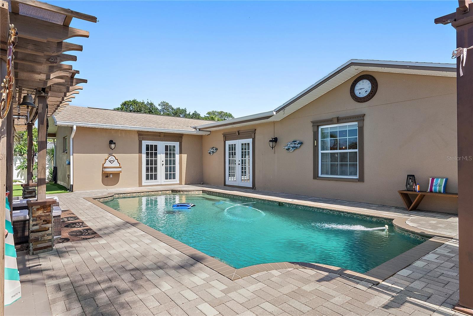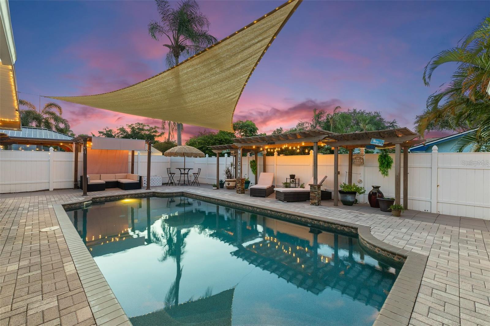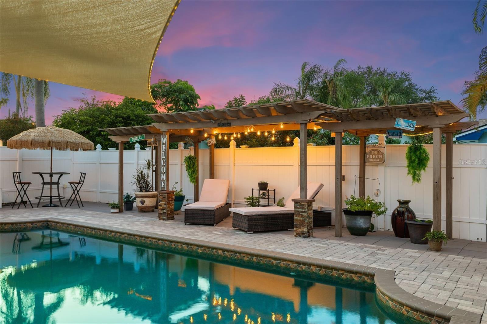 This house is great - no doubt about it! A lot of beauty, a lot of entertainment/relaxation space or a lot of activities available. Beautiful manicured landscape with a paved walkway that leads to a recently updated, open concept interior. The updates don't just include the aesthetic designs of the new kitchen featuring a large center island and two-tone wood shaker cabinets with quartz countertops all sitting on brand new luxury vinyl flooring (2025) throughout the home but also include the big ticket items of new HVAC (2024), water heater (2025), full roof replacement (2016), new PebbleTec pool refinishing and pool pump (2024) and the newer hurricane rated garage door. So with all of the worries of big ticket failures behind you, you have plenty of time to entertain in your expansive 451sf family room with vaulted ceiling, custom built bar with refrigerator, and a large, stylish fireplace or head outside the family room that opens up to your backyard playground. The paver decked pool area boasts two covered cabanas that surround the large pool (35 x 13.5) with two cleaning systems included. There is also a 9 hole golf putting green (w a small sand trap as well) that is constructed of top quality, maintenance free artificial turf. Your putting green is surrounded by tropical foliage that also brings a little nature into your life with an active butterfly tree. This outdoor area features colored lighting to create an enjoyable entertaining ambiance. If all of that isn't enough - here's what you get in addition: 5 minute car ride (or take your golf cart if you have/want one) to the entrance of the quiet, public beach access to Indian Shores Beach on the Gulf of Mexico; 5 minutes from the Park Blvd boat ramp facility to launch your boat and perhaps do a little fishing; 5 minutes to the Pinellas Trail providing 95 miles of private bike trail from south St. Pete to Tarpon Springs; 5 minutes to Boca Ciega Millenium Park which has a kayak launch and a 3 story lookout tower over the intercoastal (among many picnic areas and playgrounds) to watch our beautiful sunsets; 8 minutes to Seminole City Park that offers musical concerts in its own band pavilion. And when you're done with all of the activities for the day, you can head to the plethora of eateries, boutiques either on the beach or at the Town Center. Oh ---- and school --- yes, that's important too ---this community is located in one of the best school systems in the county and the campus that houses all three levels of school (primary, middle and high school) is between .3 - .5 miles away. What a community! What a life!