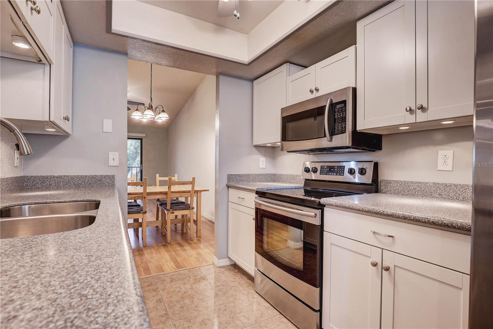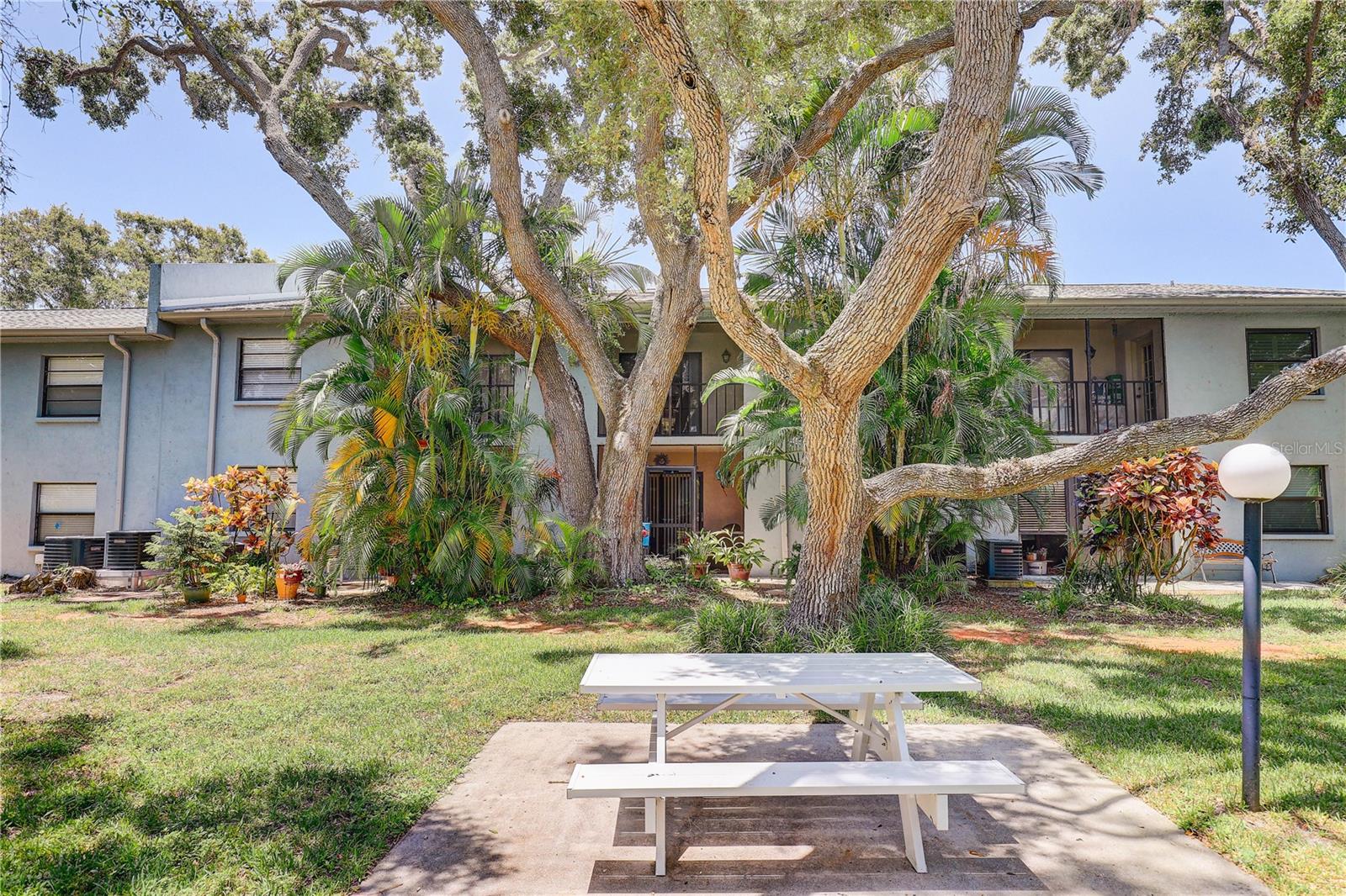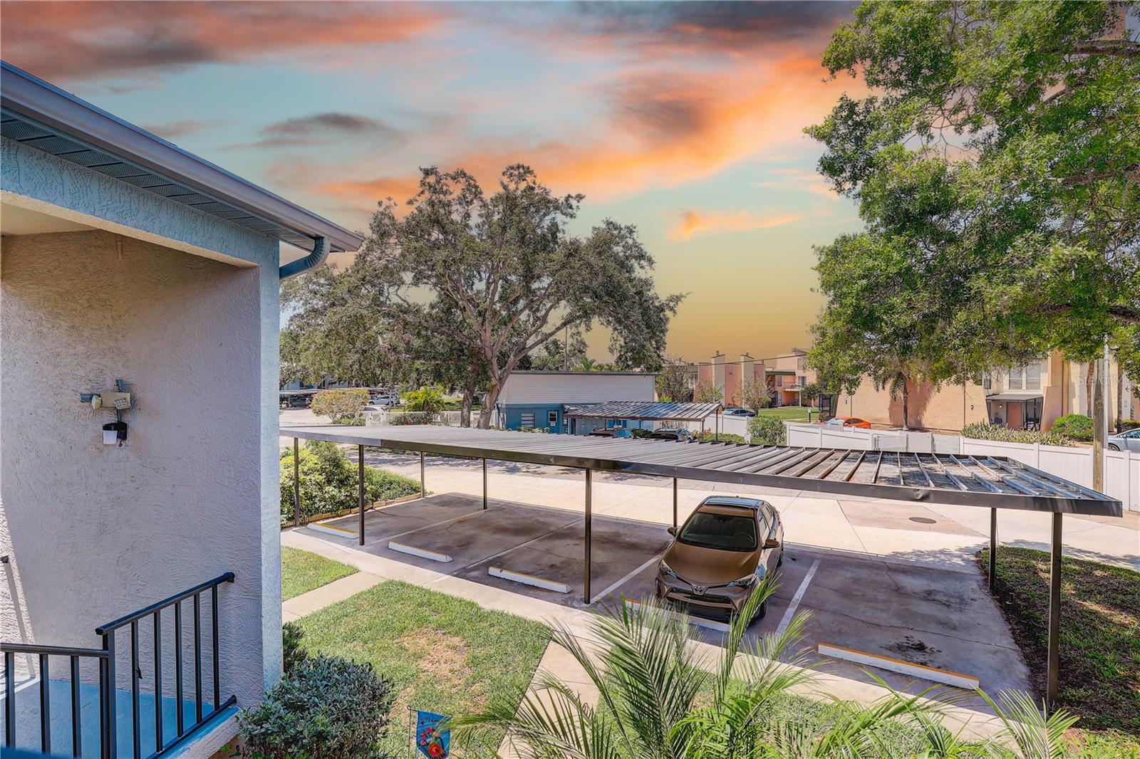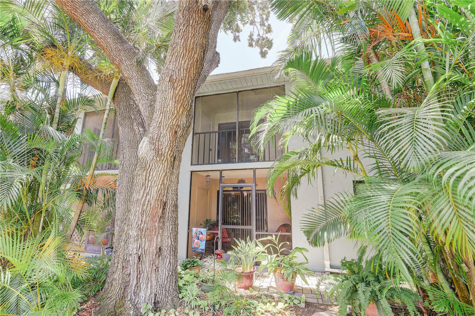 Step inside this charming and cozy 2-bedroom, 2-bath condominium that beautifully balances comfort with style across its 980 square feet. From the moment you enter, you'll appreciate the inviting open floor plan accentuated by soaring vaulted and cathedral ceilings, which lend an airy and spacious feel throughout the living and dining areas. The living room and dining room flow seamlessly together, enhanced by tasteful laminate flooring that adds warmth and durability. The kitchen is a delightful space for both cooking and gathering, featuring solid surface countertops and solid wood cabinets that offer plenty of storage and prep space. Equipped with modern appliances including a dishwasher, disposal, gas water heater, microwave, range, and refrigerator, this kitchen makes everyday meal prep a pleasure. An eating space right in the kitchen ensures a cozy spot for casual dining or morning coffee. Natural light streams through sliding doors that open to a screened and enclosed patio, creating a perfect extension of the living space — ideal for relaxing or entertaining while enjoying the mature oak trees and thoughtfully landscaped surroundings. The residence also boasts practical features such as an inside utility room and ample closet space, including walk-in closets in the bedrooms to keep your belongings organized. Comfort is key here with central air conditioning and heating, ceiling fans, and well-placed blinds on the windows for privacy and light control. The two bathrooms complement the bedrooms with clean, functional design; the primary bathroom offers a shower setup and the secondary bath is equally inviting. The flooring throughout combines elegant ceramic, porcelain, and laminate tiles for a stylish yet easy-to-maintain home. Parking convenience is provided by an assigned carport space with additional guest parking available. The building’s exterior features durable block and stucco construction with a slab foundation and a well-maintained roof. Community amenities include access to a sparkling community pool, perfect for a refreshing swim or socializing on sunny days. This residence not only offers a comfortable and inviting home but also comes with pet-friendly policies allowing cats, making it a welcoming place for all members of your family. The combination of architectural details like tray ceilings, lighting fixtures, and a bright open floor plan truly makes this condominium a special find for those seeking a blend of practicality and style. Whether you're relaxing inside or enjoying the screened porch amid mature landscaping, this home provides a serene and comfortable lifestyle ready for you to move in and make your own.