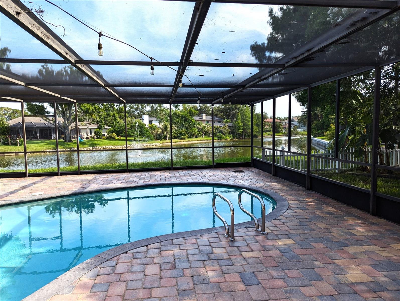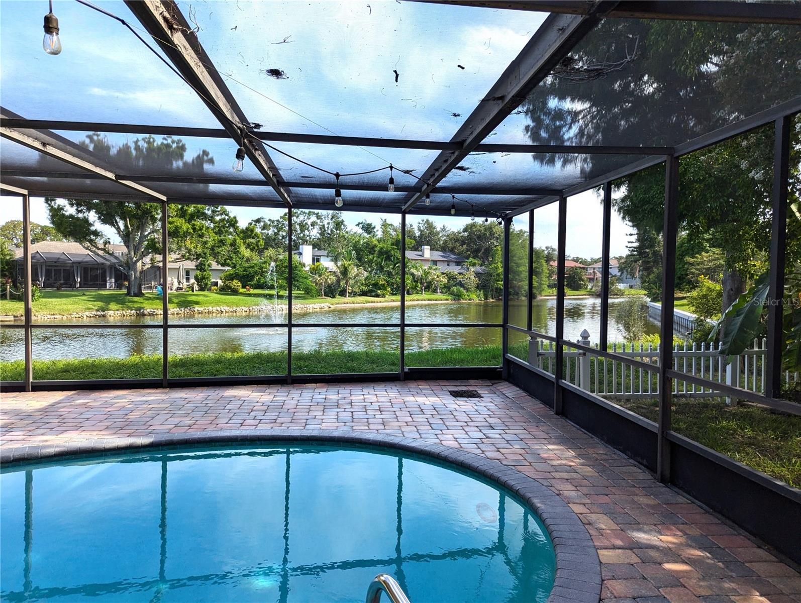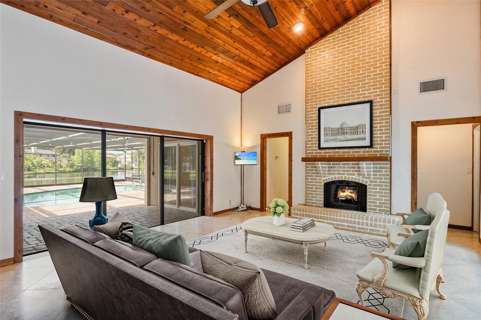 One or more photo(s) has been virtually staged.....Welcome to waterfront living at its finest. This home is located in the highly desirable Seminole Lake Golf and Country Club community! This move-in condition well-kept home features 4-bedrooms, 3-bathrooms with 0.44-acre lake-front lot with an oversized two-car garage. It also features a large, screened pool for family gatherings and entertaining friends. The pool also has a newer natural gas heater which was installed in 2023. A Newer ac unit which was installed in 2021, with a 10-year labor and parts warranty. The roof was replaced in May of 2025. The home offers indoor and outdoor living with an open functional floor plan with an atrium. Upon entering through the grand double doors, you are astonished by the breathtaking views. The perfect place for sunsets. The home displays elegance and comfort for all occasions. The kitchen has custom cabinetry, granite counters, stainless appliances, gas cook-top and a breakfast bar. The home has gas which assists with lower utility bills. The home also features a home security system which is wired 14 PoE IP cameras with remote viewing and AI motion alerts. This travertine home also has a WHOLE HOUSE natural gas generator, accordion hurricane shutters and Jacuzzi tub, wet/dry sauna, separate shower, updated vanities and has never been affected by hurricanes or flood. The lawn is manicured with mature landscape and trees. Your address is located near the Seminole Lake Golf Course and close to shopping, dining, great schools and a short trip to the beautiful Gulf beaches. Schedule your showing today and live the Florida lifestyle. Don’t miss out on making this dream home your own.
