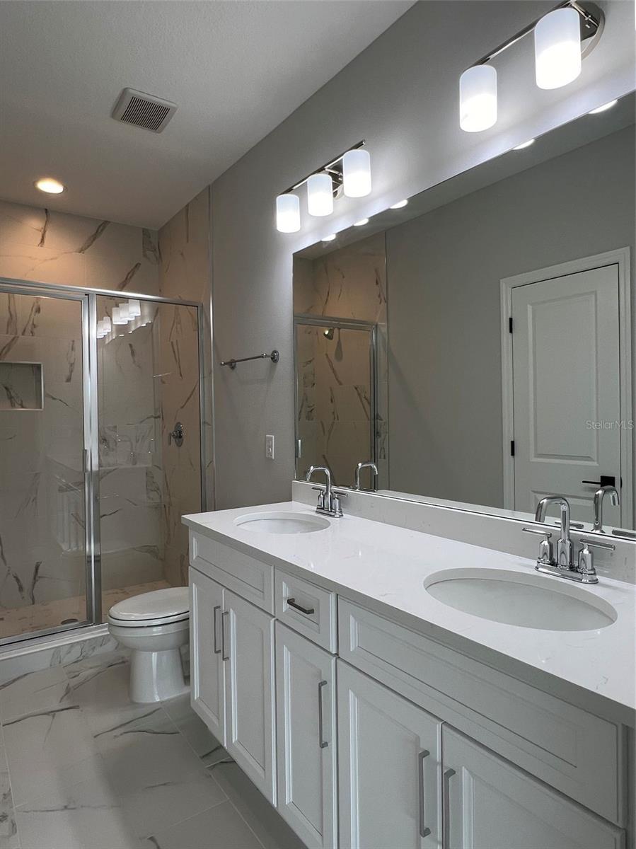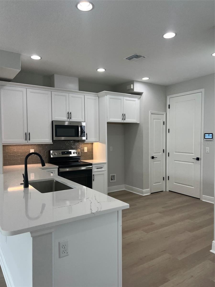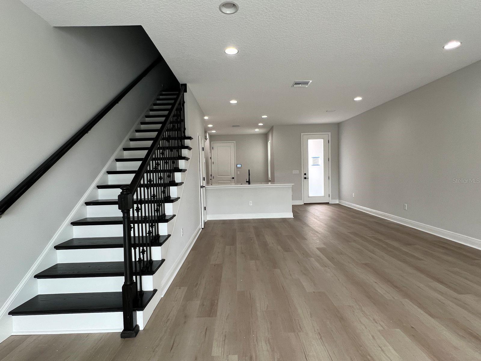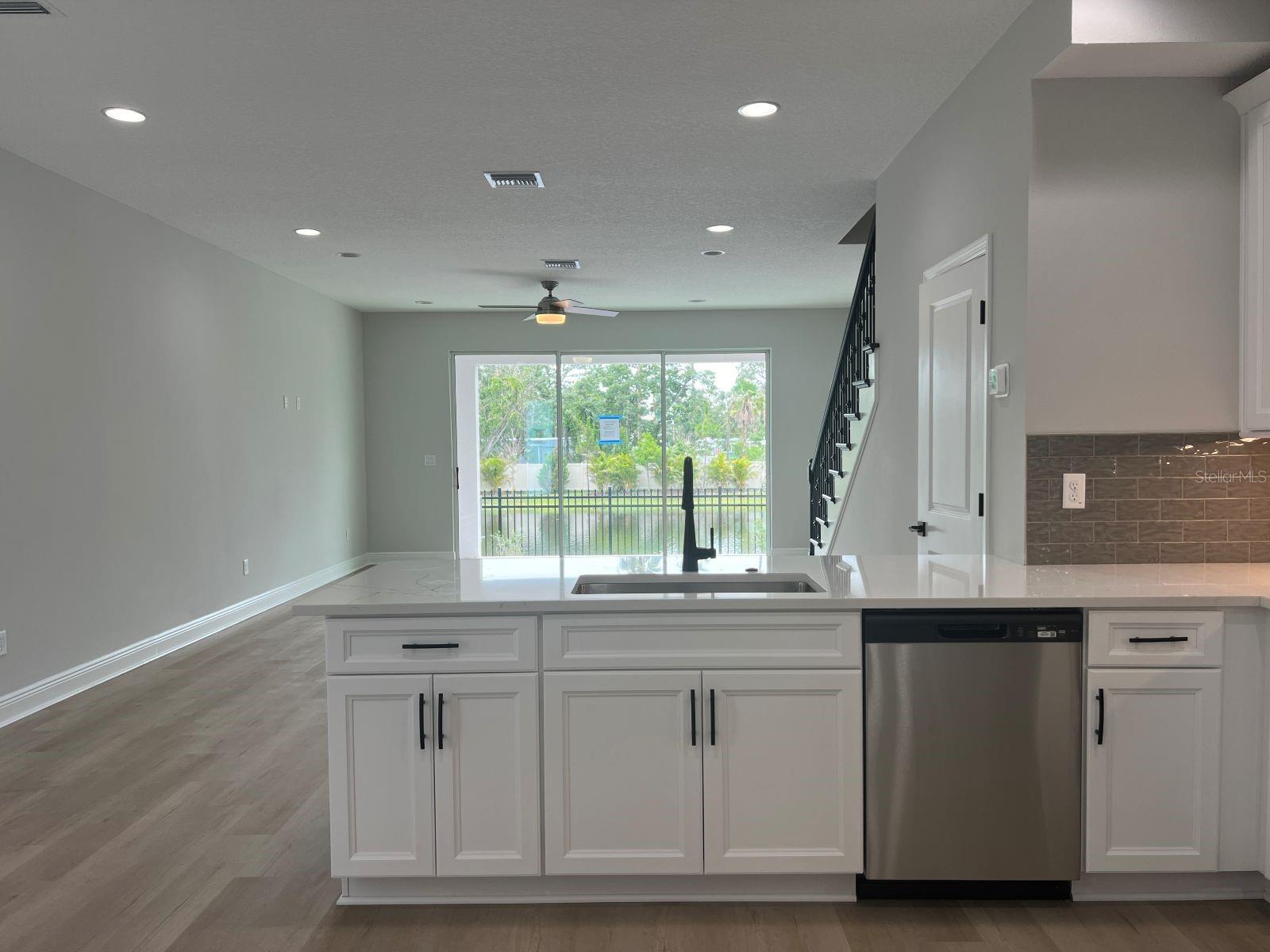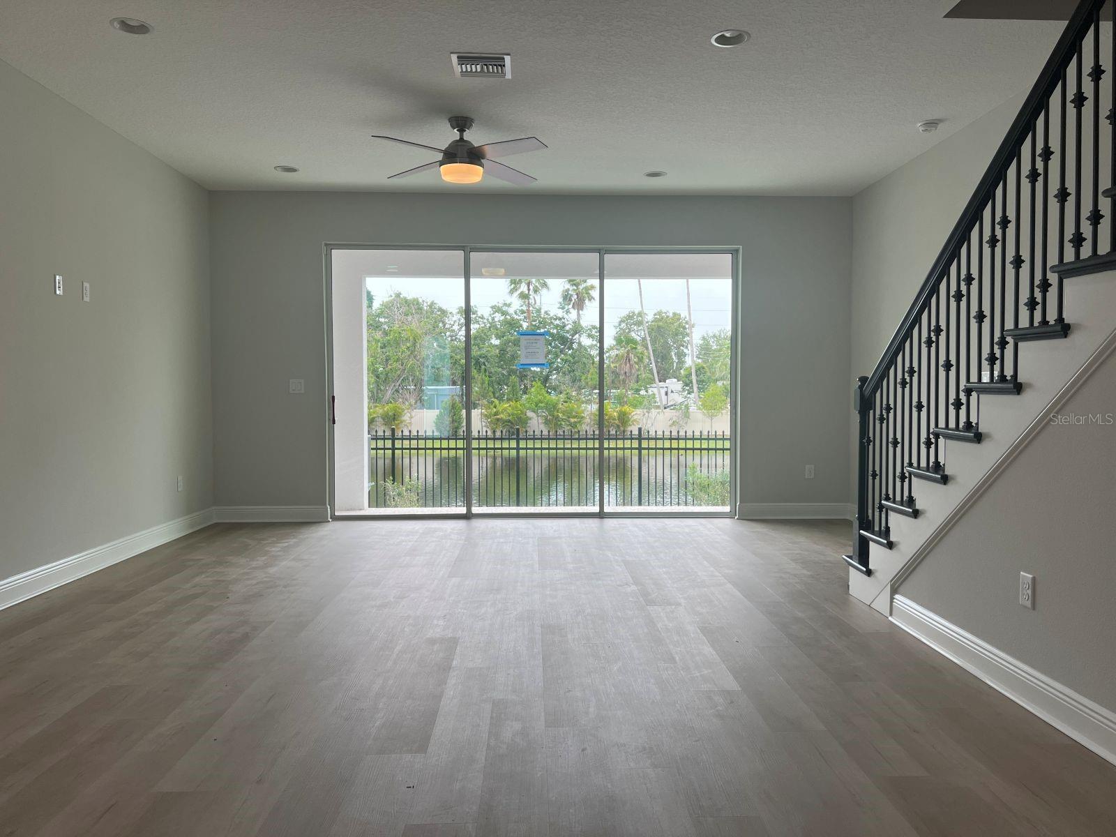 Incredible opportunity to live on the pond with fountain view in the award-winning B Model! This home boasts 3 bedrooms, 2.5 bathrooms, and 2 car garage with designer selected features such as light and bright soft close cabinetry, dark cabinet hardware, quartz countertops with distinct veining, tile backsplash and stainless-steel appliances. Entertainment friendly with open great room plan, high ceilings, and low maintenance luxury vinyl flooring throughout the first floor. Screened in lanai offers flexibility to open up on the cool days of fall and winter! Decorative iron spindles and stained oak treads with painted risers make for a showstopper staircase leading up to the private sleeping quarters. Elegant and private primary suite tucks in at the back of the home viewing the fountain and water. Marble look tiles, quartz, floor to ceiling tile in the glass enclosed shower lend to spa like ensuite feel. Guest rooms are more spacious than you might expect with thoughtfully designed windows and ball catch closet doors. 9'4 ceilings in the second story lend to the spacious feel. Just a short 2.5 mile drive to three very popular beaches, close to dining, fitness, shopping, boating, night life and located in flood zone X! Make your appointment today, you won't be disappointed!!