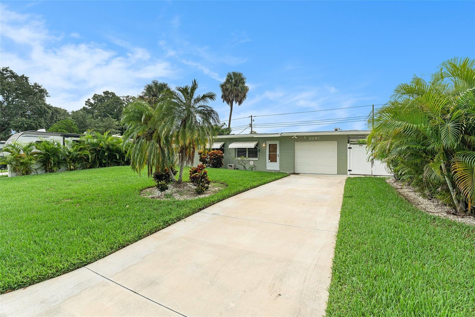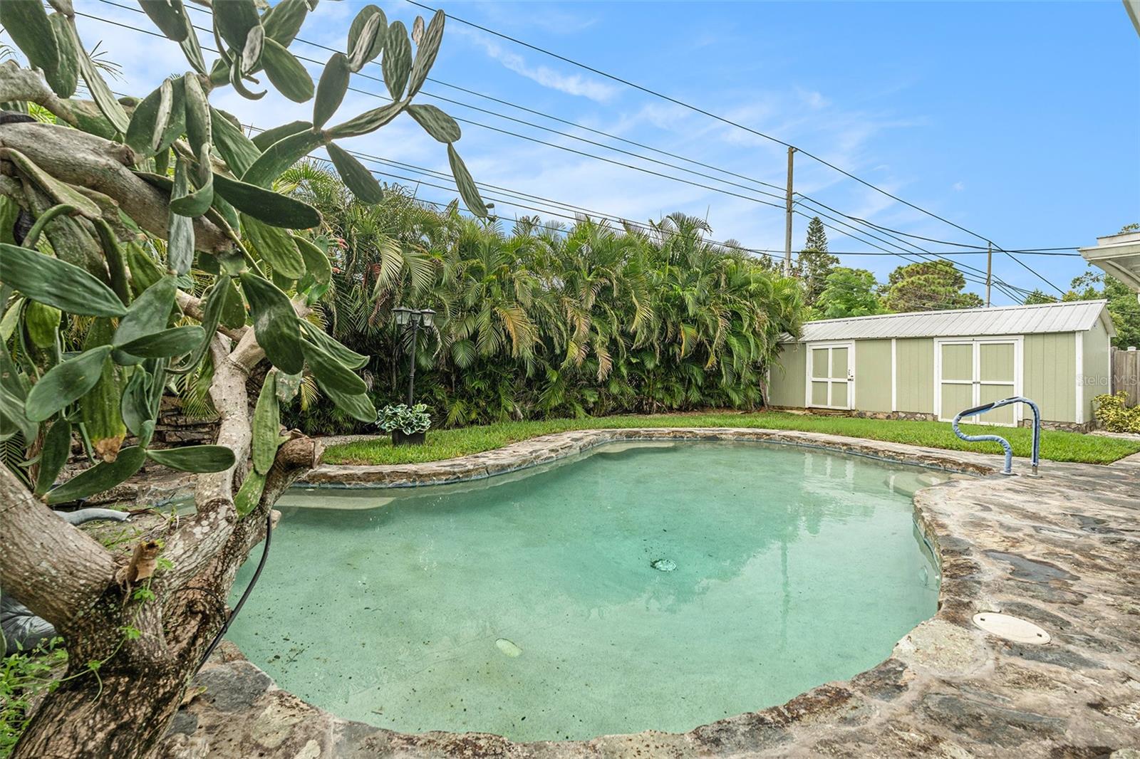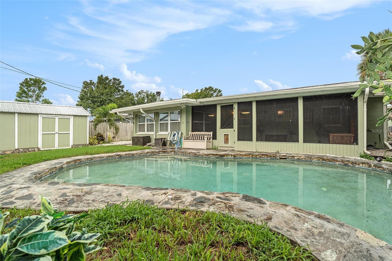 Welcome Home to this inviting 3-bedroom, 1-bath home nestled in Cross Bayou Estates. Ideal for entertaining, this residence features a spacious 15 x 16 enclosed porch with fireplace(not included in the square footage) and a spacious 15 x 24 covered, screened porch overlooking a serene, tropical yard with an in-ground pool and a large detached storage shed. The kitchen boasts beautiful quartz countertops and newer appliances. The bath has experienced recent updates with a newer shower surround, vanity and fixtures. Additional highlights include an attached one-car garage with loft storage, and a convenient carport, ideal for golf cart or motorcycle parking. The exterior boasts new sod, sprinkler system, and a new oversized driveway. This home is a rare find with no HOA and no rental restrictions, making it one of the few properties in the area fully open to short-term rentals and Airbnb hosting.(with proper STR certificate). Don't miss the opportunity to make this tropical retreat your new home! Call today for a private showing!