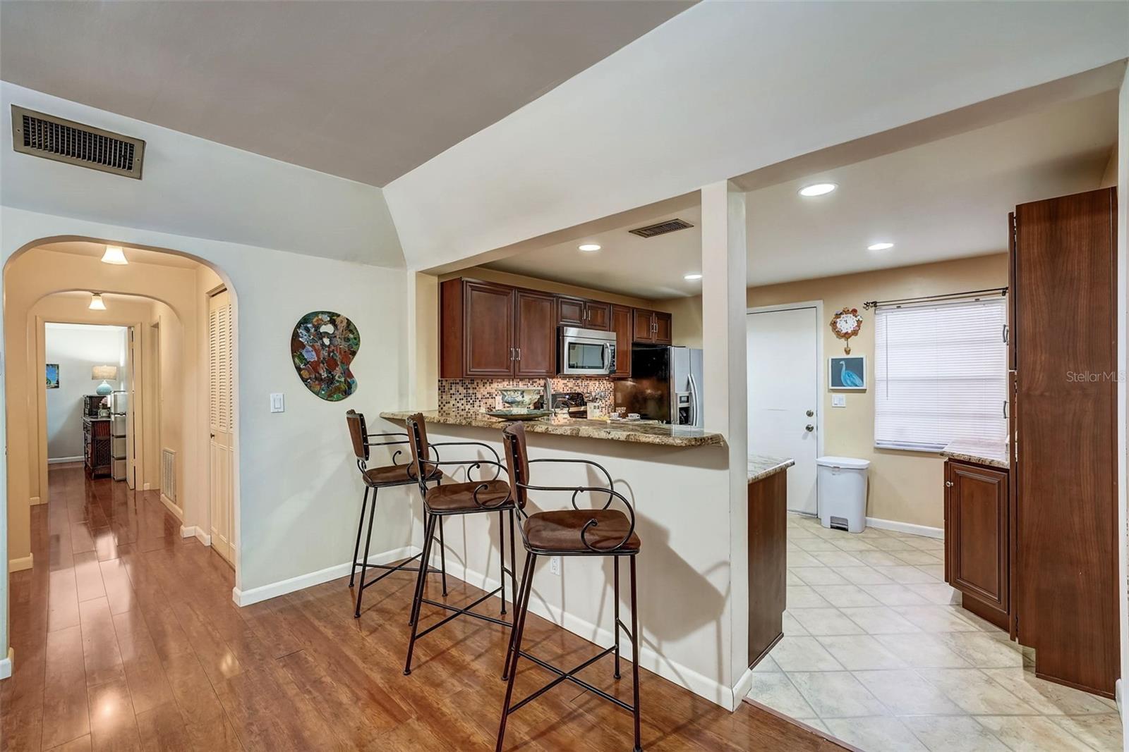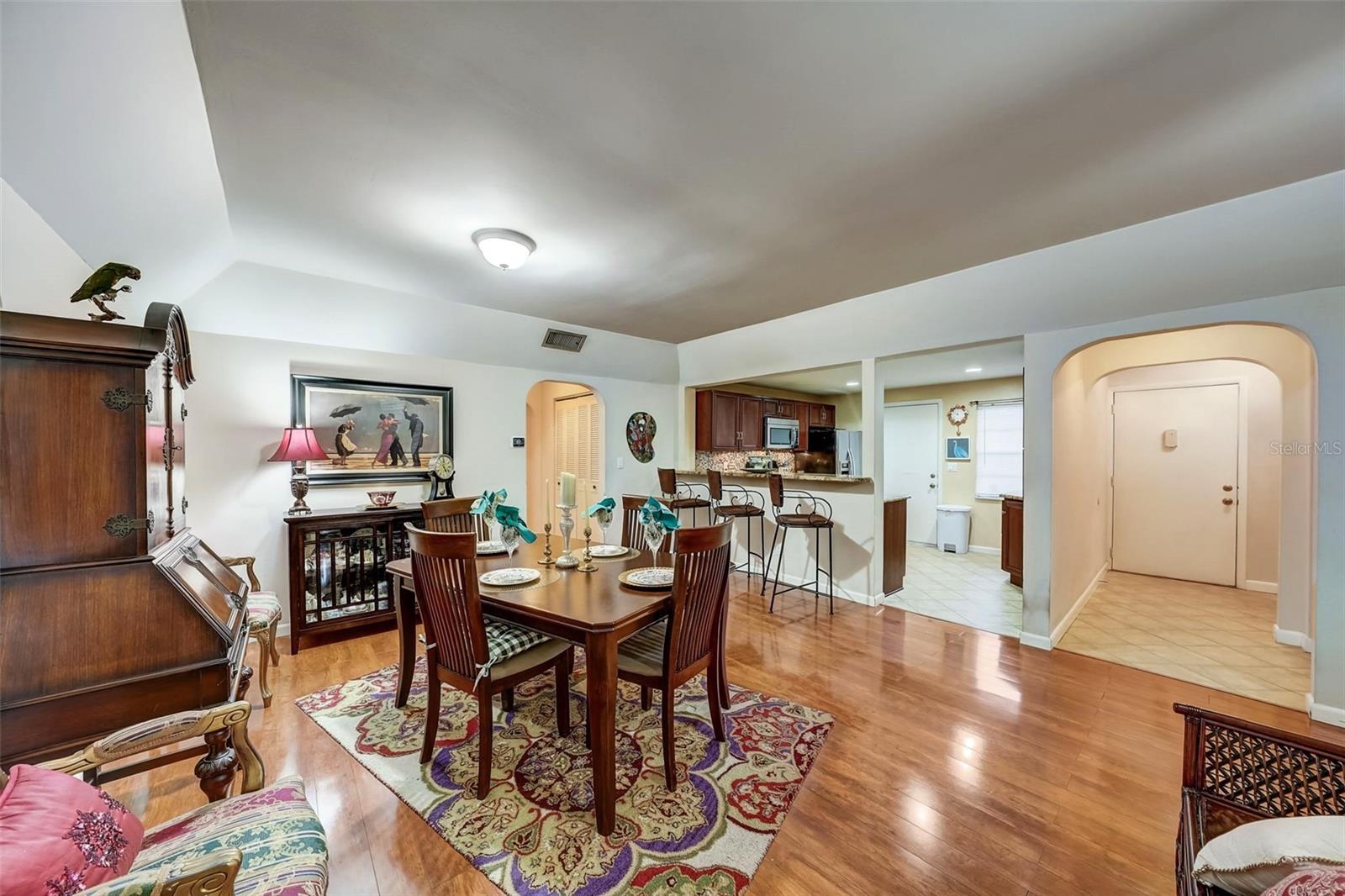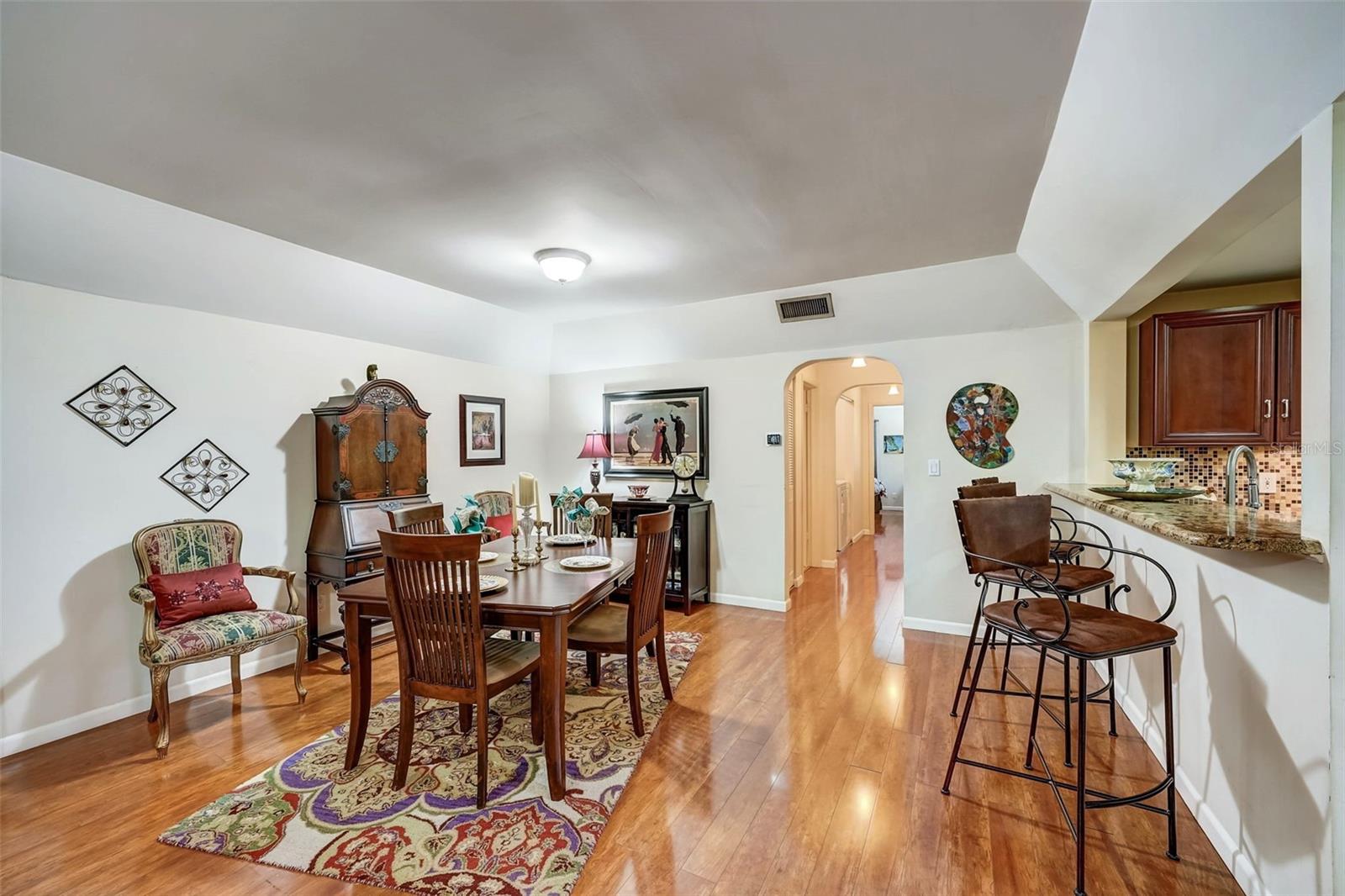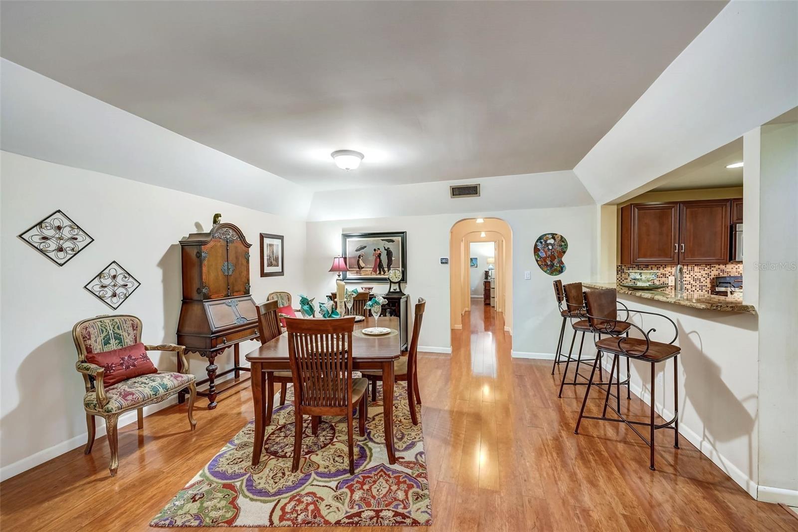 Introducing a rare first-floor Cordova Greens III condo in Seminole, offering a larger living space with numerous upgrades. This is not your typical galley condo. The formal foyer entrance leads to a large open shared living and dining room space with tall, smooth ceilings and curved archways lending to a sense of elegance and spaciousness. The kitchen underwent a transformation to seamlessly integrate it into the open floor plan ambiance. Originally enclosed, the remodel involved removing walls, installing a breakfast bar, incorporating custom wood cabinetry with two closet pantries, additional cabinetry, and appliance drawers. This redesign also created ample space for food preparation and introduced recessed lighting for a modern touch. The star of the kitchen is the double convection oven with special features for slow cooking and bread baking. Gleaming faux wood laminate flooring unifies the primary living spaces, extending seamlessly from the living room to the bedrooms. The primary bedroom is generously sized and accommodates a cozy reading nook. Its en-suite bathroom features updates, including black granite countertops, wide custom wood drawers ideal for towel storage, Italian-style tile flooring, a walk-in closet, and a private water closet with a garden bath. The guest bedroom is also a nice size with double floor to ceiling closet space. The guest bathroom is adorned in earth-tone granite, beautiful green vessel sink, and walk-in shower. Laundry convenience is in the hallway. The vented Florida Room is extra square footage not included in the 1,455 SF, and serves as an office, den, or craft room. The condo provides ample storage with a foyer closet, linen closet, utility closet that holds the water heater and cleaning appliances, and there is an exterior private locked storage on front patio. The Lennox 2.5-ton A/C with UV light was just installed in August of 2023. The condo features a private front patio, one assigned carport space, and ample guest parking right next to the carports. A total of 2 pets, dogs or cats, are allowed per condo. The heated and cooled community pool is shared by Associations I, II, and III; and it is a great place to meet neighbors. The pool area includes a jacuzzi hot tub, outdoor shower, and two bathrooms. This condo is alongside beautiful Bardmoor Blvd, and the wide shoulder of this road provides a great place for power walking and bicycle riding. As a Bardmoor Neighborhood owner, you have the option to join the two nearby country clubs, providing access to golf courses, tennis facilities, and social gatherings. Not too far from the condo is Lake Seminole and the white sands of the Gulf of Mexico. The condo is not in a flood zone, has no land lease, and falls under Storm Evacuation D. The monthly condo fee is $898.43 and covers all utilities except electric, including Spectrum high-speed internet and cable. Gas utility is not available. No age limit; however, Cordova Greens III does limits the number of rented condos. A fresh coat of paint would enhance this already upgraded condo. Check out the virtual tour and contact your Realtor to experience the potential of living the Florida lifestyle in this spacious condo. Ask your Realtor to help you compare the benefits of mostly maintenance free living versus single family home ownership.
