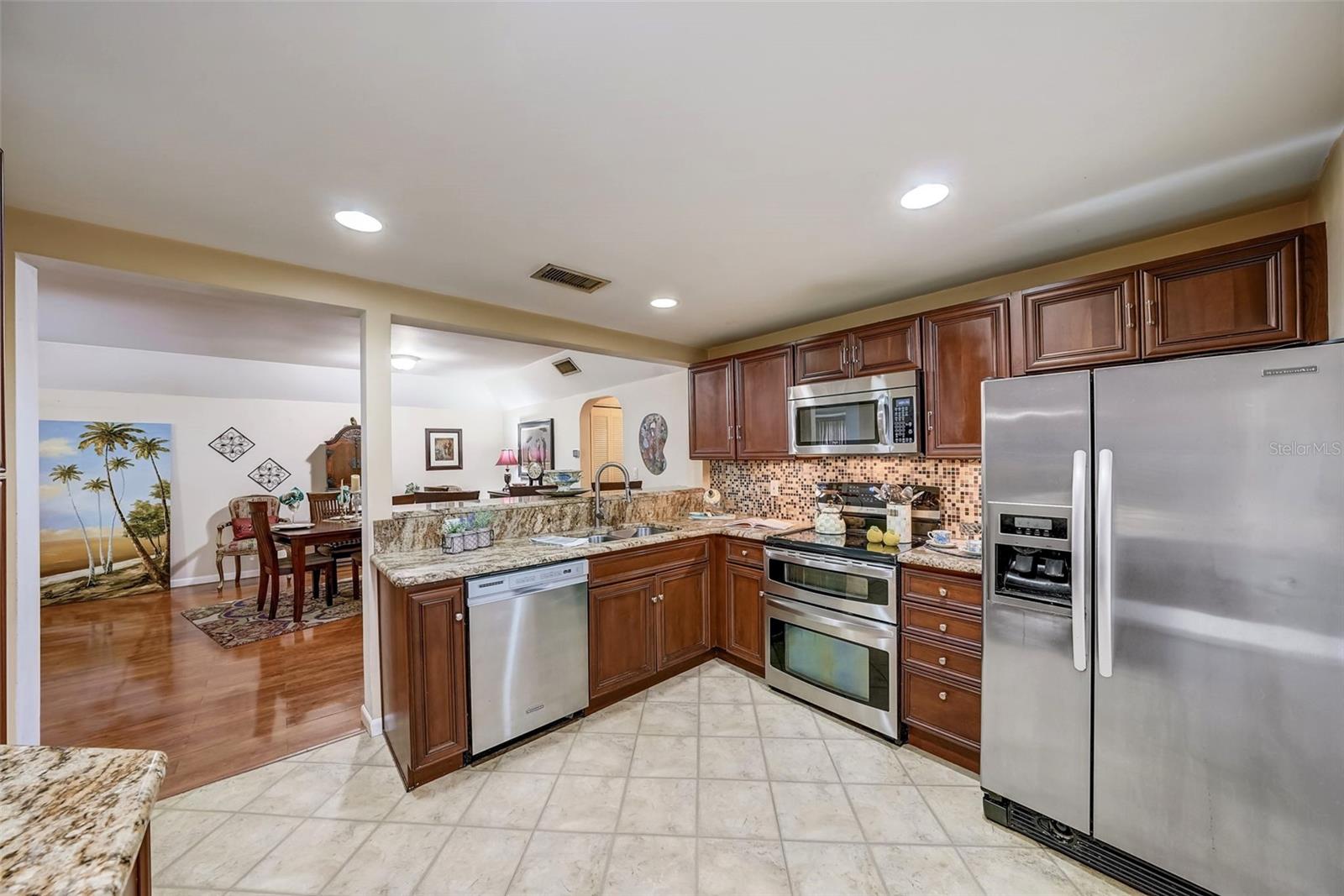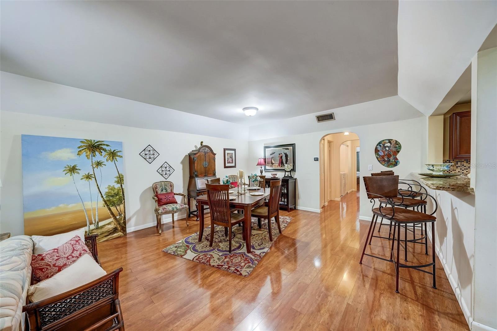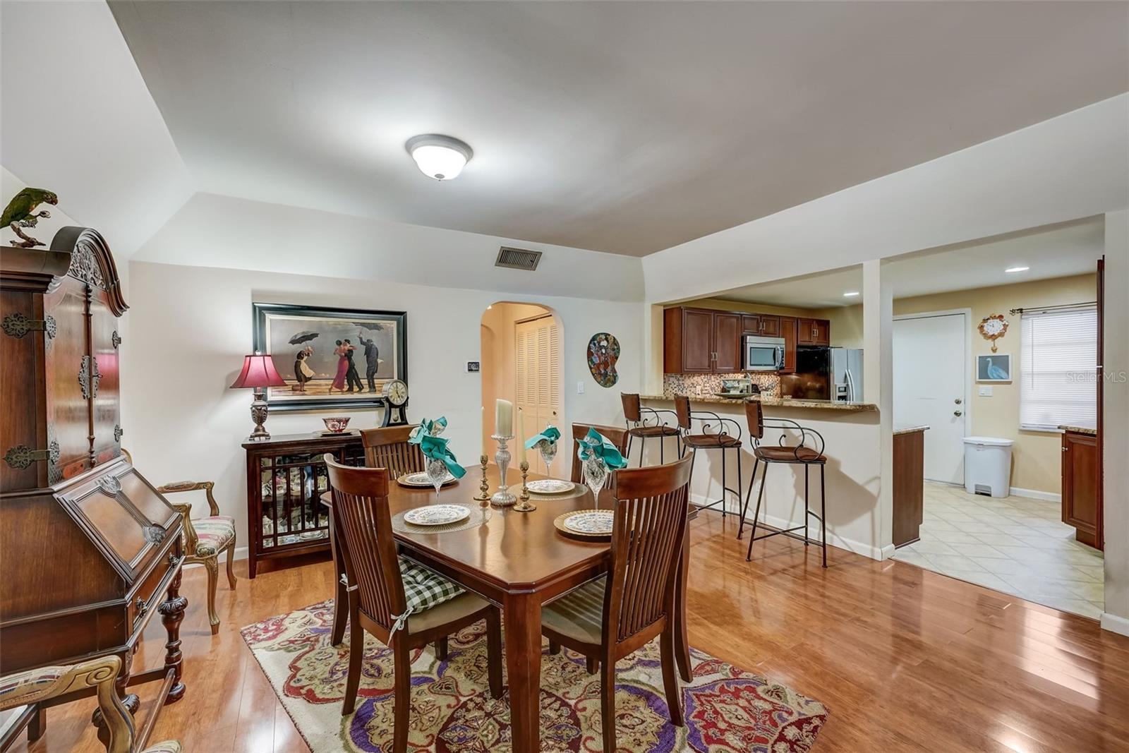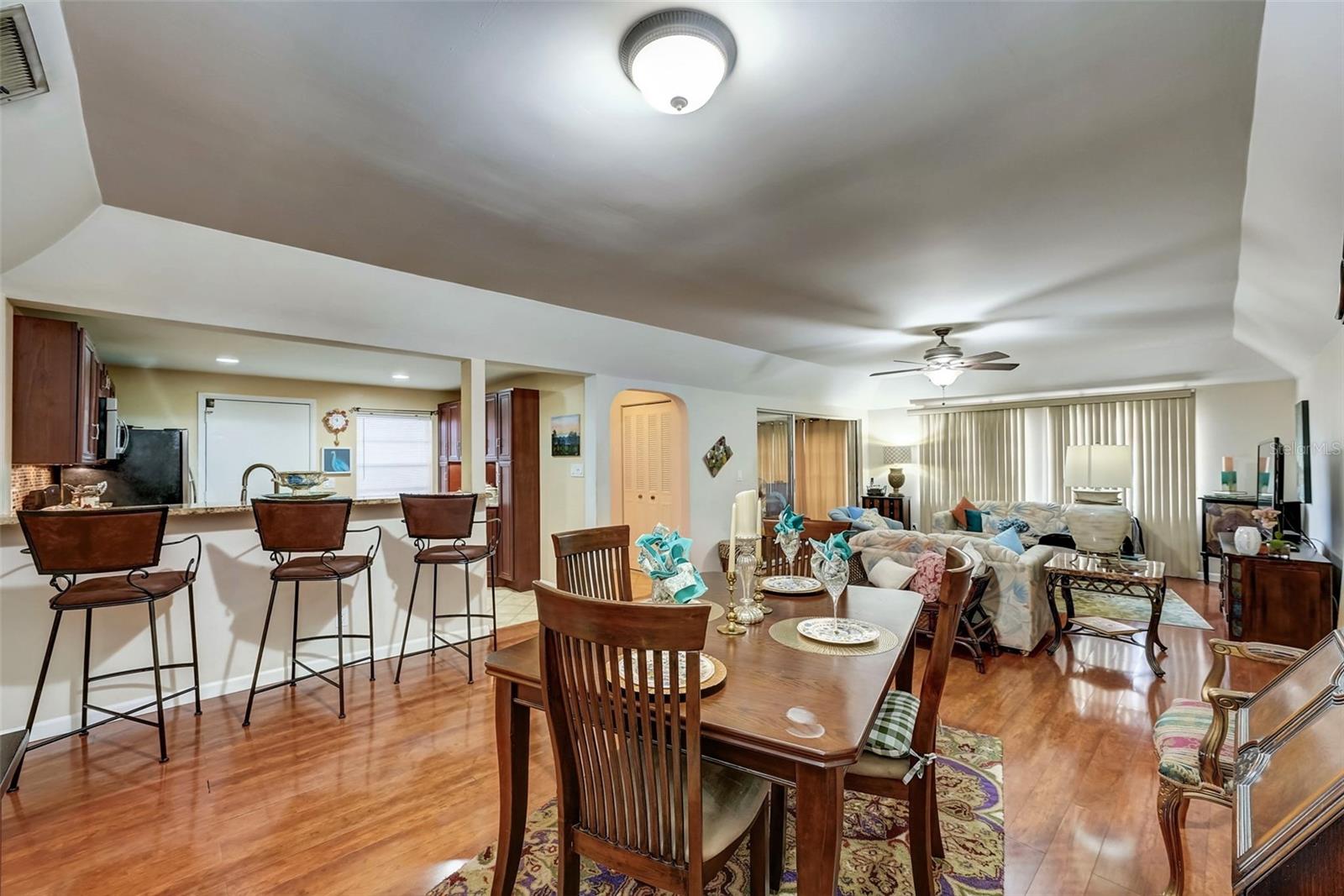 Introducing a rare first-floor Cordova Greens III condo in Seminole, offering a larger living space with numerous upgrades. This is not your typical galley condo. The formal foyer entrance leads to a large open shared living and dining room space with tall, smooth ceilings and curved archways lending to a sense of elegance and spaciousness. The kitchen underwent a transformation to seamlessly integrate it into the open floor plan ambiance. Originally enclosed, the remodel involved removing walls, installing a breakfast bar, incorporating custom wood cabinetry with two closet pantries, additional cabinetry, and appliance drawers. This redesign also created ample space for food preparation and introduced recessed lighting for a modern touch. The star of the kitchen is the double convection oven with special features for slow cooking and bread baking. Gleaming faux wood laminate flooring unifies the primary living spaces, extending seamlessly from the living room to the bedrooms. The primary bedroom is generously sized and accommodates a cozy reading nook. Its en-suite bathroom features updates, including black granite countertops, wide custom wood drawers ideal for towel storage, Italian-style tile flooring, a walk-in closet, and a private water closet with a garden bath. The guest bedroom is also a nice size with double floor to ceiling closet space. The guest bathroom is adorned in earth-tone granite, beautiful green vessel sink, and walk-in shower. Laundry convenience is in the hallway. The vented Florida Room is extra square footage not included in the 1,455 SF, and serves as an office, den, or craft room. The condo provides ample storage with a foyer closet, linen closet, utility closet that holds the water heater and cleaning appliances, and there is an exterior private locked storage on front patio. The Lennox 2.5-ton A/C with UV light was just installed in August of 2023. The condo features a private front patio, one assigned carport space, and ample guest parking right next to the carports. A total of 2 pets, dogs or cats, are allowed per condo. The heated and cooled community pool is shared by Associations I, II, and III; and it is a great place to meet neighbors. The pool area includes a jacuzzi hot tub, outdoor shower, and two bathrooms. This condo is alongside beautiful Bardmoor Blvd, and the wide shoulder of this road provides a great place for power walking and bicycle riding. As a Bardmoor Neighborhood owner, you have the option to join the two nearby country clubs, providing access to golf courses, tennis facilities, and social gatherings. Not too far from the condo is Lake Seminole and the white sands of the Gulf of Mexico. The condo is not in a flood zone, has no land lease, and falls under Storm Evacuation D. The monthly condo fee is $898.43 and covers all utilities except electric, including Spectrum high-speed internet and cable. Gas utility is not available. No age limit; however, Cordova Greens III does limits the number of rented condos. A fresh coat of paint would enhance this already upgraded condo. Check out the virtual tour and contact your Realtor to experience the potential of living the Florida lifestyle in this spacious condo. Ask your Realtor to help you compare the benefits of mostly maintenance free living versus single family home ownership.