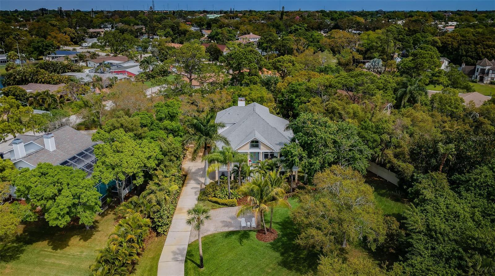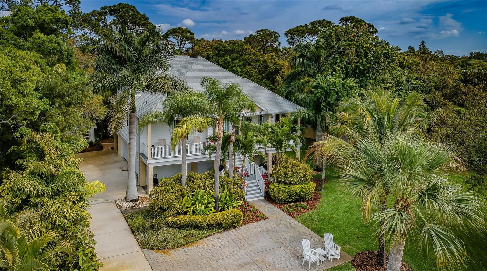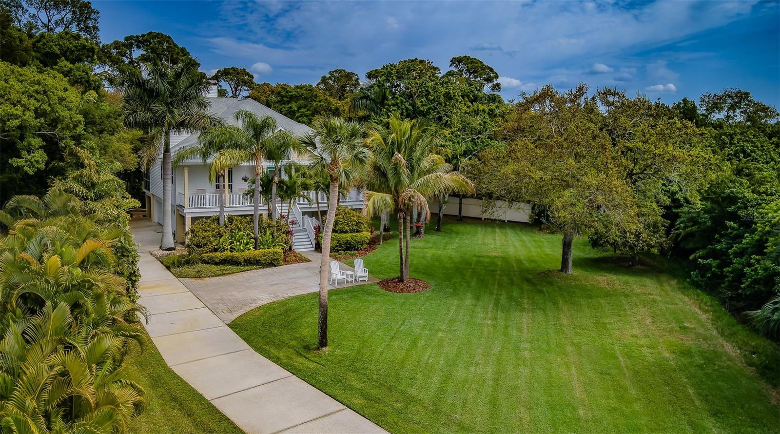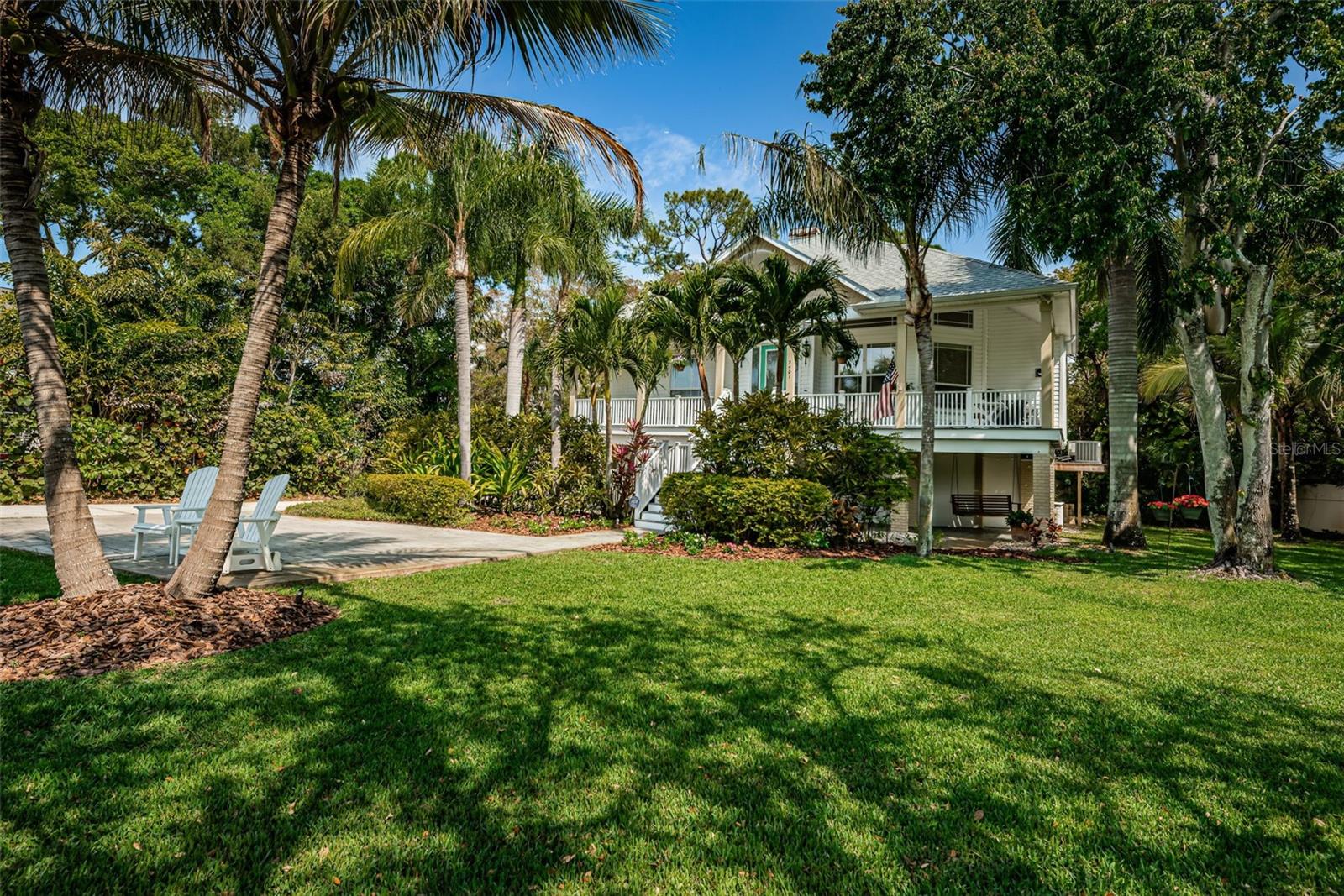 3/4 of an Acre to enjoy on secluded end of street location, tucked away in Seminole, in desirable Oakhurst Shores, minutes from Madeira Beach, Gulf beaches, VA Hospital, shopping, malls, golf course, marina, public and private schools, restaurants & Waterfront American Legion! Raised foundation custom-designed mol 3,000-sqft KEY WEST-style home embodies the “Olde Florida” with details such as wrap-around porches and a majestic staircase leading to an inviting veranda with spectacular sunsets to the west & lovely curb appeal! Uniquely shaped oversized lot bordering on county preserve for added privacy includes a front easement that makes this a ¾ acre lot with long driveway and ample parking - store your boat or RV next to the shed in the side yard. Upon entry, you are greeted by soaring ceilings with crown moldings, multiple open spaces, lots of natural light with big windows and a stunning view over the plantation-style green paradise growing in the backyard. A set of charming French doors open onto a marvelous screened back veranda, bringing the tropical environment indoors - an oasis of tranquility. Kitchen with GAS COOKING, the great room with gas fireplace & dining room are one space, delineated by individual functional areas & ceiling heights. 2 spacious guest bedrooms on the living area level feature their own bathrooms. The 3rd floor double-door entry, luxurious 600-sqft master retreat offers a wood-burning fireplace, plenty of room for relaxation, an office corner - lounging area, a soaking tub and separate shower in the master bath, water filtration system in sinks, plus a multi-room walk-in closet for every woman to fall in love with! The ground-level 750-sqft air-conditioned “MANCAVE” with SEPARATE ENTRANCE, bar, sink, refrigerator, mounted TV, and bathroom keeps the peace in the home! Multiple storage, garages, a covered back porch with gas hook-up for barbecue grill and/or Jacuzzi, and a gas fire-pit in the backyard for large gatherings & parties make this property even more desirable. Plenty of space to build your own custom pool with lanai! Other features include: NEW SHINGLE ROOF in 2019 and double TRANE A/C's in 2019, new Mini Split A/C unit for downstairs party room in 2020, water softener, central vacuum, aluminum HURRICANE SHUTTERS for front windows, security system with sensor lights, invisible dog fence, sprinklers on well (Rainbird Timer), extensive landscape lighting on timer, and various delightful fruit trees, including Carrie Mangos, Meyer's Lemons and Figs. NATURAL GAS saves energy using the tankless hot water heater with spare tank in laundry room off the kitchen; Survey available. Neighborhood of Oakhurst Shores and Seminole Estates feature all underground utilities. Hurry, come and see this unique and move-in ready beauty today - then make it your own!