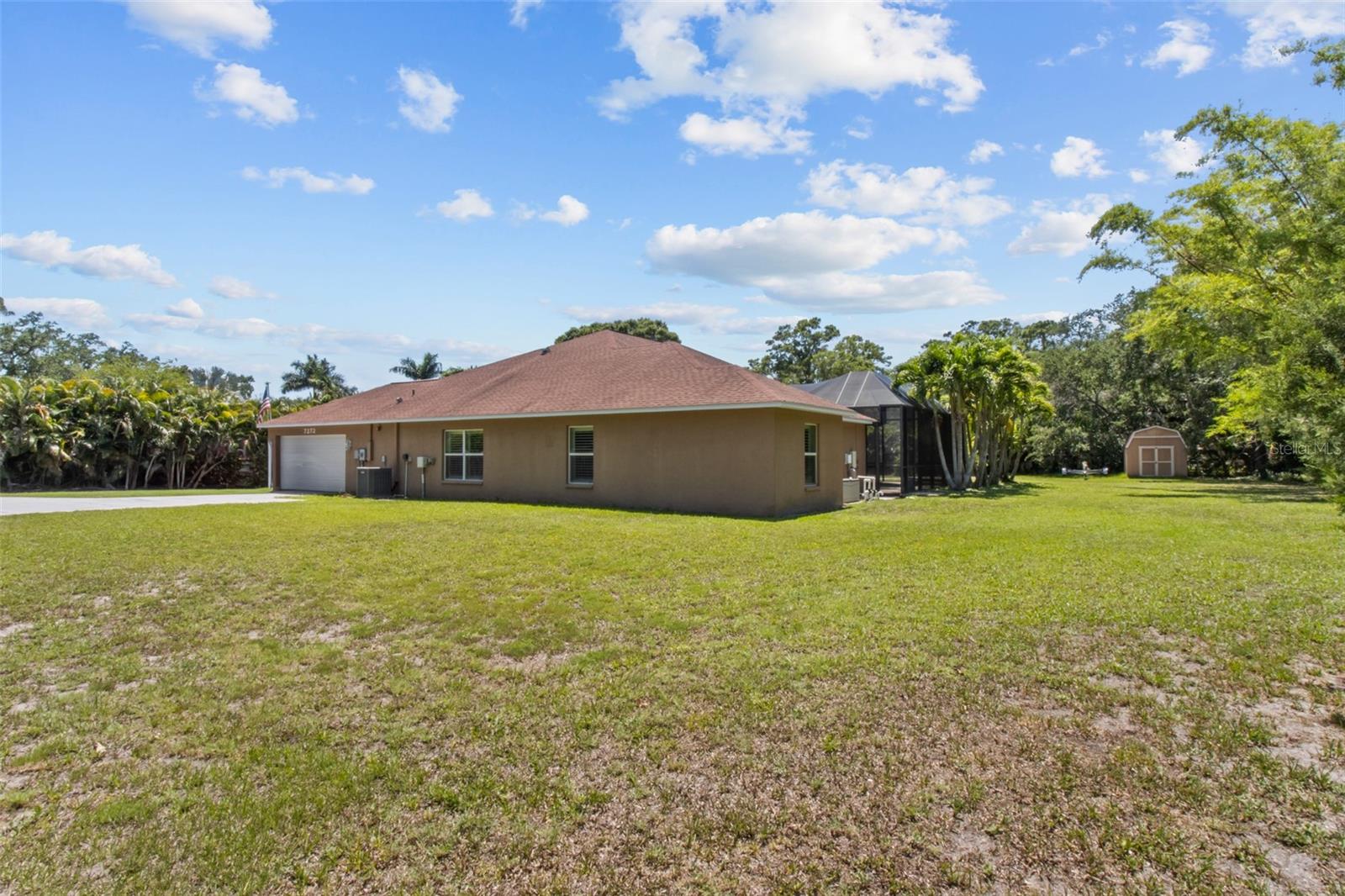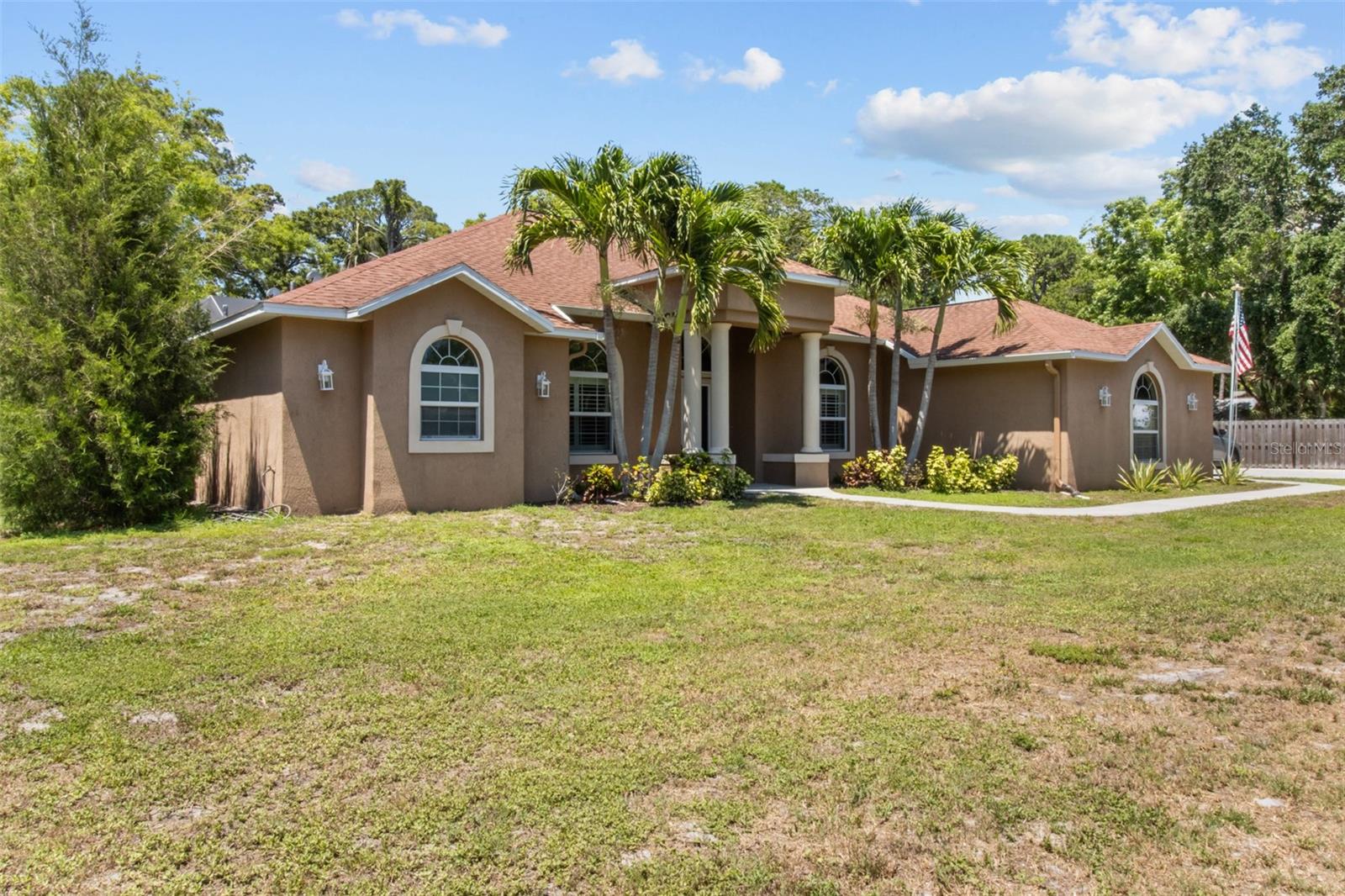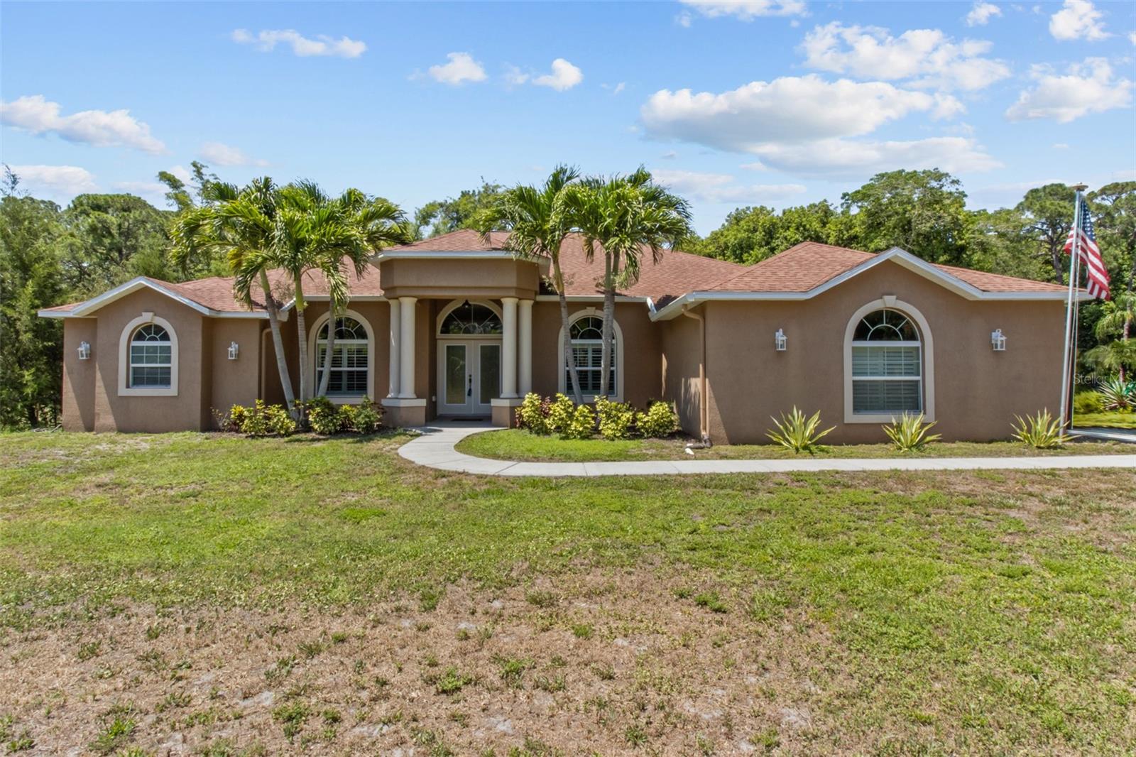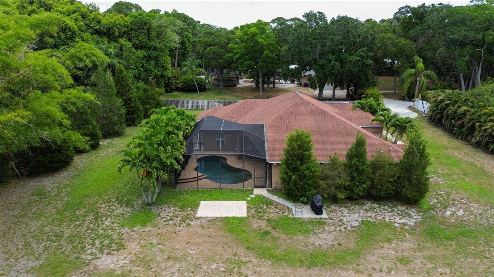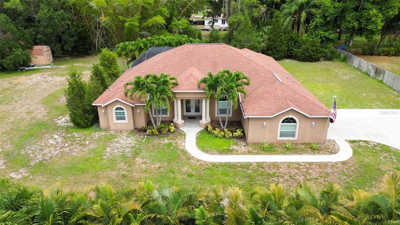 One or more photo(s) has been virtually staged. WELCOME TO YOUR OWN PRIVATE OASIS! This STUNNING single family home, built in 2013, is nestled on just under 1 acre of land, providing plenty of space and privacy. With 4 bedrooms and 2 baths, this is the perfect property with plenty of room for a growing family or for hosting guests. This home offers a spacious and open floor plan, a separate family room and a dedicated home office. The bonus media room can also serve as a 5th bedroom, providing flexibility for various needs. The master suite is a true retreat, with a spacious bedroom, 2 walk-in closets, and a luxurious en-suite bathroom with a soaking tub and separate shower. The three additional bedrooms are generously sized and share a well-appointed bathroom which can has the ability to be used as a pool bath. The home office is a quiet and productive space, with built-in shelving and plenty of natural light. This property boasts high ceilings throughout, hurricane rated impact windows & doors and wood shutters. The outdoor space is equally impressive, with a saltwater pool and birdcage, surrounded by lush landscaping and tropical palms. This property is a true sanctuary, offering a secluded and peaceful setting while still being just a 5 minute drive to the gulf beaches. Whether you're looking to relax by the pool or explore the nearby coastal attractions, this home offers the best of both worlds. The nearly 1-acre lot is zoned for horses, making it an ideal for equestrian enthusiasts. Alternatively, the expansive land could also accommodate a pickle ball, basketball, or tennis court for those who enjoy outdoor sports and activities. In addition to the stunning amenities, the property offers privacy with private deeded road access. This home truly offers a perfect blend of luxury, comfort, and outdoor enjoyment. The saltwater pool is low-maintenance and perfect for cooling off on hot Florida days. The birdcage keeps the pool area free from pests, allowing for uninterrupted relaxation.The property is surrounded by mature landscaping, providing privacy and a serene atmosphere. Additionally, with NO FLOOD INSURANCE required, you can have peace of mind knowing that your investment is protected. Located in a sought-after neighborhood, this property offers convenience and comfort.....Don't miss the opportunity to make this incredible property your own. Schedule a showing today and experience the beauty and tranquility that this home has to offer.