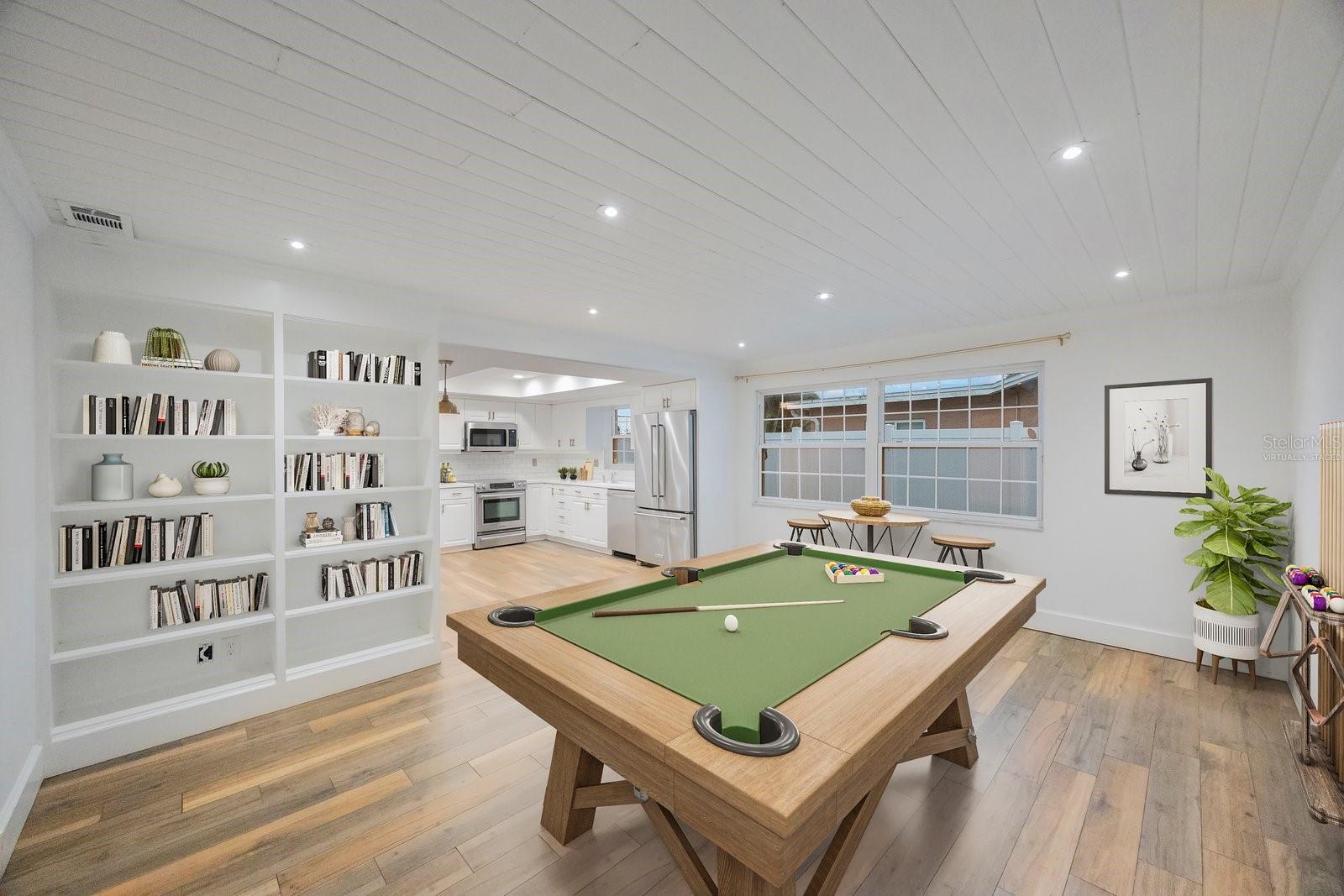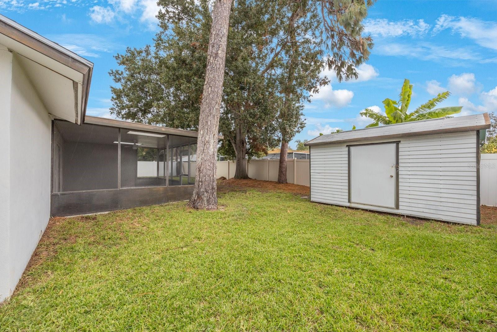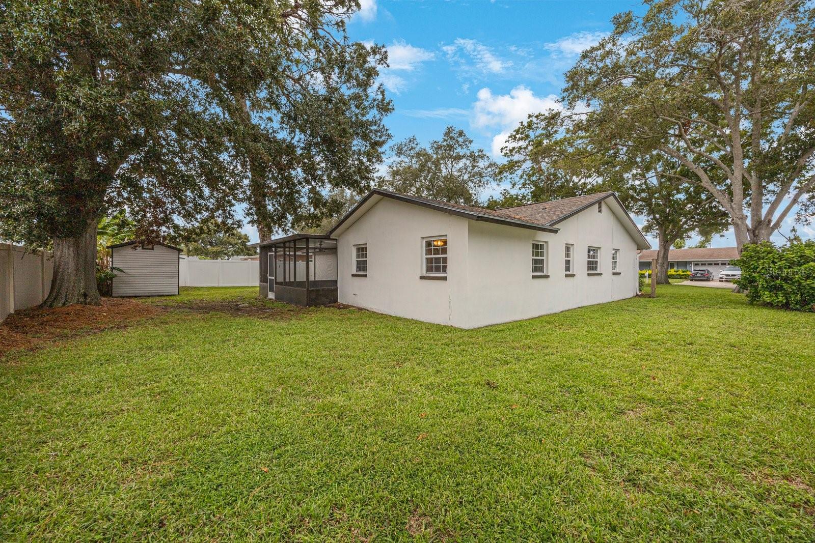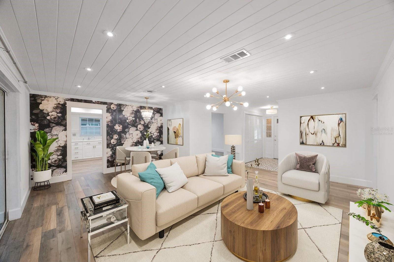 One or more photo(s) has been virtually staged. Price Reduced! A beautiful 4BR/2BA, move-in ready home in Seminole; top-rated schools all walk-able/bike-able and minutes from shopping, eateries, and gorgeous Gulf Beaches. Upon entering, you will be captivated by the large bright living/dining combo with tile flooring and tongue-and-groove ceilings throughout. The kitchen features light cabinets, solid surface counter tops and a new stainless microwave and dishwasher with a range and refrigerator to match. The front den/family room is ideal for entertaining with built-in shelving. All bedrooms are large with brand new carpet. The master bedroom is large with a master bath featuring a walk-in shower. The guest bath with tub/shower combo has been completely updated and features the tongue-and-groove ceiling as well. Outside, the screened lanai features two skylights and a ceiling fan to enjoy the Florida weather. The 2-car garage has a washer and dryer, ready to go. This home features double-paned windows, new roof (2022), crown molding, and a storage shed with electric. This unincorporated Pinellas County property is not in a flood zone. Don't miss out on a rare 4BR/2BA, block home in the heart of Seminole. Make an appointment to see it today!