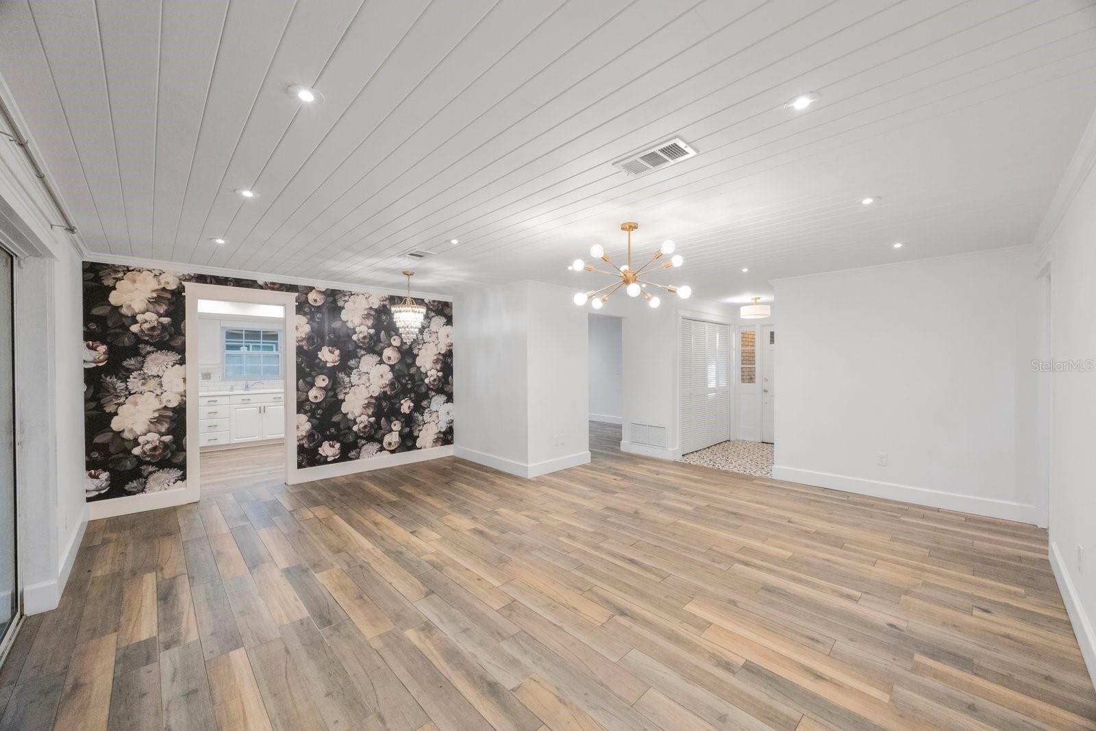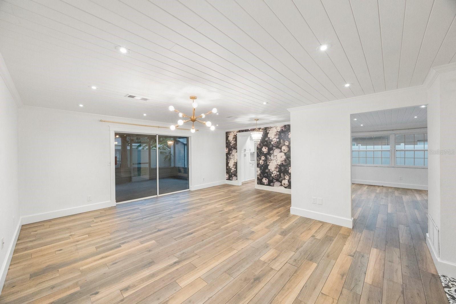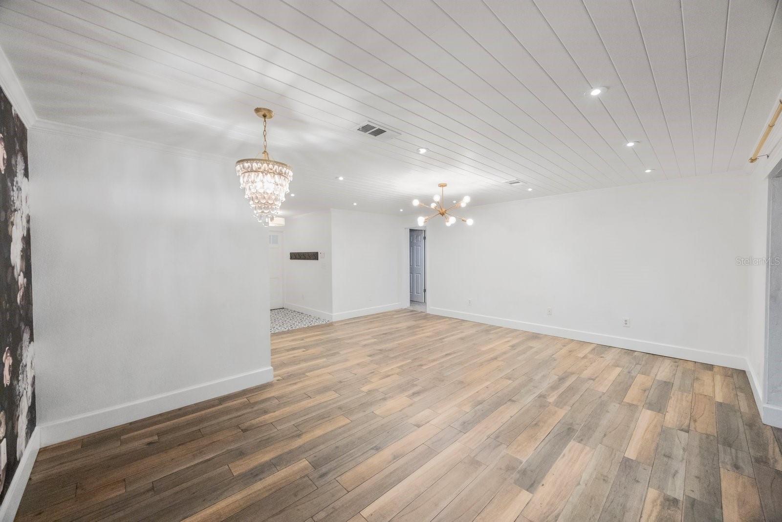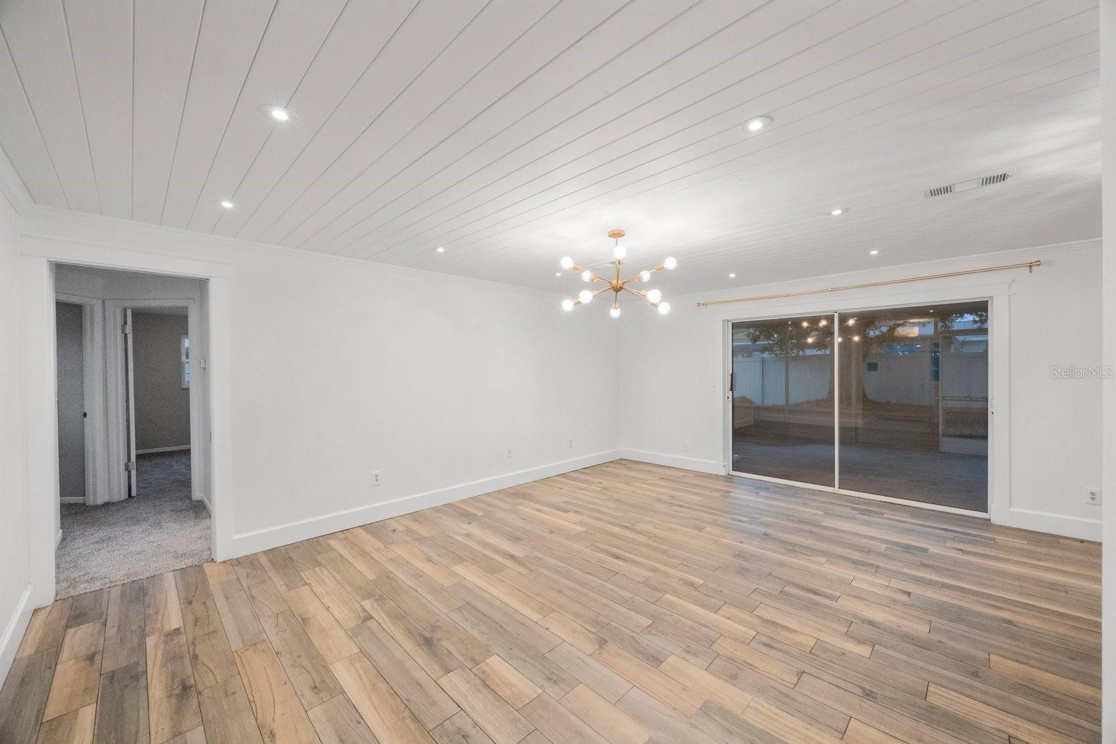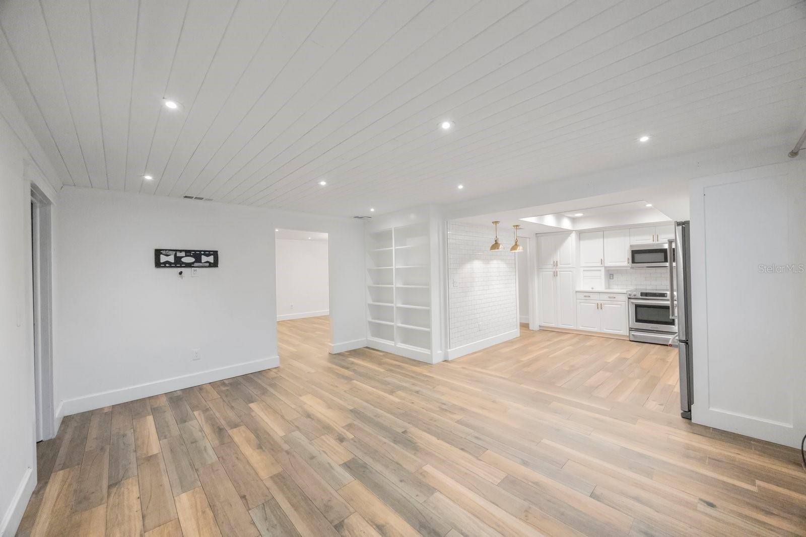 One or more photo(s) has been virtually staged. Price Reduced! A beautiful 4BR/2BA, move-in ready home in Seminole; top-rated schools all walk-able/bike-able and minutes from shopping, eateries, and gorgeous Gulf Beaches. Upon entering, you will be captivated by the large bright living/dining combo with tile flooring and tongue-and-groove ceilings throughout. The kitchen features light cabinets, solid surface counter tops and a new stainless microwave and dishwasher with a range and refrigerator to match. The front den/family room is ideal for entertaining with built-in shelving. All bedrooms are large with brand new carpet. The master bedroom is large with a master bath featuring a walk-in shower. The guest bath with tub/shower combo has been completely updated and features the tongue-and-groove ceiling as well. Outside, the screened lanai features two skylights and a ceiling fan to enjoy the Florida weather. The 2-car garage has a washer and dryer, ready to go. This home features double-paned windows, new roof (2022), crown molding, and a storage shed with electric. This unincorporated Pinellas County property is not in a flood zone. Don't miss out on a rare 4BR/2BA, block home in the heart of Seminole. Make an appointment to see it today!