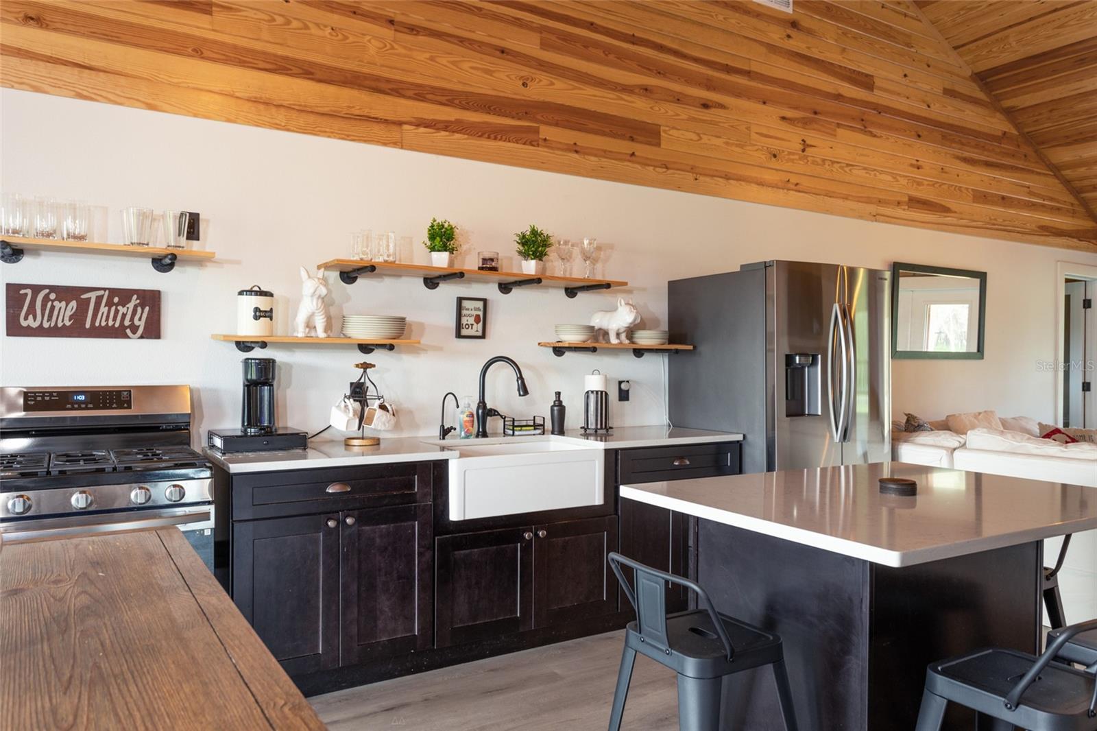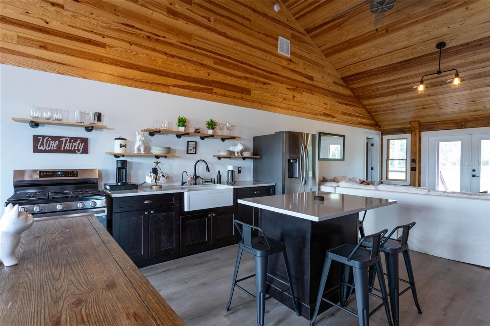 Peace, Tranquility and Nature. This is the perfect location to raise a family or spend your days enjoying the country. Five acres of cleared land which is also fully fenced on Lower Lake Louise. Enjoy your modern crafted log cabin home built in 2022. The interior of the home has vinyl flooring throughout, 18 foot ceilings and plenty of room to enjoy family gatherings. A gas fireplace is perfect for those cool winter nights. The kitchen has new Samsung appliances, a gas stove, large kitchen cabinets and a kitchen Island with Marble countertops and counters. The front and back porches are Trex decking with plenty of room to sit and enjoy the lake views or watch the children play. The house and garage have Anderson Impact low energy gray glass windows, Fiberglass impact low E exterior doors, a metal roof and spray foam insulation. The garage is a two car 24x24 air conditioned space with a epoxy floor finish that can store your collectible cars, can be used as a workshop or as a separate craft room. The garage doors are Clopay impact insulated doors with WiFi remote access. A propane tank and gas line are for the generator, outdoor grill, indoor fire place, stove and dryer. This property also includes the right to have a small secondary trailer on-site that can tap into the shared well and septic system. Enjoy your day fishing and you can also add a dock in the future to store your boat and Kayaks. Only a short drive to Crescent City, Bunnell and just 45 minutes to Flagler Beach. Visit Orlando for the day which is 60 minutes away. Call me today to view this Seville country estate.