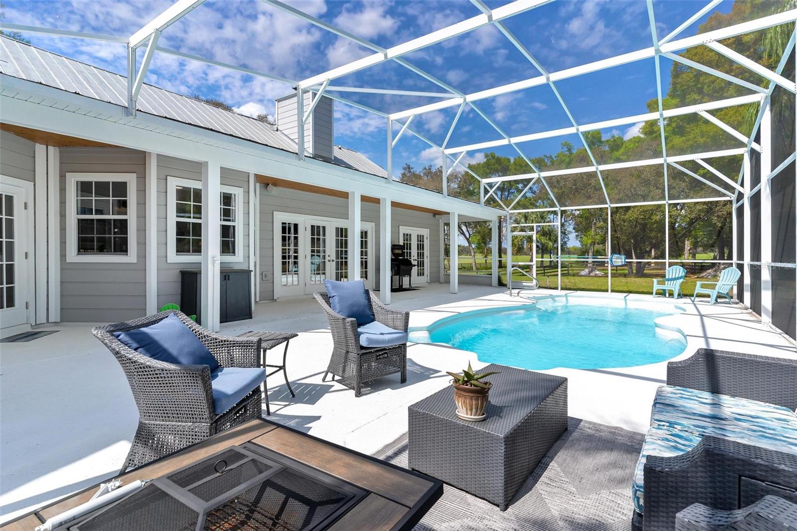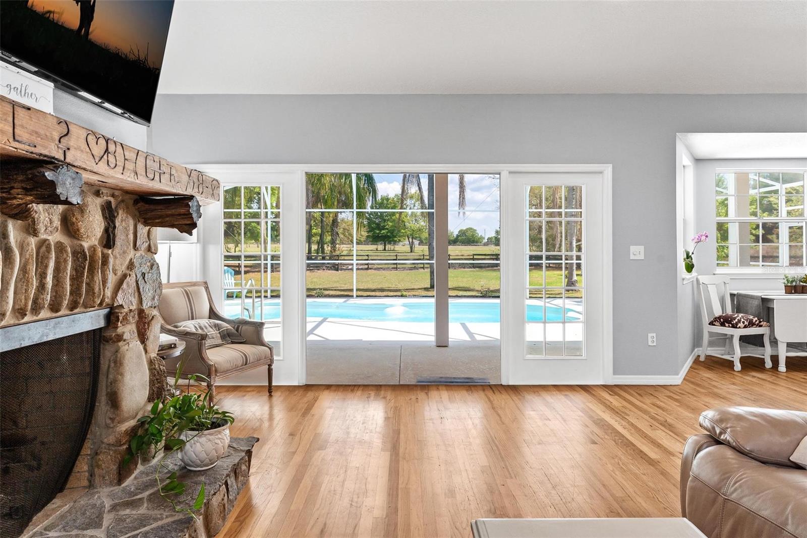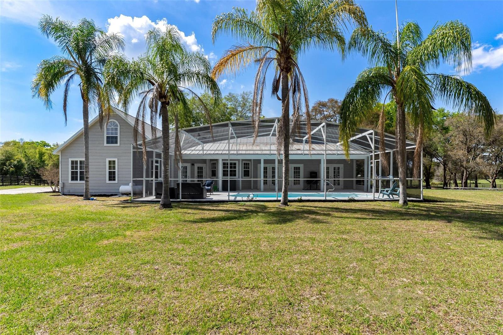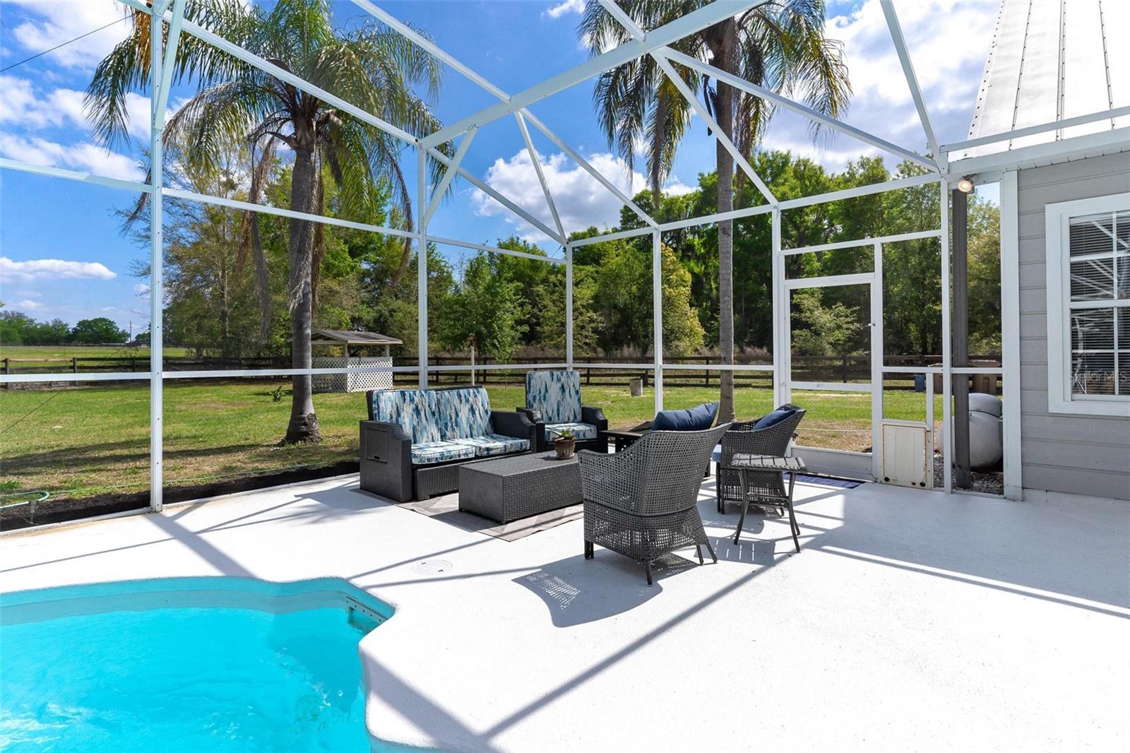 COUNTRY LIVING ON 7.6 ACRES PRIVATE AND SECLUDED-3 bedroom 2 bath split plan home with SCREENED IN POOL OVERLOOKING THE COUNTRYSIDE. Custom kitchen with GRANITE COUNTER TOPS, tons of cabinet space, gas stove, and breakfast nook area. Great room with wood floors, wood burning fireplace/gas starter, with French doors leading out to the pool lanai area. Primary bedroom leading out to pool area with a large en-suite bathroom with walk in shower, garden tub, and double sinks. 2 additional oversized bedrooms with newly remodeled guest bath with huge walk in shower 7X5 with double shower heads. Inside laundry and mud room. Oversized double car garage with side entry. Home is situated on 7.6 acres fenced and cross fenced with several pastures. BARN WITH 4 STALLS 12X11 WITH STORAGE AREA 36x24 AND/or TACK ROOM. PROPERTY IS SURROUNDED BY MAJESTIC OAKS WITH COUNTRY VIEWS. EASY COMMUTE TO ORLANDO AREA CLOSE TO HWY 46 AND THE 429. BRING YOUR FAMILY AND HORSES AND ENJOY THE PEACE AND QUIET OF COUNTRY LIVING.