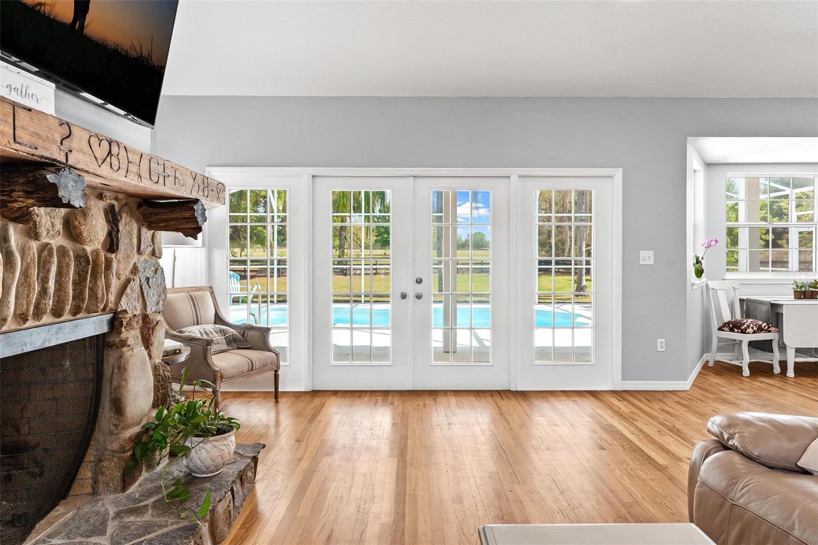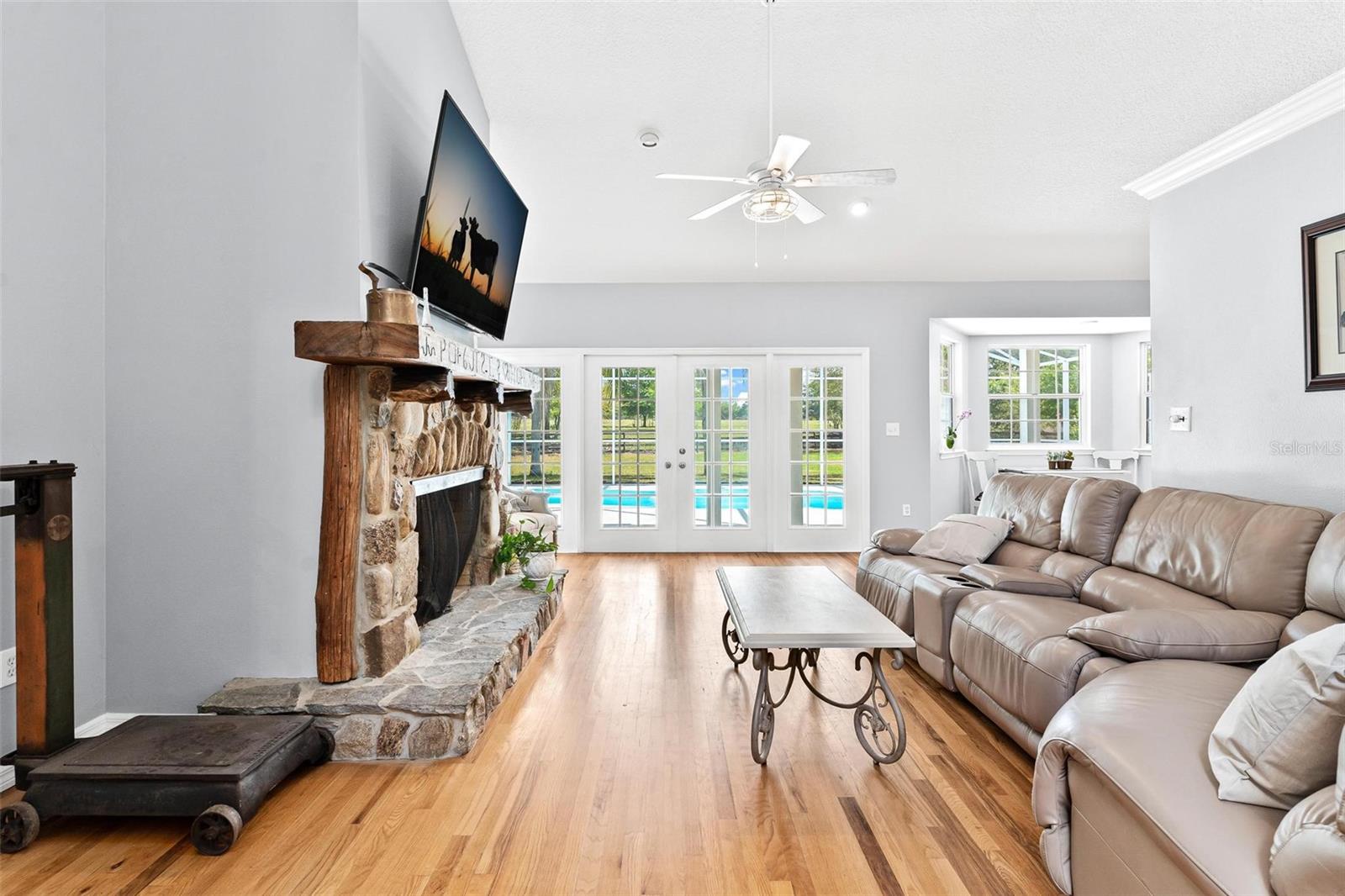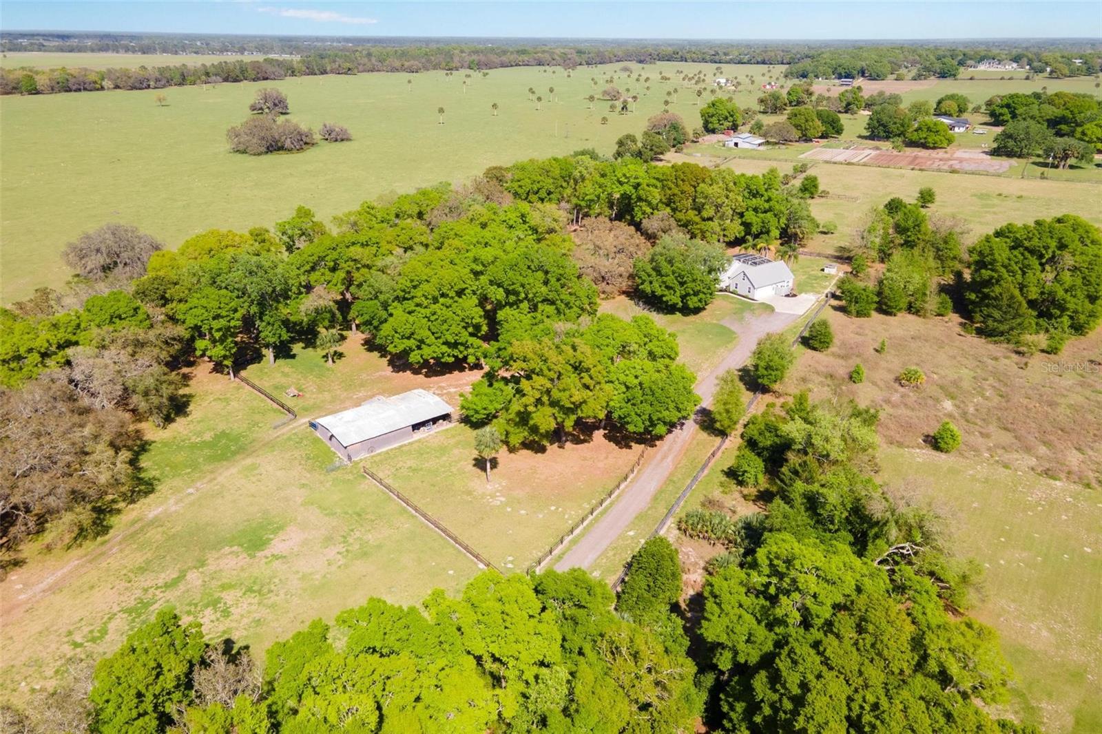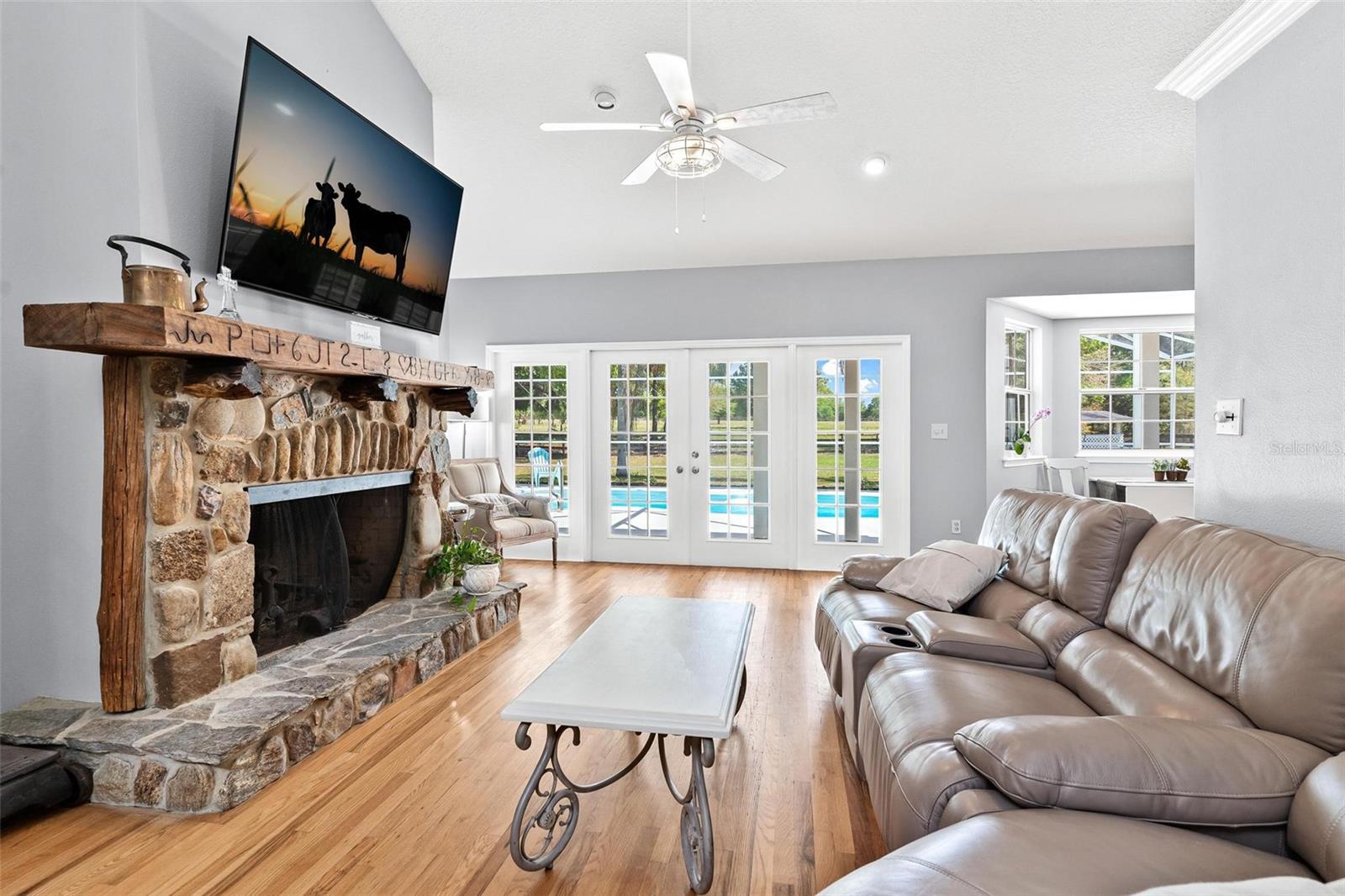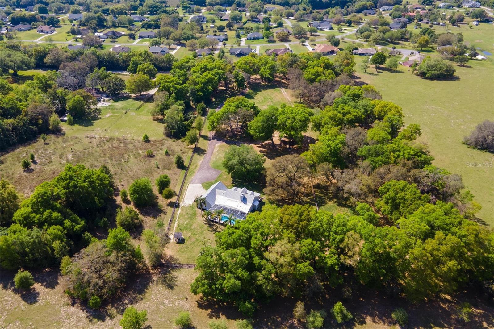 COUNTRY LIVING ON 7.6 ACRES PRIVATE AND SECLUDED-3 bedroom 2 bath split plan home with SCREENED IN POOL OVERLOOKING THE COUNTRYSIDE. Custom kitchen with GRANITE COUNTER TOPS, tons of cabinet space, gas stove, and breakfast nook area. Great room with wood floors, wood burning fireplace/gas starter, with French doors leading out to the pool lanai area. Primary bedroom leading out to pool area with a large en-suite bathroom with walk in shower, garden tub, and double sinks. 2 additional oversized bedrooms with newly remodeled guest bath with huge walk in shower 7X5 with double shower heads. Inside laundry and mud room. Oversized double car garage with side entry. Home is situated on 7.6 acres fenced and cross fenced with several pastures. BARN WITH 4 STALLS 12X11 WITH STORAGE AREA 36x24 AND/or TACK ROOM. PROPERTY IS SURROUNDED BY MAJESTIC OAKS WITH COUNTRY VIEWS. EASY COMMUTE TO ORLANDO AREA CLOSE TO HWY 46 AND THE 429. BRING YOUR FAMILY AND HORSES AND ENJOY THE PEACE AND QUIET OF COUNTRY LIVING.