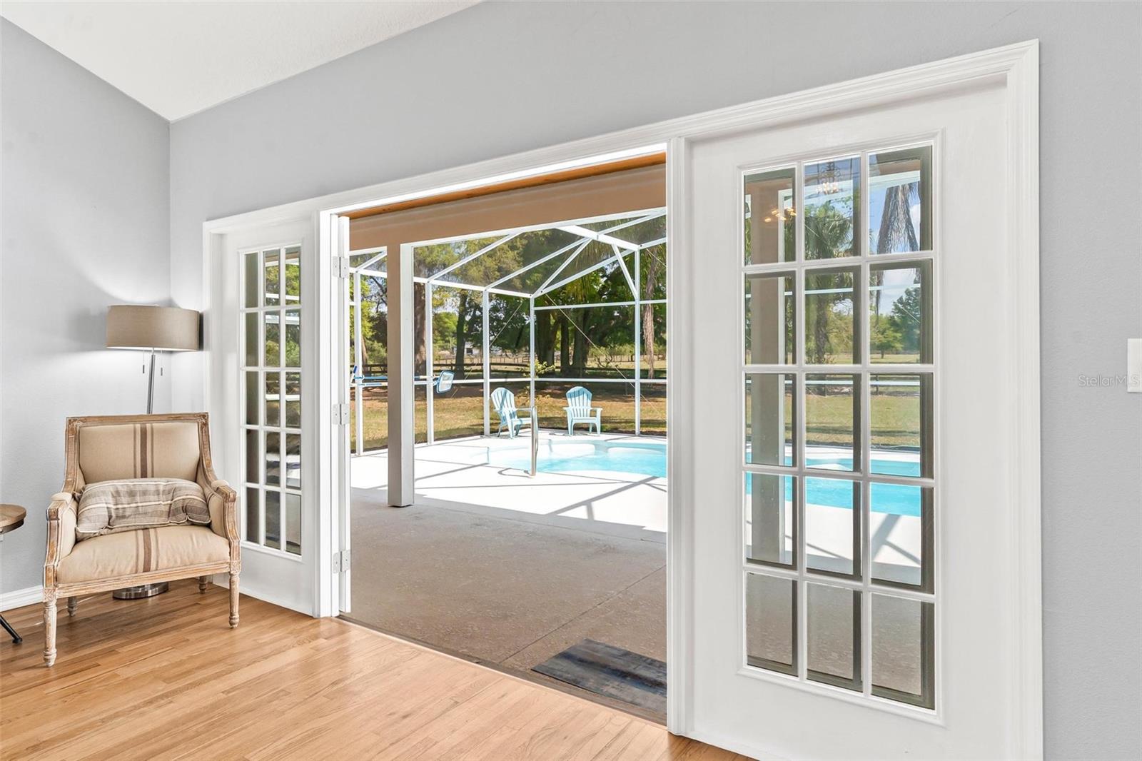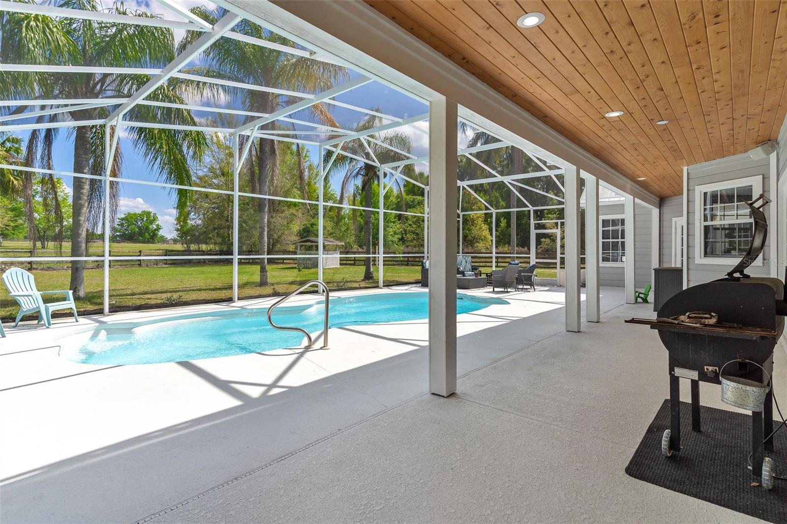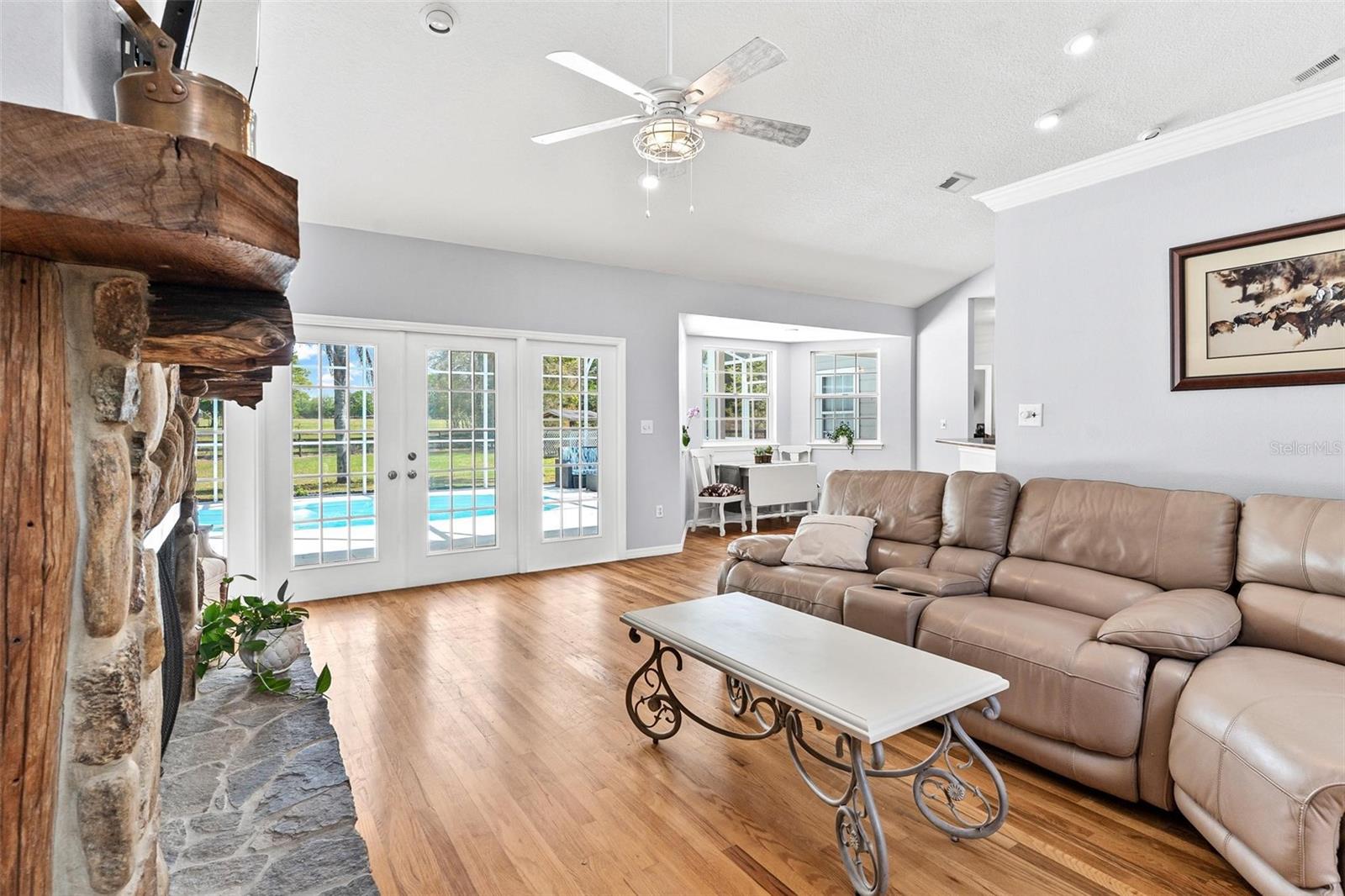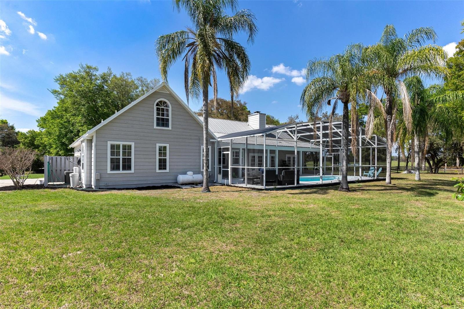 COUNTRY LIVING ON 7.6 ACRES PRIVATE AND SECLUDED-3 bedroom 2 bath split plan home with SCREENED IN POOL OVERLOOKING THE COUNTRYSIDE. Custom kitchen with GRANITE COUNTER TOPS, tons of cabinet space, gas stove, and breakfast nook area. Great room with wood floors, wood burning fireplace/gas starter, with French doors leading out to the pool lanai area. Primary bedroom leading out to pool area with a large en-suite bathroom with walk in shower, garden tub, and double sinks. 2 additional oversized bedrooms with newly remodeled guest bath with huge walk in shower 7X5 with double shower heads. Inside laundry and mud room. Oversized double car garage with side entry. Home is situated on 7.6 acres fenced and cross fenced with several pastures. BARN WITH 4 STALLS 12X11 WITH STORAGE AREA 36x24 AND/or TACK ROOM. PROPERTY IS SURROUNDED BY MAJESTIC OAKS WITH COUNTRY VIEWS. EASY COMMUTE TO ORLANDO AREA CLOSE TO HWY 46 AND THE 429. BRING YOUR FAMILY AND HORSES AND ENJOY THE PEACE AND QUIET OF COUNTRY LIVING.