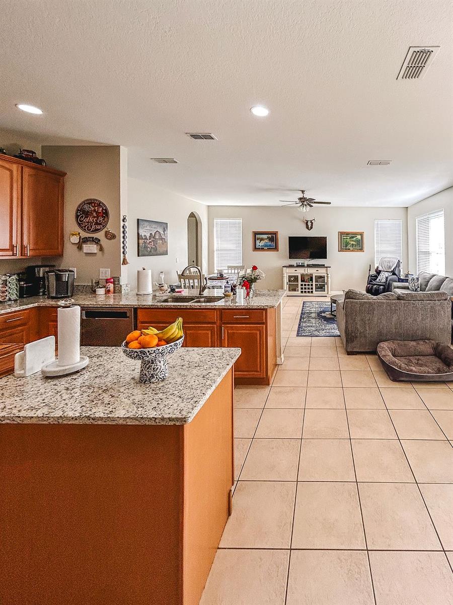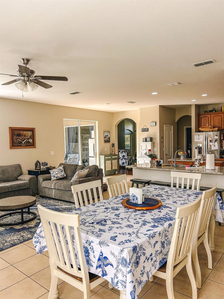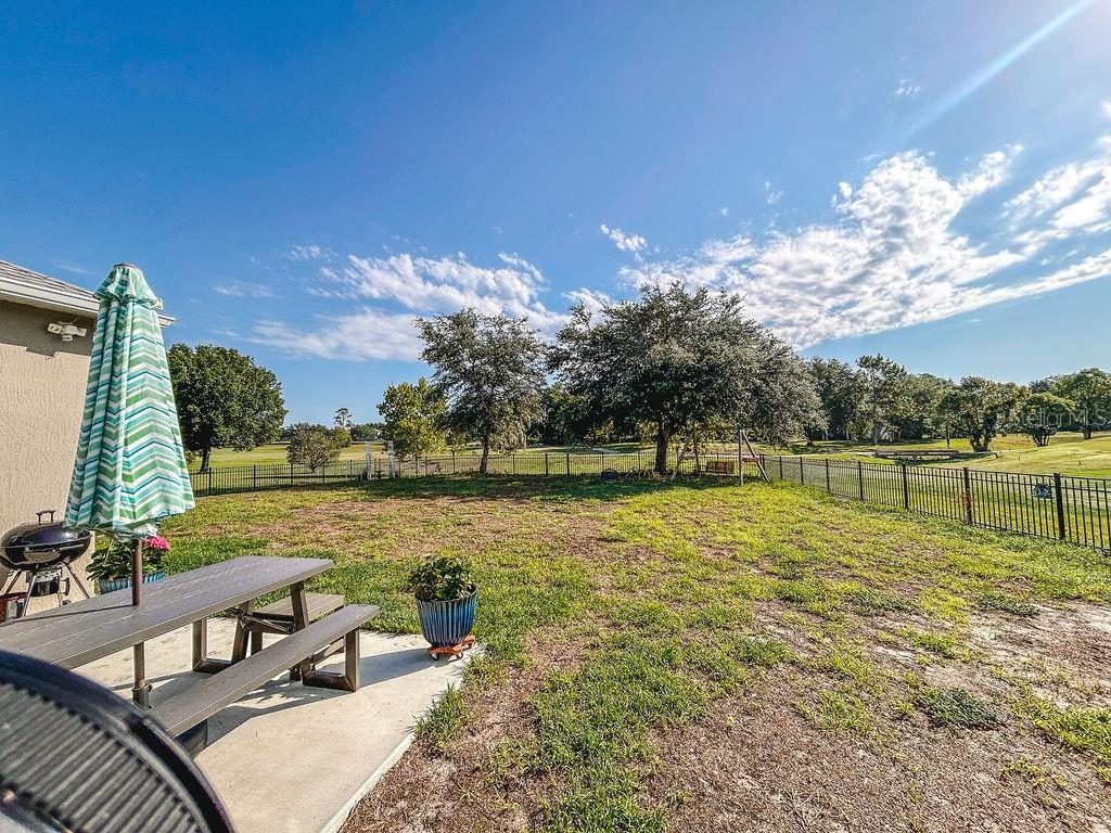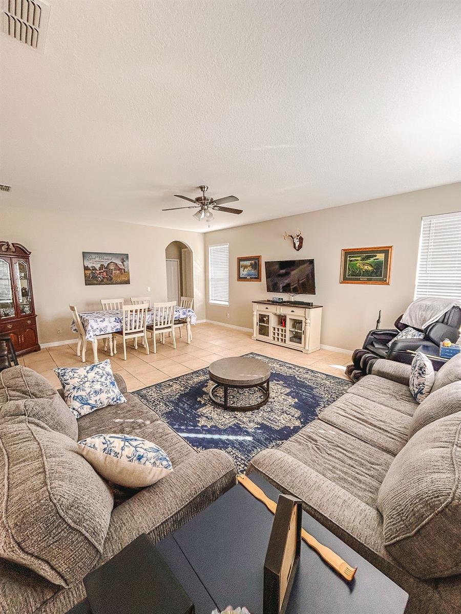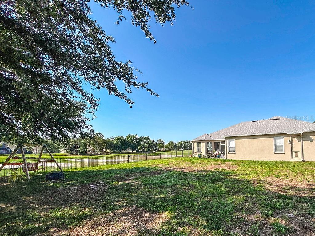 Nestled within the serene and gated community of Sorrento Springs, 33818 Venice Lane offers a spacious 4-bedroom, 3-bathroom home with 3,035 sq ft of living space on a 0.65-acre lot. Built in 2005, this residence boasts a three-way split floor plan, high vaulted ceilings, and an open-concept design, ensuring both privacy and a sense of openness. The gourmet kitchen is a chef's delight, featuring new granite countertops, 42" crown-molded cabinetry, a central island, and a breakfast bar that seamlessly flows into the family room. Sliding glass doors lead to a covered and screened lanai, perfect for relaxing while overlooking the 5th hole green and 6th tee of the Eagle Dunes Golf Course. The expansive backyard is fully fenced and includes a paver patio, ideal for outdoor entertaining. Additional highlights include a separate den/office, formal living and dining rooms, a three-car garage, and recent updates such as a 2021 roof and a 2019 HVAC system. Residents of Sorrento Springs enjoy a host of amenities, including a community pool, clubhouse, fitness center, tennis courts, playground, and engaging monthly events like food trucks and holiday golf-cart parades. Conveniently located just a short drive from Mount Dora and Downtown Eustis, and with easy access to the 429, this home offers both tranquility and accessibility in one exceptional package.