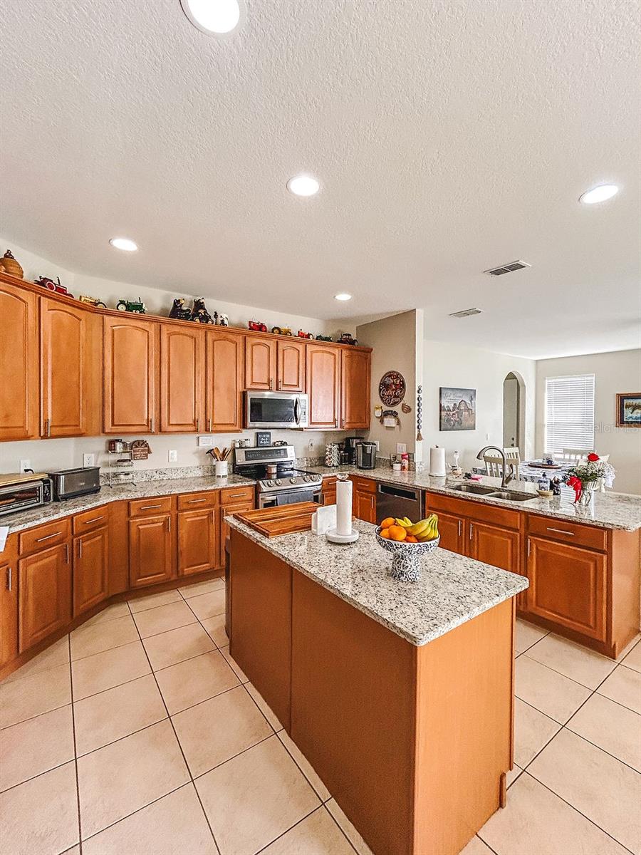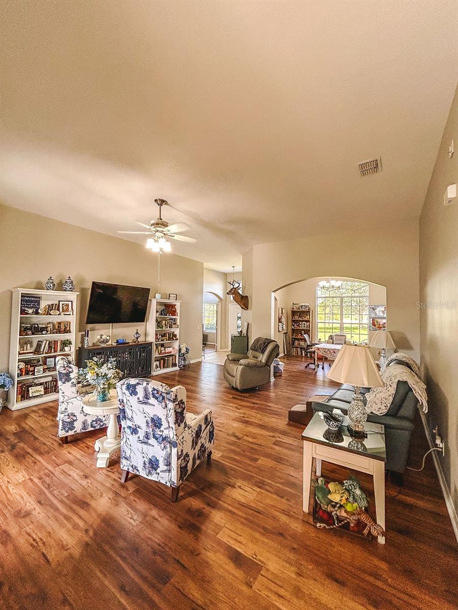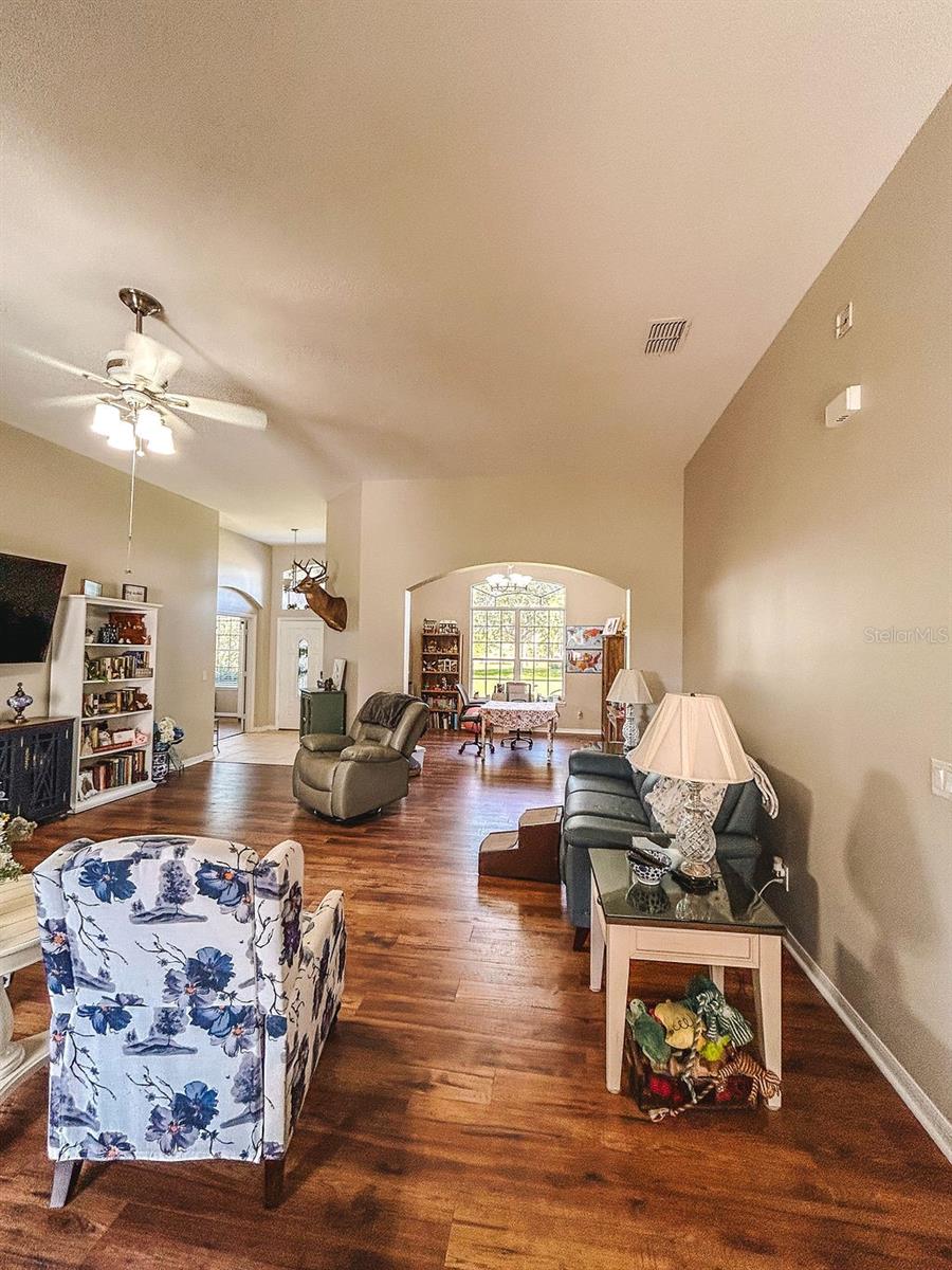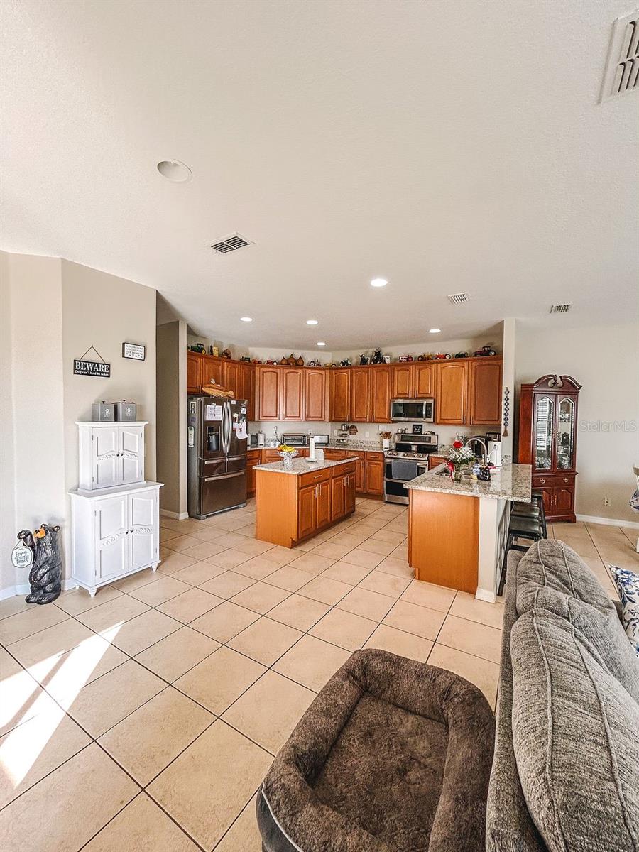Nestled within the serene and gated community of Sorrento Springs, 33818 Venice Lane offers a spacious 4-bedroom, 3-bathroom home with 3,035 sq ft of living space on a 0.65-acre lot. Built in 2005, this residence boasts a three-way split floor plan, high vaulted ceilings, and an open-concept design, ensuring both privacy and a sense of openness. The gourmet kitchen is a chef's delight, featuring new granite countertops, 42" crown-molded cabinetry, a central island, and a breakfast bar that seamlessly flows into the family room. Sliding glass doors lead to a covered and screened lanai, perfect for relaxing while overlooking the 5th hole green and 6th tee of the Eagle Dunes Golf Course. The expansive backyard is fully fenced and includes a paver patio, ideal for outdoor entertaining. Additional highlights include a separate den/office, formal living and dining rooms, a three-car garage, and recent updates such as a 2021 roof and a 2019 HVAC system. Residents of Sorrento Springs enjoy a host of amenities, including a community pool, clubhouse, fitness center, tennis courts, playground, and engaging monthly events like food trucks and holiday golf-cart parades. Conveniently located just a short drive from Mount Dora and Downtown Eustis, and with easy access to the 429, this home offers both tranquility and accessibility in one exceptional package.
