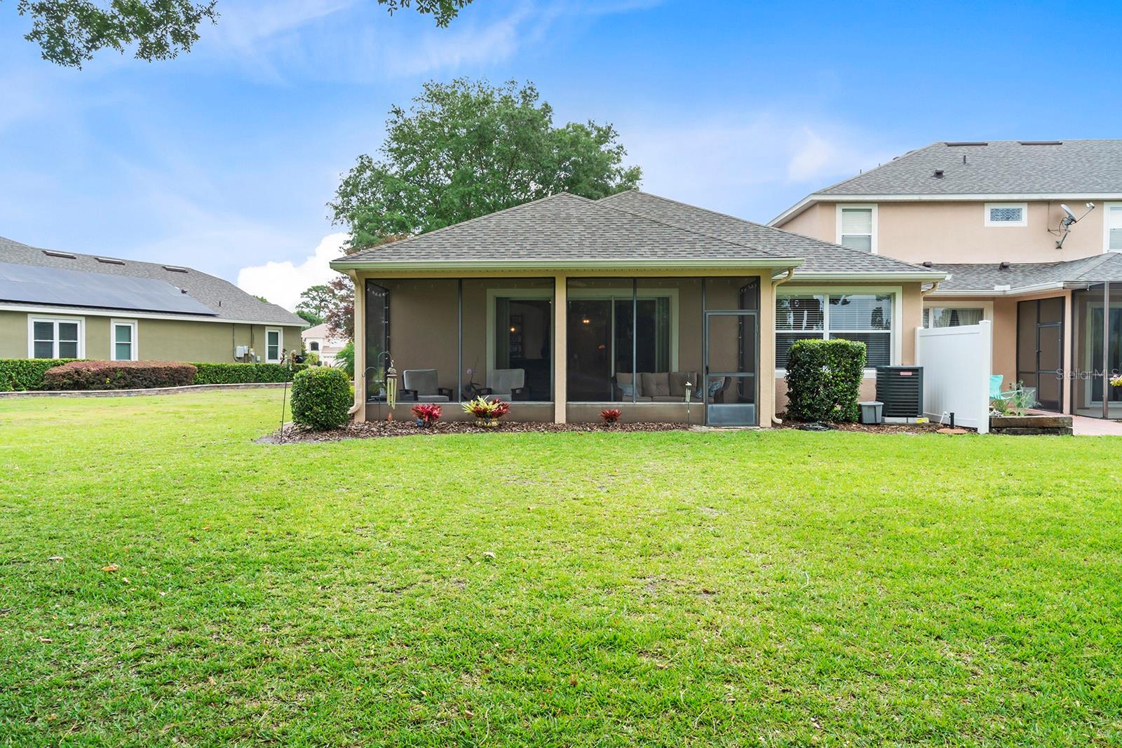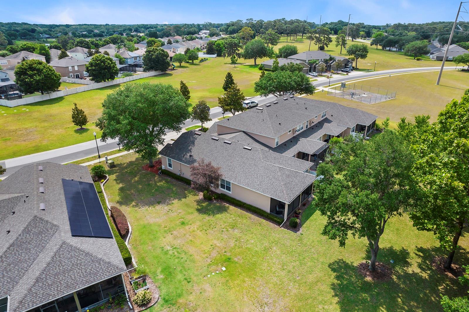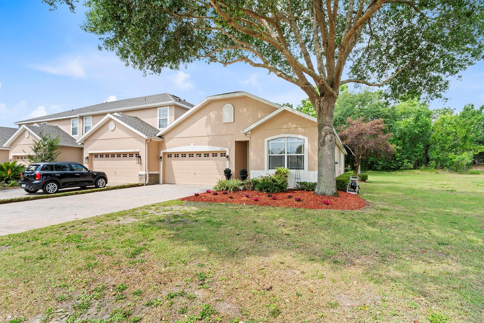 WELCOME HOME! This beautifully maintained 3 BEDROOM, 2 FULL BATH, ONE STORY, END UNIT TOWNHOUSE with NO REAR NEIGHBORS in the sought after 24 HR GUARD-GATED COMMUNITY OF SORRENTO SPRINGS with 1,873 Sq. Ft. of living space, 2 CAR GARAGE, NEW ROOF (JAN 2024) NEW A/C 2023 is just like new and waiting for you to call it home! The front of the home is welcoming with mature landscape and paver driveway. As you enter into the foyer expect to be impressed of this townhomes beauty boasting with an abundance of natural light provided by a the large sliding glass doors from the living room, architectural details of arched openings, columns, ENGINEERED HARDWOOD and TILE FLOORING throughout, CROWN MOULDING IN THE FOYER and UPDATED LIGHT FIXTURES. Bedrooms 2 & 3, with carpet flooring and reach-in closets, are located at the front of the home and share a full bath located in the hall between them. You'll enjoy cooking and entertaining with a beautiful open kitchen/dining room concept. The kitchen is equipped with 42" CABINETS, STAINLESS STEEL APPLIANCES, EAT-AT BAR, and ENCLOSED PANTRY. LAUNDRY ROOM is located near kitchen with access to garage with NEW OVERHEAD STORAGE. The living room with ENGINEERED HARDWOOD FLOORING is spacious enough to accommodate large holiday gatherings. Large glass sliders at the living room lead to the EXTENDED COVERED/SCREENED IN LANAI perfect for relaxing after a long day or enjoy your first cup of coffee in the morning. Back inside, the Master Bedroom located off the family room is spacious with ENGINEERED HARDWOOD FLOORING and ample natural light. The Master Bathroom is equipped with GLASS ENCLOSED STAND ALONE SHOWER, GARDEN TUB, DOUBLE SINK VANITY, ENCLOSED TOILET, TILE FLOORING AND TWO CLOSETS- ONE REACH-IN AND ONE WALK-IN!! Call your agent today to schedule and showing to see this beauty it won't last long! COMMUNITY AMENITIES: 18 HOLE EAGLE DUNES GOLF COURSE, CLUB HOUSE W/FITNESS CENTER, PAVILION, POOL, PLAYGROUND, 2 TENNIS COURTS & A BASKETBALL COURT. Conveniently located near Sorrento Hills Village, 15 minutes from Mount Dora and the 429 Expressway. Contact your Agent for a showing today, this stunner won't last long!