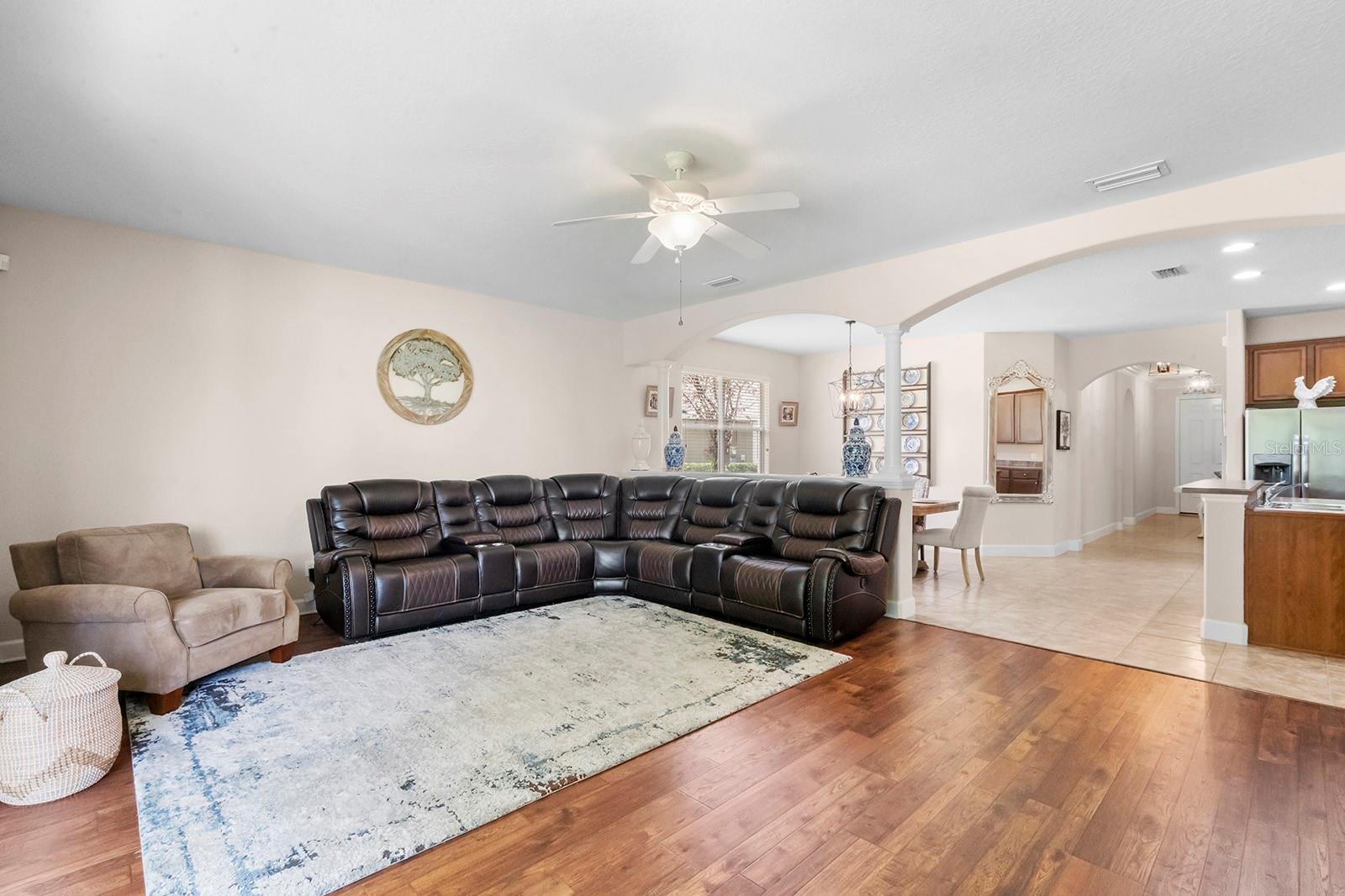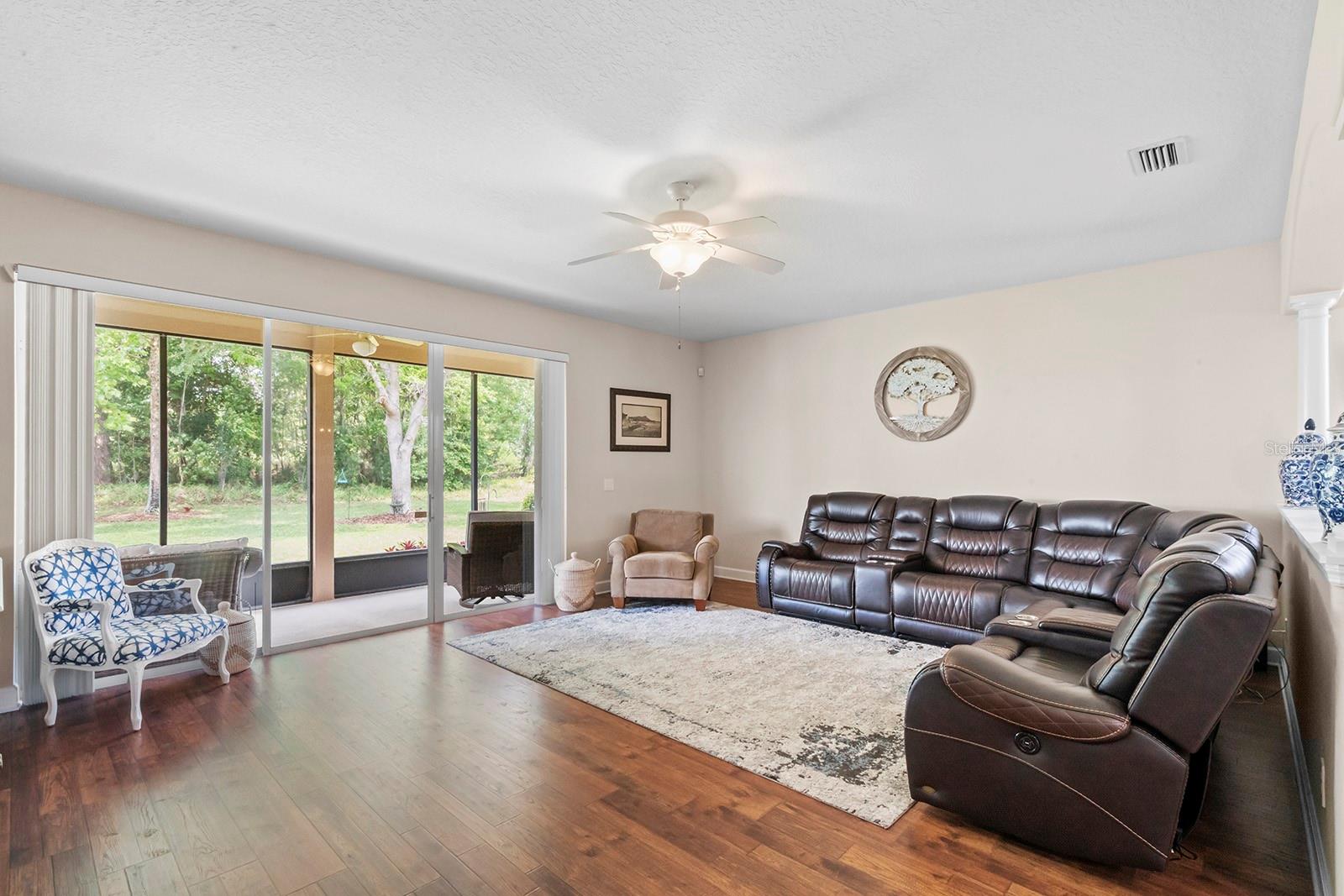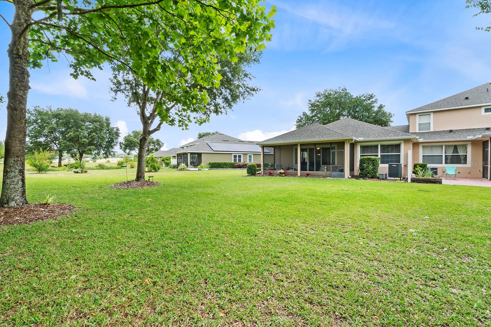 WELCOME HOME! This beautifully maintained 3 BEDROOM, 2 FULL BATH, ONE STORY, END UNIT TOWNHOUSE with NO REAR NEIGHBORS in the sought after 24 HR GUARD-GATED COMMUNITY OF SORRENTO SPRINGS with 1,873 Sq. Ft. of living space, 2 CAR GARAGE, NEW ROOF (JAN 2024) NEW A/C 2023 is just like new and waiting for you to call it home! The front of the home is welcoming with mature landscape and paver driveway. As you enter into the foyer expect to be impressed of this townhomes beauty boasting with an abundance of natural light provided by a the large sliding glass doors from the living room, architectural details of arched openings, columns, ENGINEERED HARDWOOD and TILE FLOORING throughout, CROWN MOULDING IN THE FOYER and UPDATED LIGHT FIXTURES. Bedrooms 2 & 3, with carpet flooring and reach-in closets, are located at the front of the home and share a full bath located in the hall between them. You'll enjoy cooking and entertaining with a beautiful open kitchen/dining room concept. The kitchen is equipped with 42" CABINETS, STAINLESS STEEL APPLIANCES, EAT-AT BAR, and ENCLOSED PANTRY. LAUNDRY ROOM is located near kitchen with access to garage with NEW OVERHEAD STORAGE. The living room with ENGINEERED HARDWOOD FLOORING is spacious enough to accommodate large holiday gatherings. Large glass sliders at the living room lead to the EXTENDED COVERED/SCREENED IN LANAI perfect for relaxing after a long day or enjoy your first cup of coffee in the morning. Back inside, the Master Bedroom located off the family room is spacious with ENGINEERED HARDWOOD FLOORING and ample natural light. The Master Bathroom is equipped with GLASS ENCLOSED STAND ALONE SHOWER, GARDEN TUB, DOUBLE SINK VANITY, ENCLOSED TOILET, TILE FLOORING AND TWO CLOSETS- ONE REACH-IN AND ONE WALK-IN!! Call your agent today to schedule and showing to see this beauty it won't last long! COMMUNITY AMENITIES: 18 HOLE EAGLE DUNES GOLF COURSE, CLUB HOUSE W/FITNESS CENTER, PAVILION, POOL, PLAYGROUND, 2 TENNIS COURTS & A BASKETBALL COURT. Conveniently located near Sorrento Hills Village, 15 minutes from Mount Dora and the 429 Expressway. Contact your Agent for a showing today, this stunner won't last long!