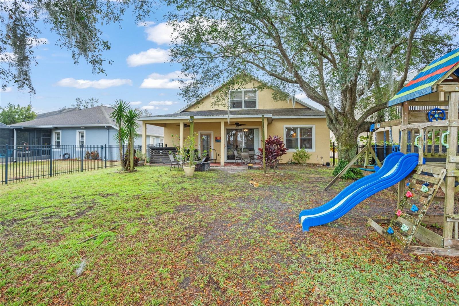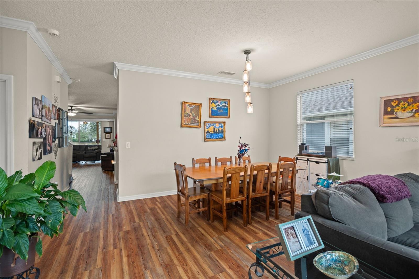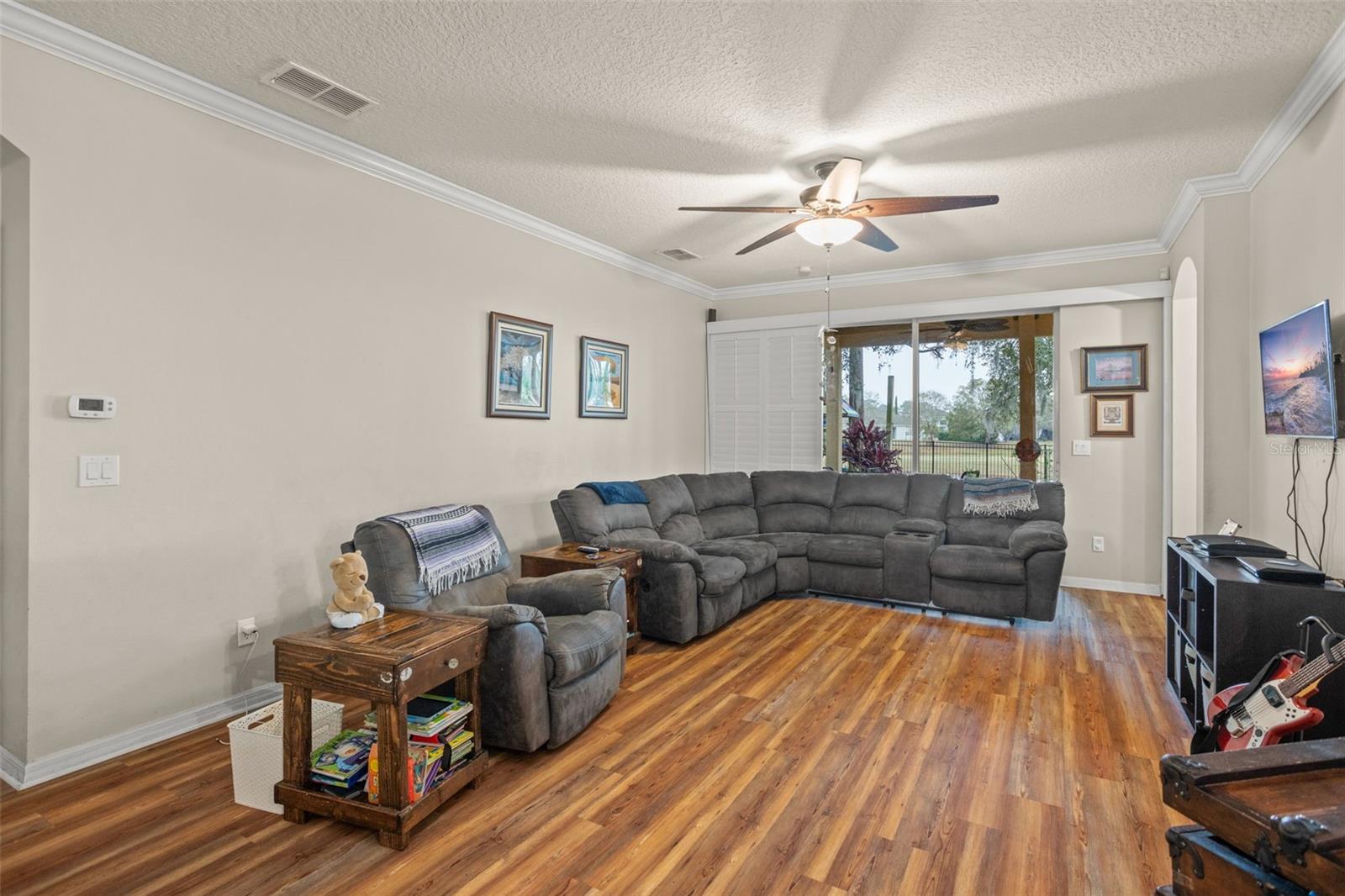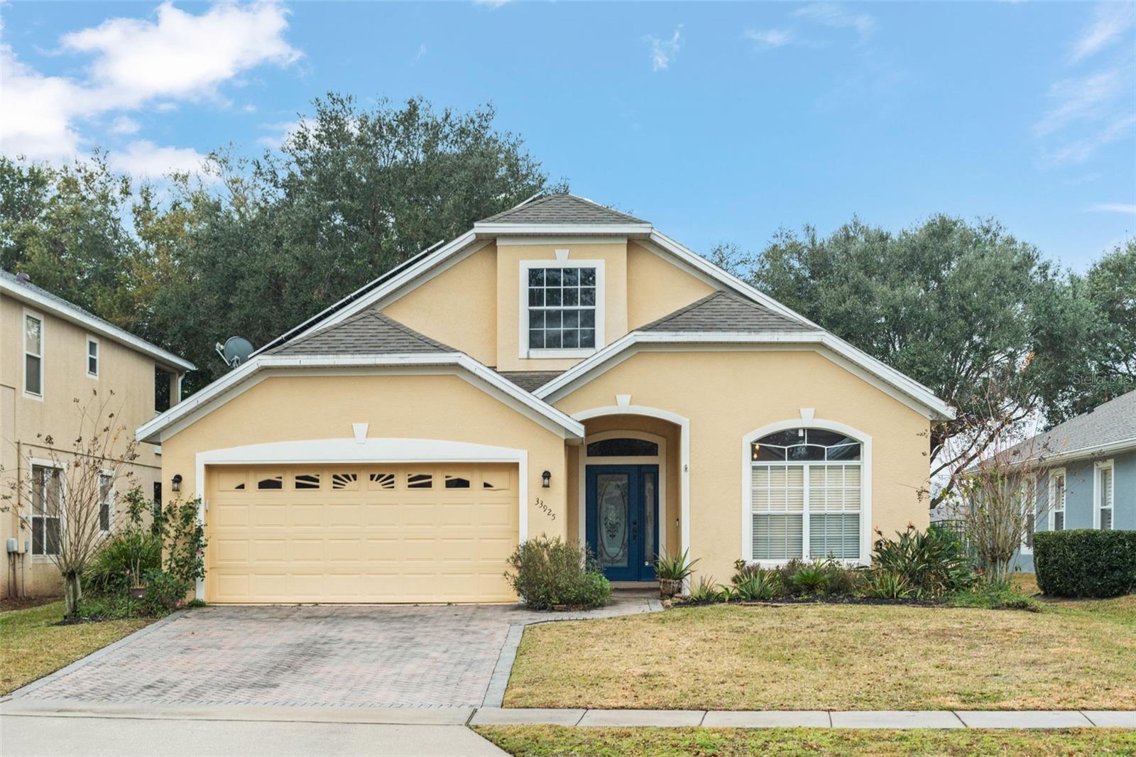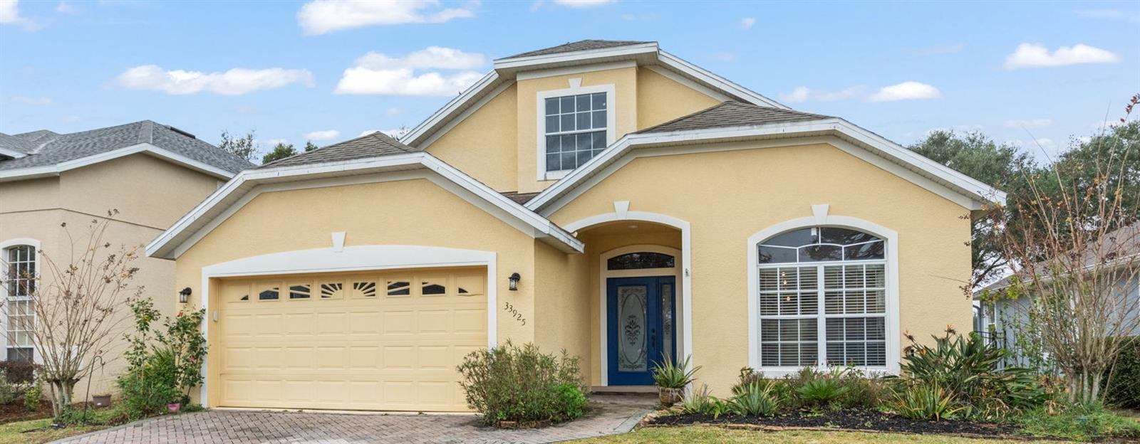 BRAND NEW ROOF and SOLAR PANELS paid off at closing! Amenities and serenity abound with this 4-bedroom, 3-bathroom home located in the guard-gated, golf community of Sorrento Hills and situated perfectly on the 6th tee of the Eagle Dunes Golf Course. Through the etched glass front door, you'll find the formal living or flex room up front with the picturesque window drawing in the natural light leading back into the formal dining room with crown molding throughout. Continuing into the heart of the home, you'll see that the high-end, waterproof laminate floors span through all living areas and bedrooms on the main floor. In the spacious, open kitchen you'll find granite countertops with stylish backsplash, stainless steel appliances, water softener and reverse osmosis system, and additional eat-in space overlooking the family room. A perfect guest bedroom with direct access to the 3rd full bathroom sits invitingly past the family room. Rounding out the main floor is the spacious primary suite featuring dual closets, double sink vanity, soaking tub, and stand-up shower and serene views of the backyard and golf course beyond. As you head upstairs the split floor plan offers endless options with bedrooms on either side of the loft space and another full bathroom. Back downstairs and out the sliding glass doors, you’re brought onto the extended covered patio overlooking your fenced backyard. This space offers mature landscaping throughout with beautiful views of the golf course for a serene backyard setting. The gated community of Sorrento Springs offers residents a fantastic pool with lounge areas, clubhouse, fitness center, tennis/basketball courts and access to the public golf course. Tons of community events including food truck nights, golf cart parades, and farmers markets make this an amazing place to live and play! You’ll be less than 5 mins from all the shopping & dining at Sorrento Hills Village, with historic Mt. Dora just 15 mins from your front door. Schedule your private showing today! **This property qualifies for a closing cost credit up to $3,300 through the Seller’s preferred lender.**
